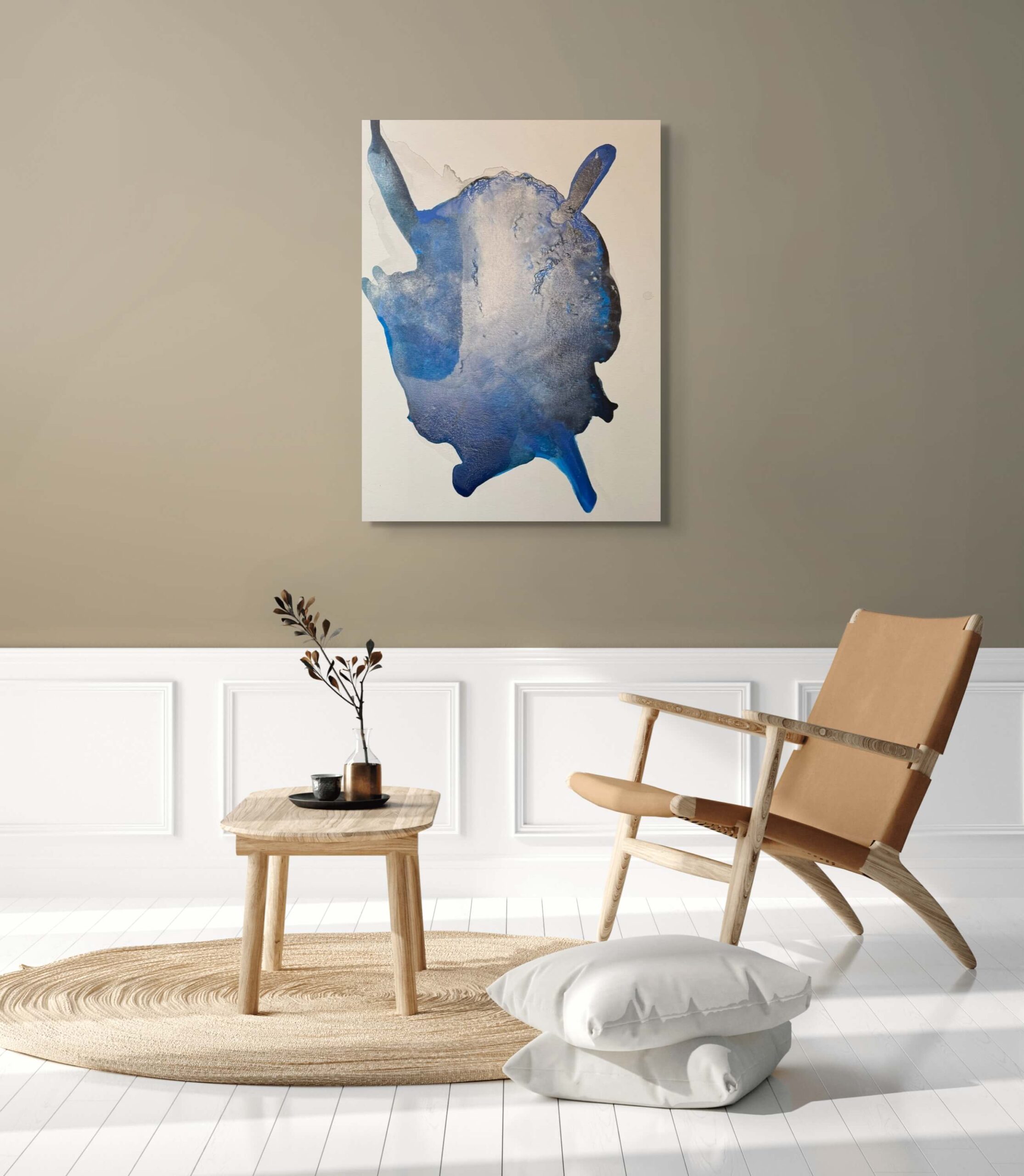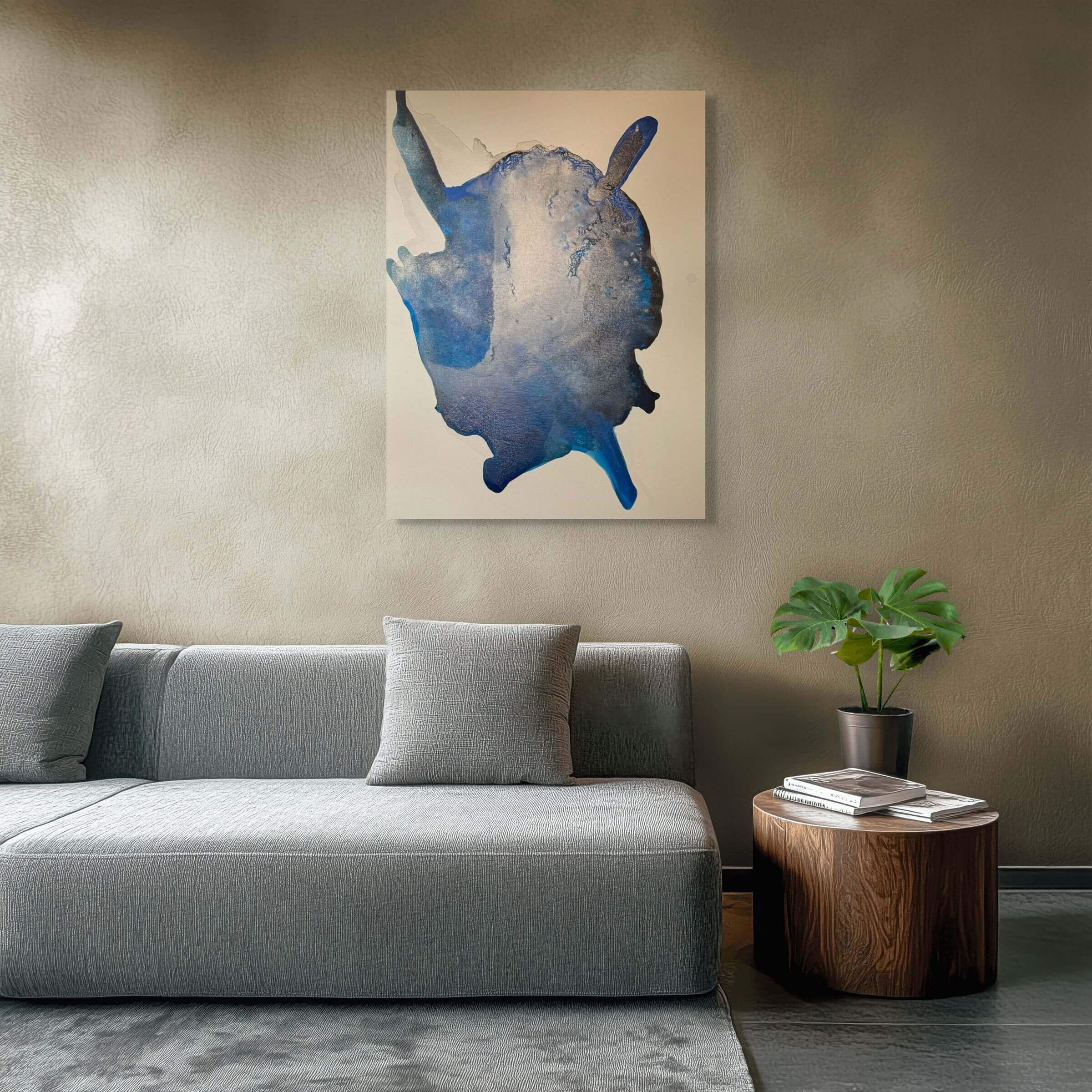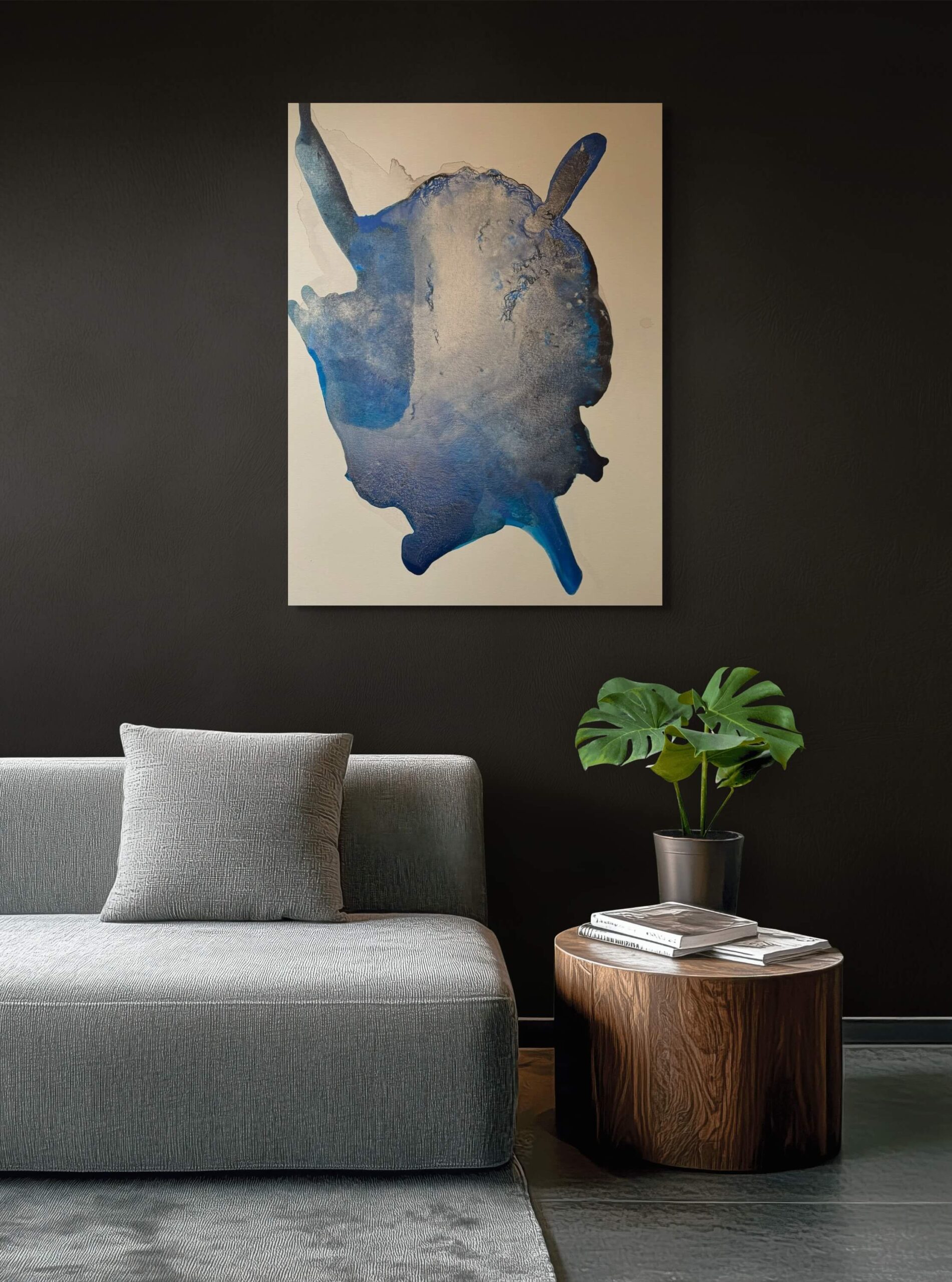 This artwork features a captivating abstract expression of fluidity and movement, defined by its swirling blue hues merging seamlessly with darker shades. The piece is dominated by a central amorphous shape, evoking a sense of depth and texture. Its palette transitions from lighter, ethereal blues to intense indigos, creating an intriguing contrast. The composition is enhanced by the appearance of fluid dynamics, suggesting both motion and stillness. This work is characterized by its innovative use of color and form, inviting viewers to contemplate its resemblance to natural phenomena or celestial bodies. The delicate interplay of light and shadow across the surface adds dimension, making the artwork both visually and emotionally engaging. This piece stands out due to its abstract nature and the artist’s ability to convey a sense of boundless space within a confined frame.