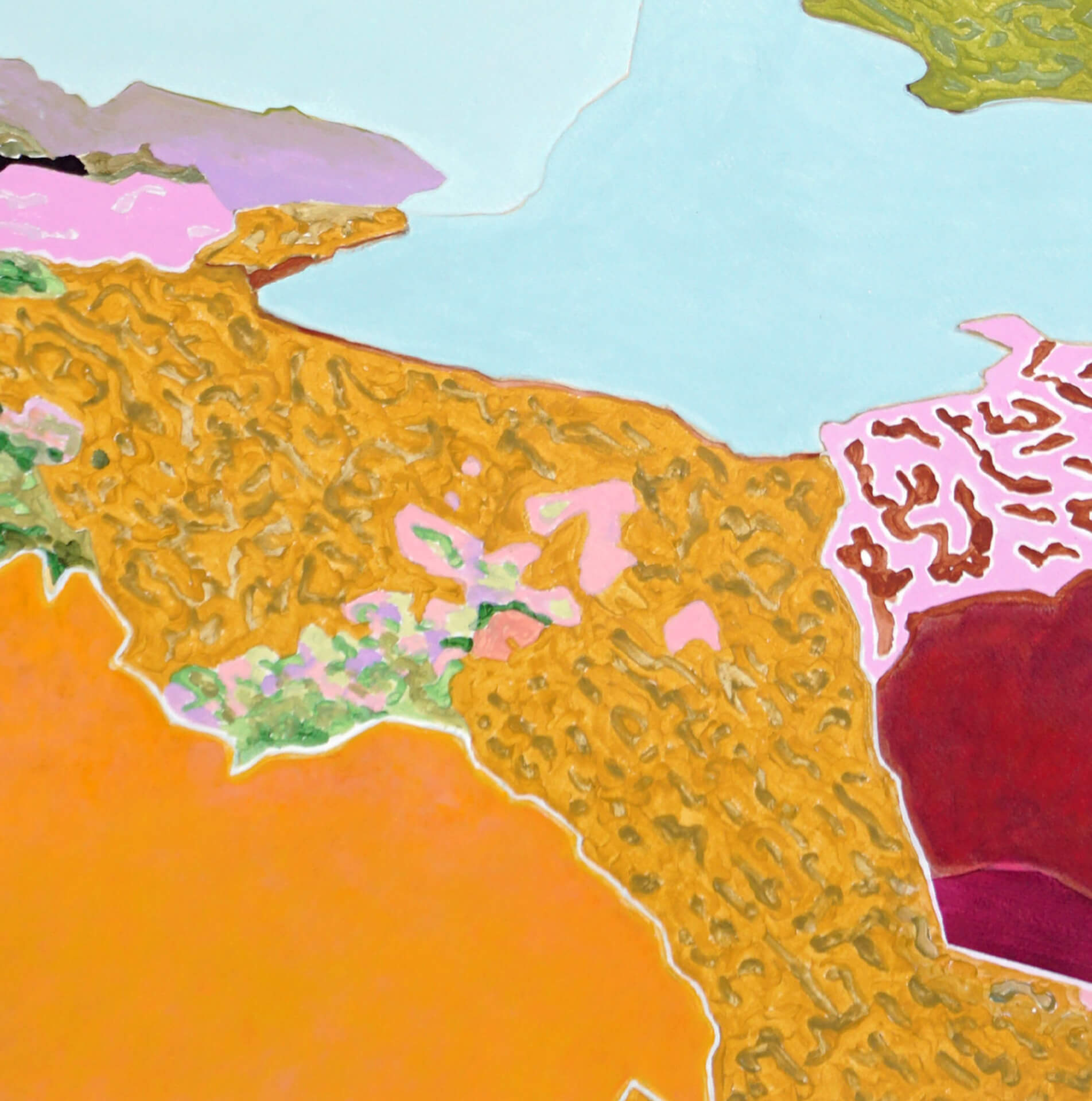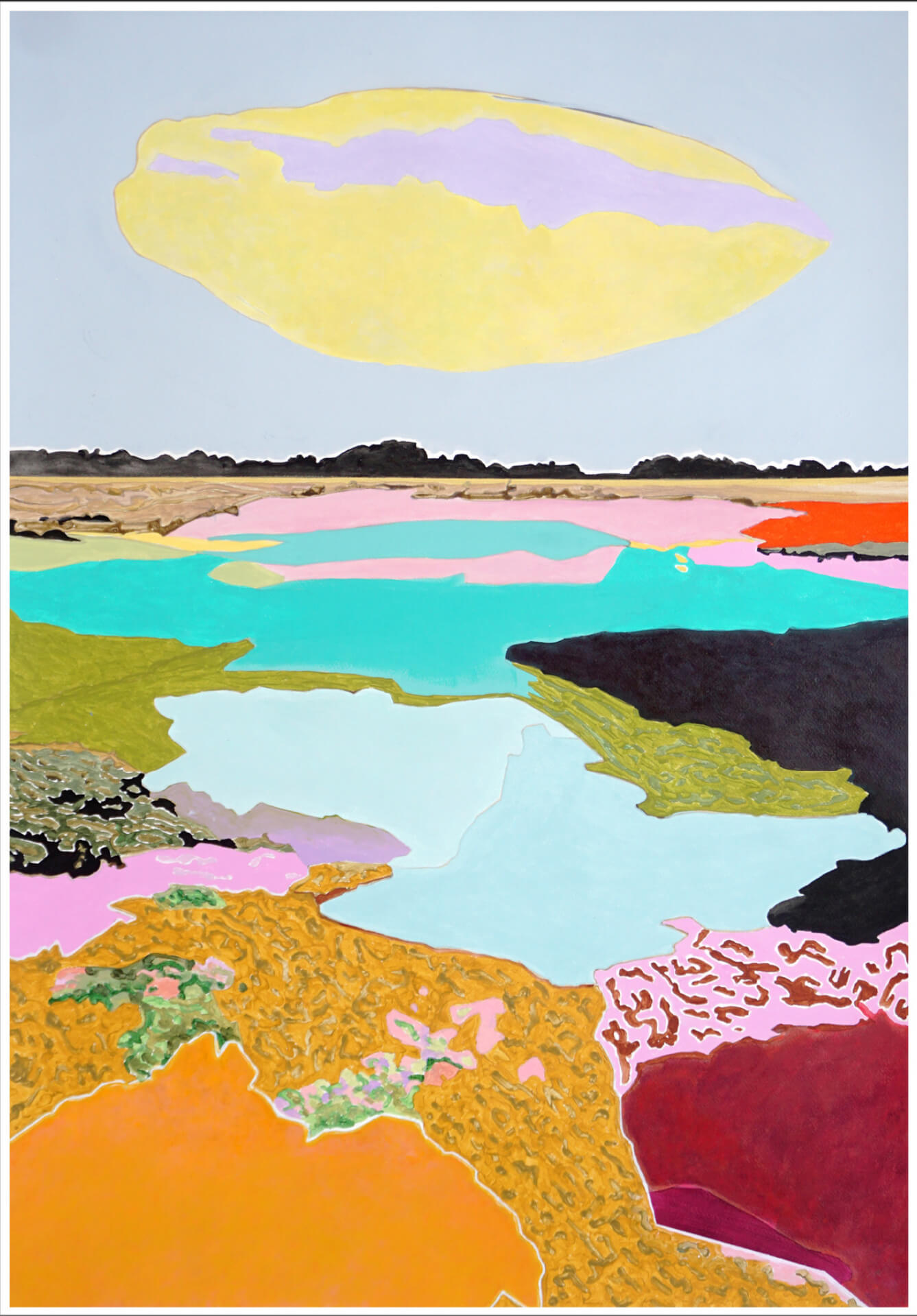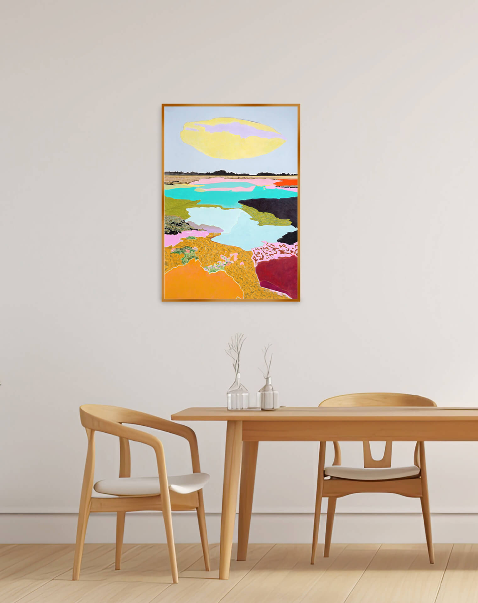 This is a beautiful landscape painting by Alexandra Czierpka. By reducing color and form to their essentials, she invites the observer to contemplate the harmony between humans and nature. Smooth textures, hard lines, and flowing forms merge into expressive outlines, suggesting an interplay of shapes and colors that strengthen the personal connection with nature, bridging past, present, and future.