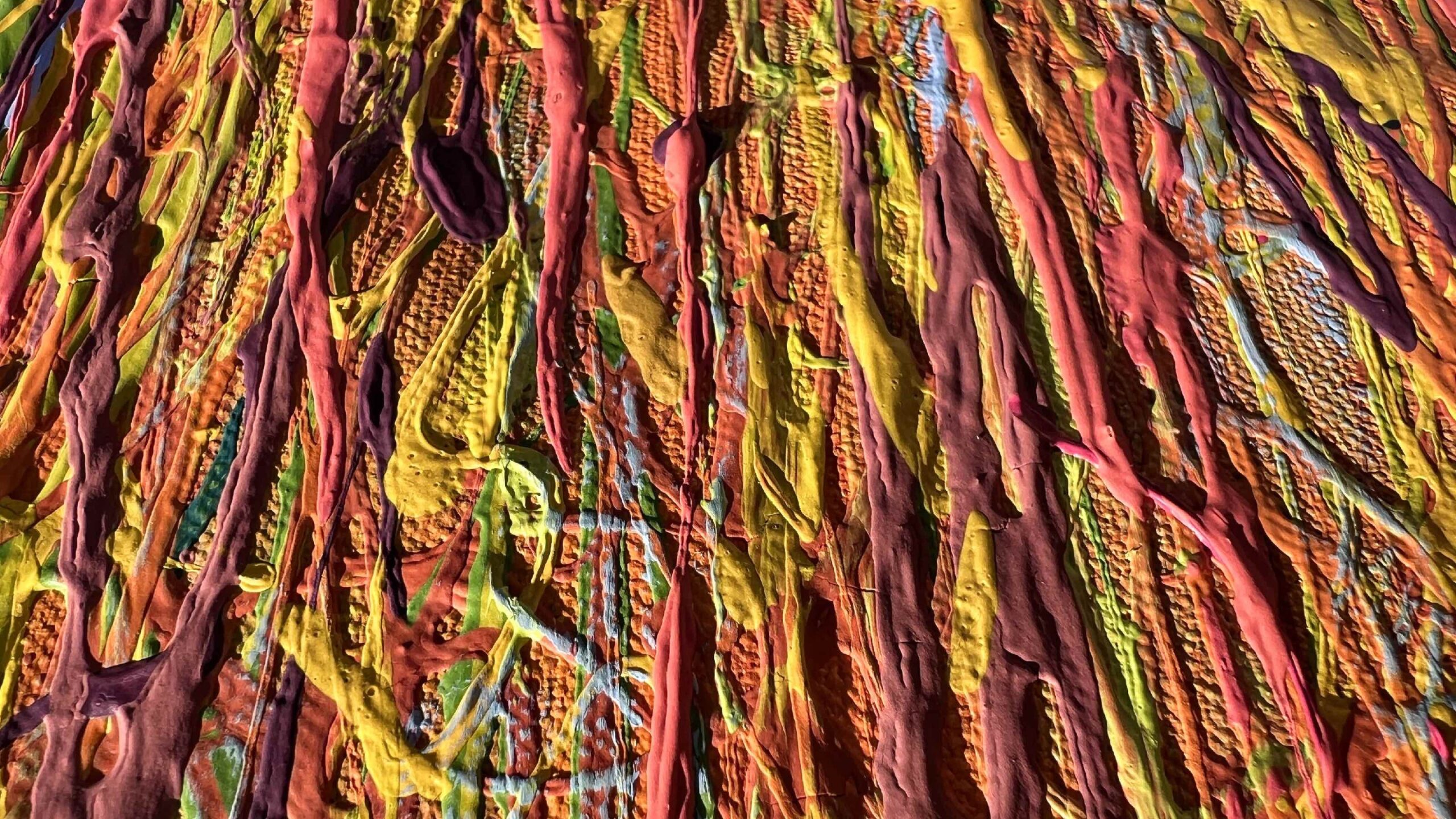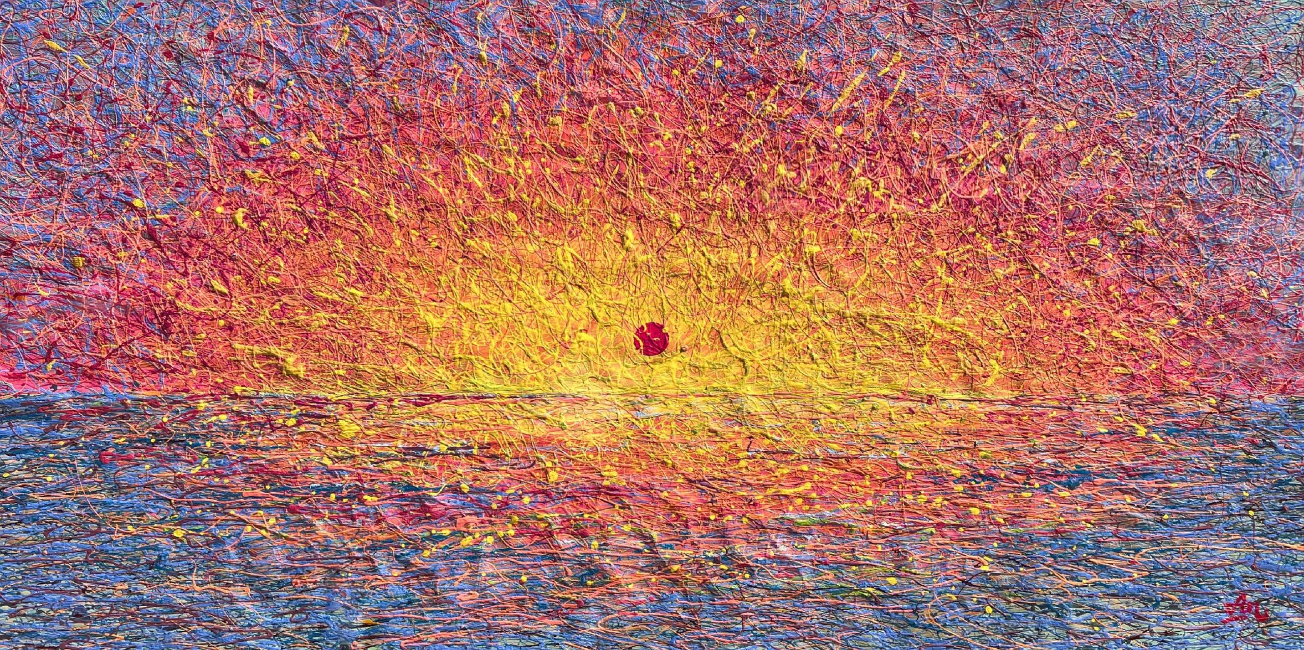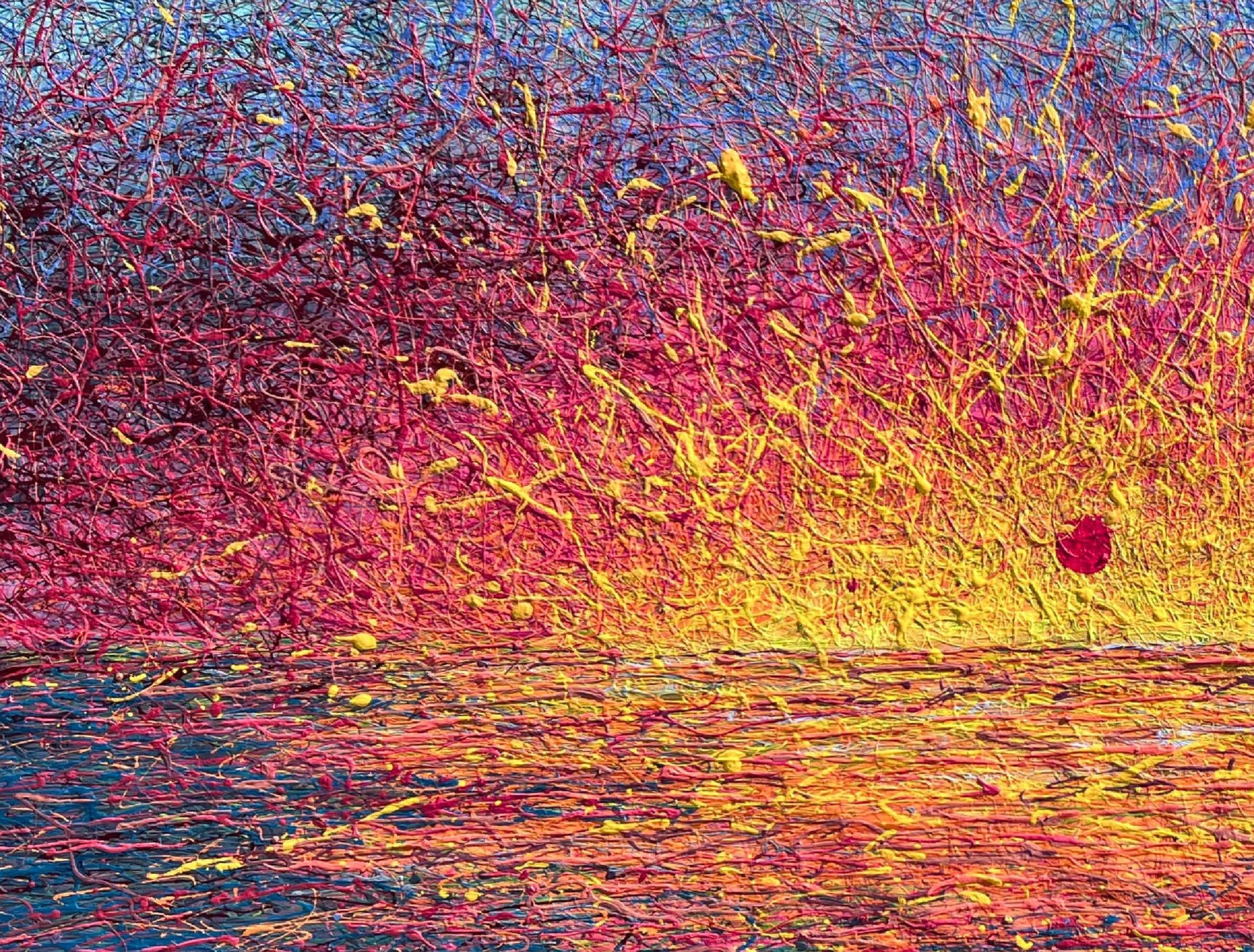 This textured sunset painting captures a vivid pink, yellow, and orange sky glowing over the ocean, created with a unique multi-layer “threads of paint” technique.