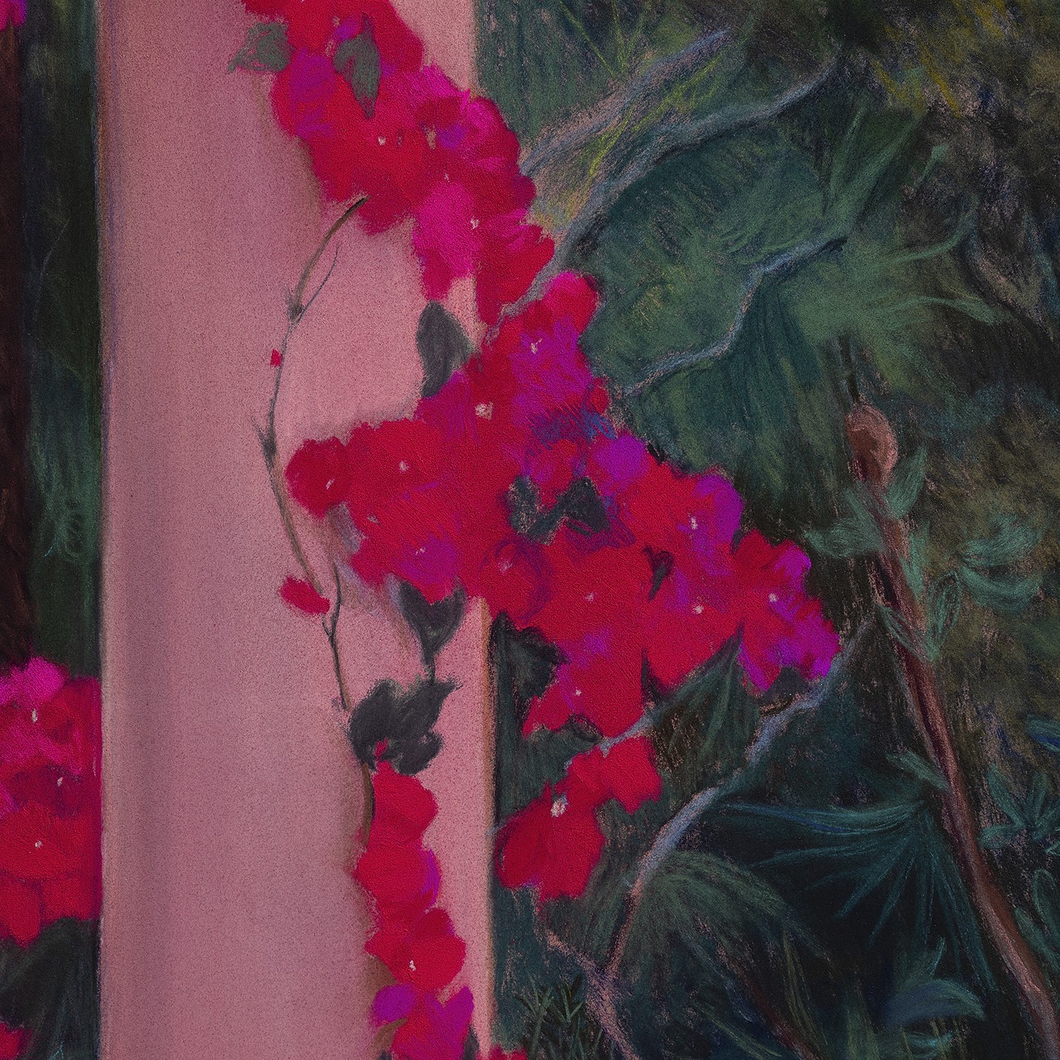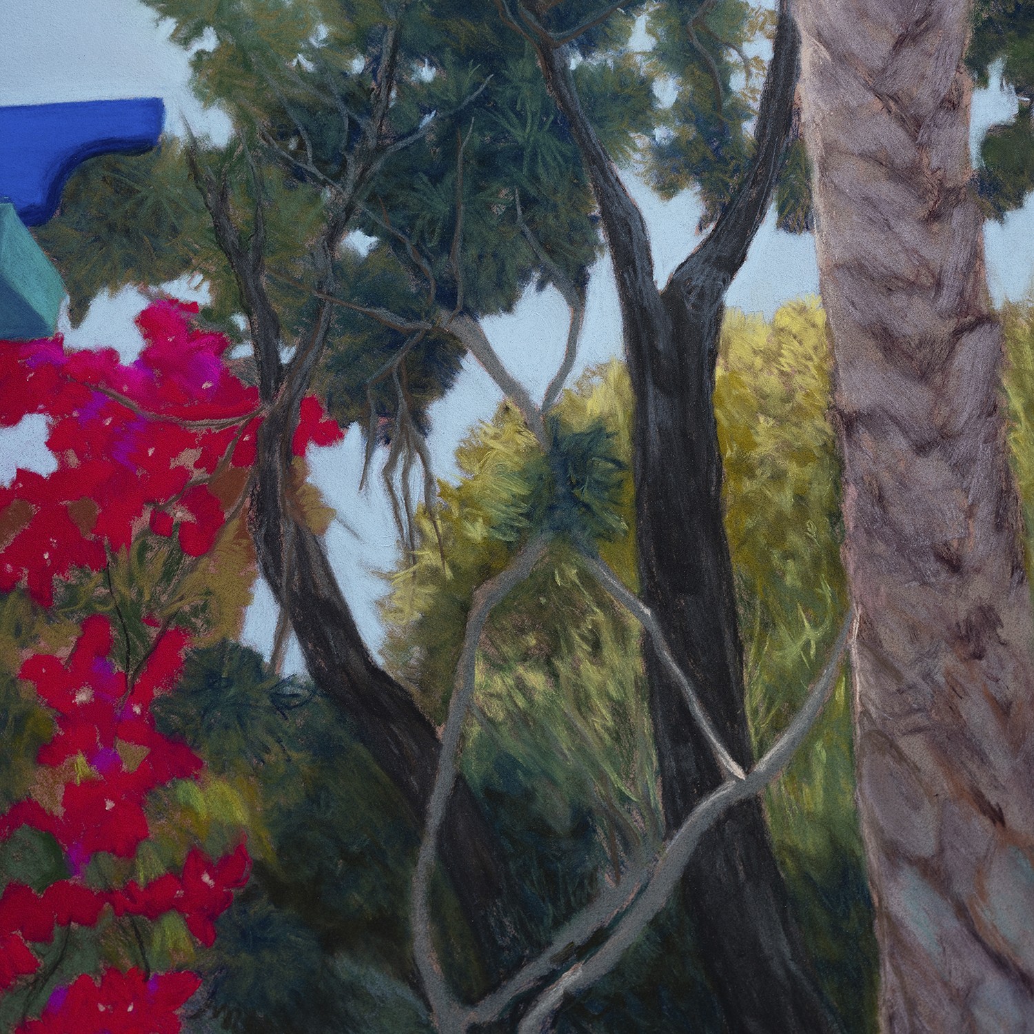 This artwork depicts an exuberant and lush scene that evokes a tropical ambiance. In the foreground, a pillar painted in a pastel pink immediately catches the eye. This pillar is adorned with a bougainvillea vine with vibrant red flowers, adding a touch of liveliness and contrasting color to the composition. The vine climbs gracefully up the pillar, creating a natural harmony between the architecture and the vegetation. The blue structure above the pillar, likely a pergola, introduces an interesting architectural dimension and serves as a counterpoint to the lush greenery that surrounds it. The bright blue of the pergola stands out sharply against the darker, leafy backgrounds and the clear sky, adding a singular depth to the work. In the background, a dense and diverse vegetation, consisting of palm trees and other tropical foliage, completes the scene and creates a sense of envelopment and tranquility. This richness of vegetation evokes a jungle or a carefully tended garden, where nature and architecture blend harmoniously. The use of colors is masterful. The contrast between the warm tones of the pink pillar and red flowers, and the cool nuances of the blue pergola and green foliage, gives the work a captivating visual intensity. The composition and subtle nuances demonstrate remarkable technical skill and allow the viewer to feel transported to this corner of tropical paradise. This painting is distinguished by its perfect balance between natural and built elements, as well as its ability to evoke an atmosphere of serenity and radiance, making it a piece that is both restful and energizing. The pastel must be placed under glass by a professional for its final protection, delivered protected by glassine paper.