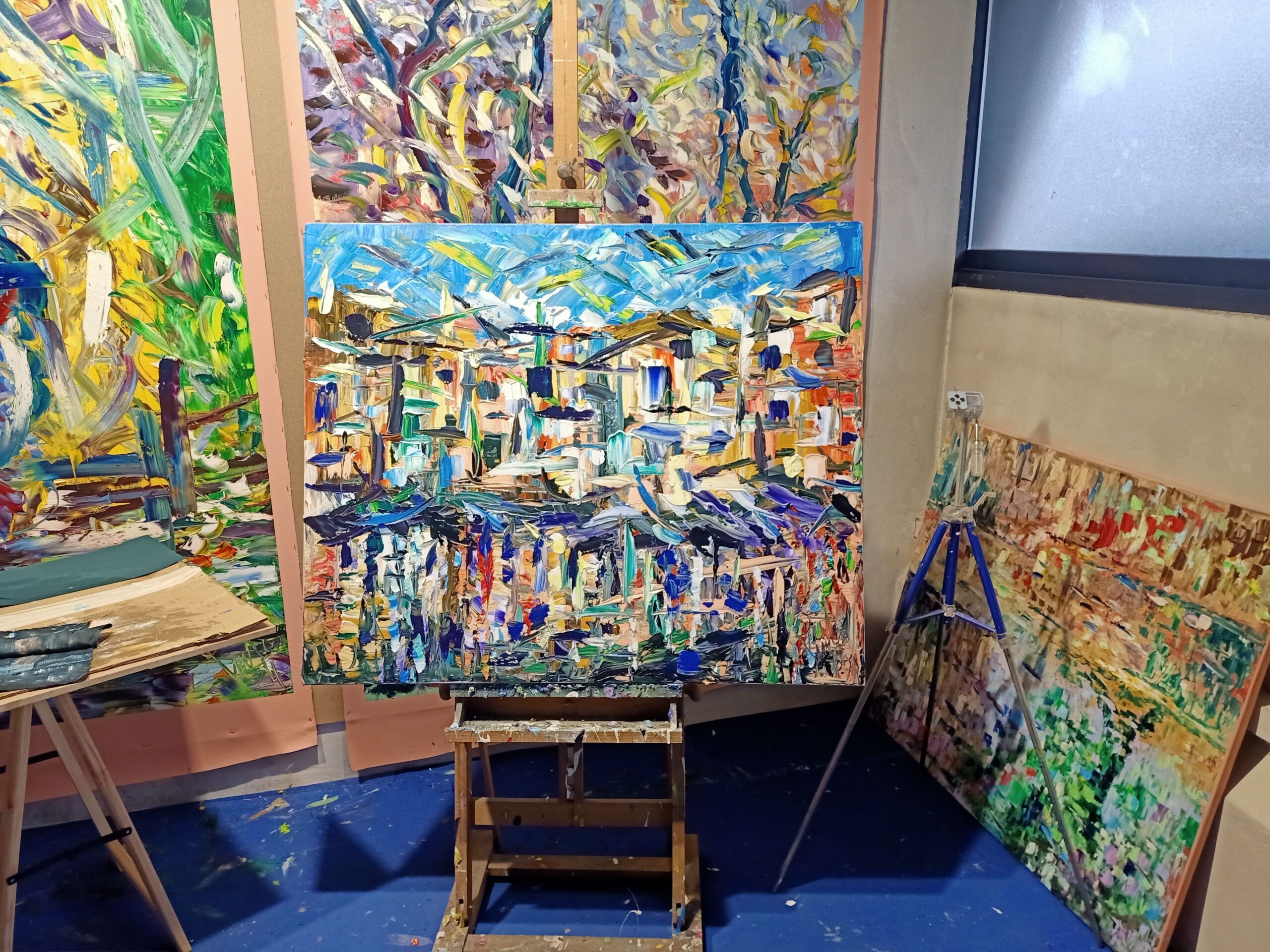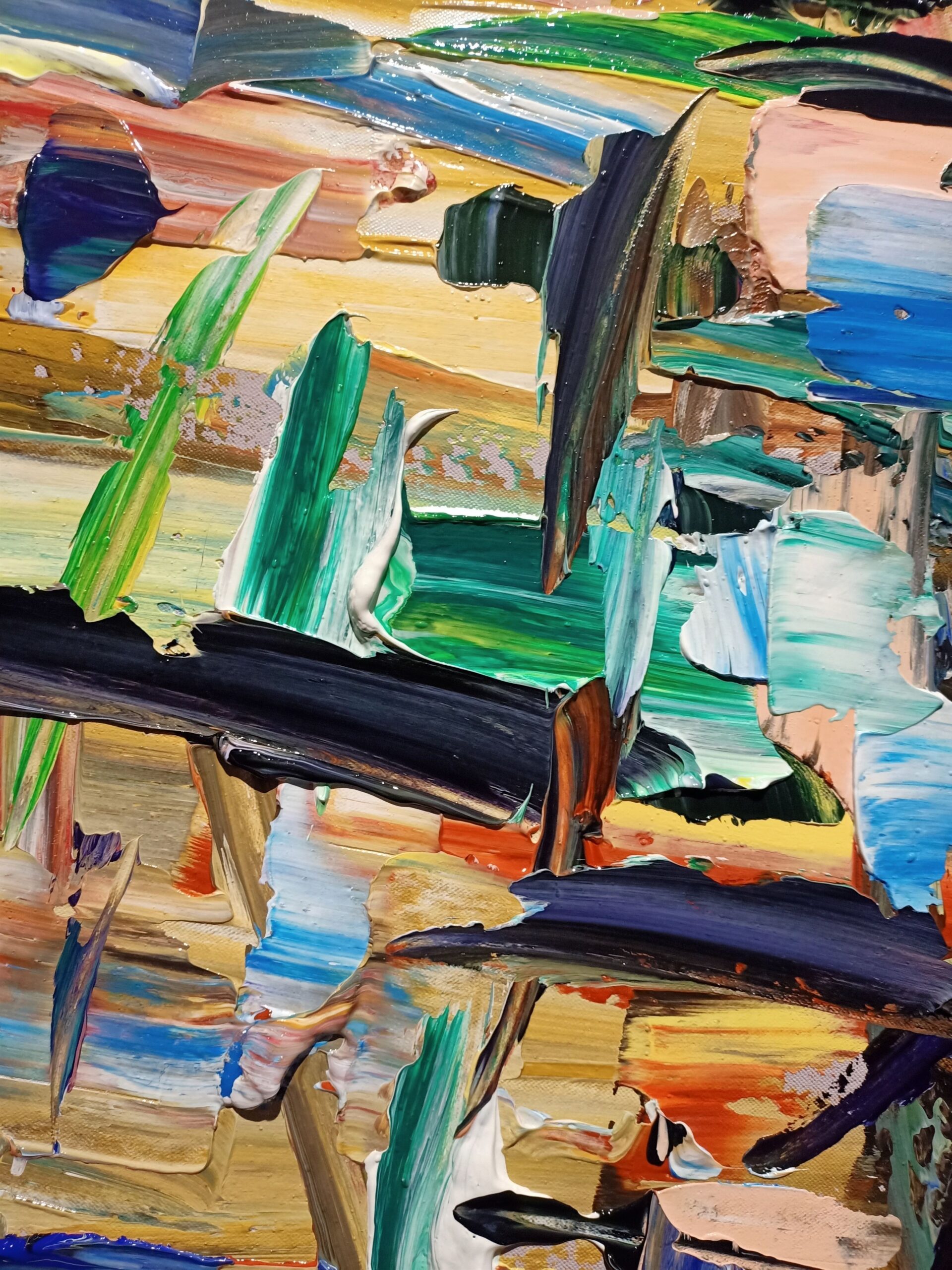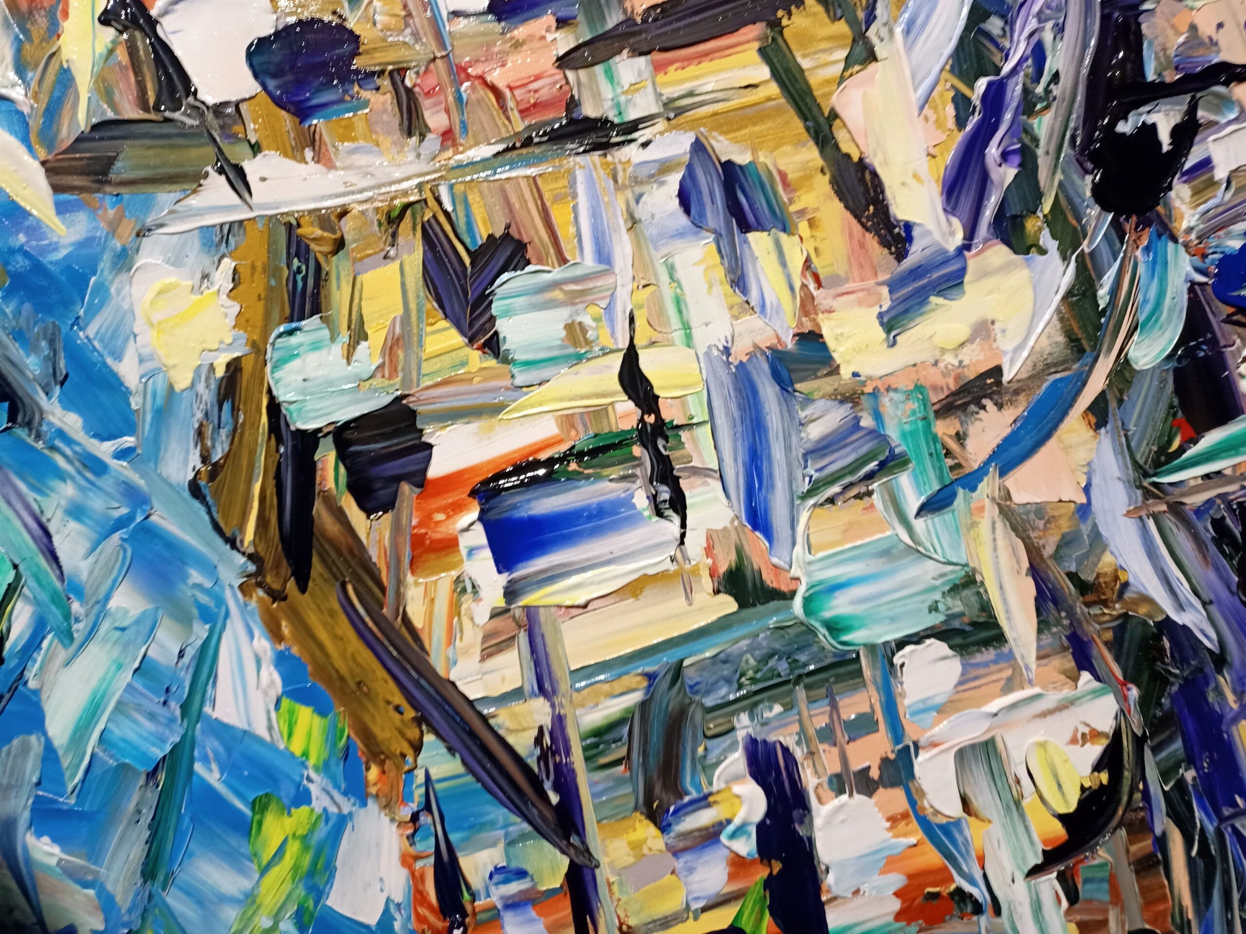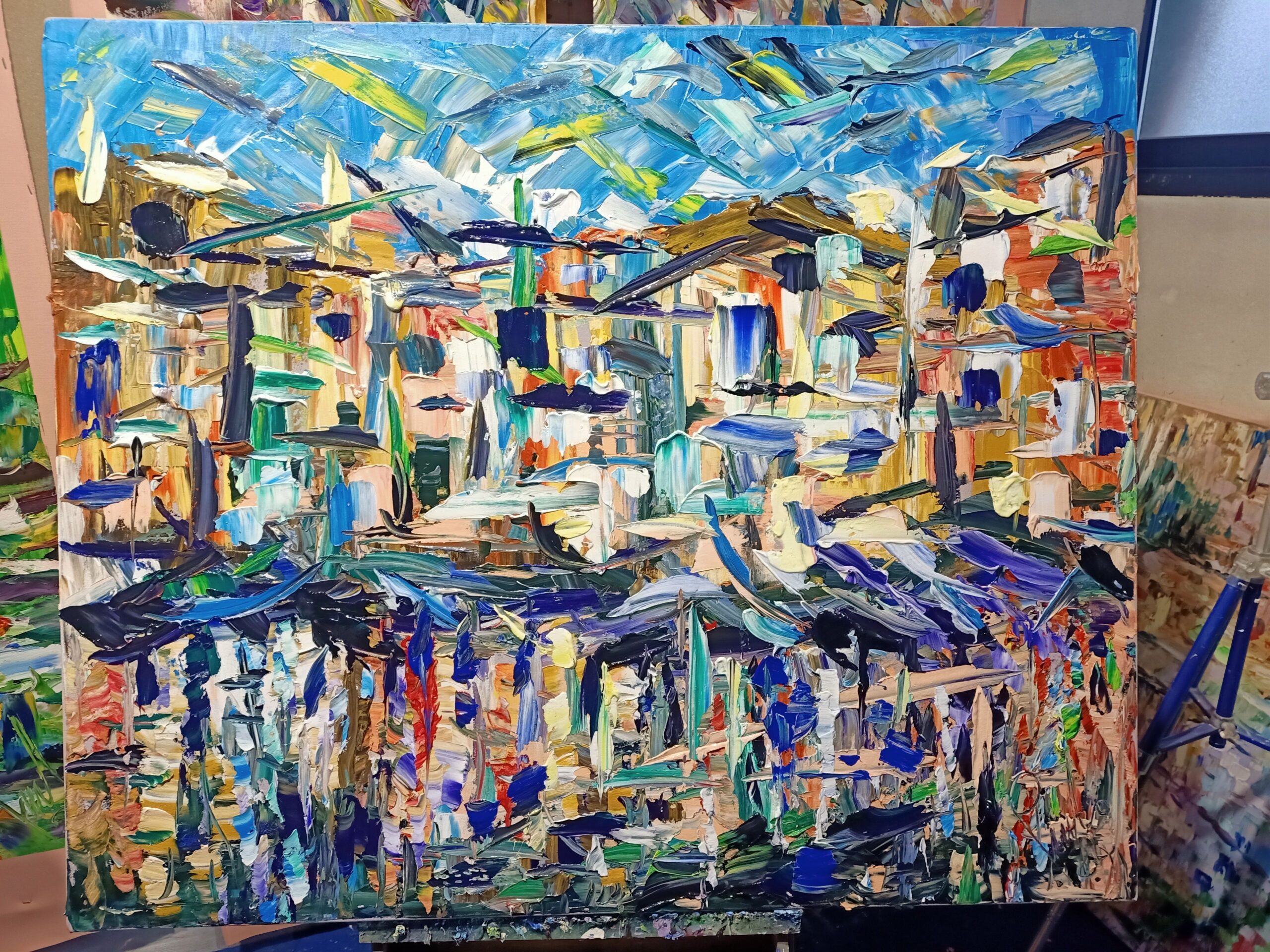The technique employed is dynamic and almost impetuous, with strokes of the spatula giving a palpable texture, as if one could feel the pulsing rhythm of the harbour. It is a work that exudes movement and life, calling the viewer to immerse themselves in the orderly chaos of an abstract harbour scene.