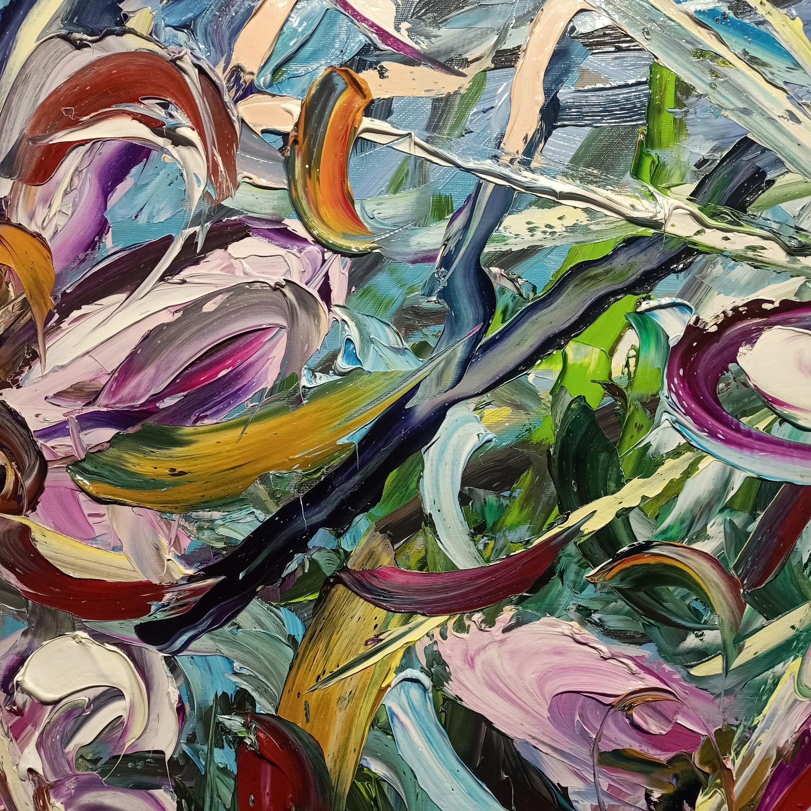 Executed entirely with a palette knife, this large-scale oil painting is built through layers of dense, dynamic gestures that create a vibrating surface rich in movement and depth.