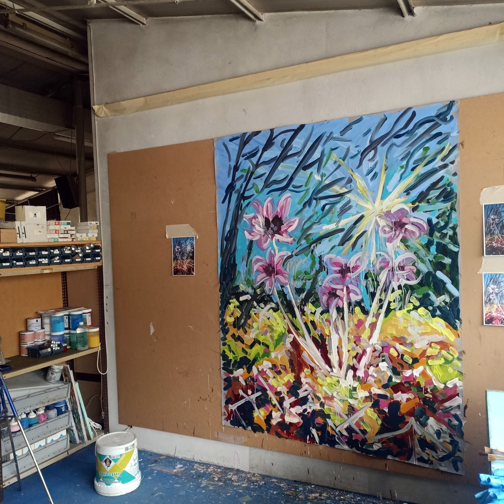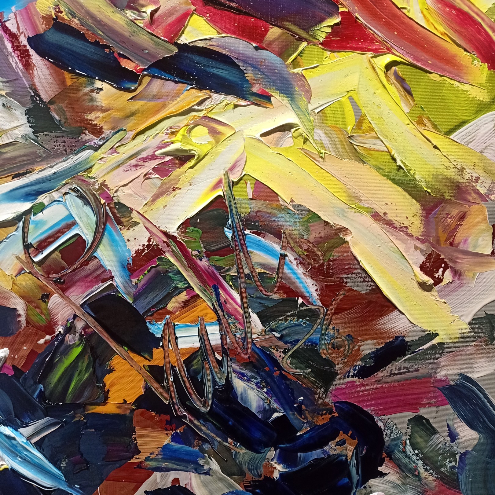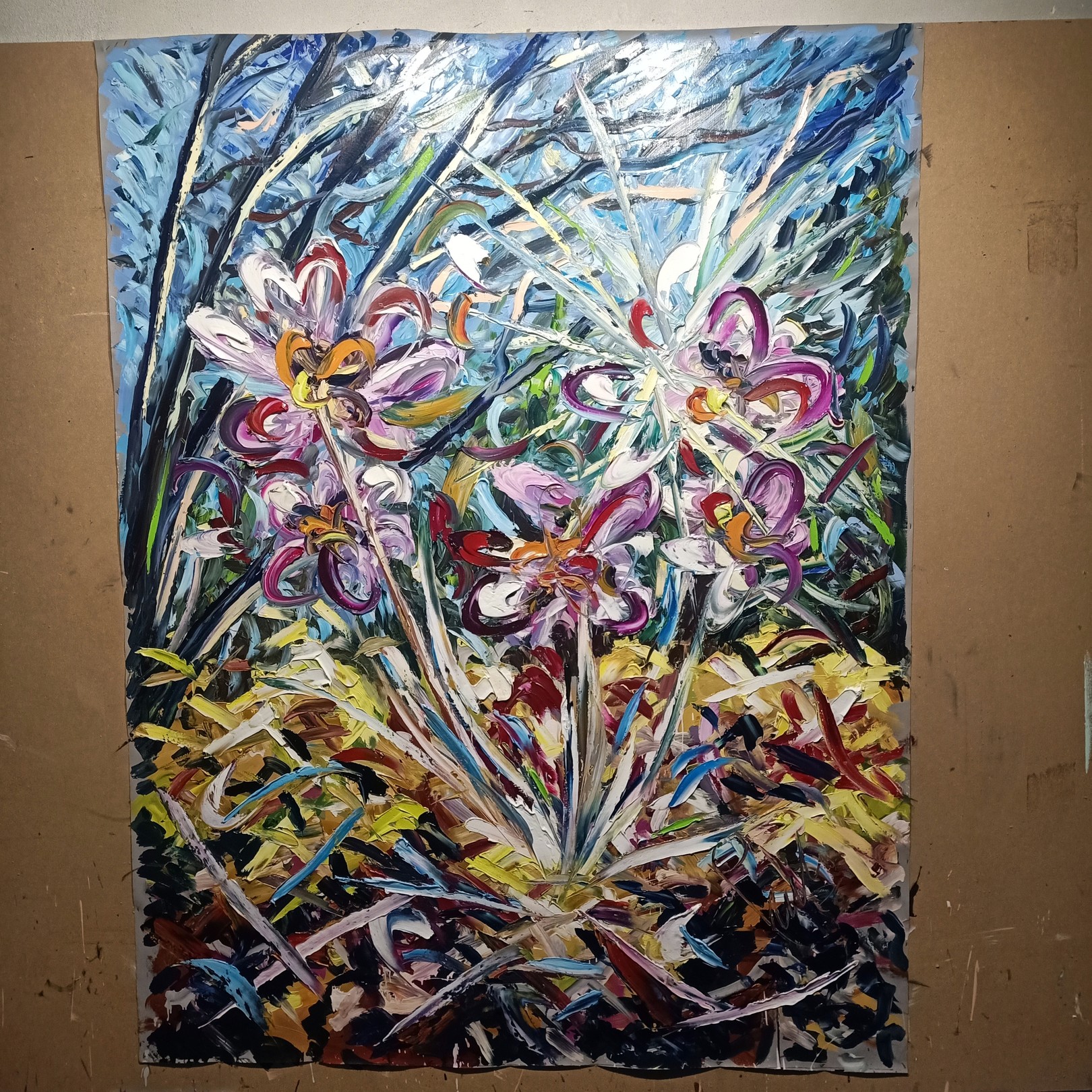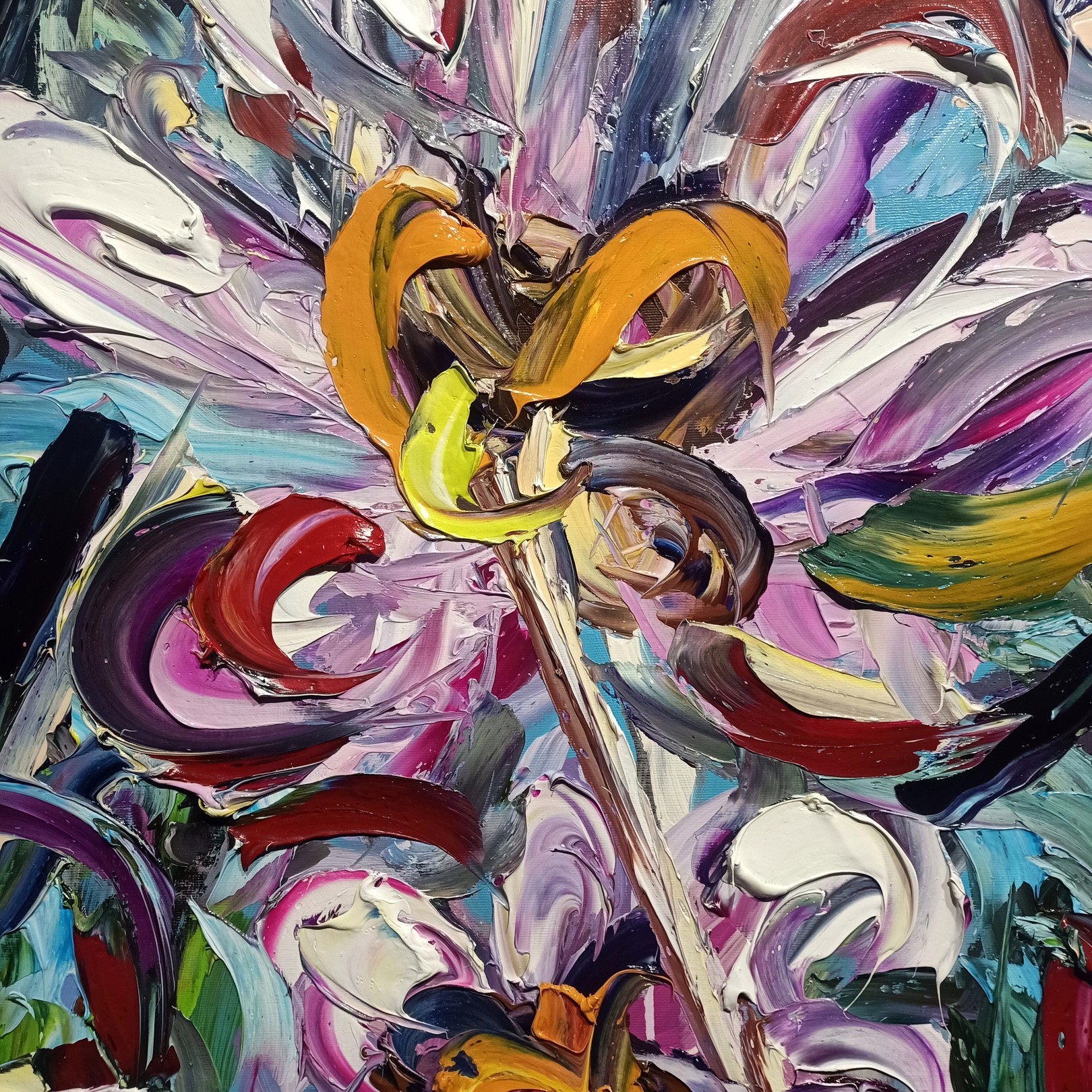 The composition does not depict a literal subject; instead, it evokes an energetic bloom—an expansion of color and form that feels alive and in motion. From a distance, the painting reads as a powerful, luminous field; up close, the viewer discovers intricate textures and bold chromatic interactions shaped by decisive, physical strokes.
