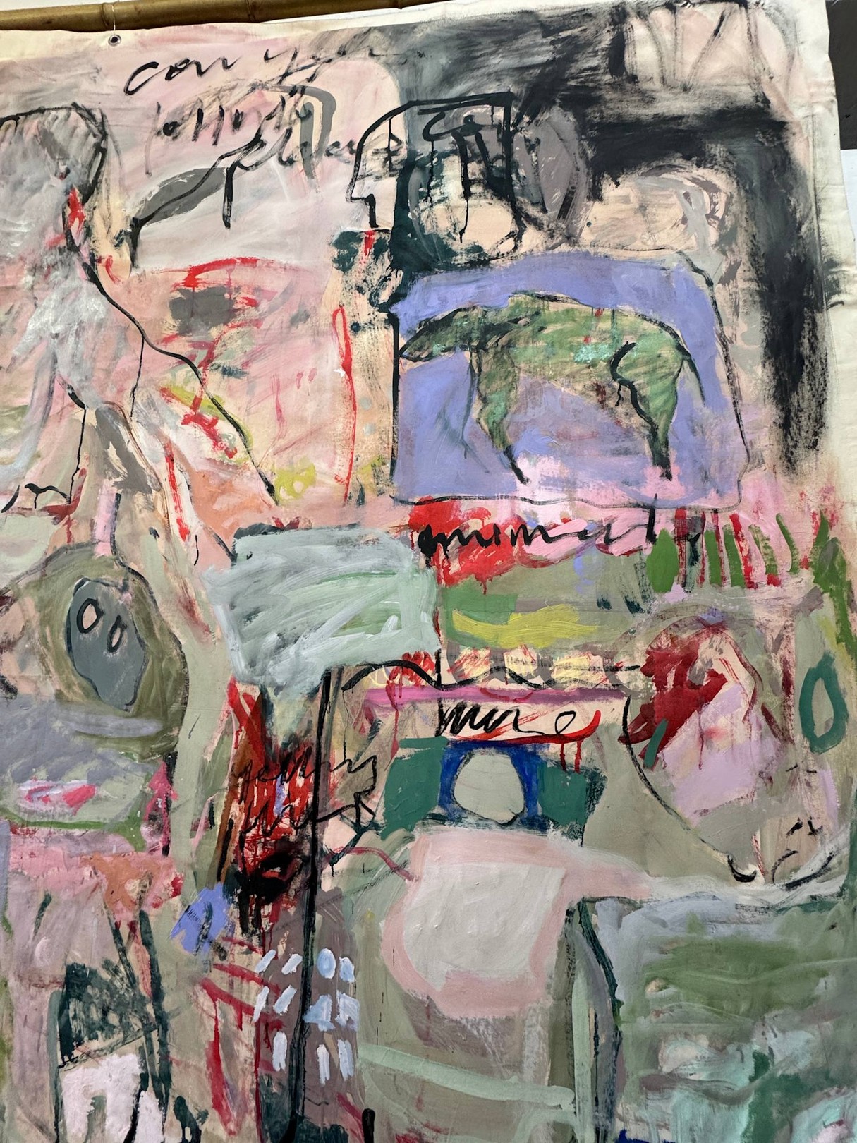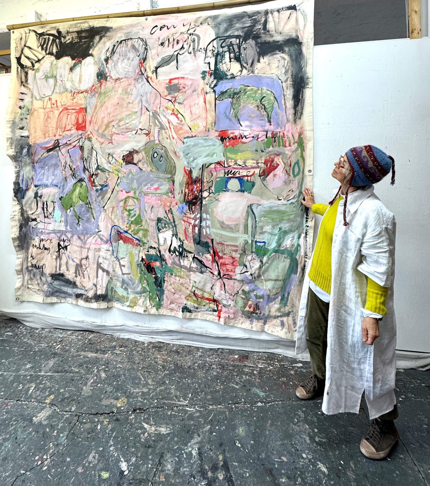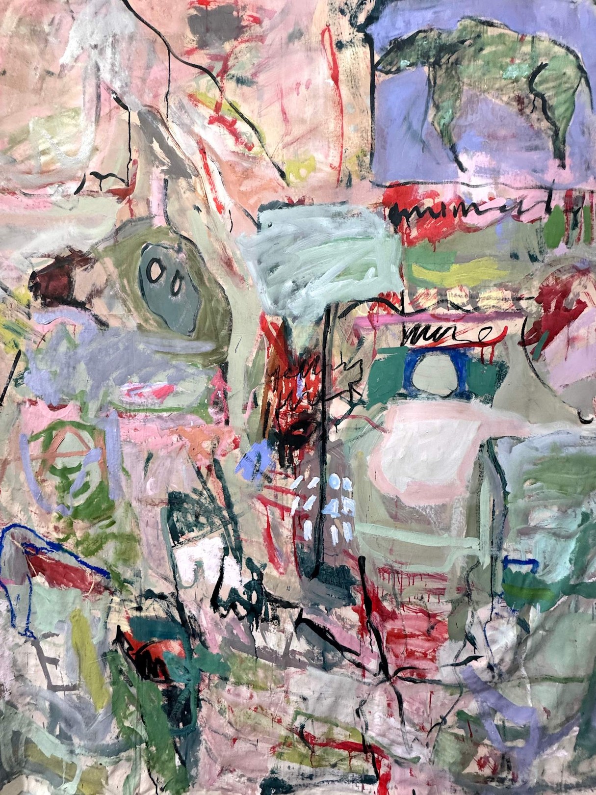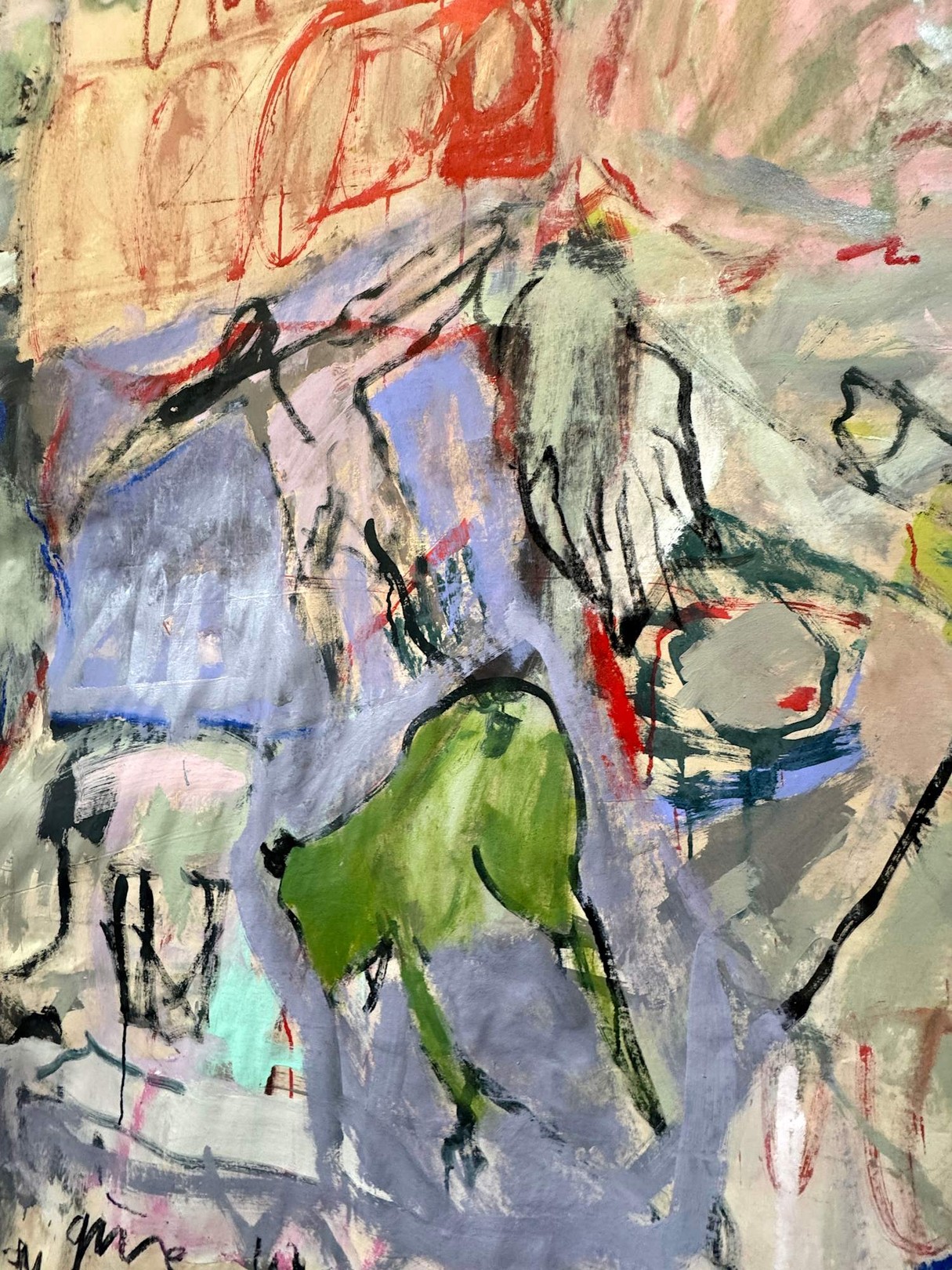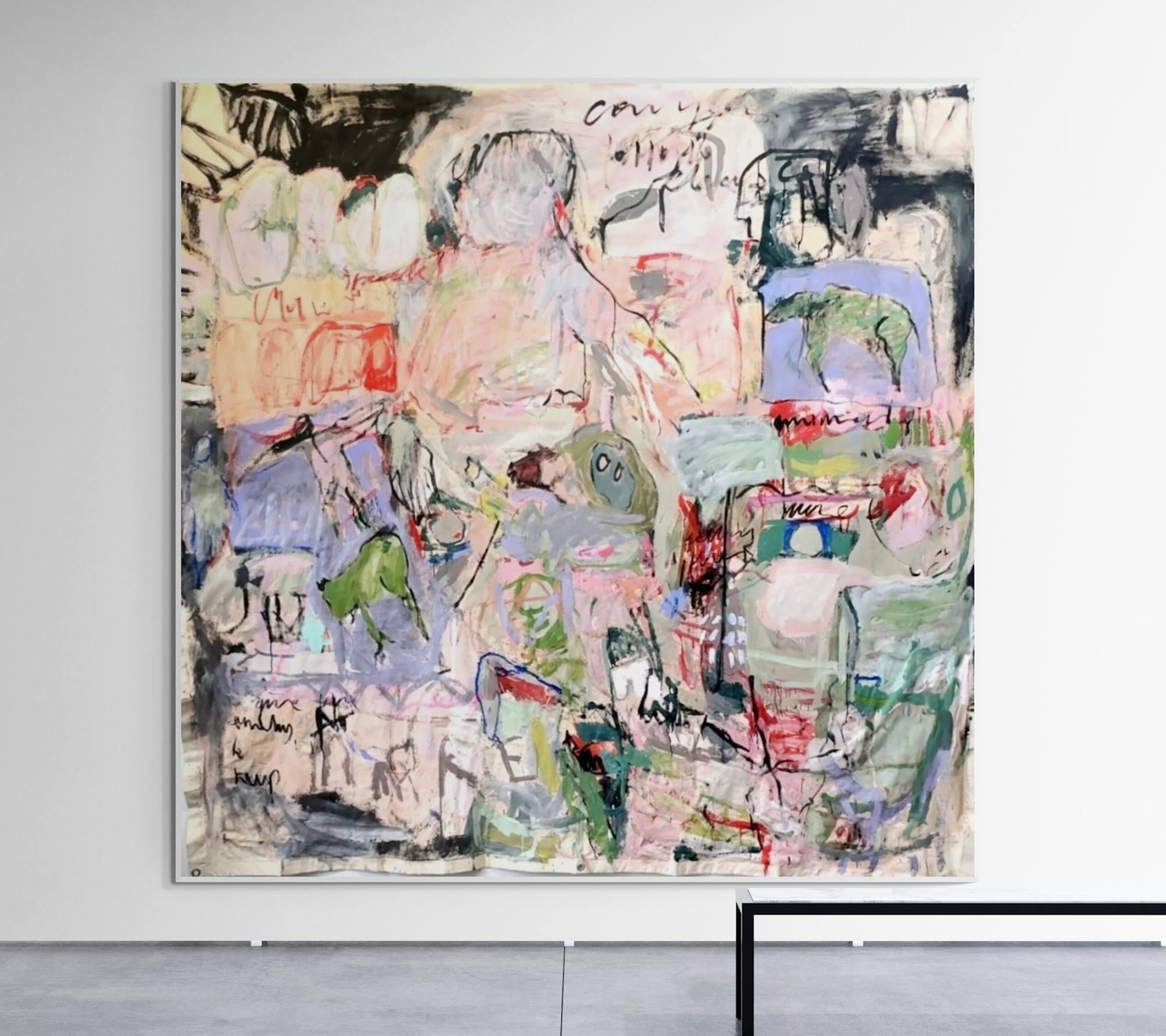 This large-scale piece hanging unstretched like a carpet is a vivid, associative collage of the artist’s life, created through a dynamic and intuitive process. Human figures of varying sizes emerge across the canvas, coming and going like scenes in a film . These figures are woven into a tapestry of everyday life, dreams, and memories, forming a complex narrative. Scribblings and sketches further enrich this emotionally charged work, contributing to its raw, expressive power.