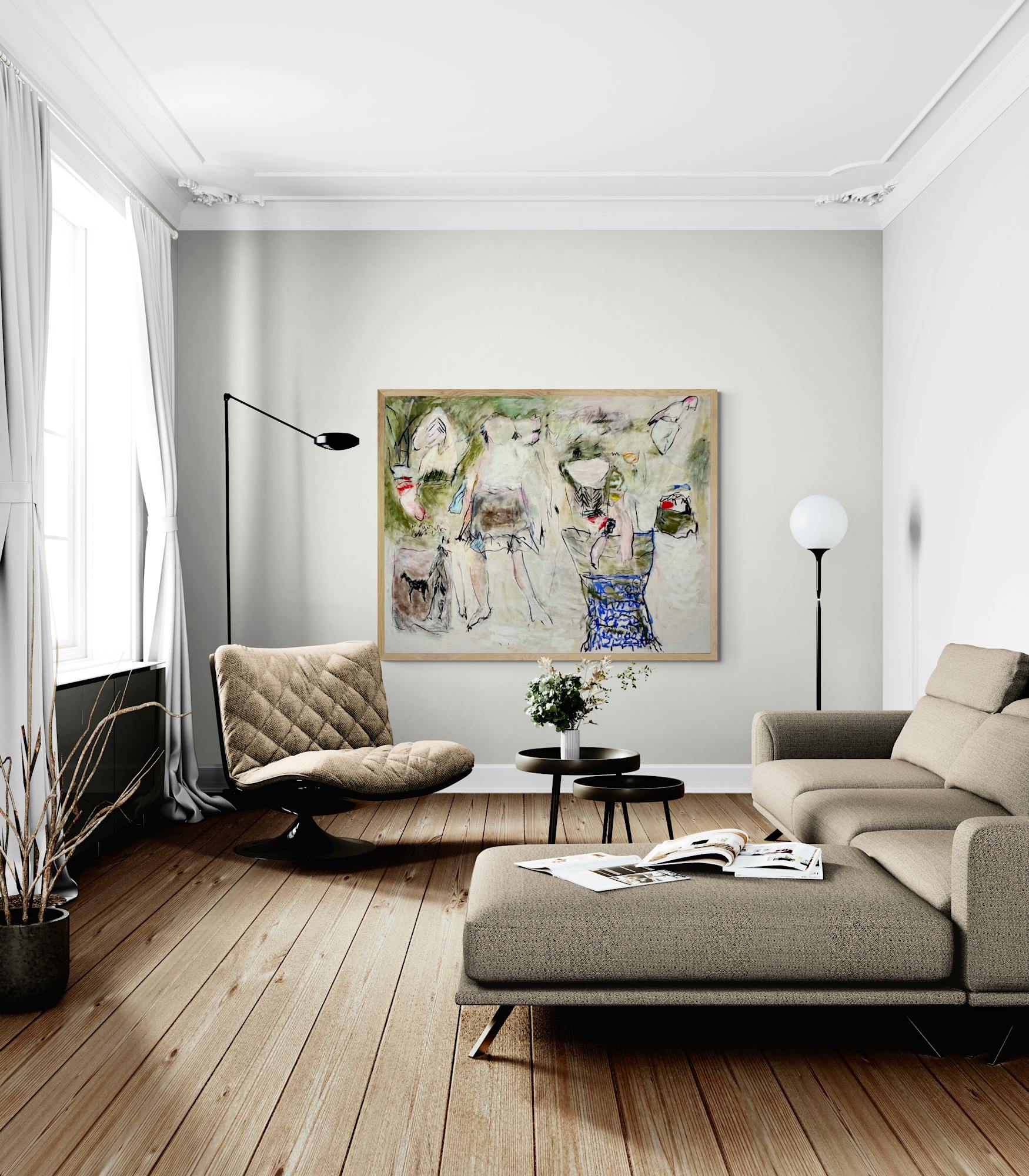 Not stretched. You will receive it rolled, in a tube, ready for stretching. We recommend having your painting stretched at a local custom framing shop, which is usually the most affordable and convenient option for large canvases. You can also contact us to check the possibility of having it framed directly by our team.