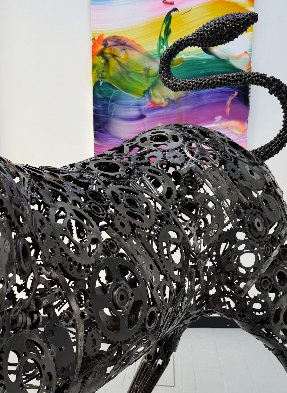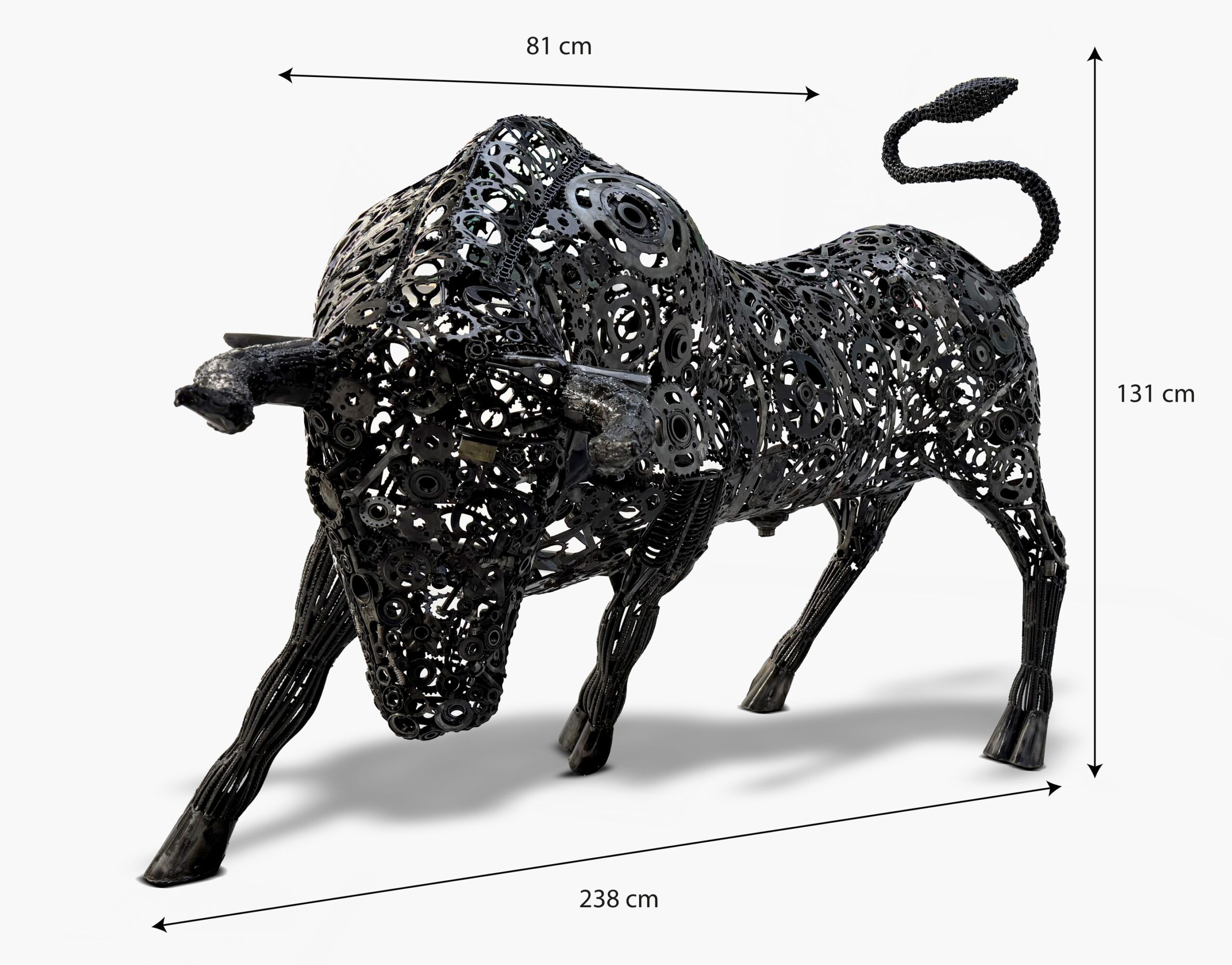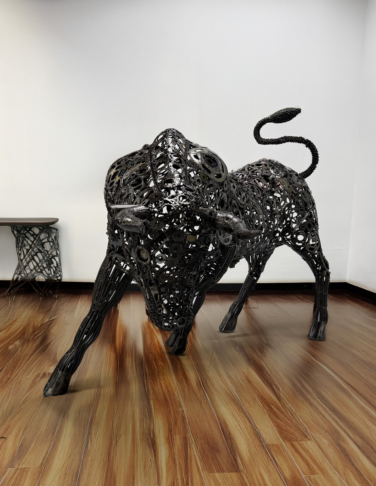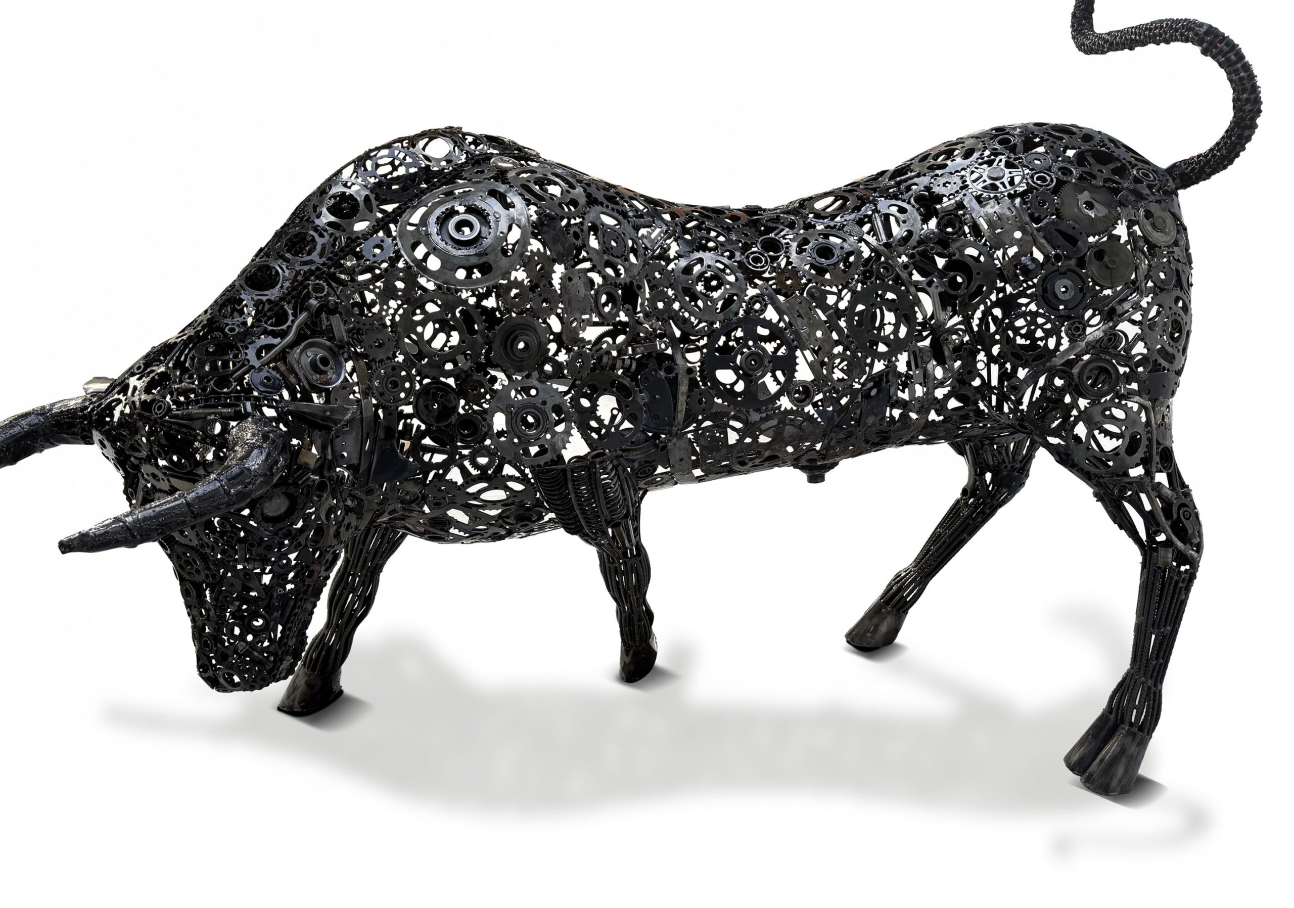Crafted from meticulously assembled recycled mechanical components, is a powerful, full-scale sculpture that captures the raw energy and motion of a bull in mid-charge. The intricate structure is composed of automotive gears, chains, and other metal parts.