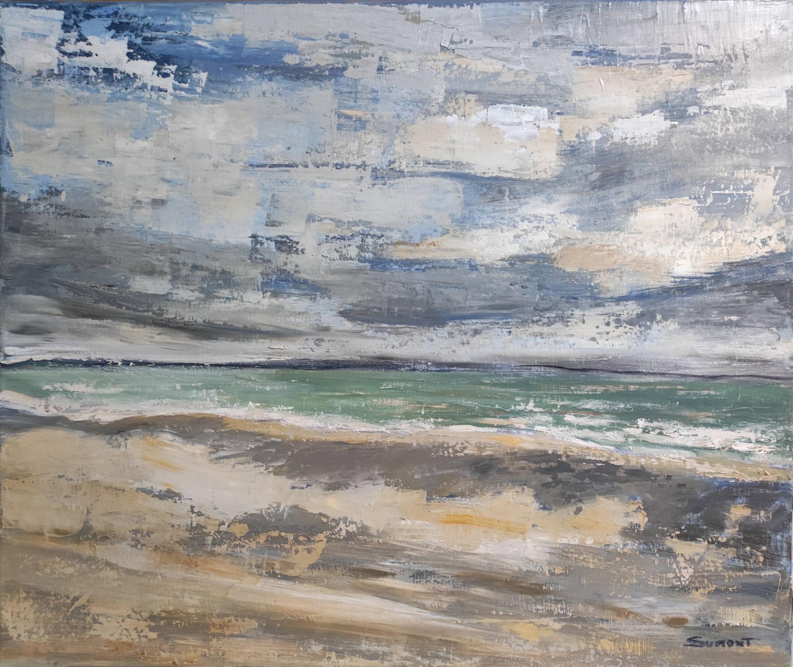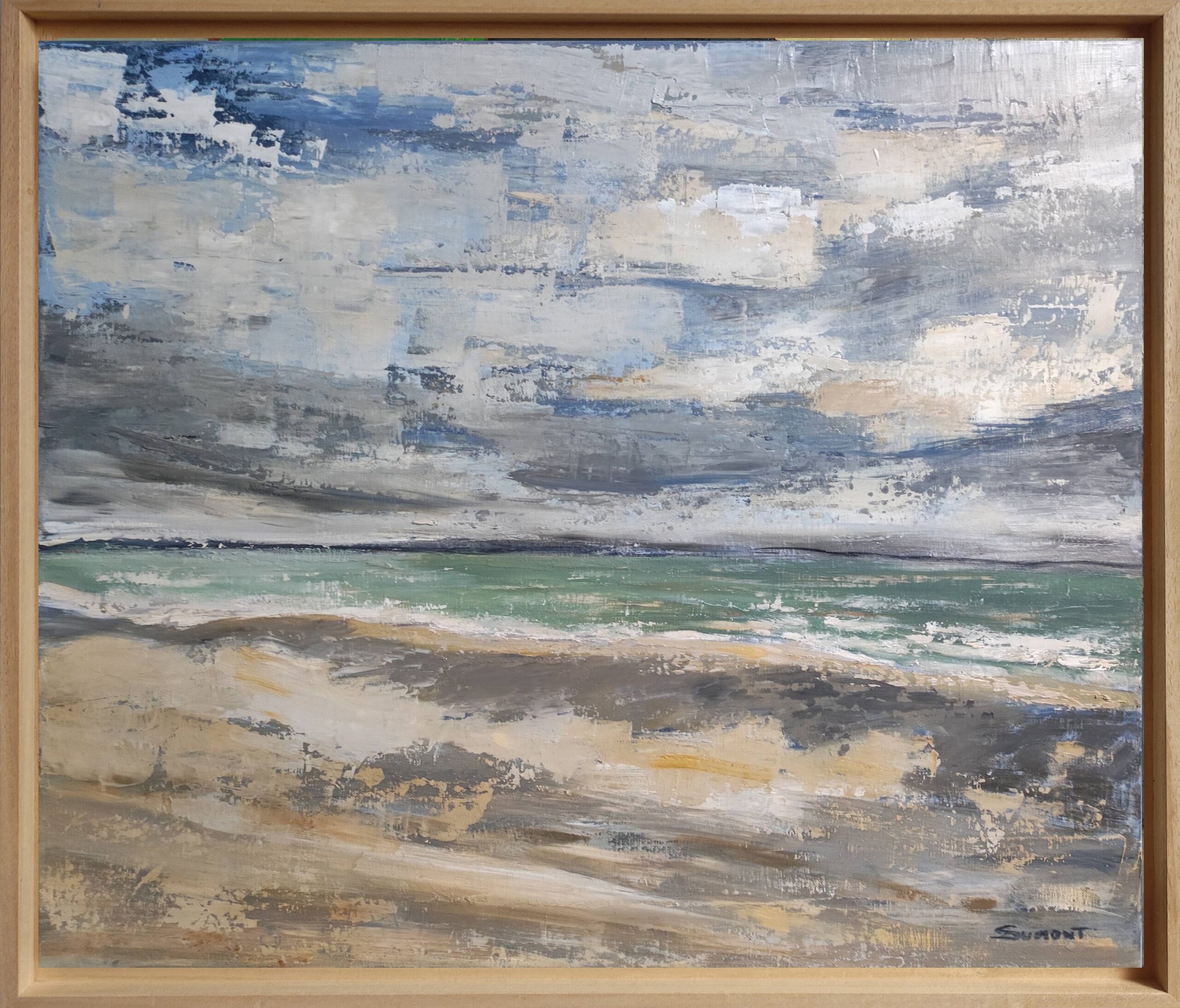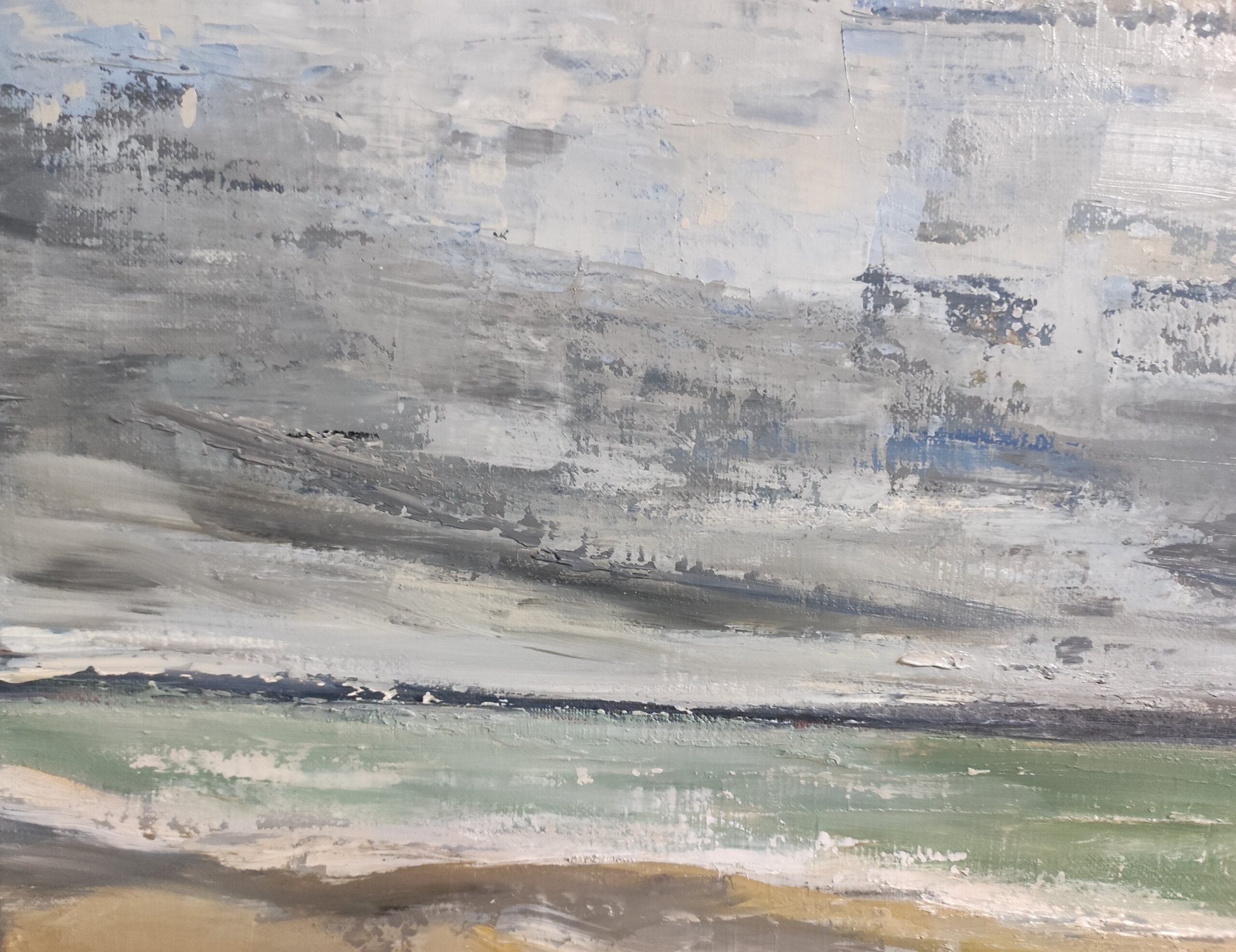 A trailing sky as we are used to in Normandy, skies changing very quickly, good and brief showers… Landscape, seascape, between sky and sea, painting of a beach in Normandy with a cloudy sky treated with oil and with a knife.
