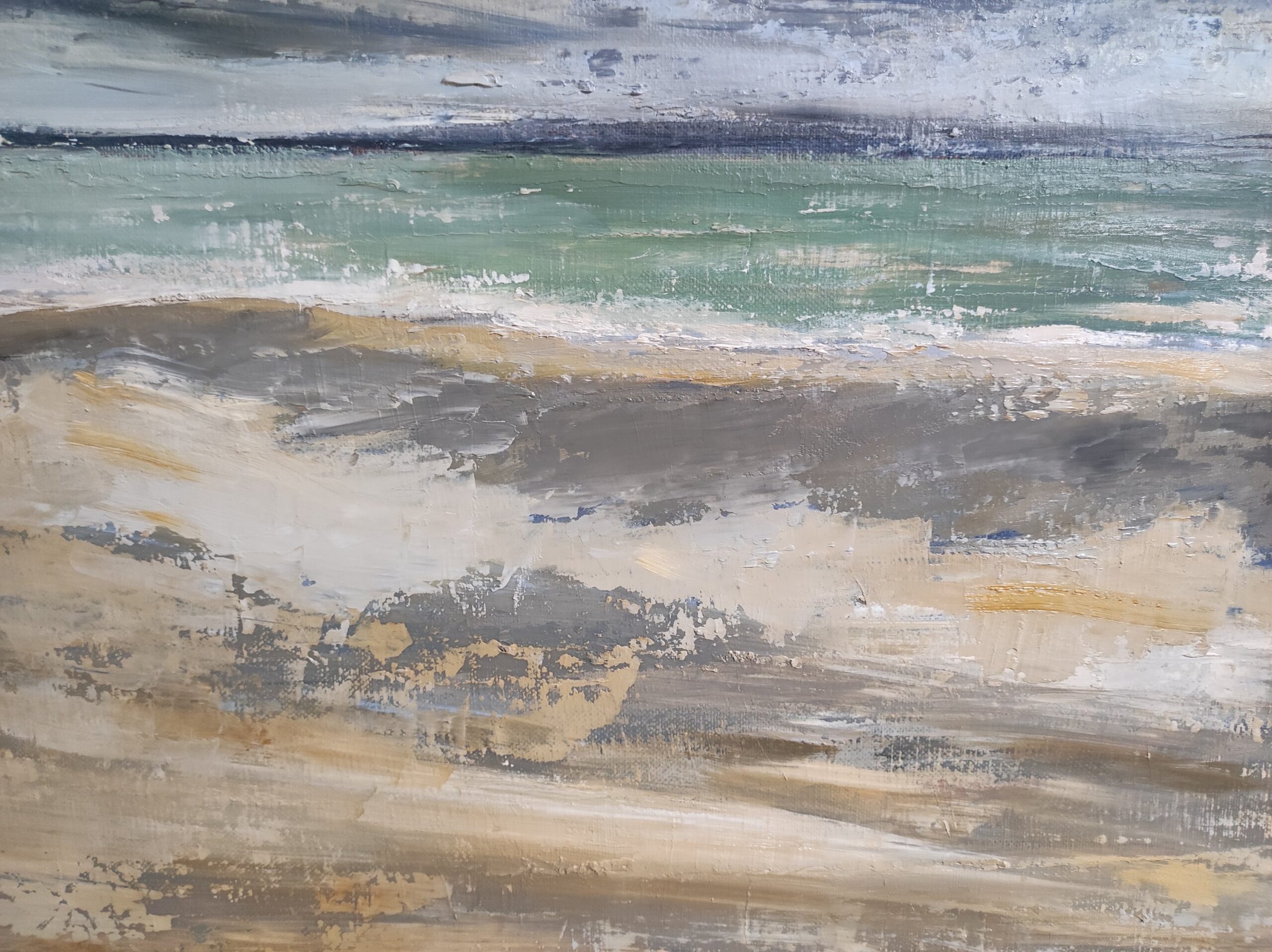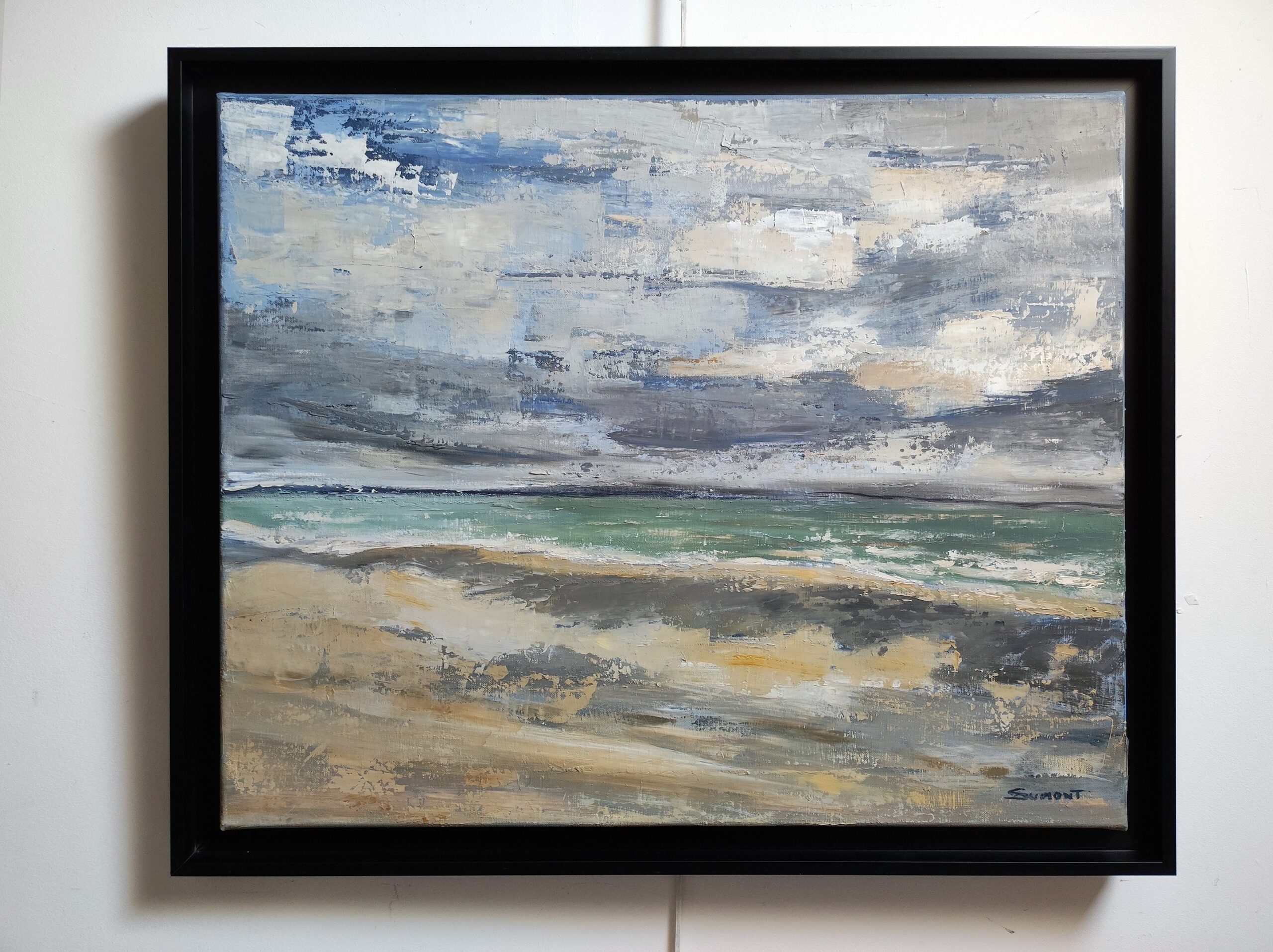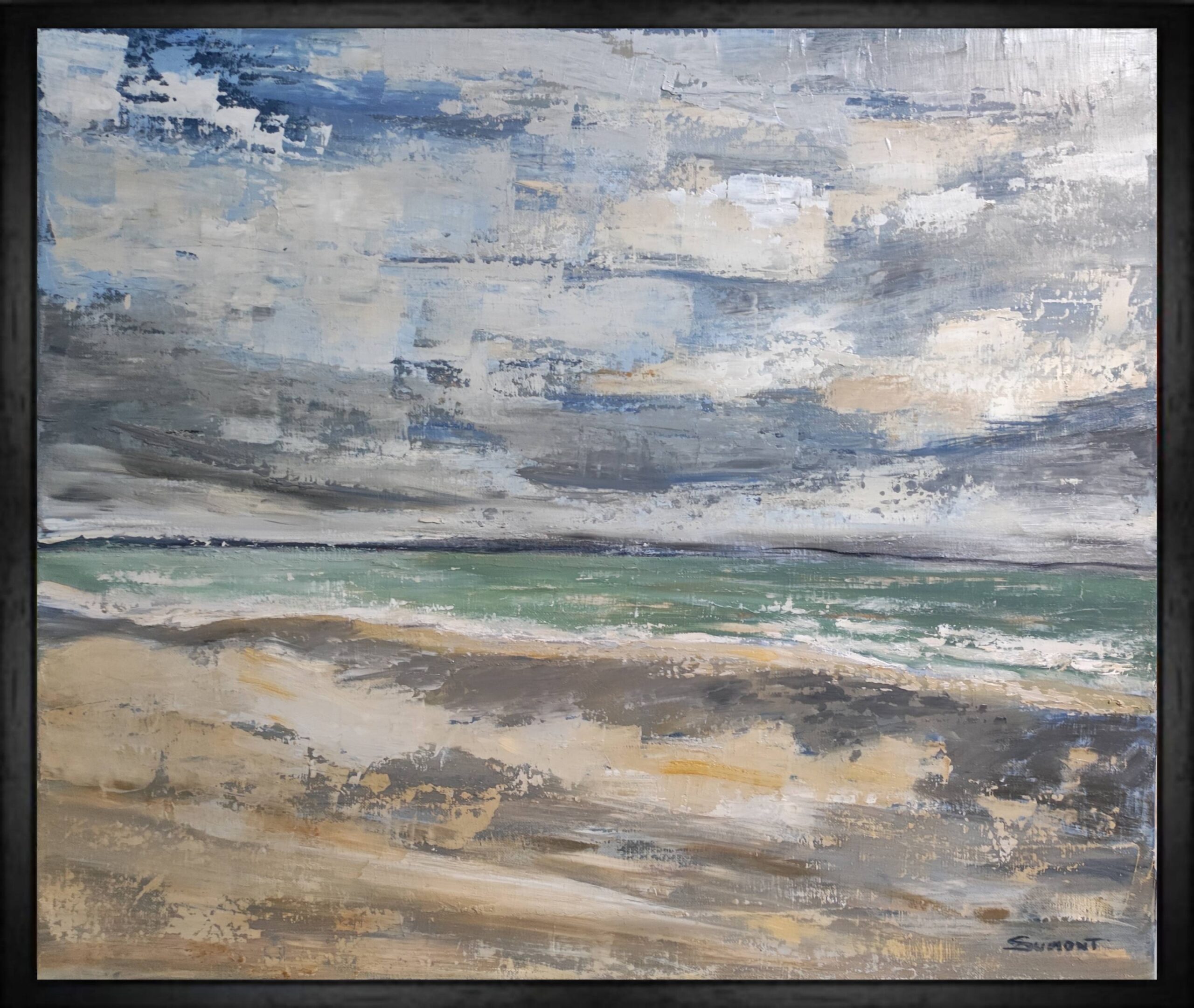 A trailing sky as we are used to in Normandy, skies changing very quickly, good and brief showers… Landscape, seascape, between sky and sea, painting of a beach in Normandy with a cloudy sky treated with oil and with a knife.