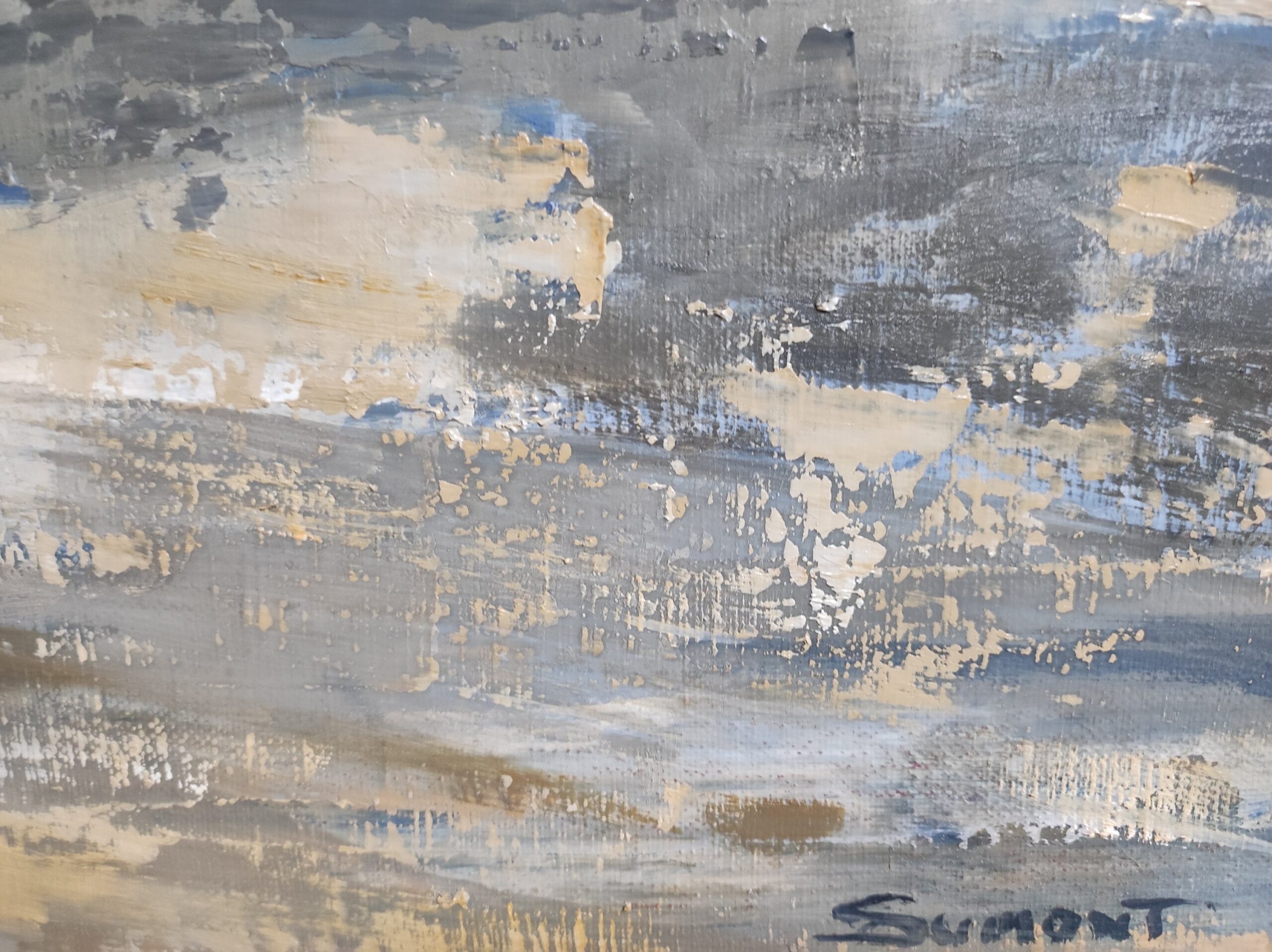 Sky and sea end up merging. Capturing the present moment, the light of the moment so fleeting and changing, such is the challenge of the artist. The multiple layers of matter patiently elaborate the transparencies from which the lights spring. The artist strives to translate the movement of clouds, the variations of light and air.