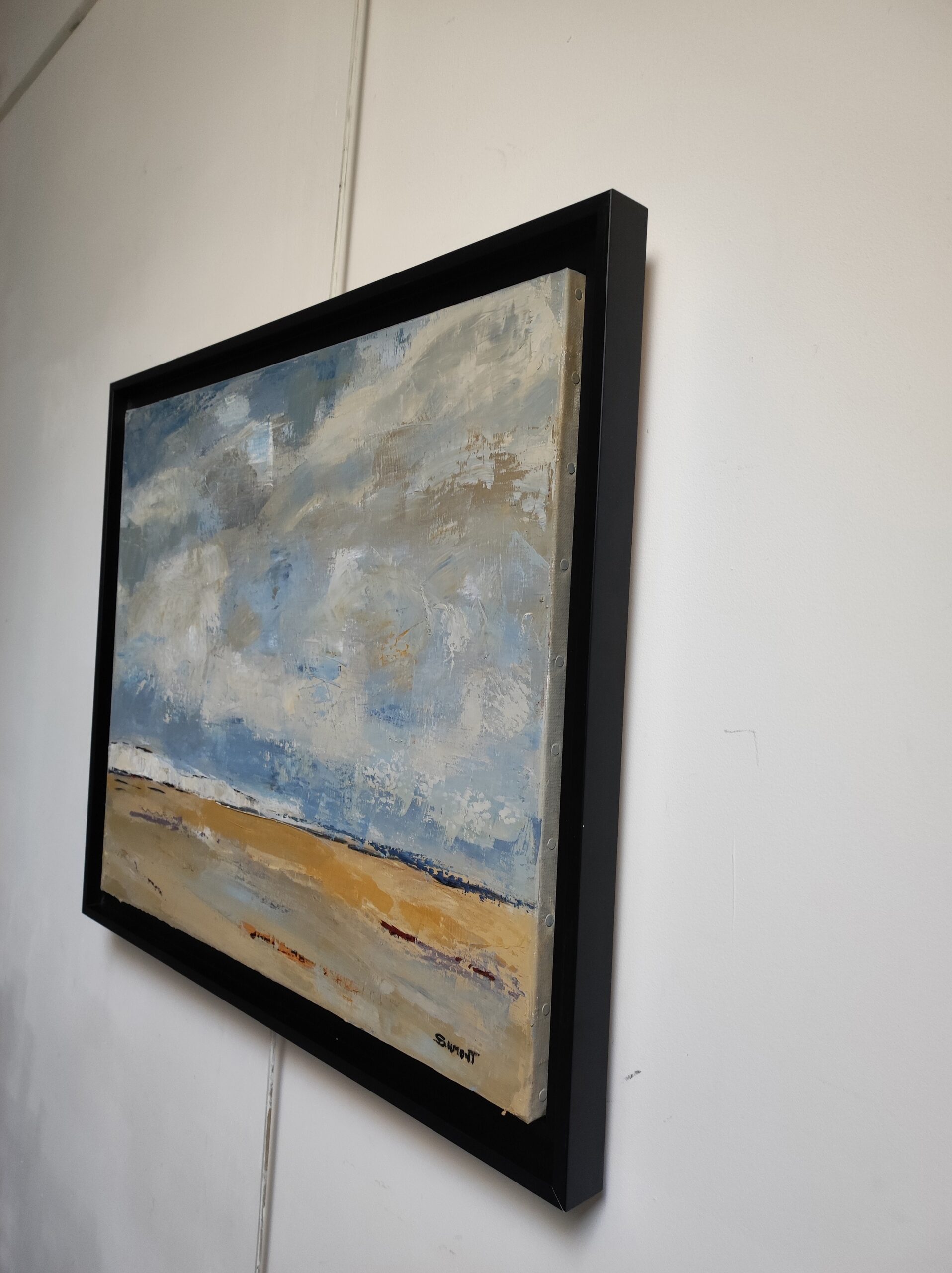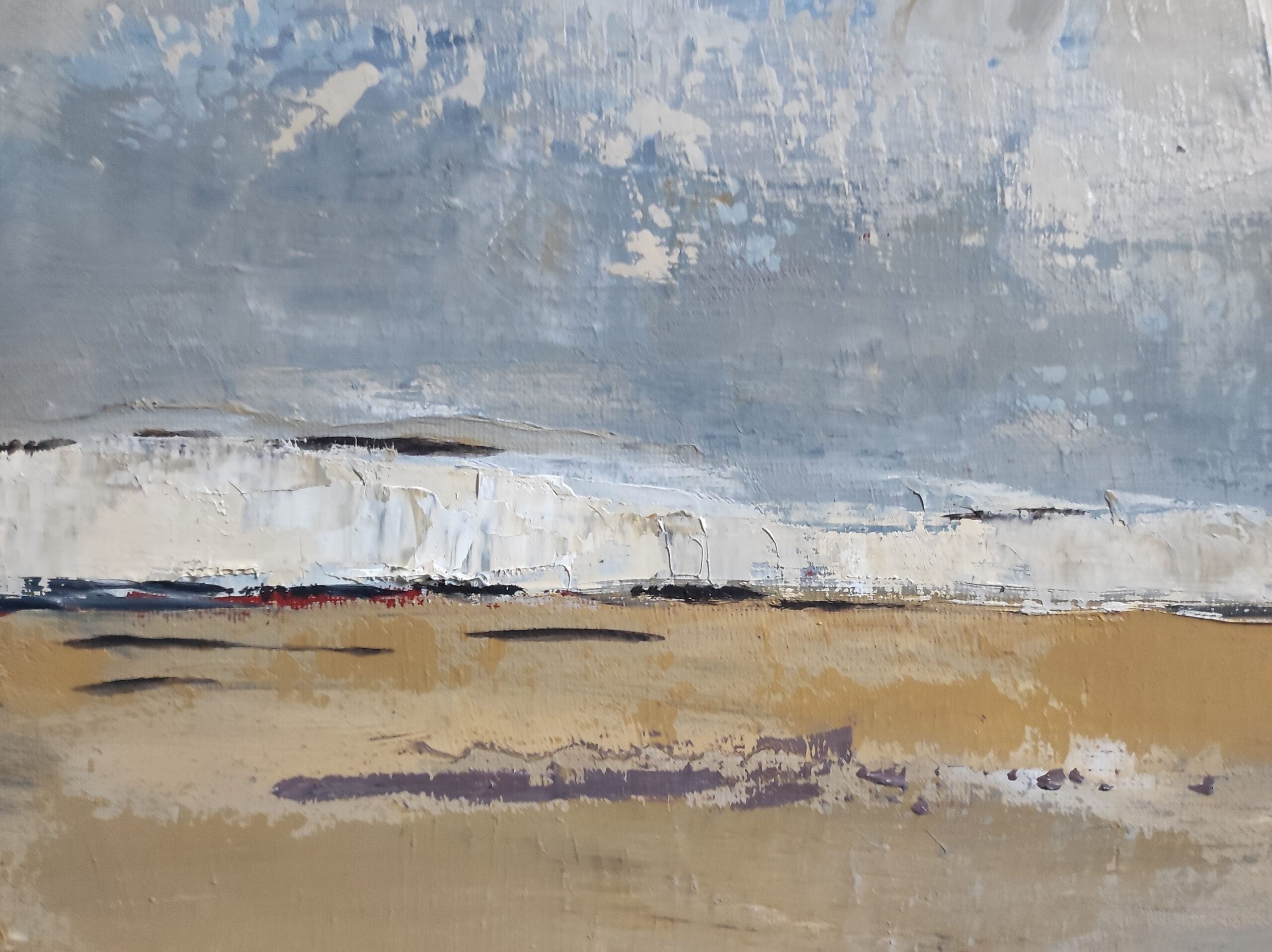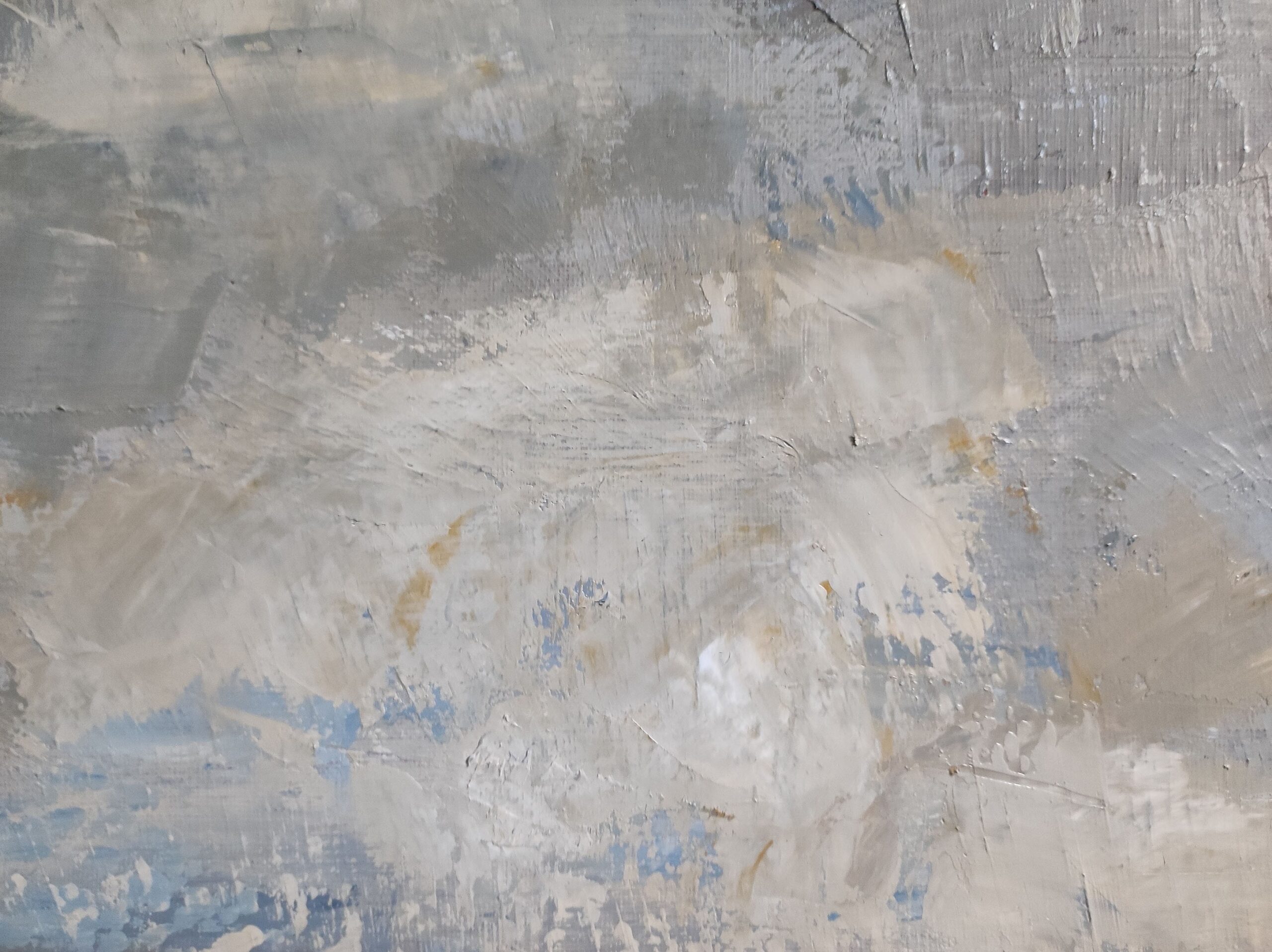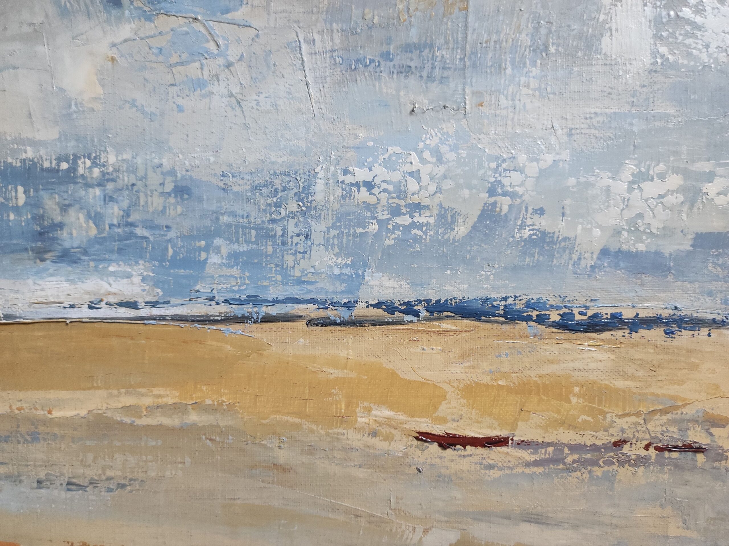 Sky and sea end up merging. Capturing the present moment, the light of the moment so fleeting and changing, such is the artist’s challenge. The multiple layers of material patiently develop the transparencies from which the lights emerge. the artist strives to translate the movement of the clouds, the variations of light and air.