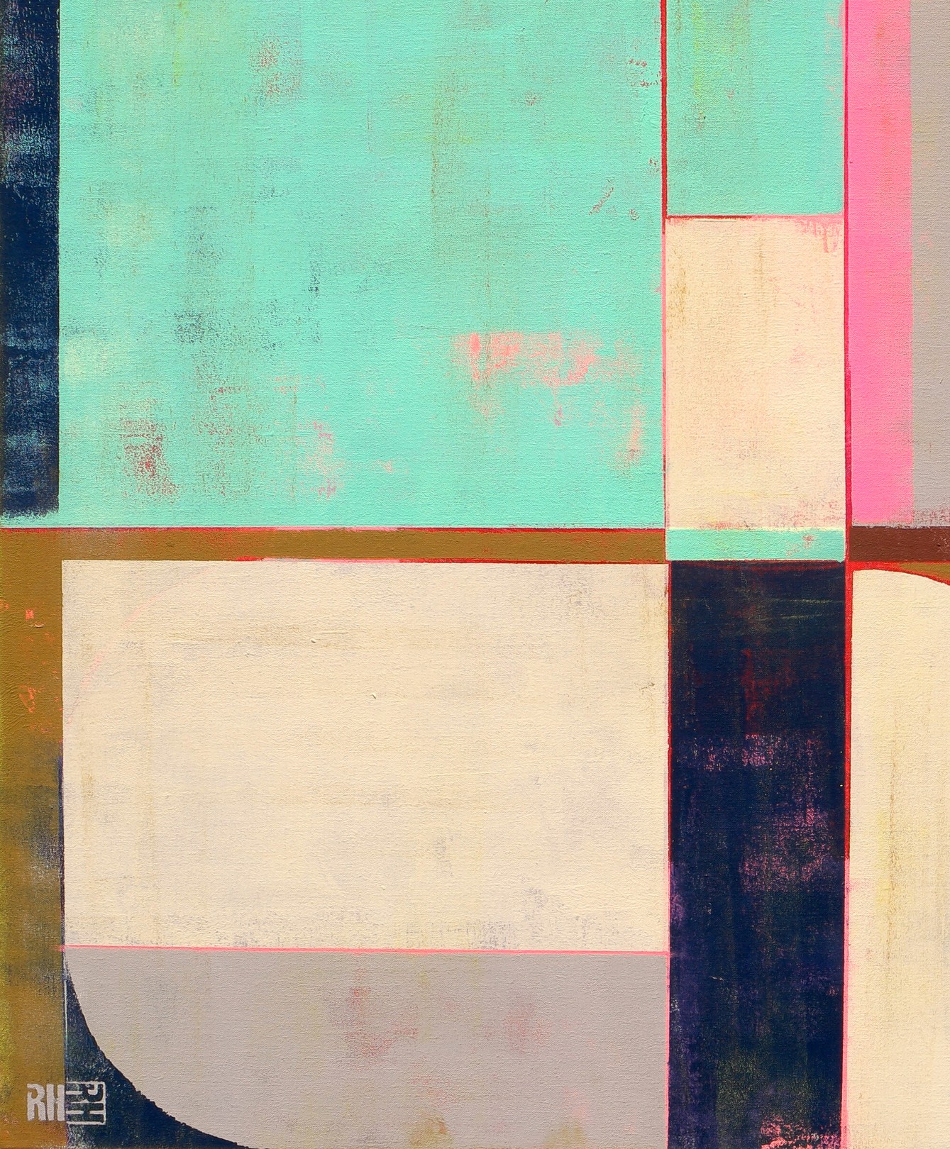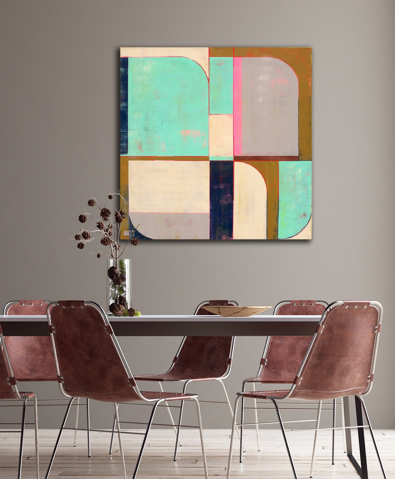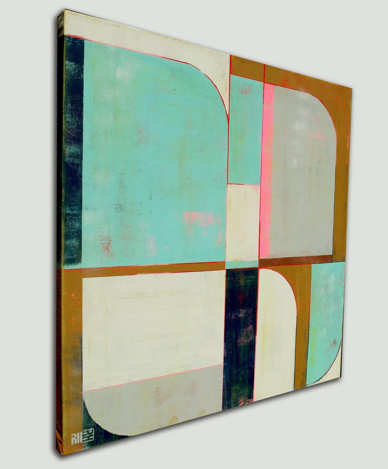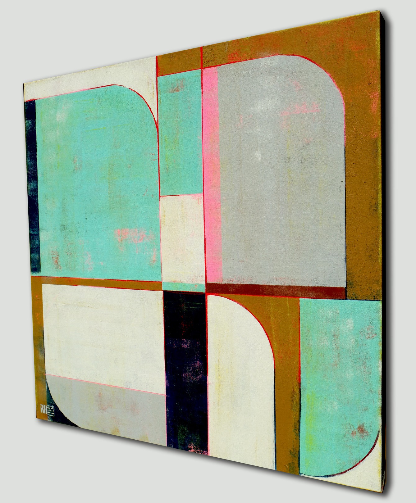 This artwork is a striking example of modern abstract composition, featuring a harmonious blend of geometric forms and muted colors. The canvas is divided into rectangles and curves, creating a balanced juxtaposition of shapes. The palette of soft turquoise, cream, and gray is punctuated by a bold strip of pink, adding a surprising focal point. The use of earthy brown borders enhances depth, guiding the viewer’s eye across the piece. Subtle texture and brushwork lend a tactile quality, inviting closer inspection. This piece masterfully combines simplicity with complexity, evoking a sense of calm and order while encouraging contemplation.