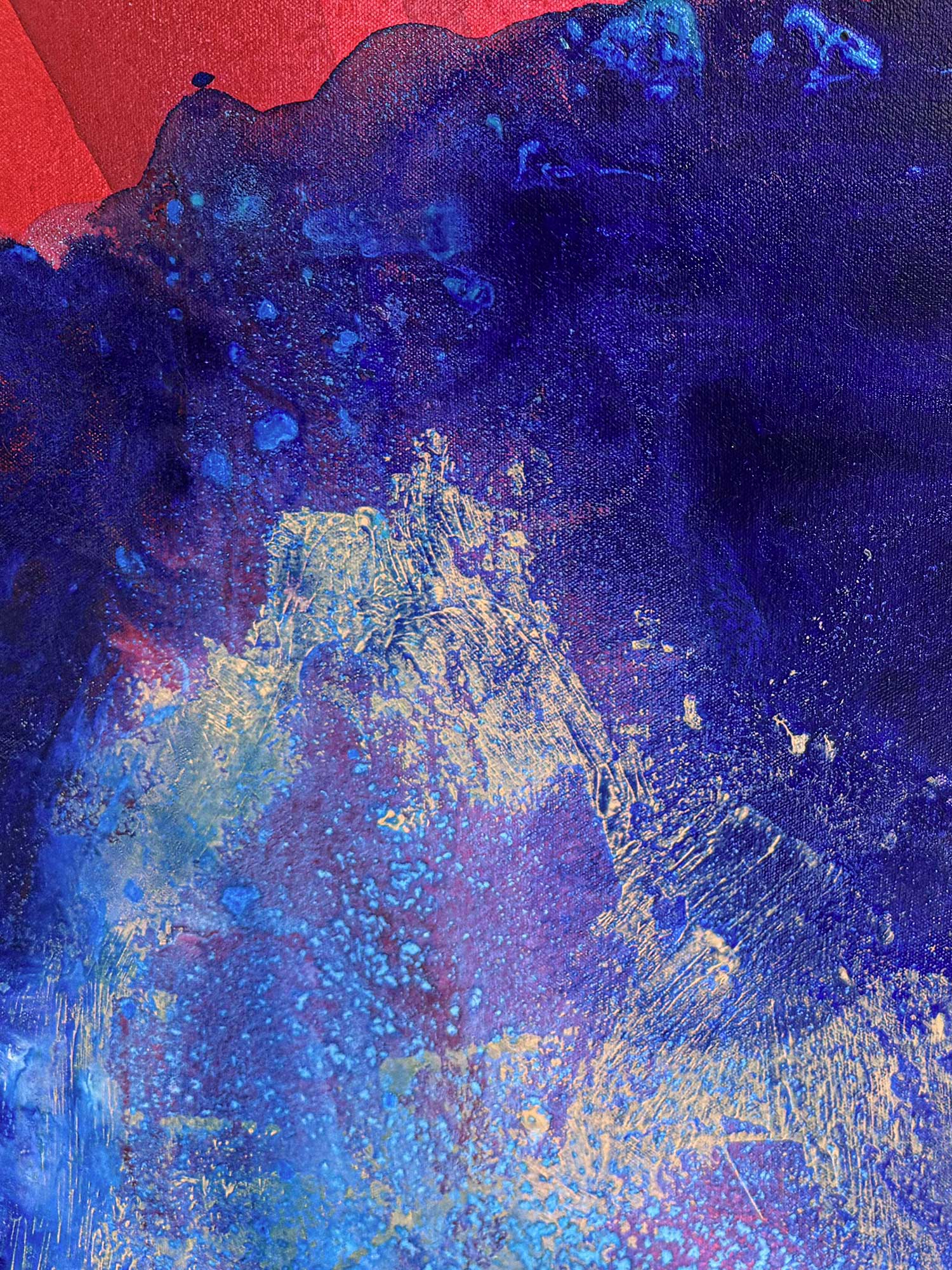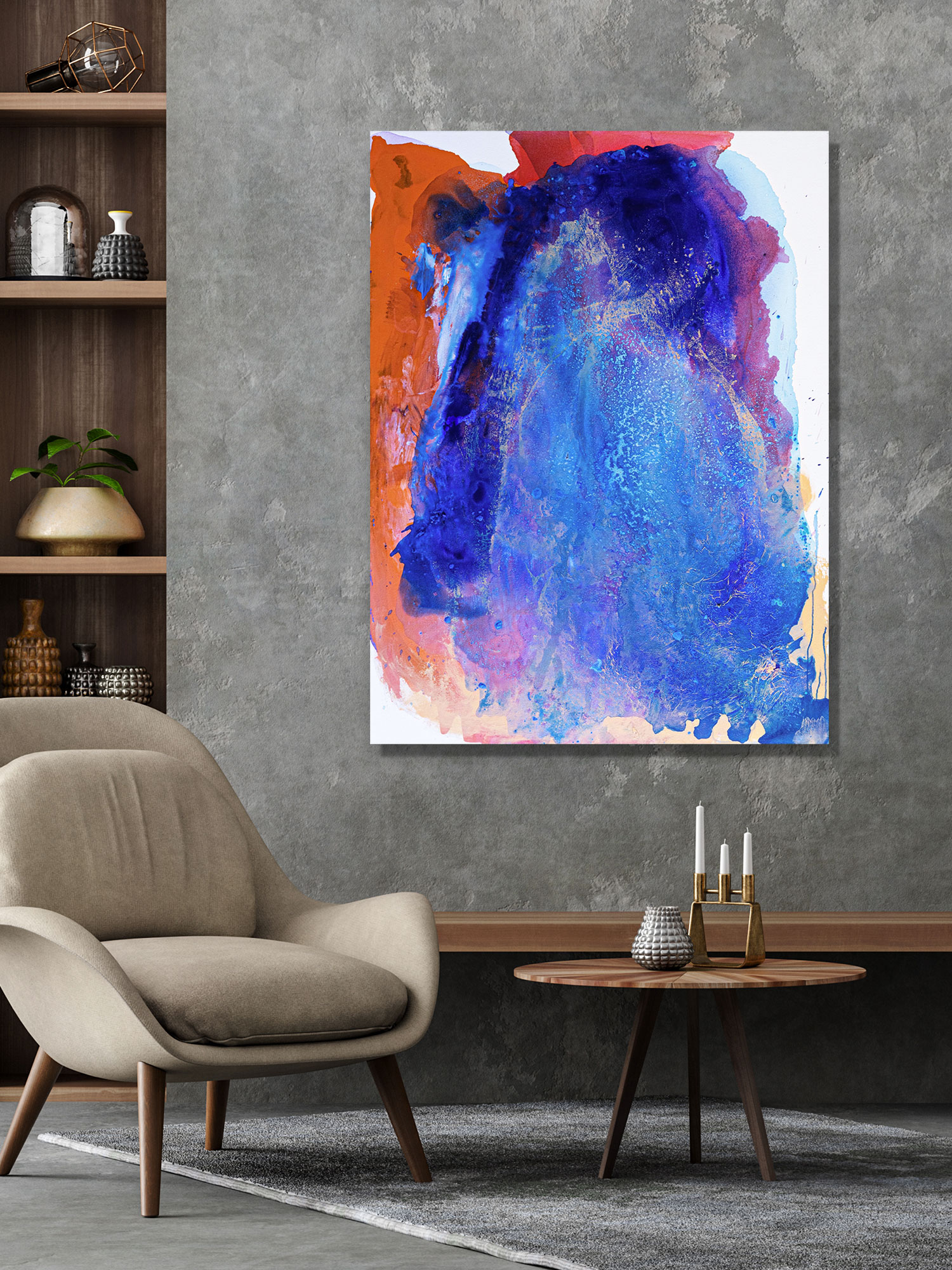 This artwork showcases a mesmerizing abstract composition dominated by vibrant blues and purples, merging seamlessly to create a fluid visual experience. The central focus is a dynamic cascade of deep blue hues, bursting with energy and layered with subtle textural details that suggest depth and movement. Surrounding this core are vivid splashes of orange and hints of red, providing a striking contrast that enhances the piece’s overall vibrancy. The use of color is both bold and harmonious, expertly guiding the viewer’s gaze across the painting. The artist’s technique conveys a sense of spontaneity and freedom, inviting a personal interpretation. The interplay of colors and textures evokes an emotional response, making this piece a compelling example of abstract expressionism. Its bold color palette and organic forms make it a standout work that captures the viewer’s attention and sparks the imagination.
