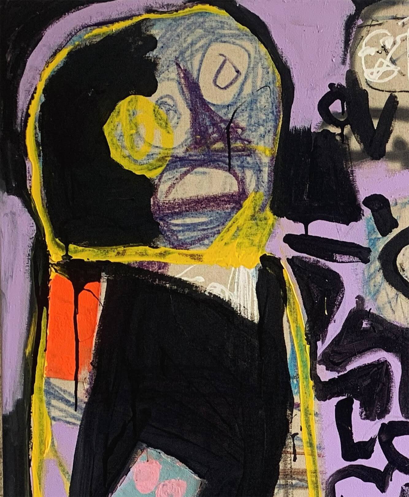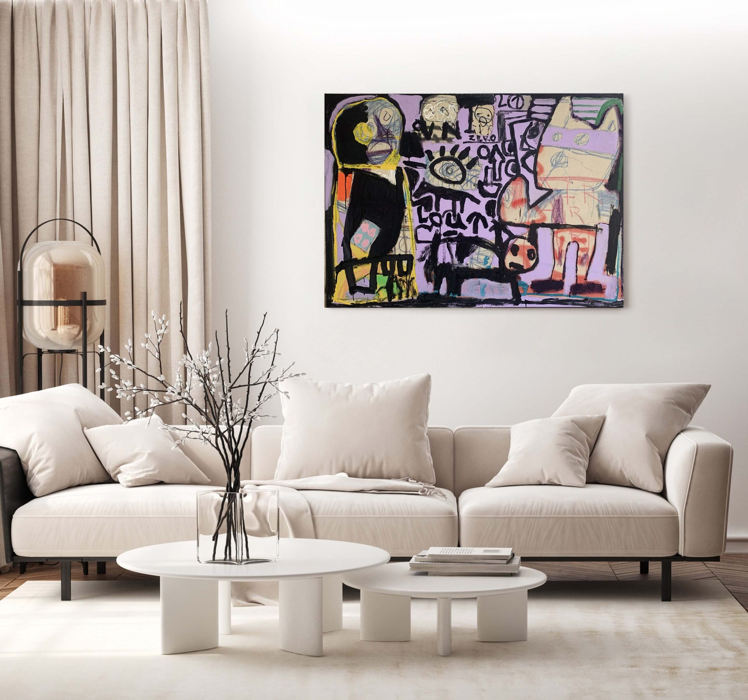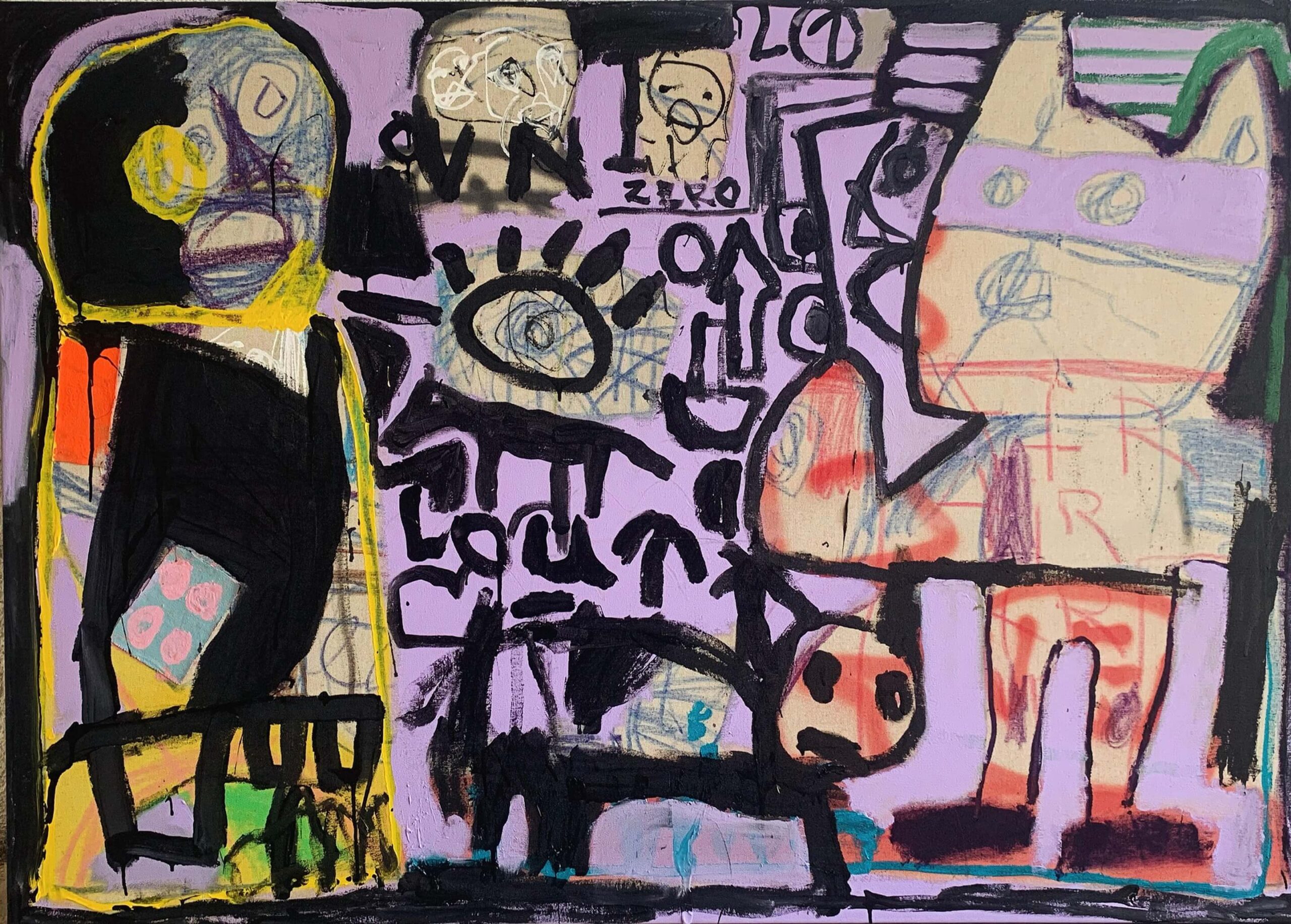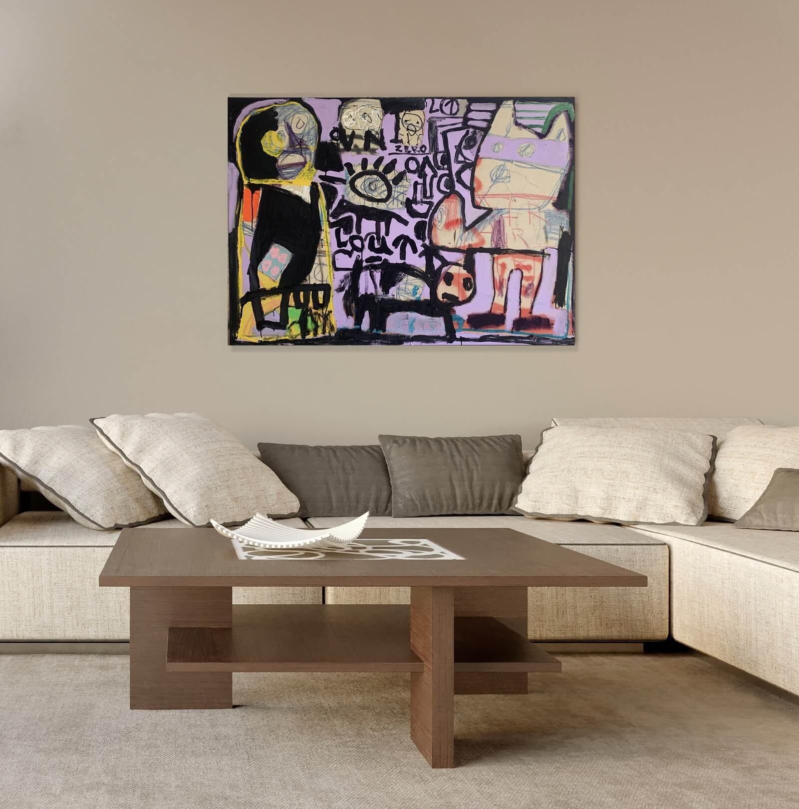 This artwork bursts with vivid energy and abstract expression. Dominated by purple hues, it features a chaotic assembly of figures and symbols that evoke a sense of spontaneity. On the left, a figure with a mask-like face is juxtaposed against a cat-like creature on the right. Bold black lines and eye motifs create dynamic focal points, enhancing the painting’s intensity. The incorporation of scribbles and textured layers adds depth and engages the viewer in a visual exploration. This piece uniquely combines childlike imagination with sophisticated abstraction, inviting interpretations of identity and perception. Its raw execution and striking contrast make it a remarkable example of modern expressionism.