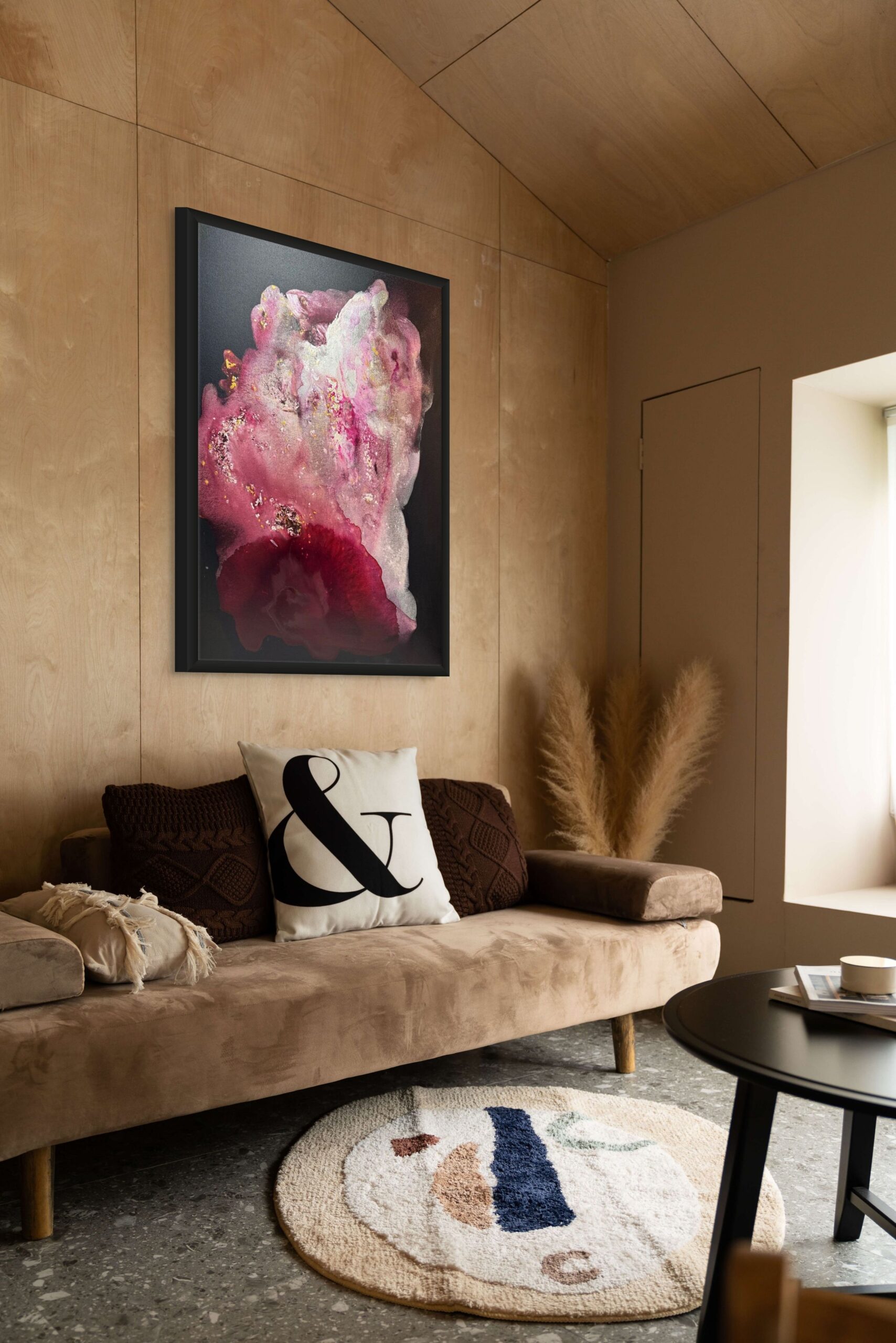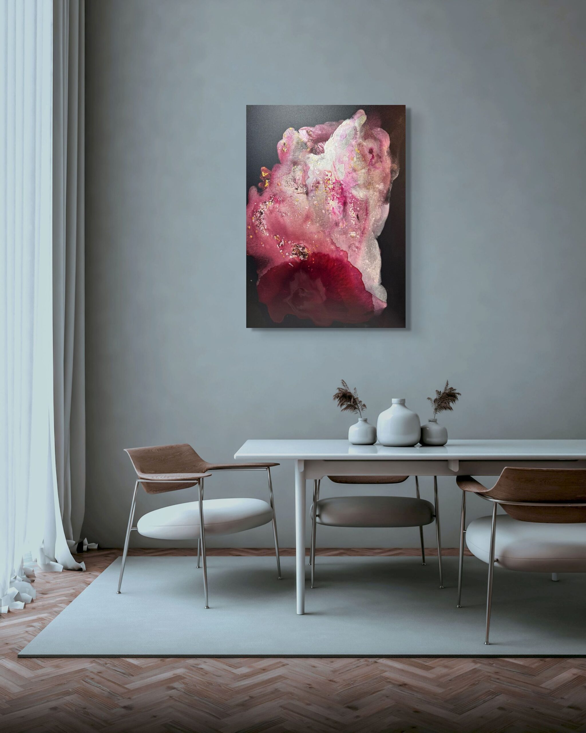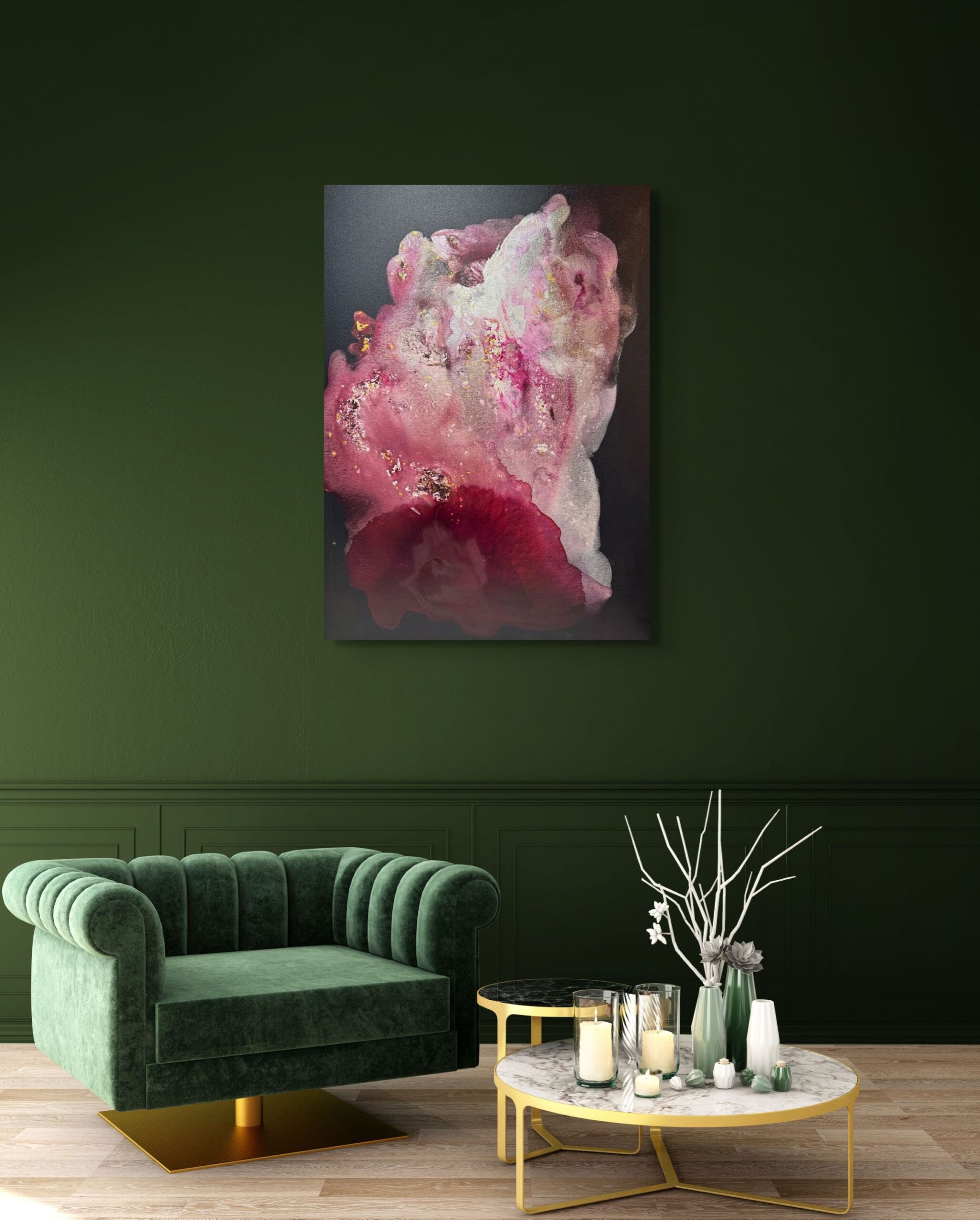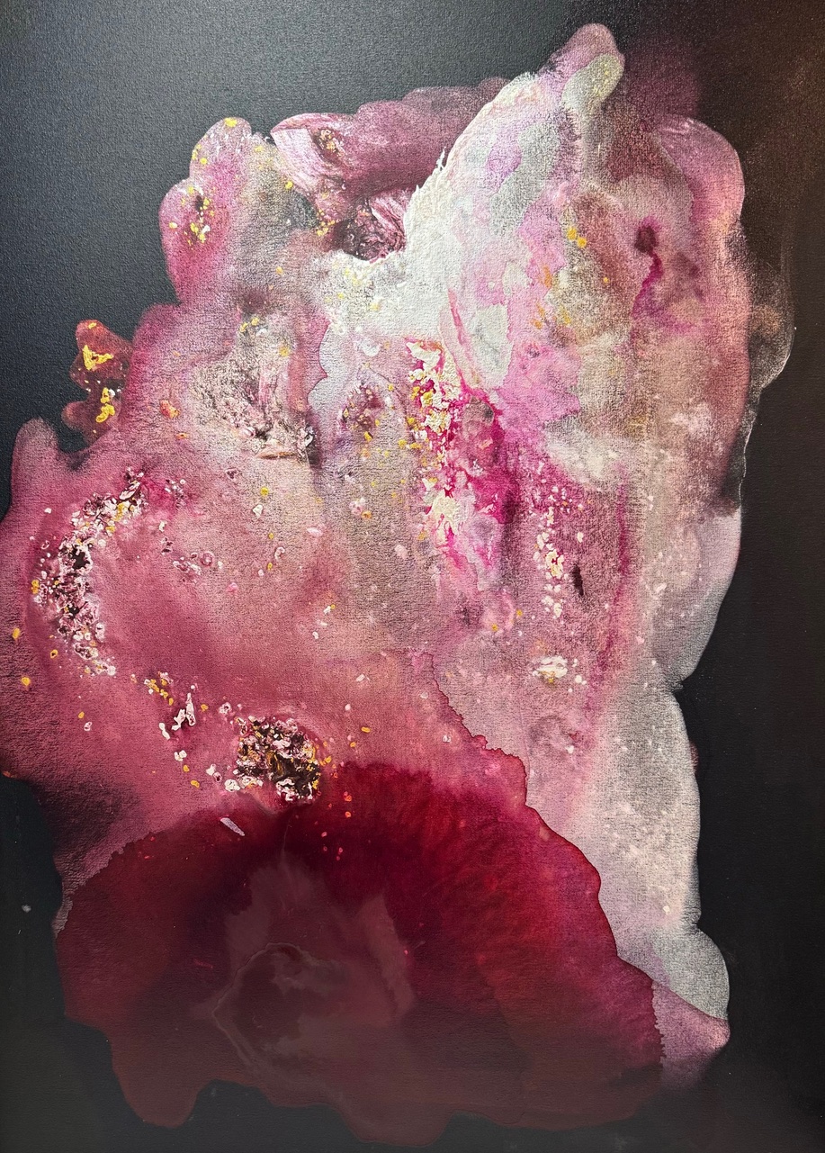 This captivating artwork is a striking abstract composition that evokes a sense of ethereal beauty. Dominated by rich shades of pink and deep red, the work features layers of flowing pigments that blend seamlessly, creating a sense of depth and movement. Subtle hints of gold leaf accentuate the piece, adding a luminous quality and depth to the visual experience. The interplay of light and shadow against the dark background crafts an illusion of blooming flora or swirling cosmic phenomena. The piece masterfully combines texture and color, inviting the viewer to explore its many layers and dimensions. Its fluidity and organic forms suggest a harmonious balance between chaos and order, encapsulating the viewer in its intricate beauty. This artwork is an embodiment of elegance and mystique, captivating audiences with its profound and vibrant expression.