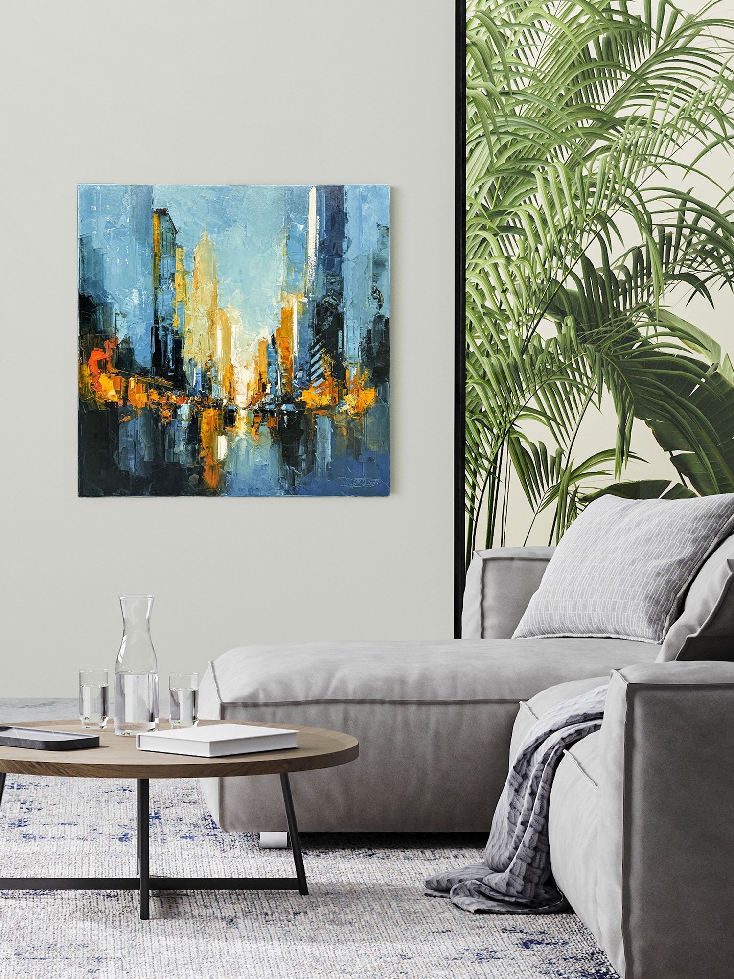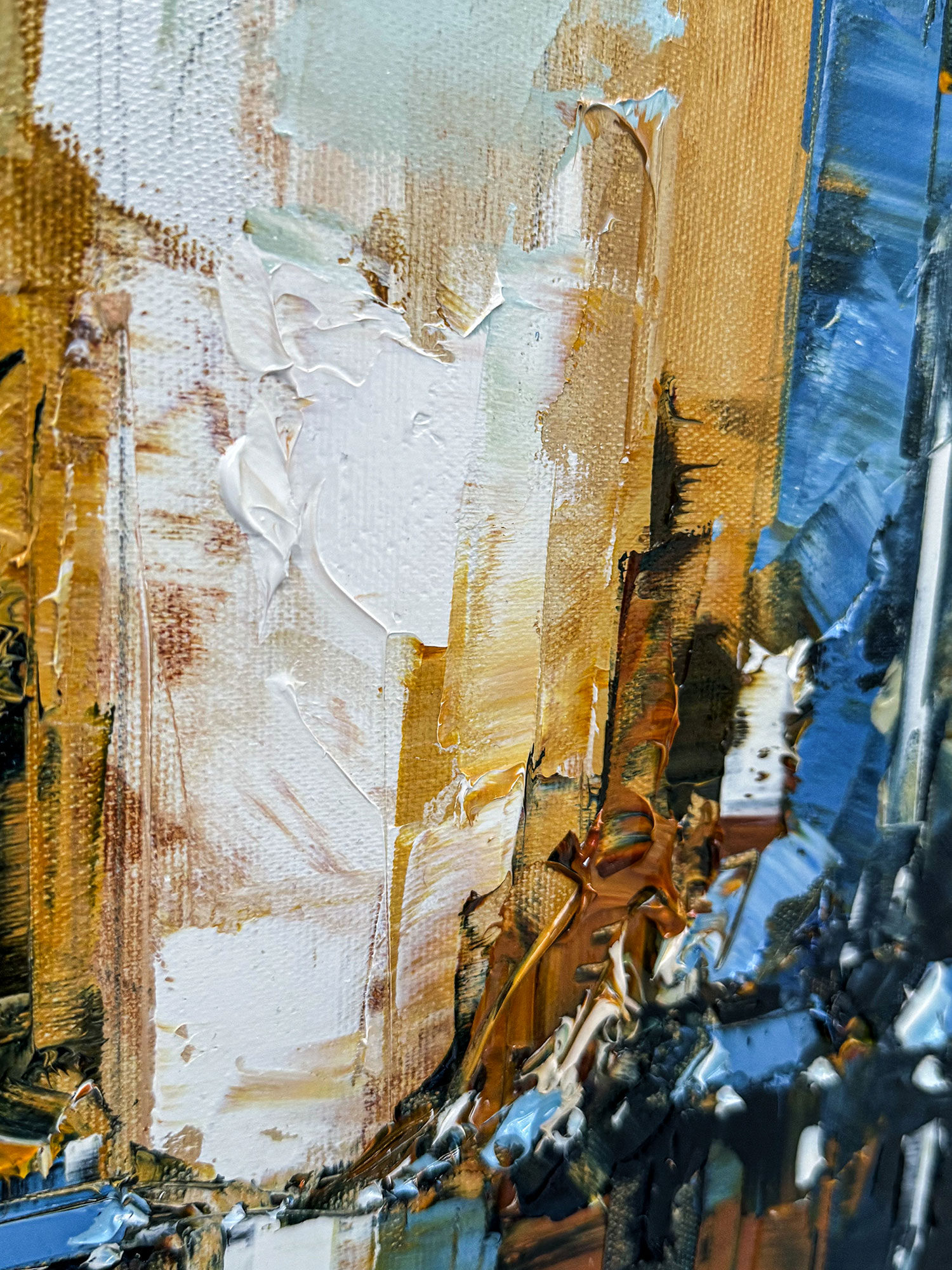 This artwork captures a vibrant cityscape, expertly rendered with thick, textured brushstrokes that create a sense of movement and energy. The canvas is dominated by towering skyscrapers, bathed in a striking interplay of blues and oranges, which evokes the feeling of a city transitioning from day to night. The warm hues suggest city lights reflecting off the surfaces, while the cool blues convey the encroaching dusk. This contrast is heightened by the impressionistic technique, drawing the viewer into the scene’s lively yet serene ambiance. The reflection of the buildings on a wet surface below adds depth and dynamism, enhancing the evocative urban experience. This piece stands out for its captivating use of color and texture, encapsulating the essence of a bustling metropolis with an artistic finesse that invites closer inspection.