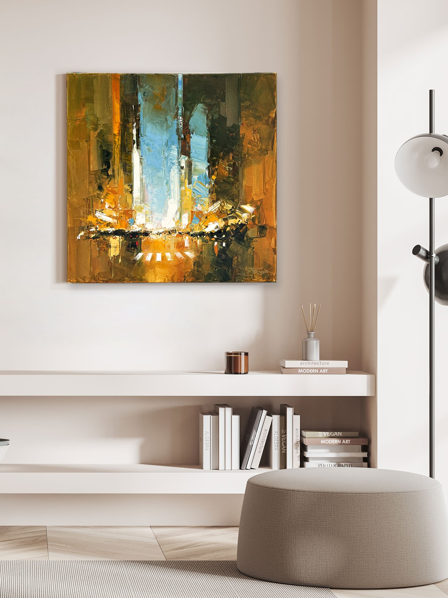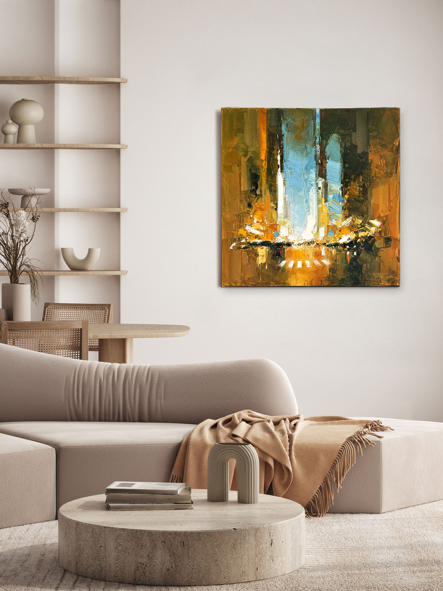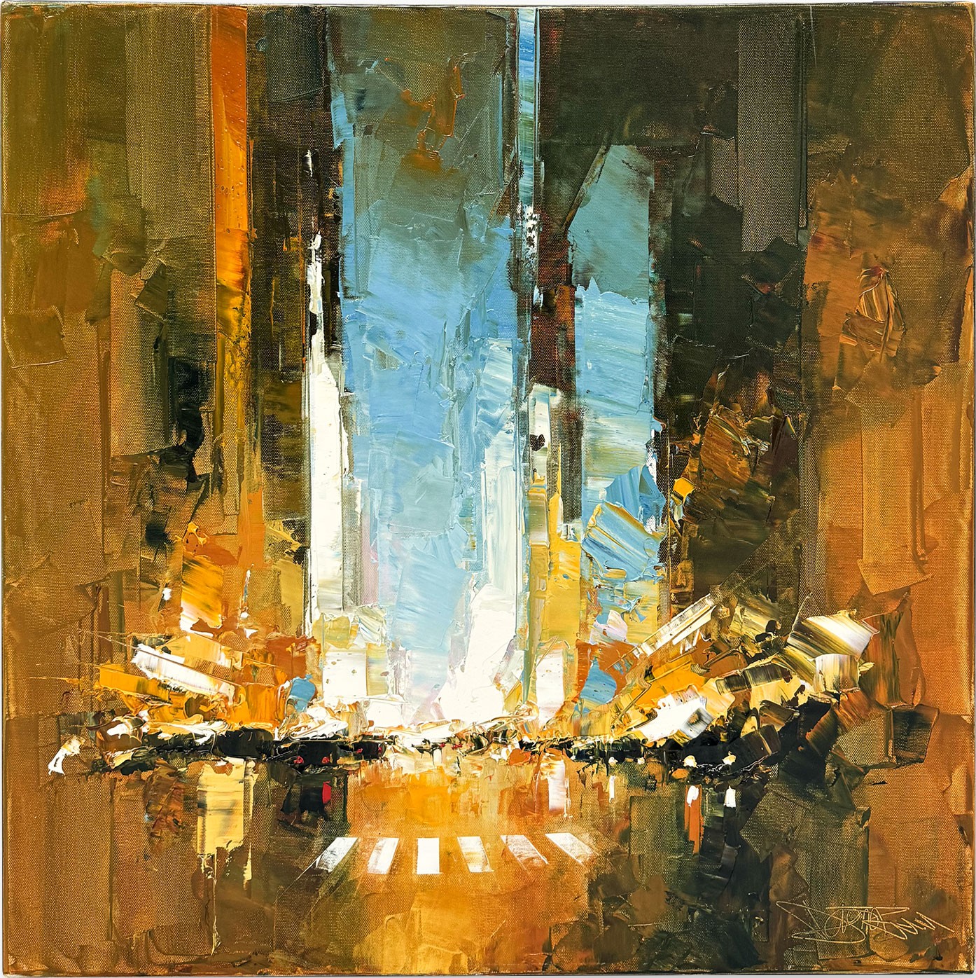 This artwork is a compelling example of urban abstraction, skillfully capturing the vibrant essence of a bustling cityscape at its heart. The artist employs bold, textured brushstrokes that imbue the piece with a dynamic energy, evocative of city life itself. The vertical composition draws the eye upwards, suggesting towering skyscrapers, rendered in a symphony of ochre, gold, and deep brown hues. Central to the painting is a burst of luminescence—possibly depicting city lights or a sunset reflecting off glass facades—which contrasts starkly with the darker, earth-toned peripheries. This interplay of light and shadow underscores the dual nature of urban environments: both dazzling and shadowed. The sky, a striking azure, adds a refreshing contrast to the warmth of the structures below, offering a sense of openness amidst the dense architectural forms. This deliberate juxtaposition enhances the painting’s depth, inviting viewers to explore the textured layers and vibrant interactions of color. In summary, this artwork is a masterful exploration of urban life, resonating with the chaotic yet captivating rhythm of a metropolis. Its use of color and texture is both assertive and nuanced, providing an immersive experience that is as thought-provoking as it is visually stunning.