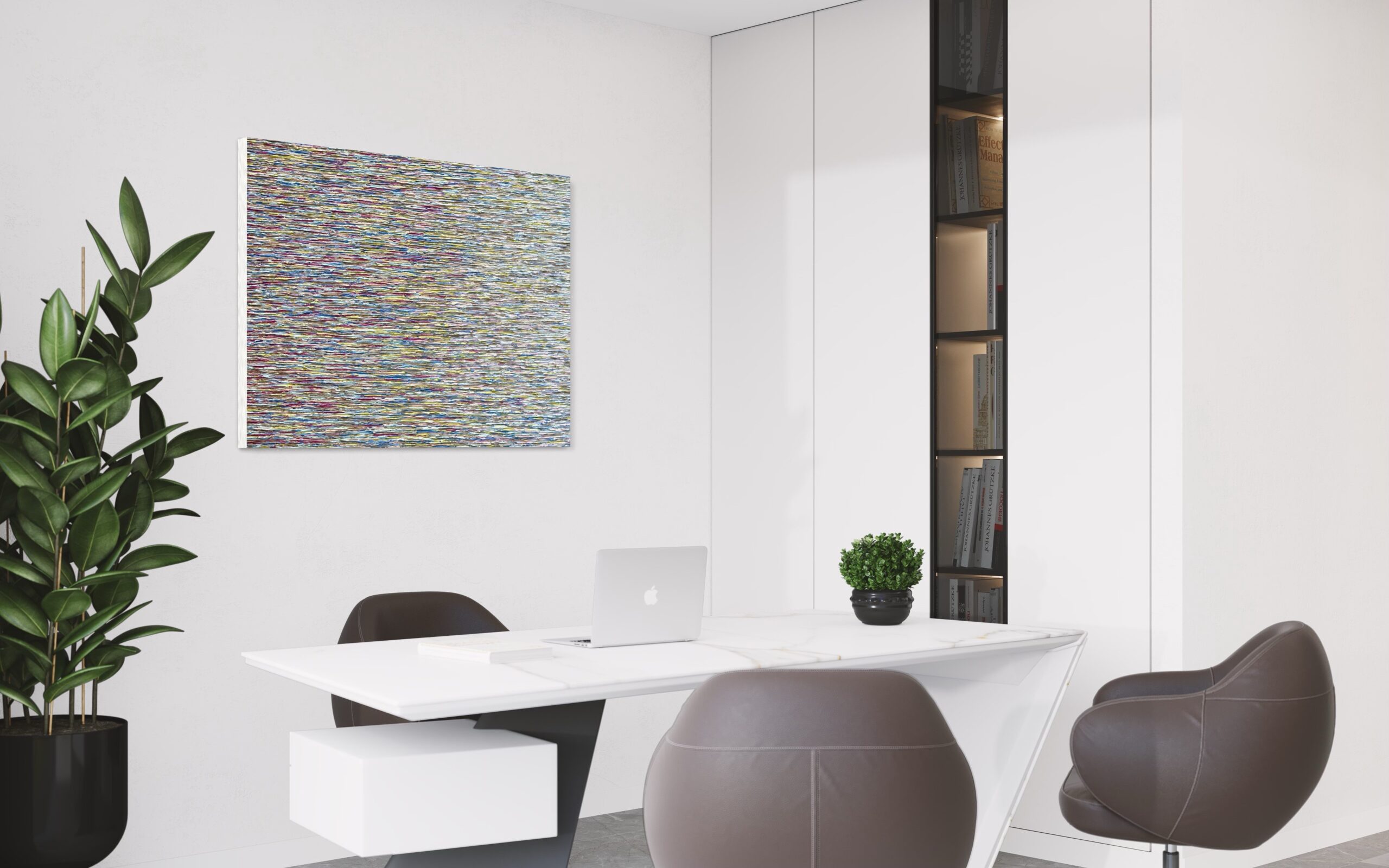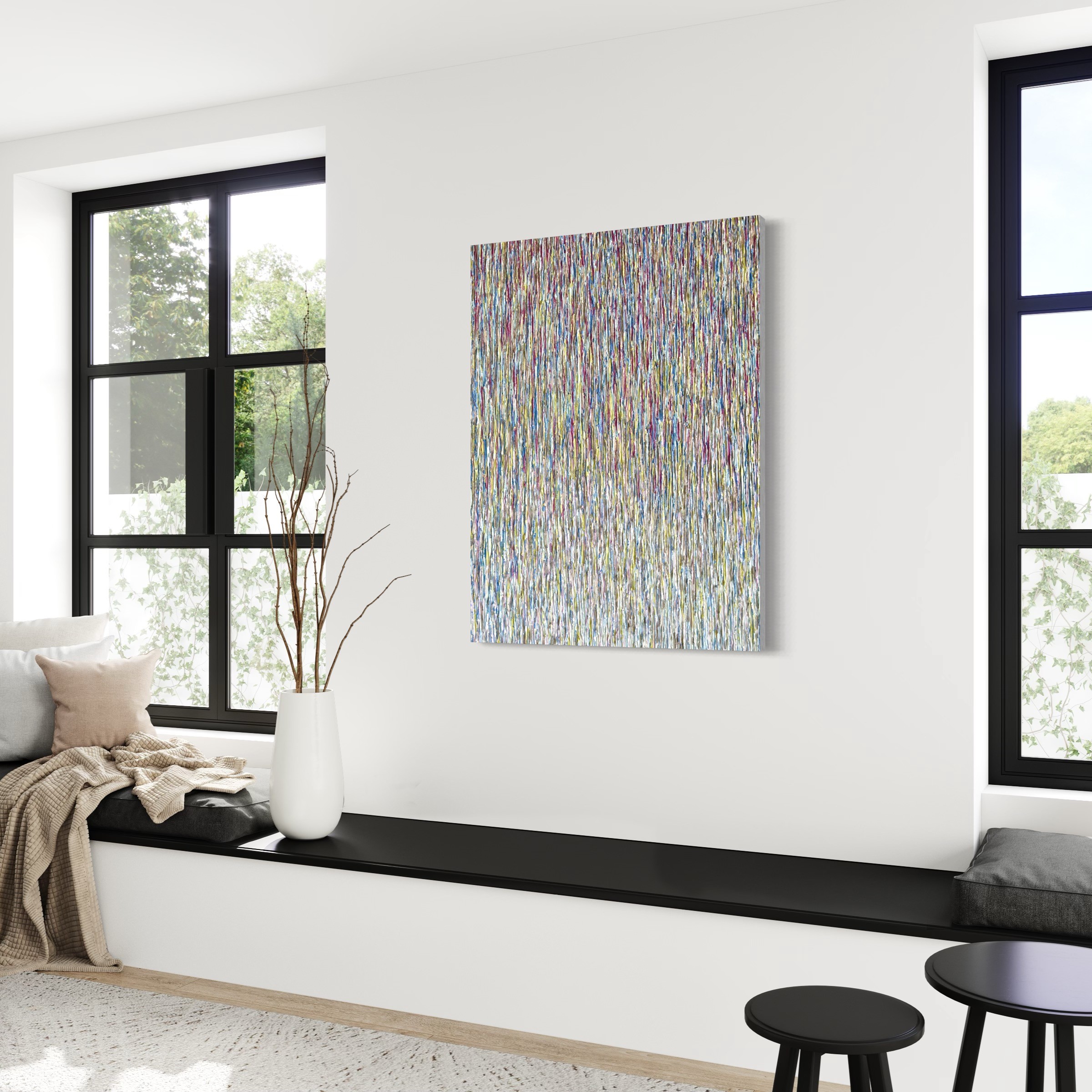 Through its peaceful and natural color combination, as well as the deliberate arrangement of vertical lines, “VISUAL COMFORT” aims to create an atmosphere of relaxation and visual harmony. It celebrates the beauty of nature and contemporary aesthetics, inviting viewers to find comfort and serenity in the simplicity and elegance of the artwork.