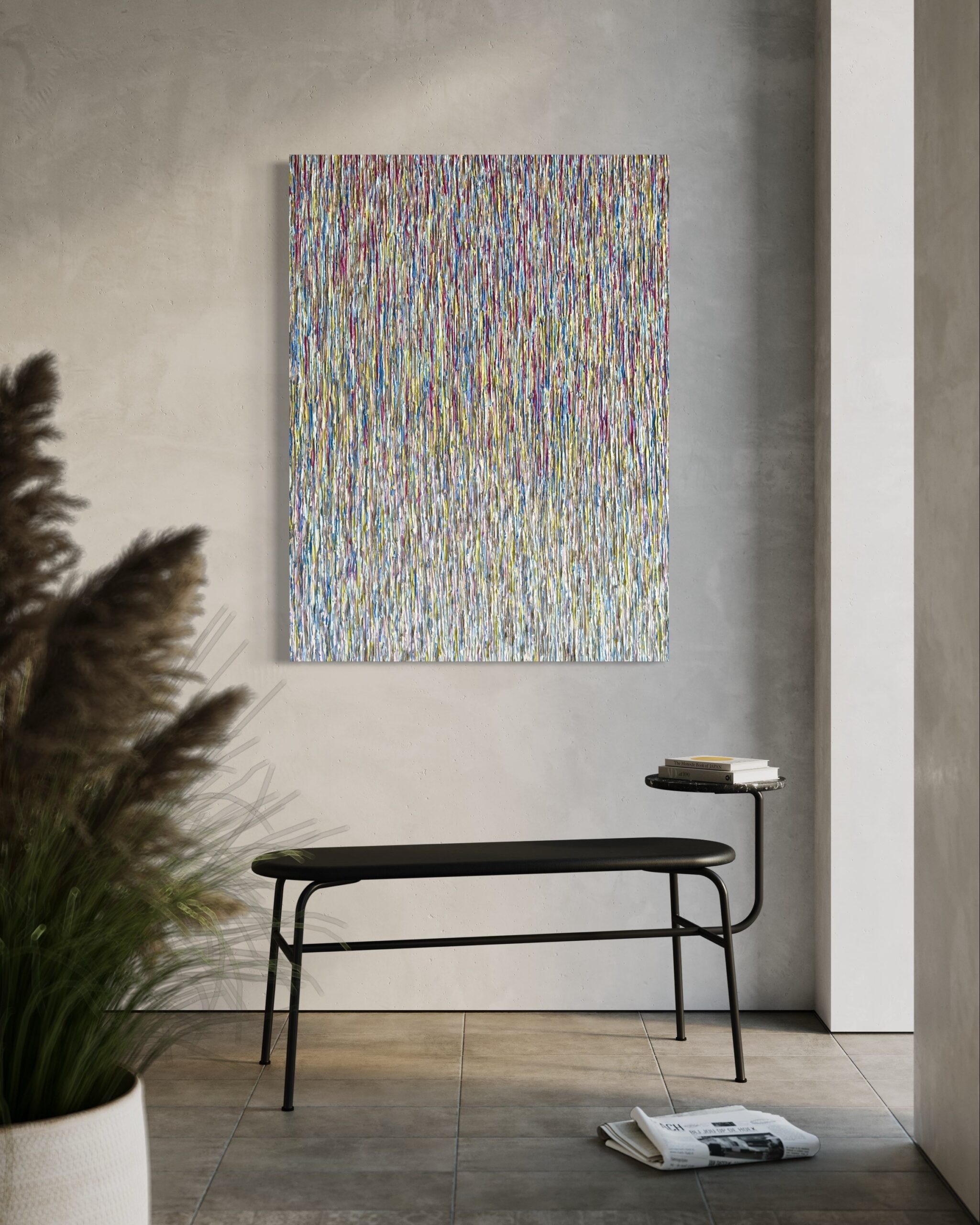 “VISUAL COMFORT” is an abstract painting that seeks to envelop viewers in a serene and harmonious visual experience. Inspired by the soothing elements of nature and contemporary interiors, this artwork combines a color palette comprising indigo, granite, silver dust, plum, and bamboo. The deliberate arrangement of vertical lines, transitioning from darker to lighter shades and culminating in a shimmering silver, further enhances the sense of tranquility and visual comfort.