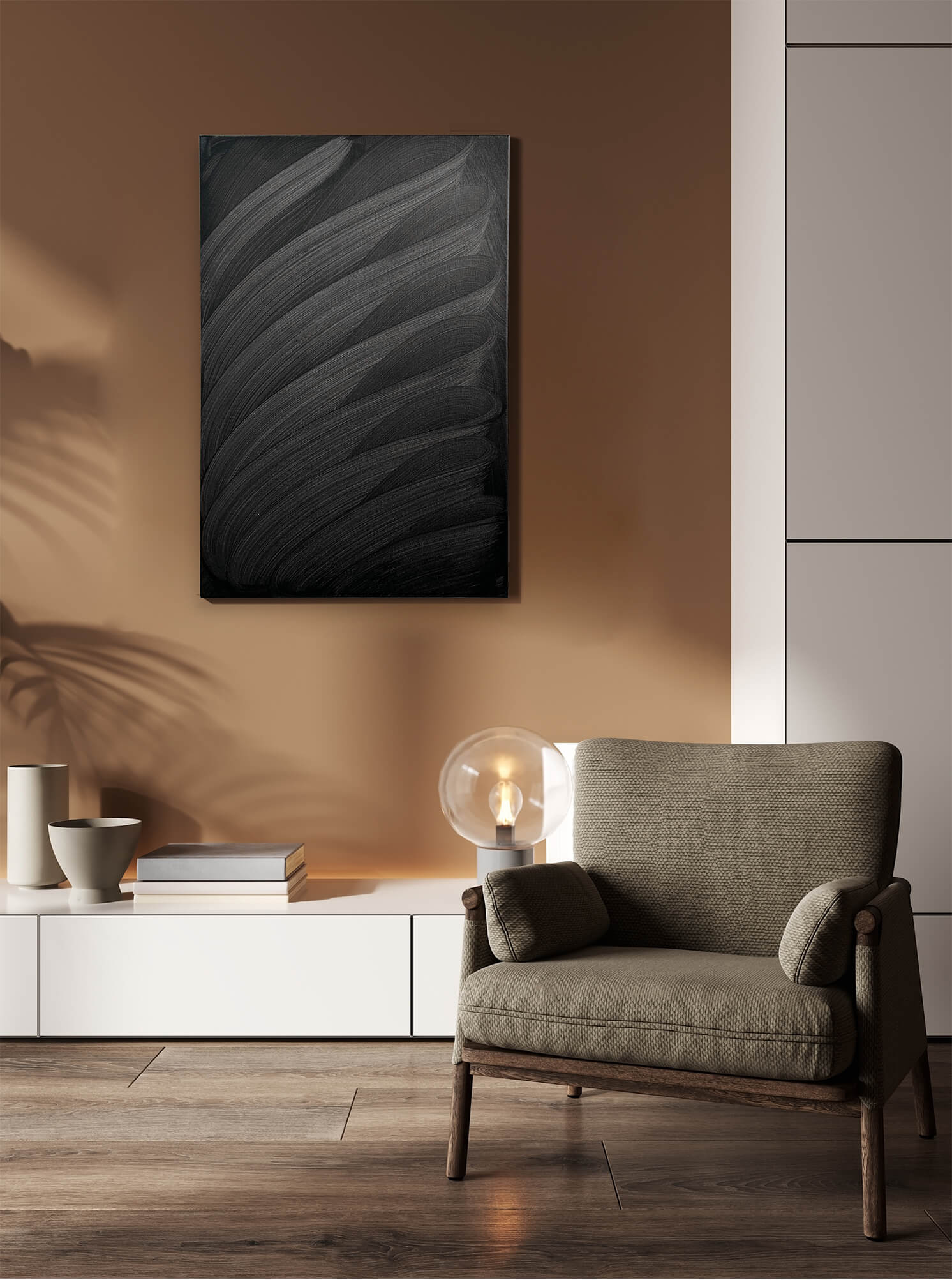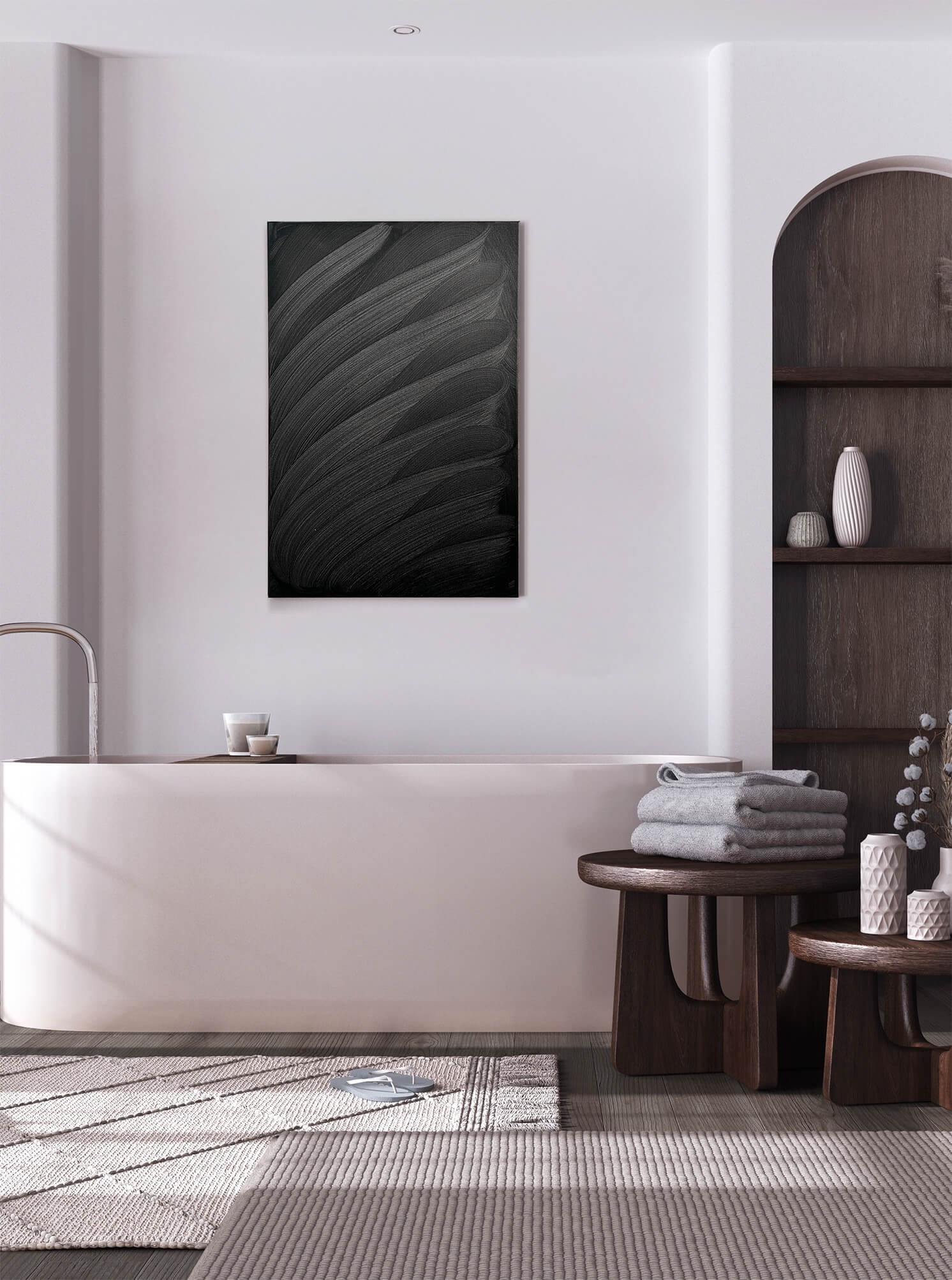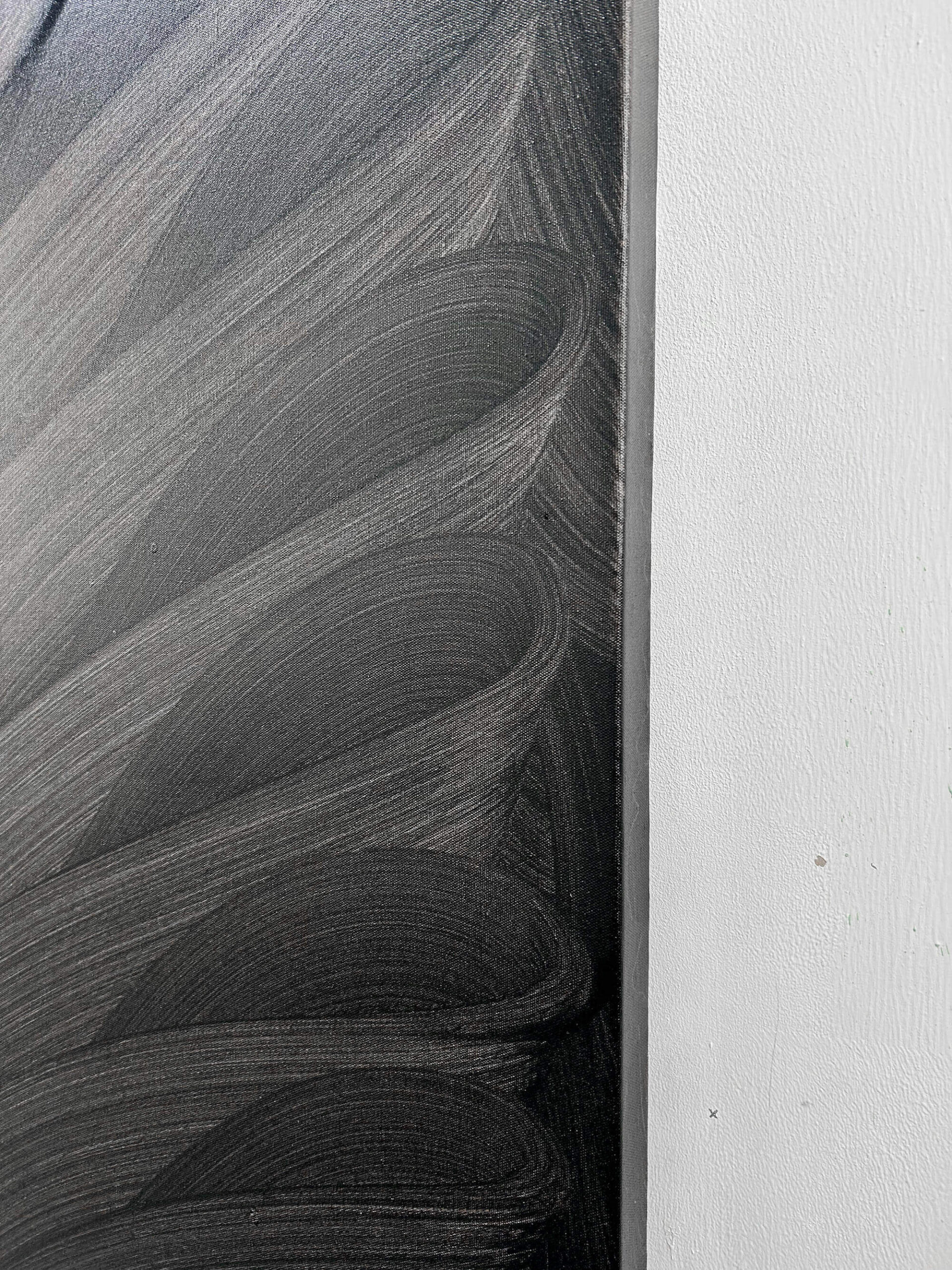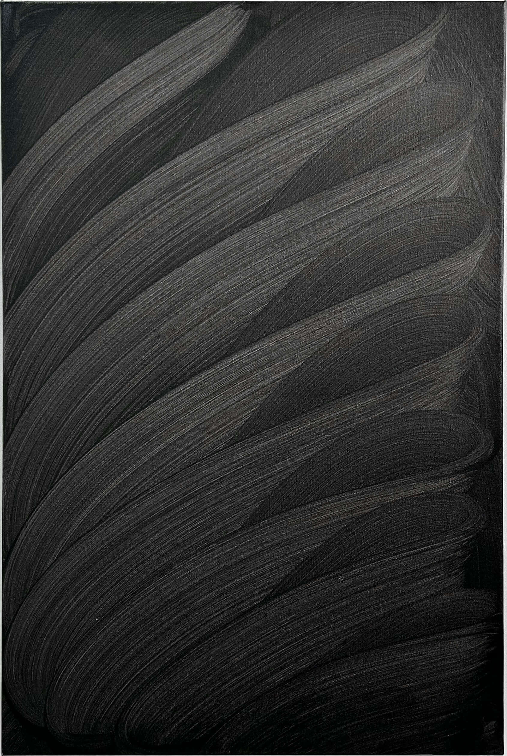 This artwork presents a captivating exploration of texture and movement through monochromatic abstraction. Sweeping, curved brushstrokes cascade diagonally across the canvas, creating a rhythmic wave-like pattern. The interplay of light and shadow is artfully achieved, as varying shades of charcoal gray and deep black coalesce to form a striking visual depth. The artist’s technique exudes precision and confidence, imbuing the piece with dynamic energy. Unique to this work is its ability to evoke both serenity and intensity, drawing the viewer into its undulating waves. The minimalist palette accentuates the intricate texture, inviting contemplation of the subtle contrasts and the powerful presence each stroke commands. This artwork stands as a testament to the evocative potential of simplicity in form and color.