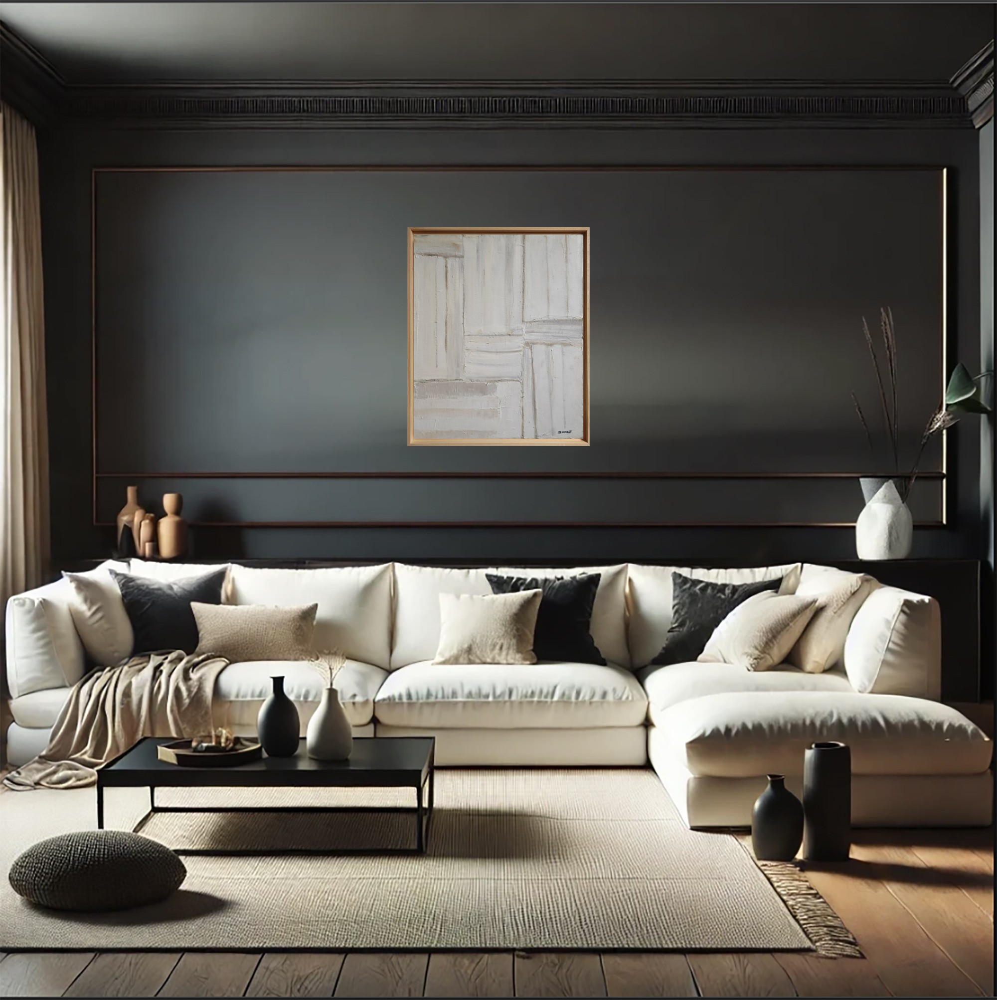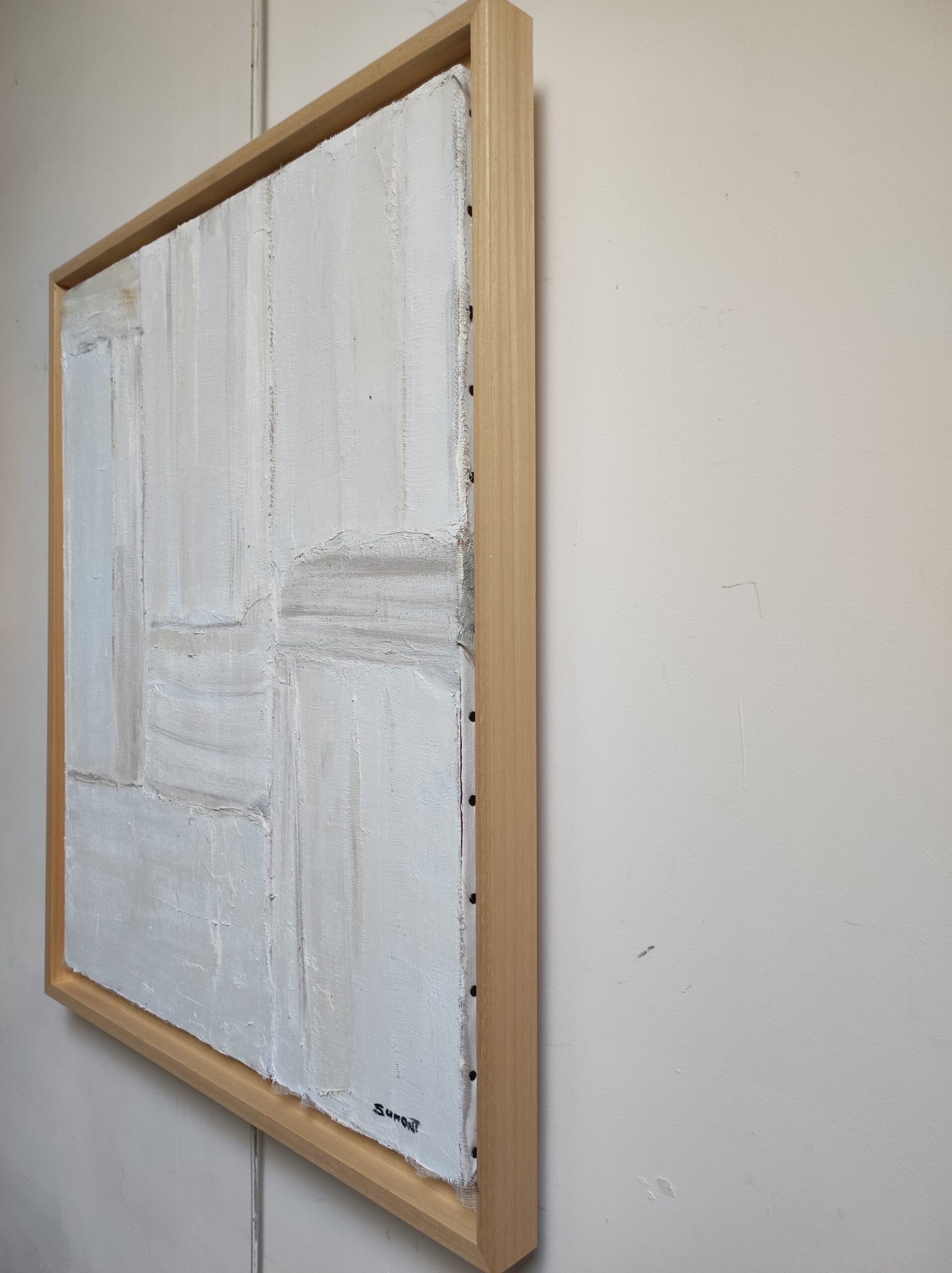 The work is presented in an American box in natural or black wood, your choice. This choice of framing helps to accentuate the overall aesthetic of the work, emphasizing its changing nuances and its relationship with ambient light.