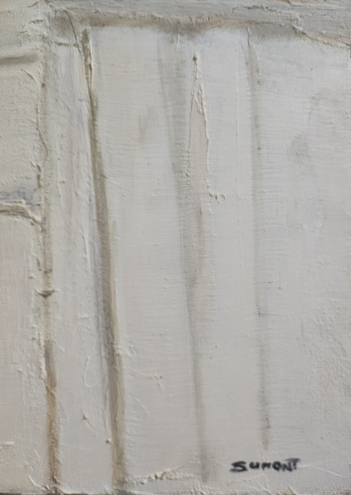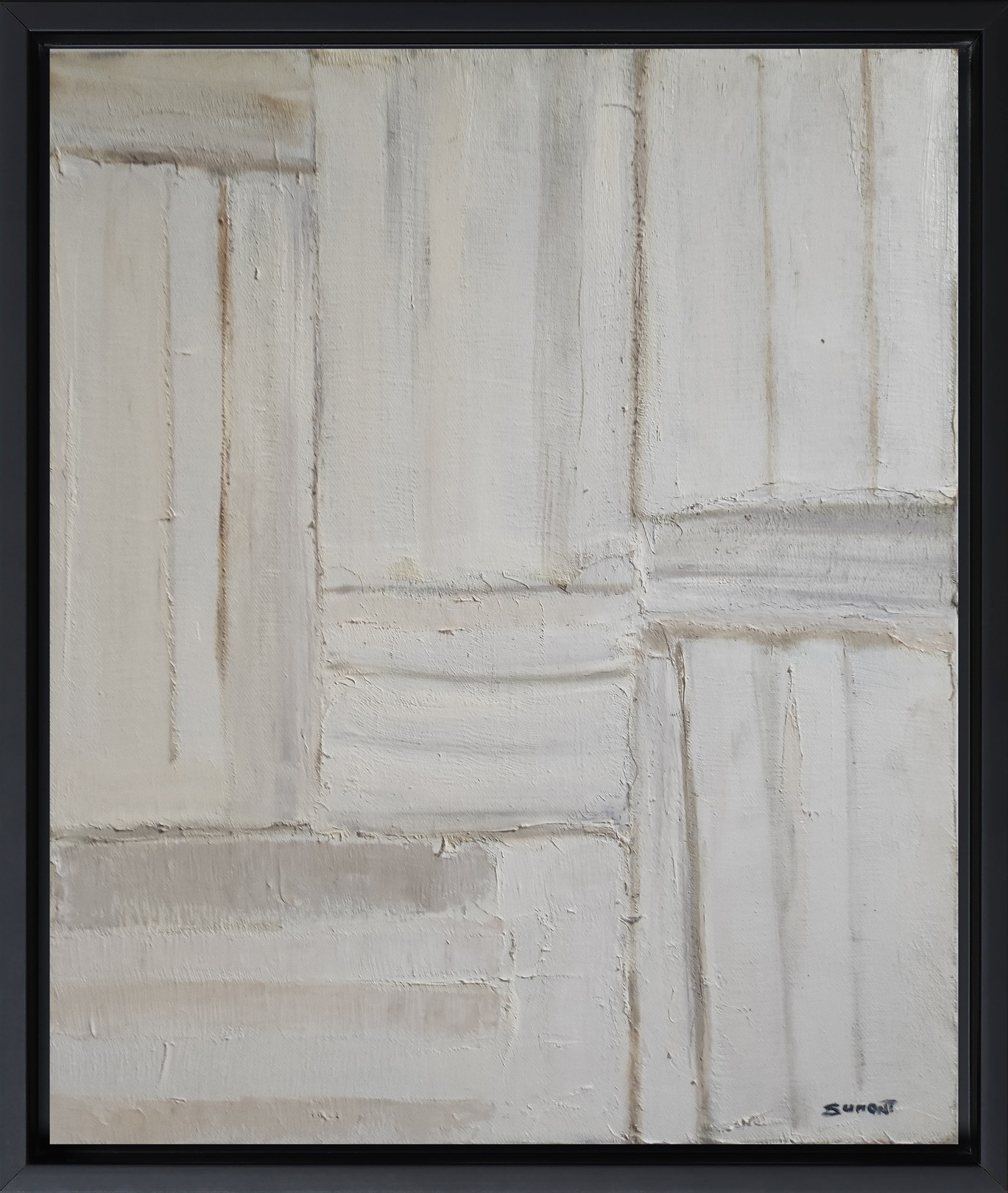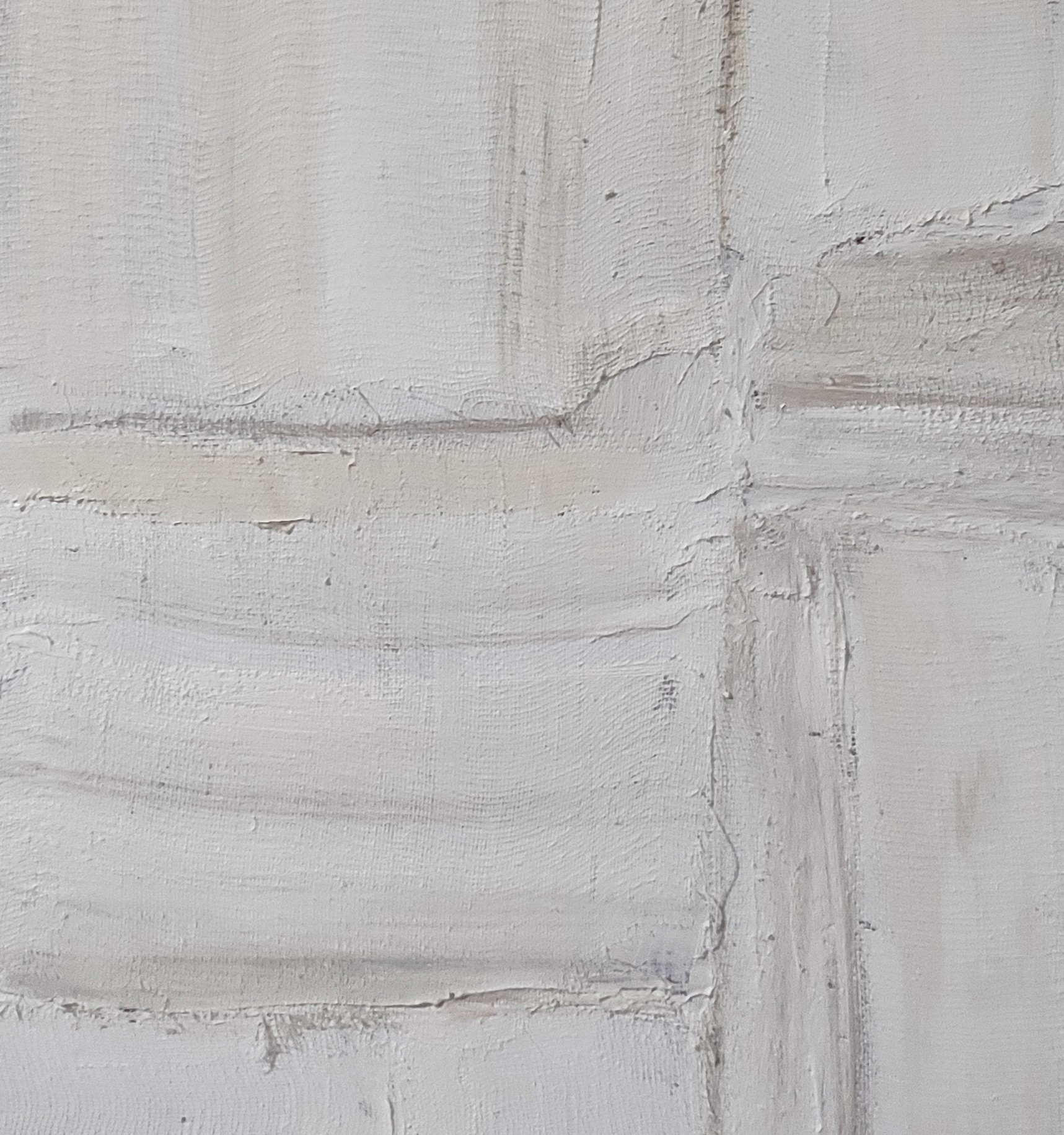 The subtle palette, composed of light tones, acts more as a subtle suggestion than an imposing statement. The shades of gray and ocher, softened by the presence of the fabric, offer a muted base which delicately catches the light. These shades, in perpetual transformation in reaction to the ambient light and the color of the frame, give the work an intriguing visual dynamic.