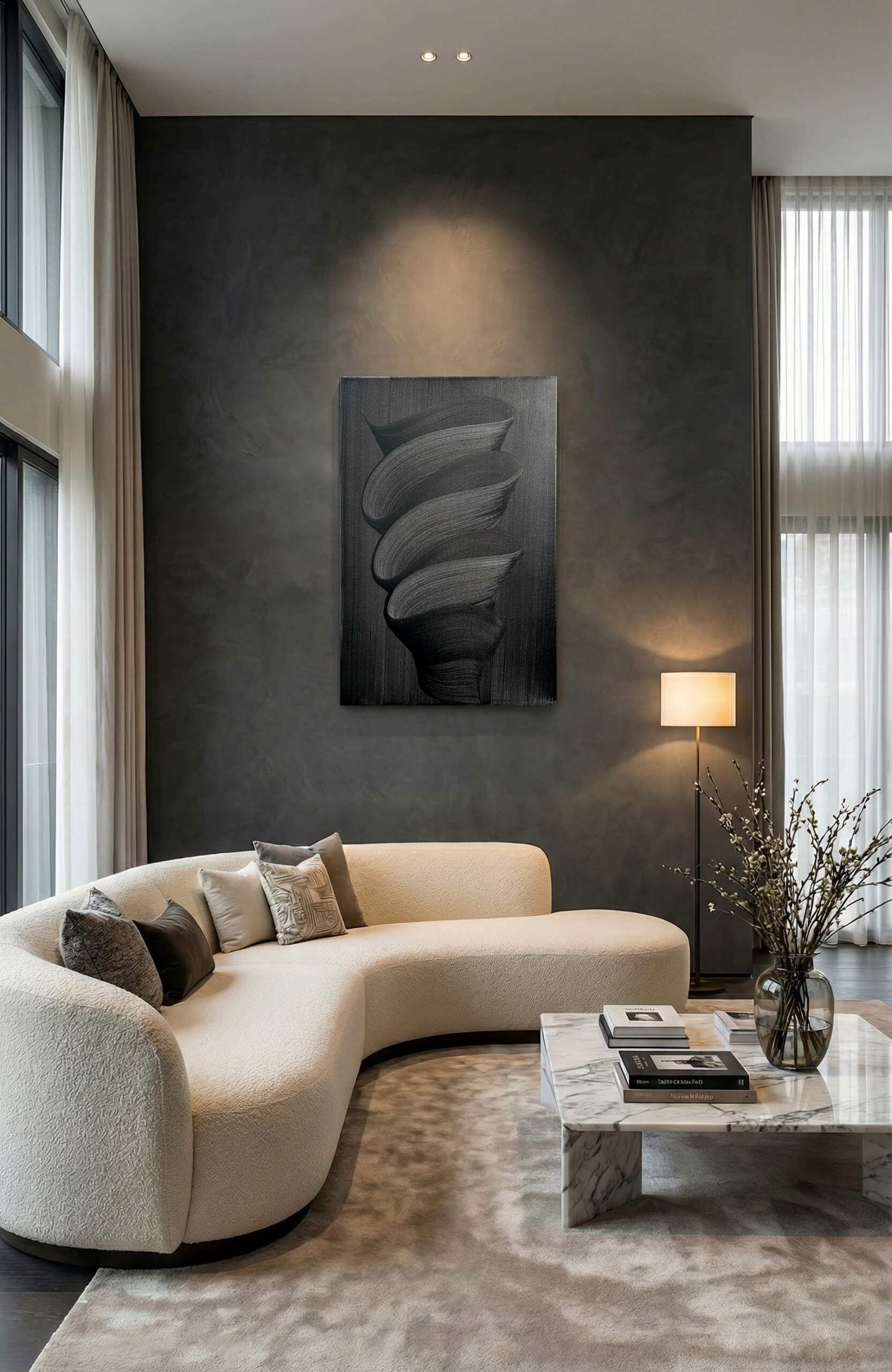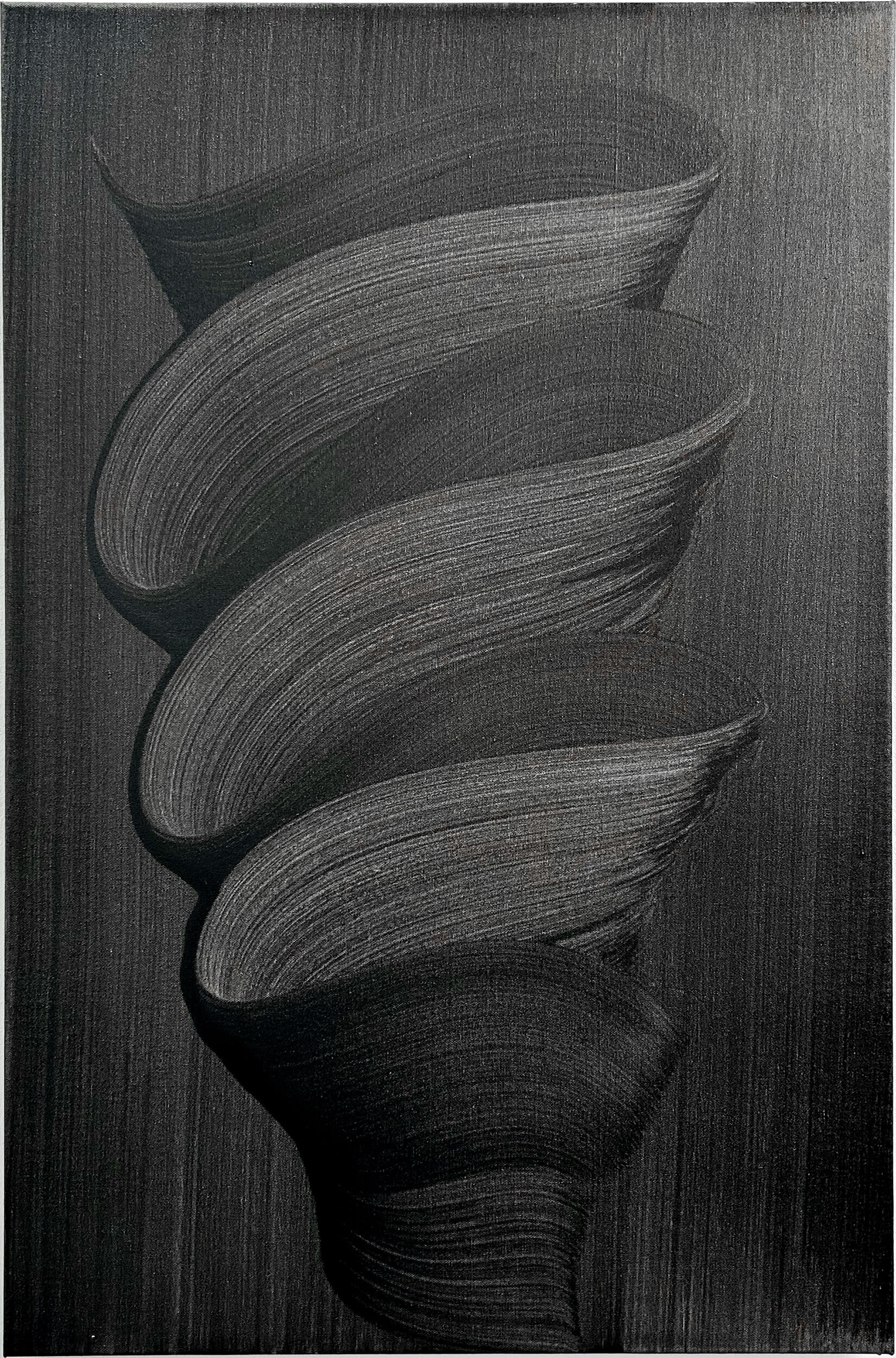 This artwork presents a mesmerizing interplay of texture and shape, featuring bold, sweeping strokes that cascade elegantly across the canvas. Each stroke is meticulously layered, creating a dynamic, flowing motion that conveys both energy and tranquility. The monochromatic palette enhances the depth and nuance of the piece, as light subtly interacts with the textured surface, revealing intricate gradations and shadows. The repetitive, spiraling form suggests organic growth, perhaps reminiscent of natural elements such as leaves or waves, inviting viewers to contemplate its abstract beauty. The artist’s precise execution and attention to detail are evident in the work’s striking three-dimensional effect, offering a sense of movement and vitality. This piece is a testament to the power of minimalism and form, captivating through its simplicity and expressive force.