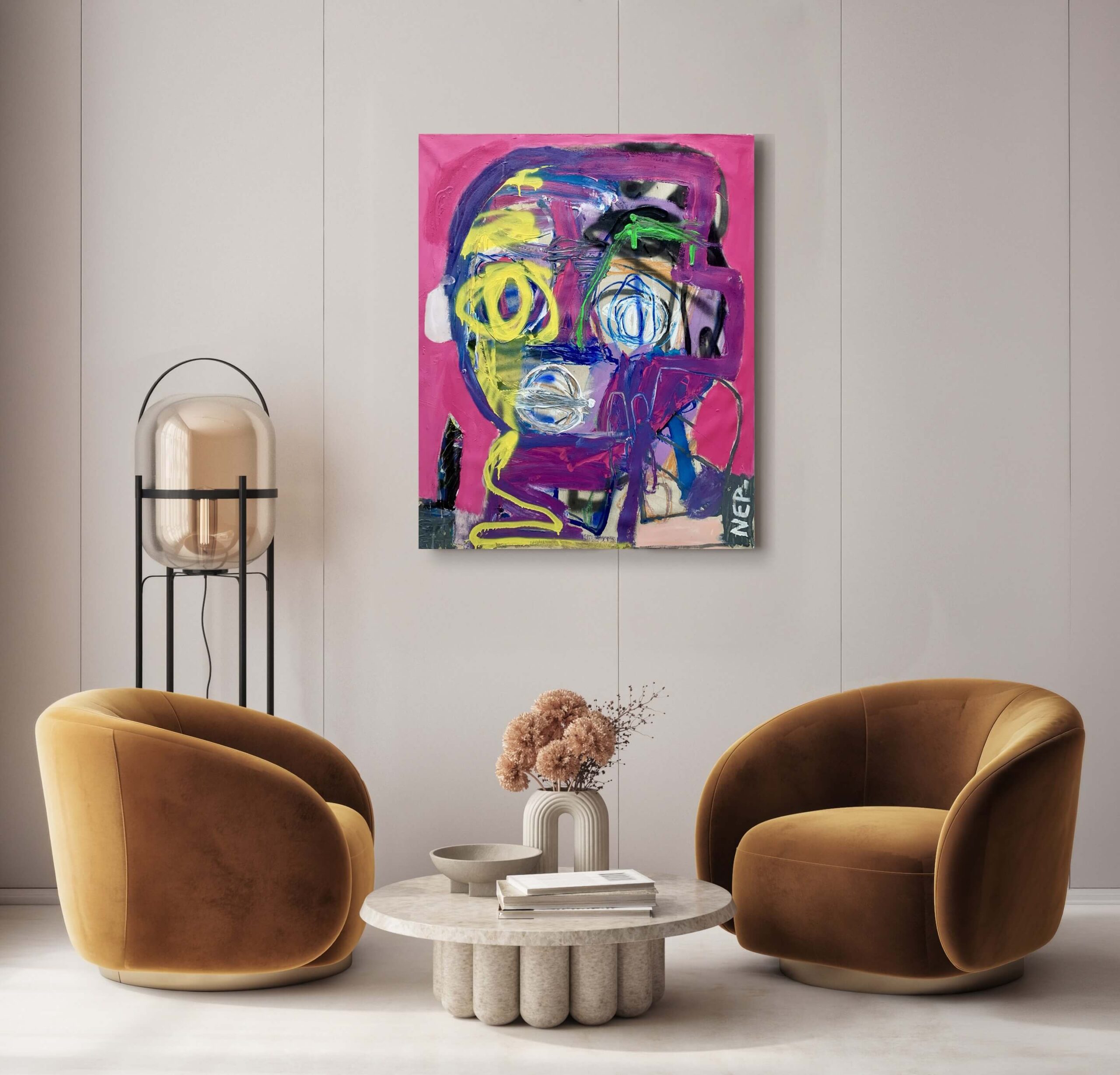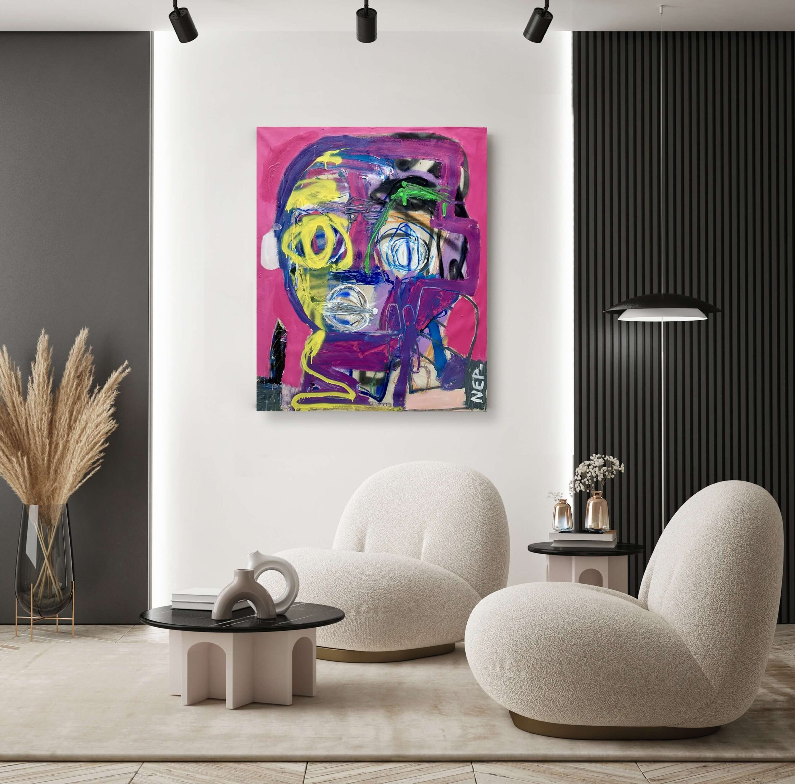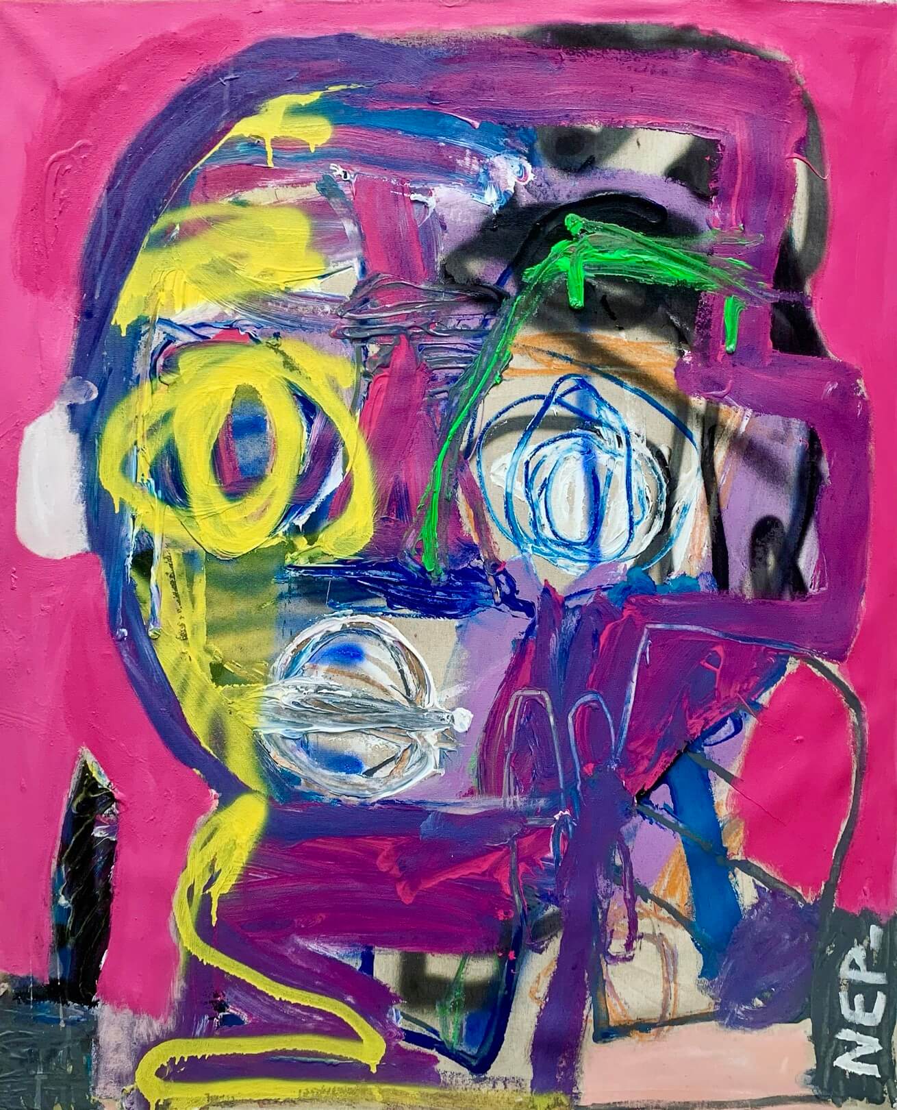 This striking artwork presents a vivid abstract composition, dominated by an eclectic fusion of bold colors and dynamic lines. At its core, a prominent blue face emerges against a rich red background, punctuated by expressive white, pink, and orange strokes that create a sense of depth and complexity. The artist employs a grid pattern within the visage, adding an intriguing structural element that contrasts with the fluidity of nearby brushwork. The interplay of geometric shapes and freeform scribbles evokes a sense of chaos and emotion, while the strategic use of black outlines provides definition and focus. A splash of yellow at the bottom injects a vibrant contrast, drawing the viewer’s eye across the piece. The artist’s signature in the corner affirms the personal touch and originality of the creation. This artwork is a masterful blend of color, form, and emotion, reflecting a contemporary exploration of identity and expression.