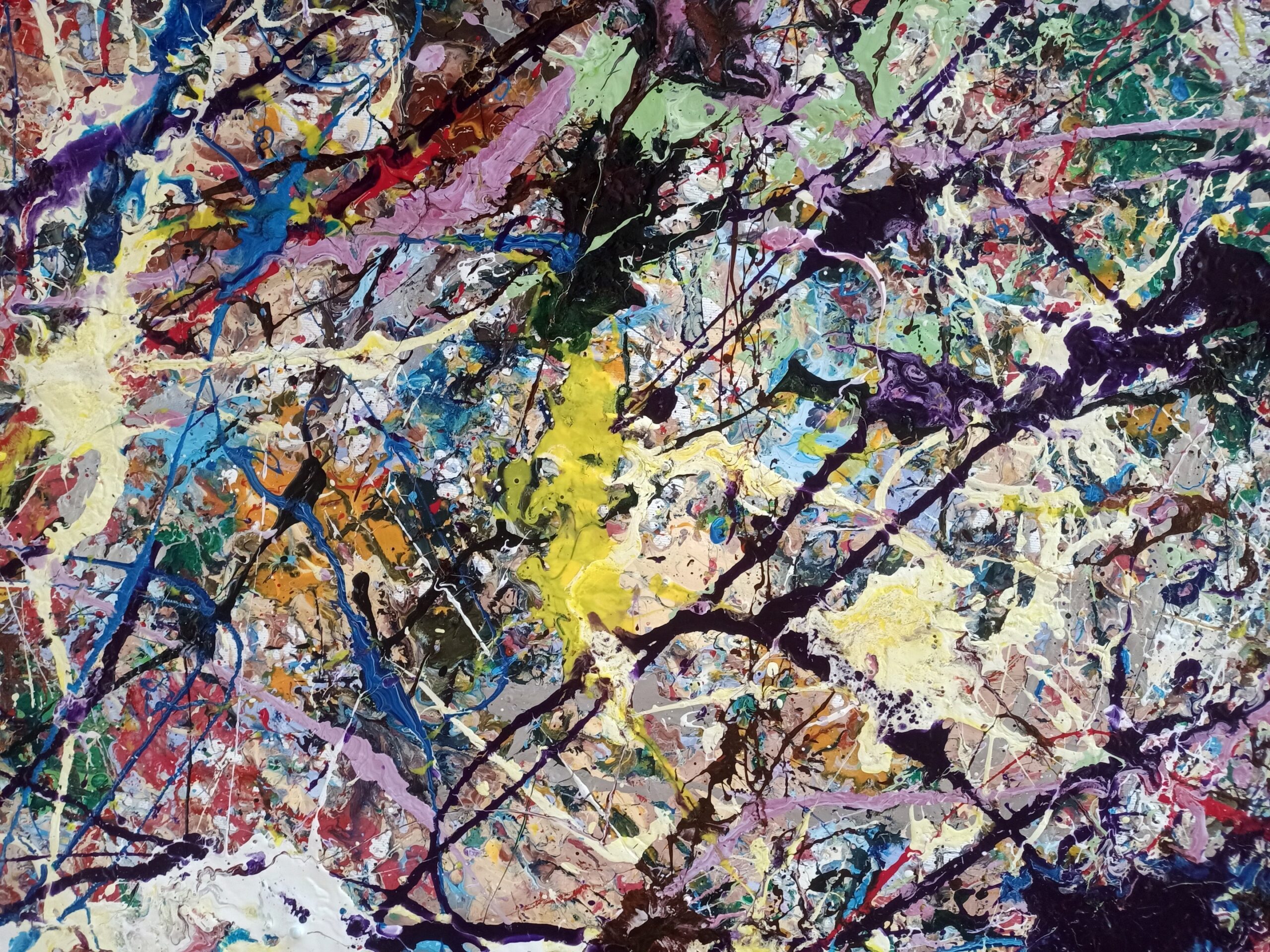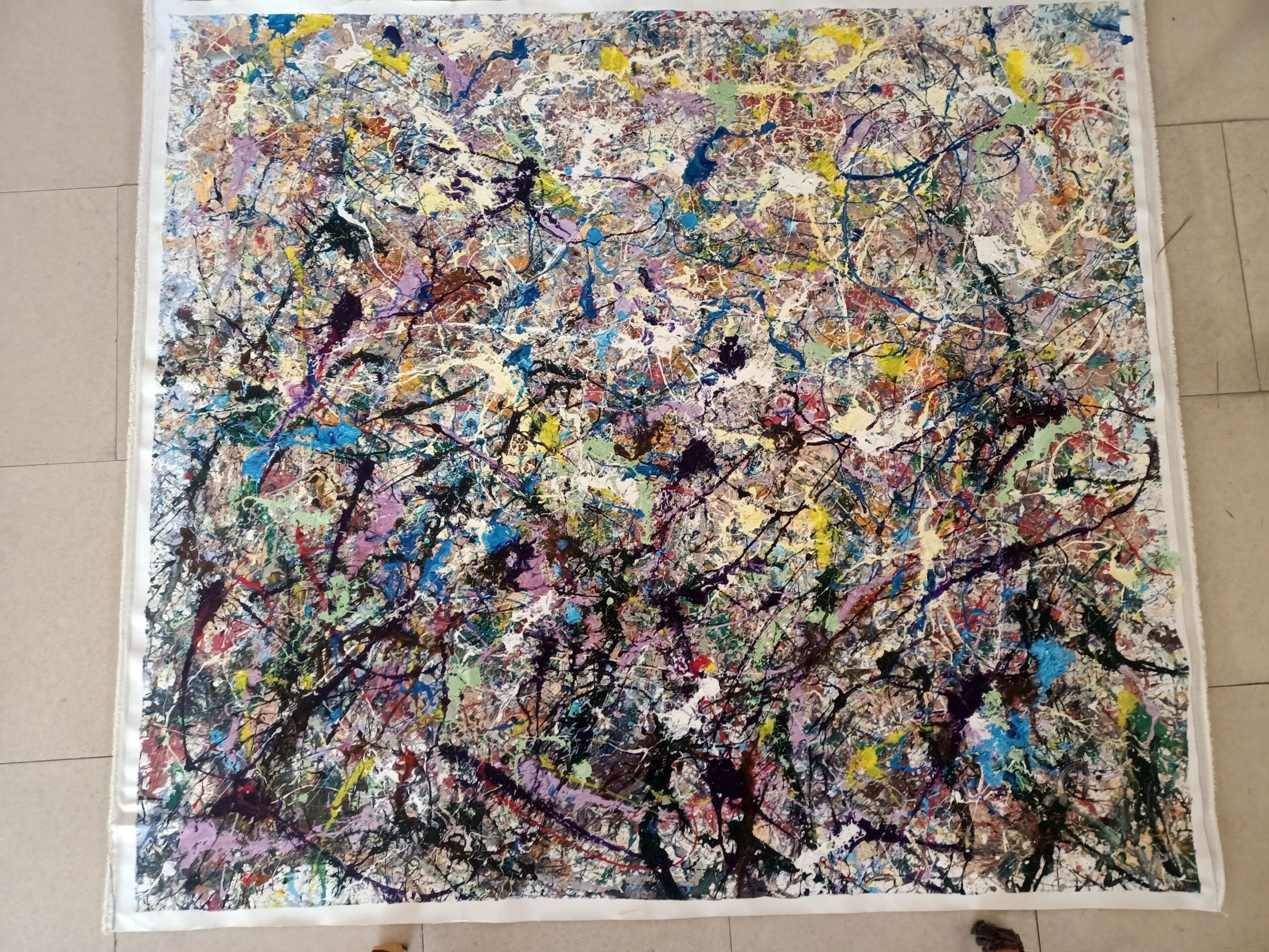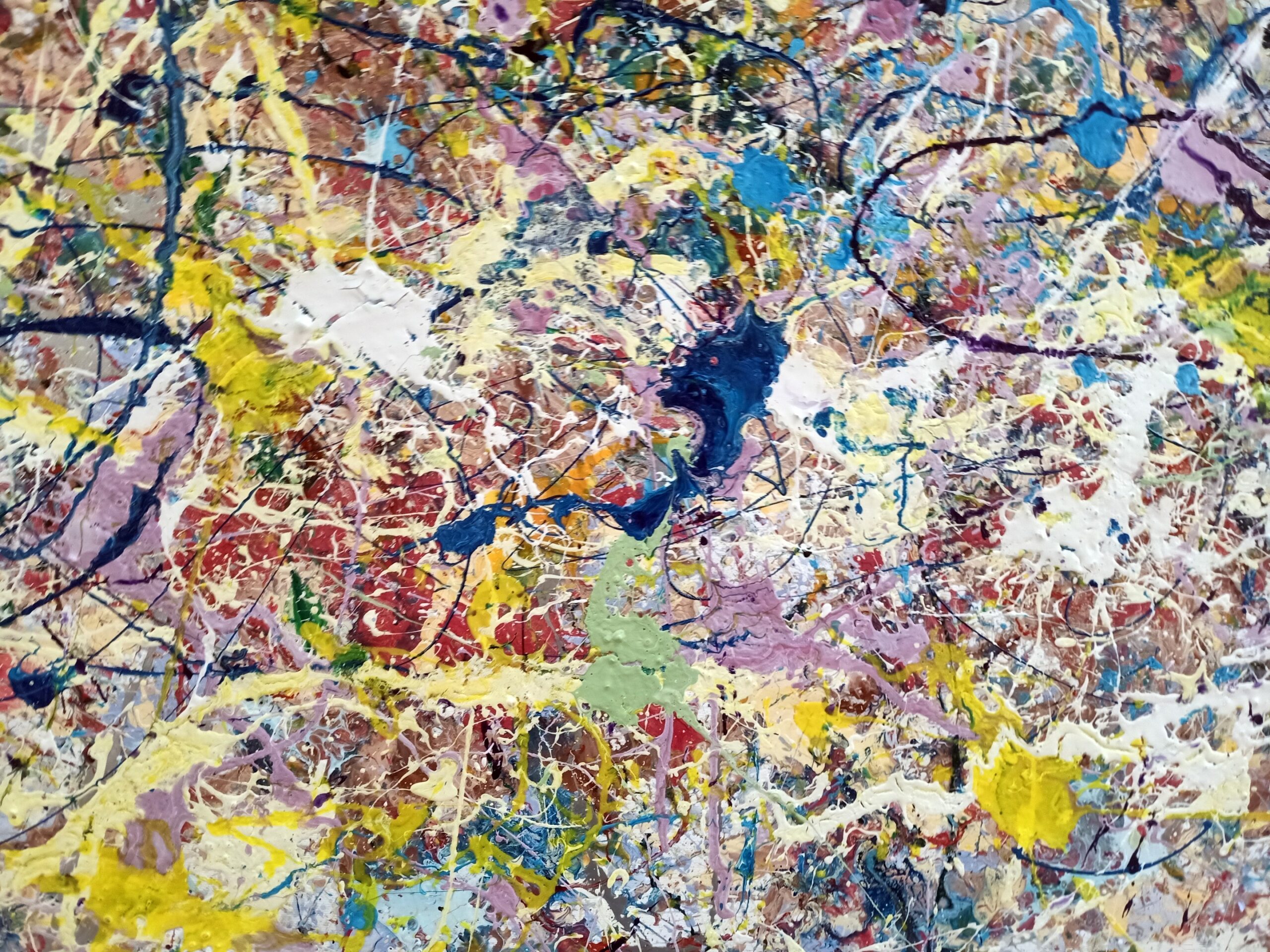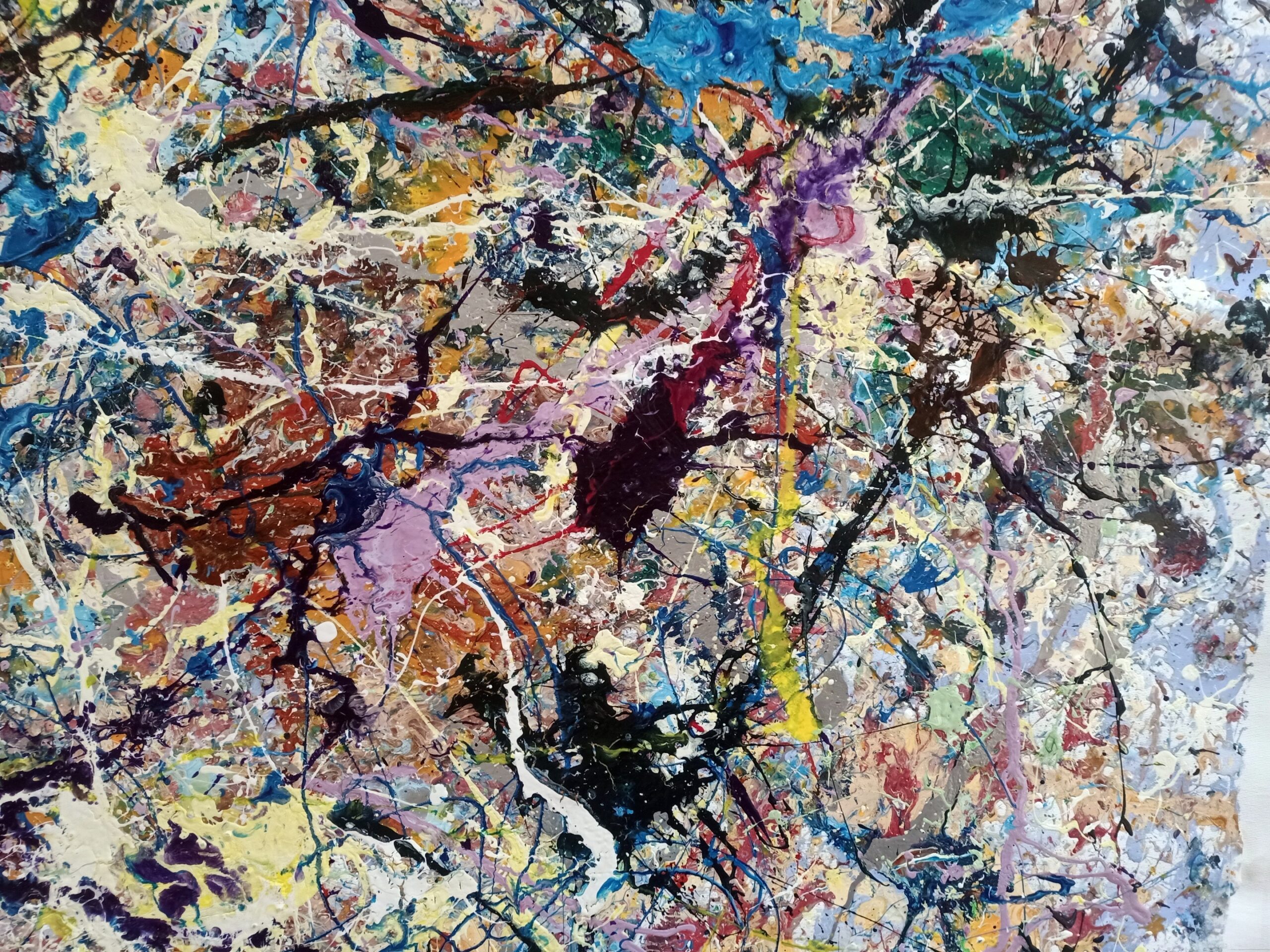 Antonino Puliafico’s *”Echoes of Distant Stars”* invites the viewer to immerse themselves in a cosmic dance of color, light, and texture. This large-scale abstract work, crafted with enamels on canvas, captures the essence of distant celestial phenomena. The dynamic composition features intricate layers of splattered and dripped paint, forming an intricate web of movement and depth.
