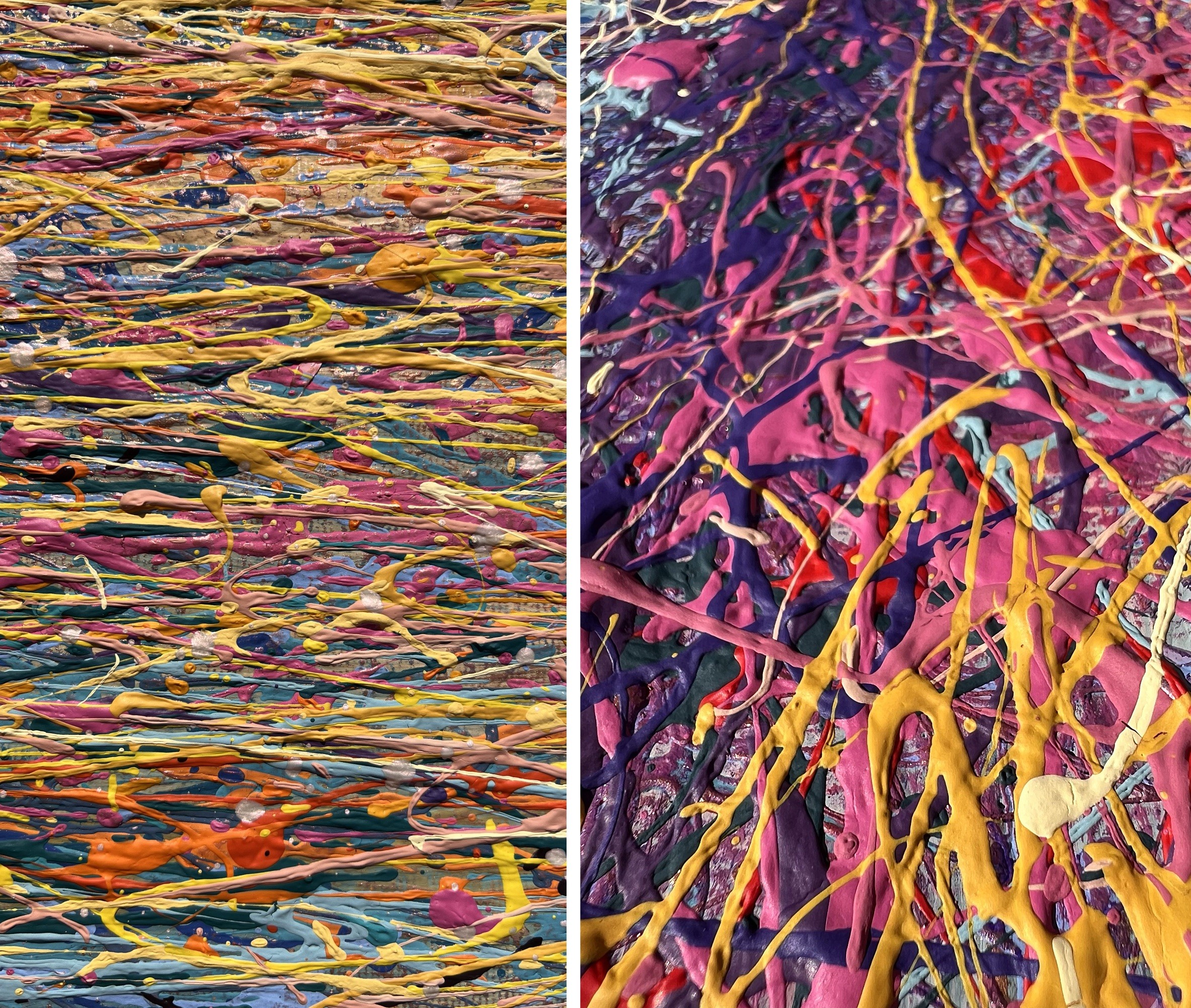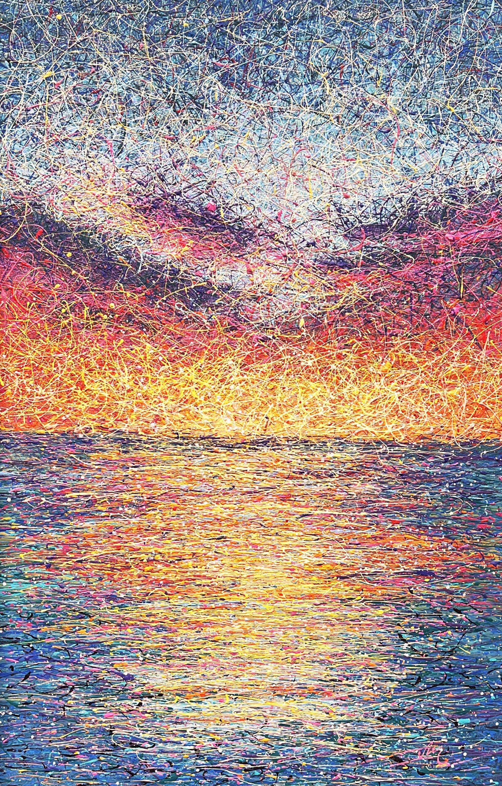 Painting style – the paint is applied in threads. The threads of paint seem to intertwine, creating their own canvas. Painting is made using multi-layer paint technique. A million multi-colored splashes dry before each subsequent coat of a colored the threads of paint is applied. In general, the painting has more then 50 layers of the application of colorful splashes.