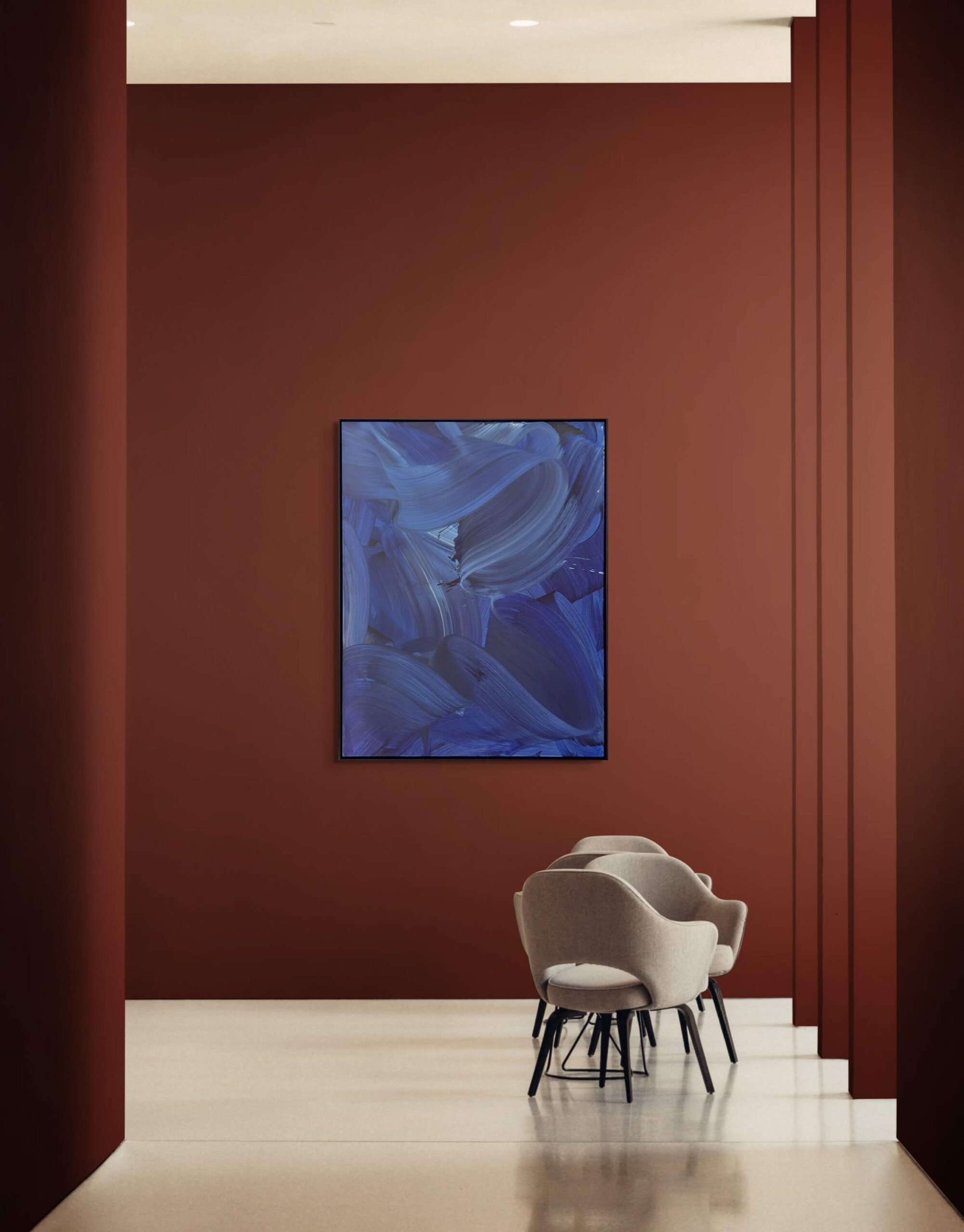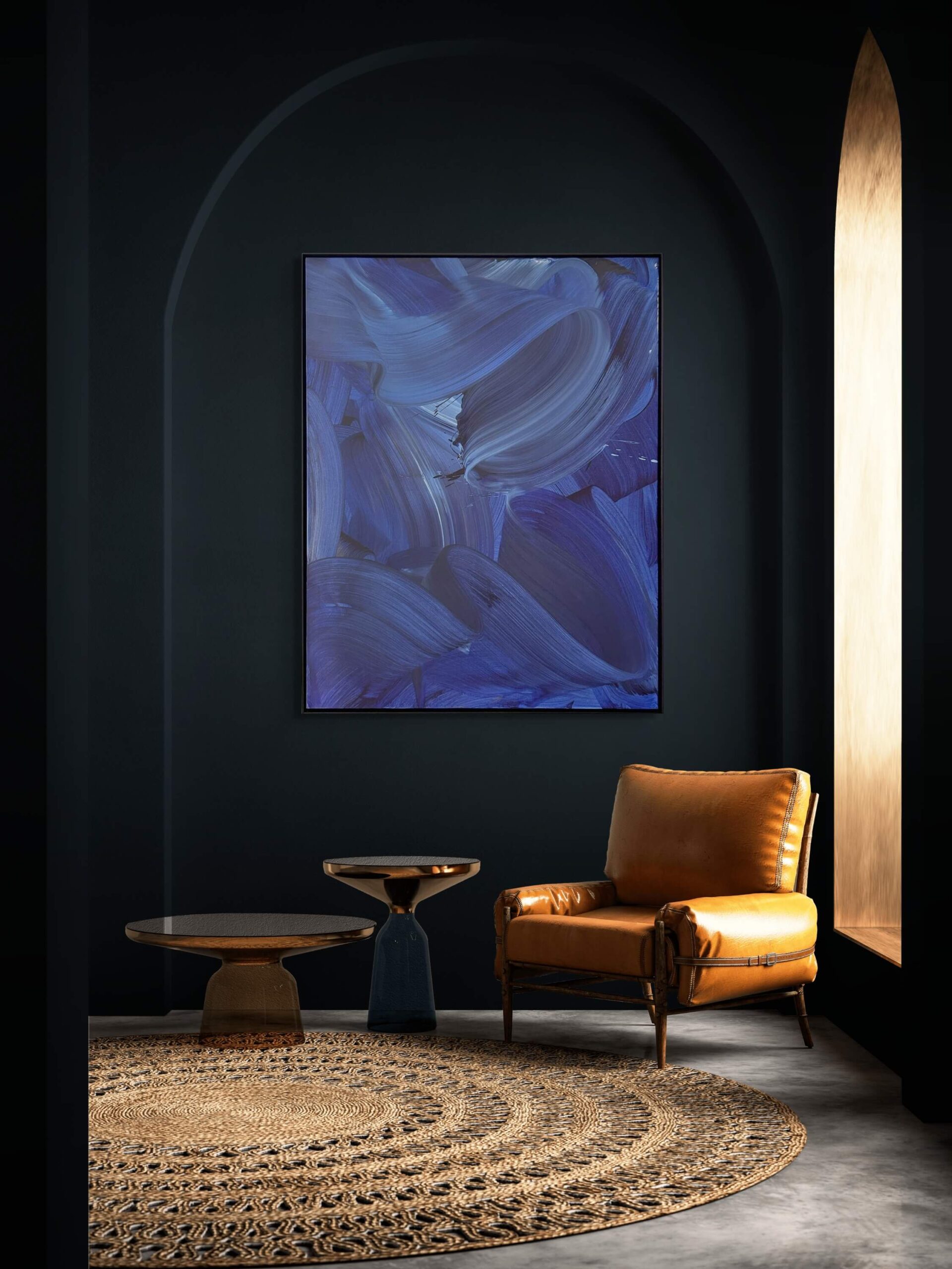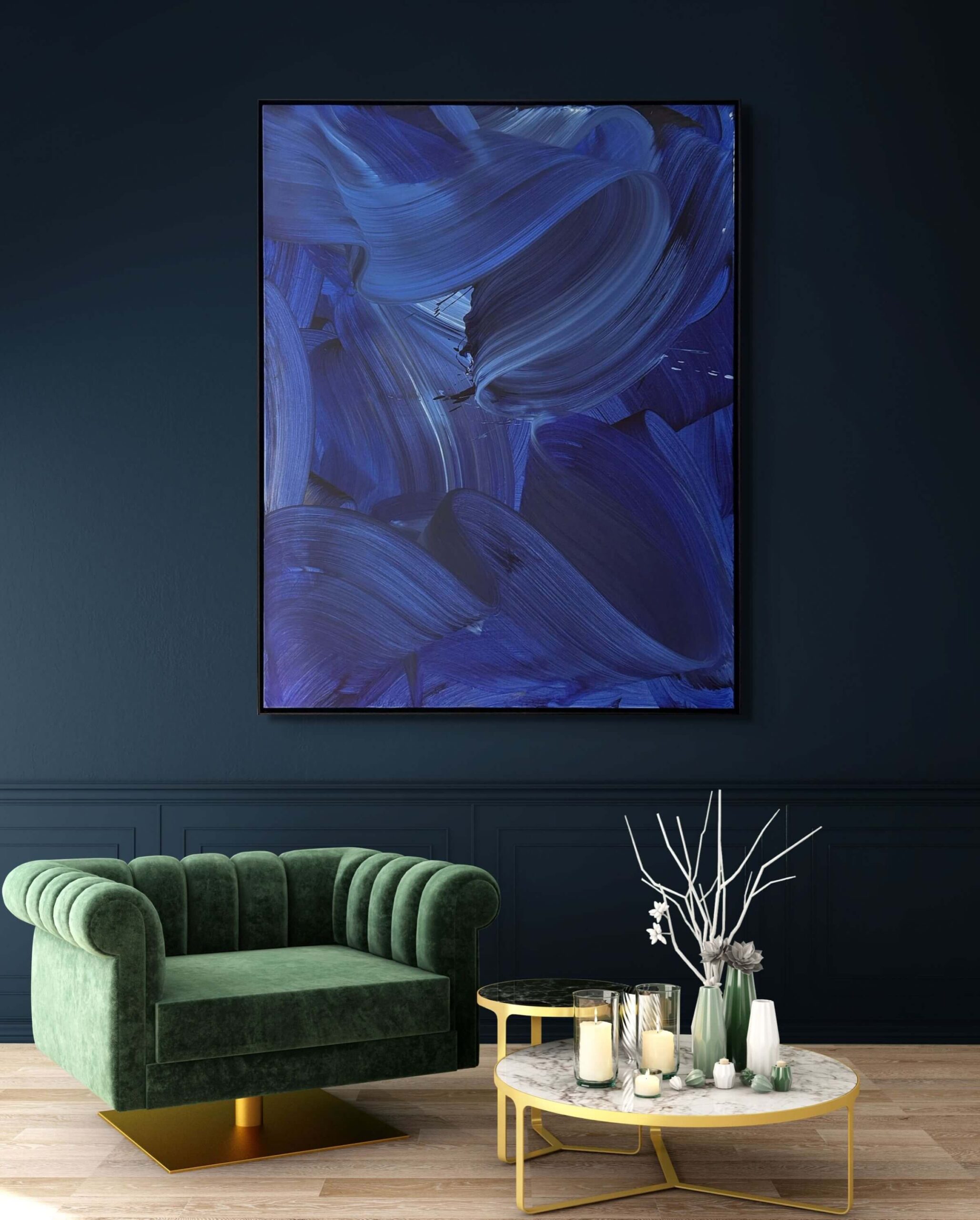 This mesmerizing artwork is a bold exploration of texture and color, featuring dynamic swirls and strokes of deep blue. The artist employs thick, sweeping brushstrokes to create a sense of movement and depth, as if capturing the essence of an untamed ocean or turbulent sky. The interplay of light and shadow within the blue tones adds a rich, dimensional quality, evoking emotions of both tranquility and intensity. Each stroke is deliberate, conveying energy and spontaneity, while the monochromatic palette demonstrates mastery in evoking emotion without the distraction of multiple colors. This piece stands out for its ability to balance chaos with order, inviting viewers to lose themselves in its abstract yet powerful narrative. The work is both a visual and emotional experience, compelling in its simplicity and profound in its execution.