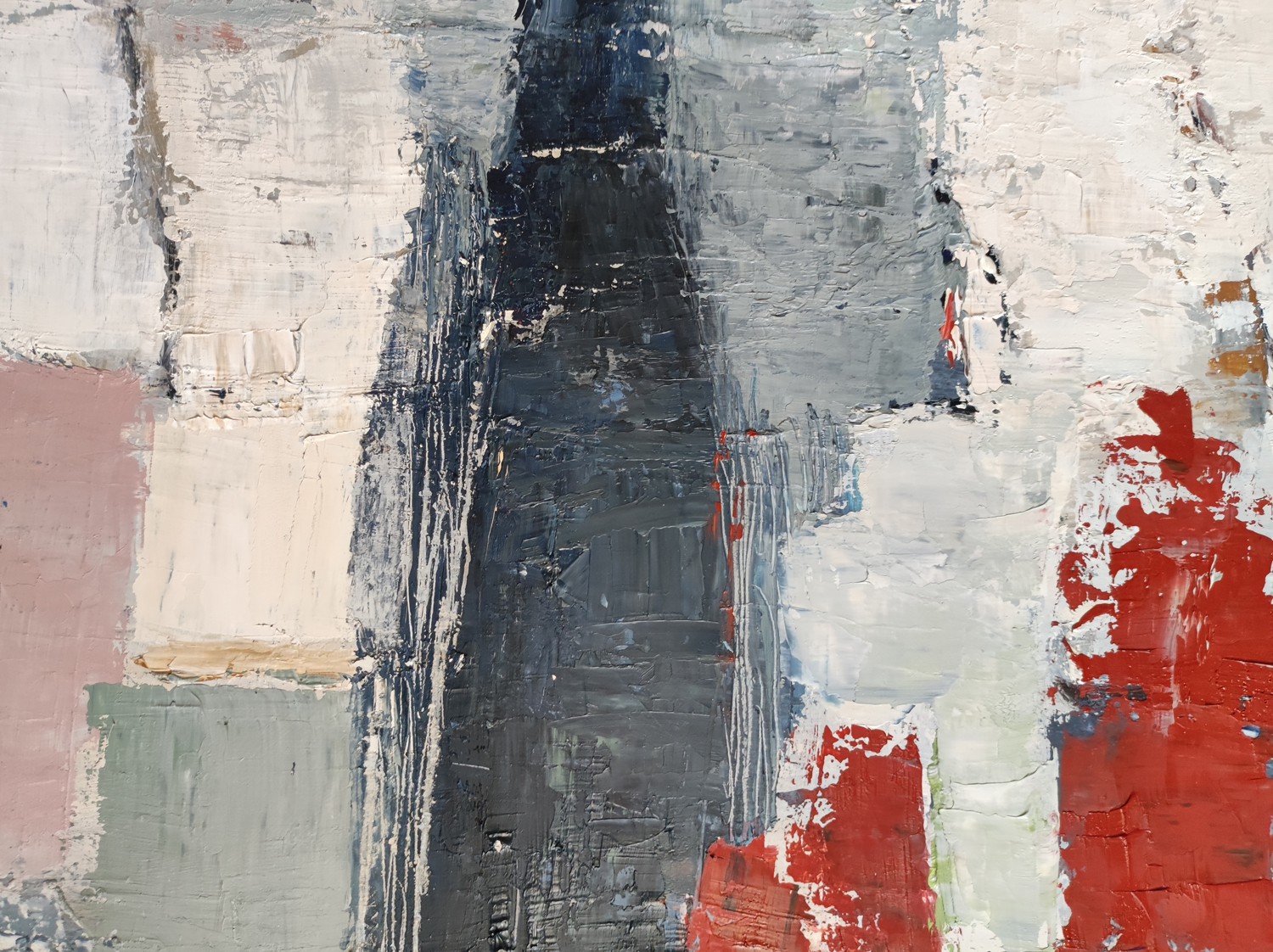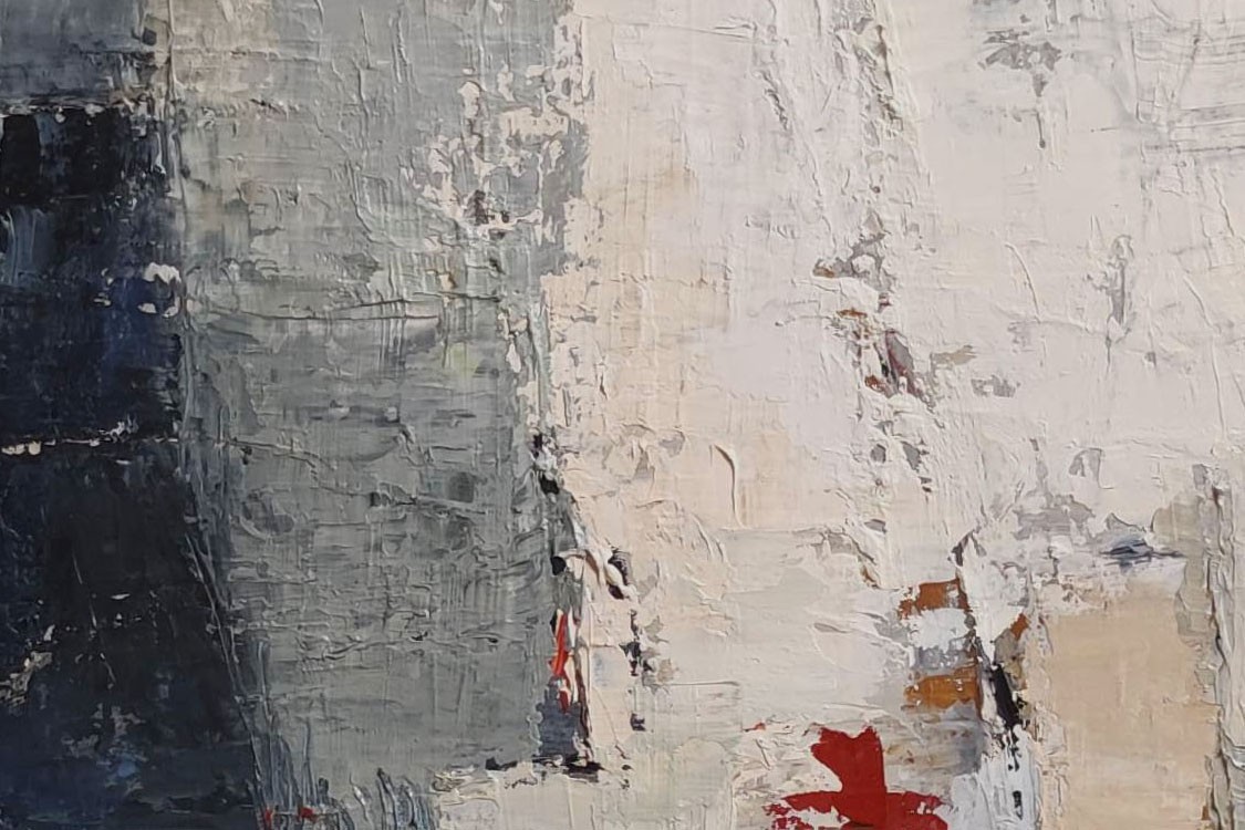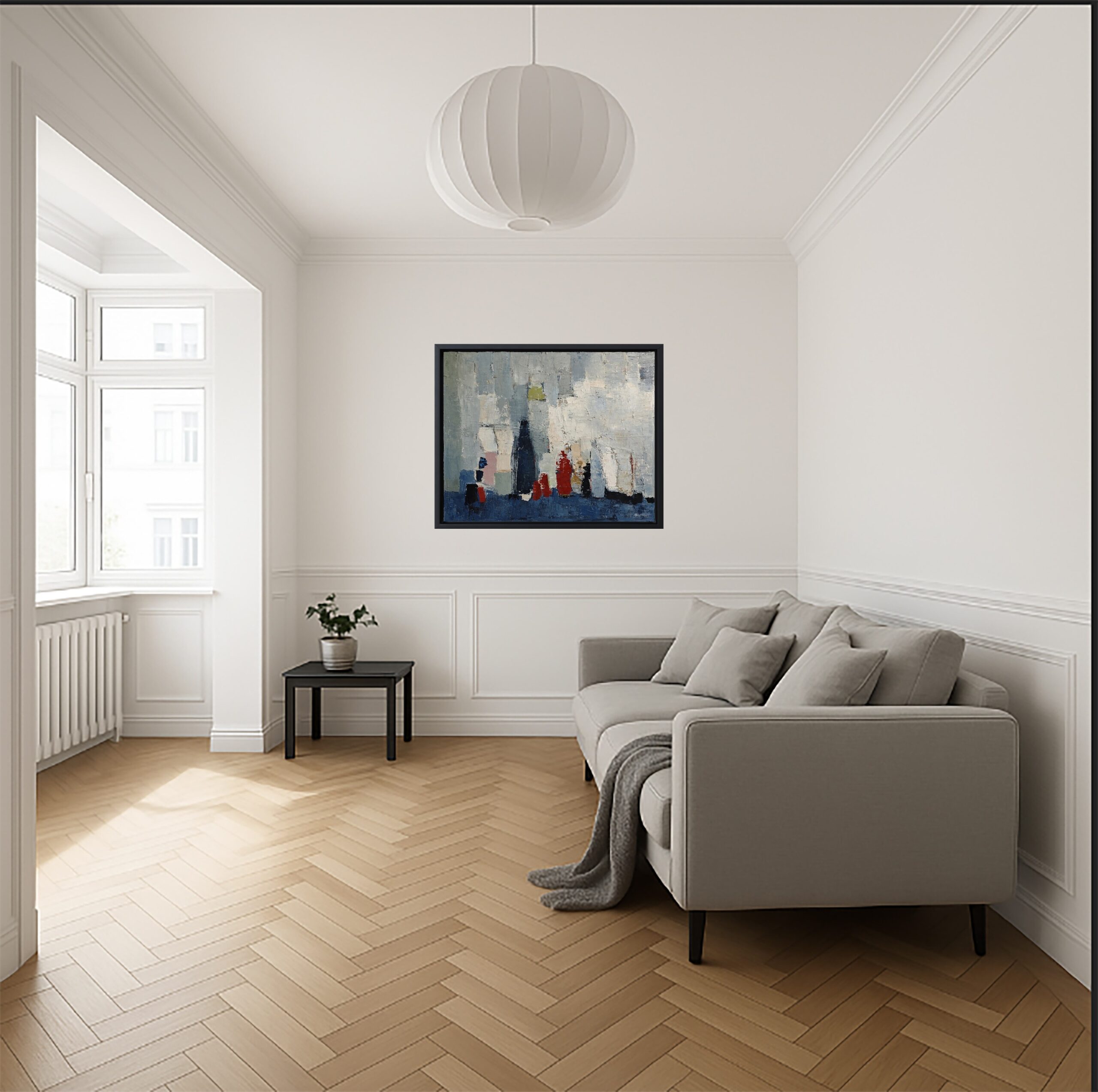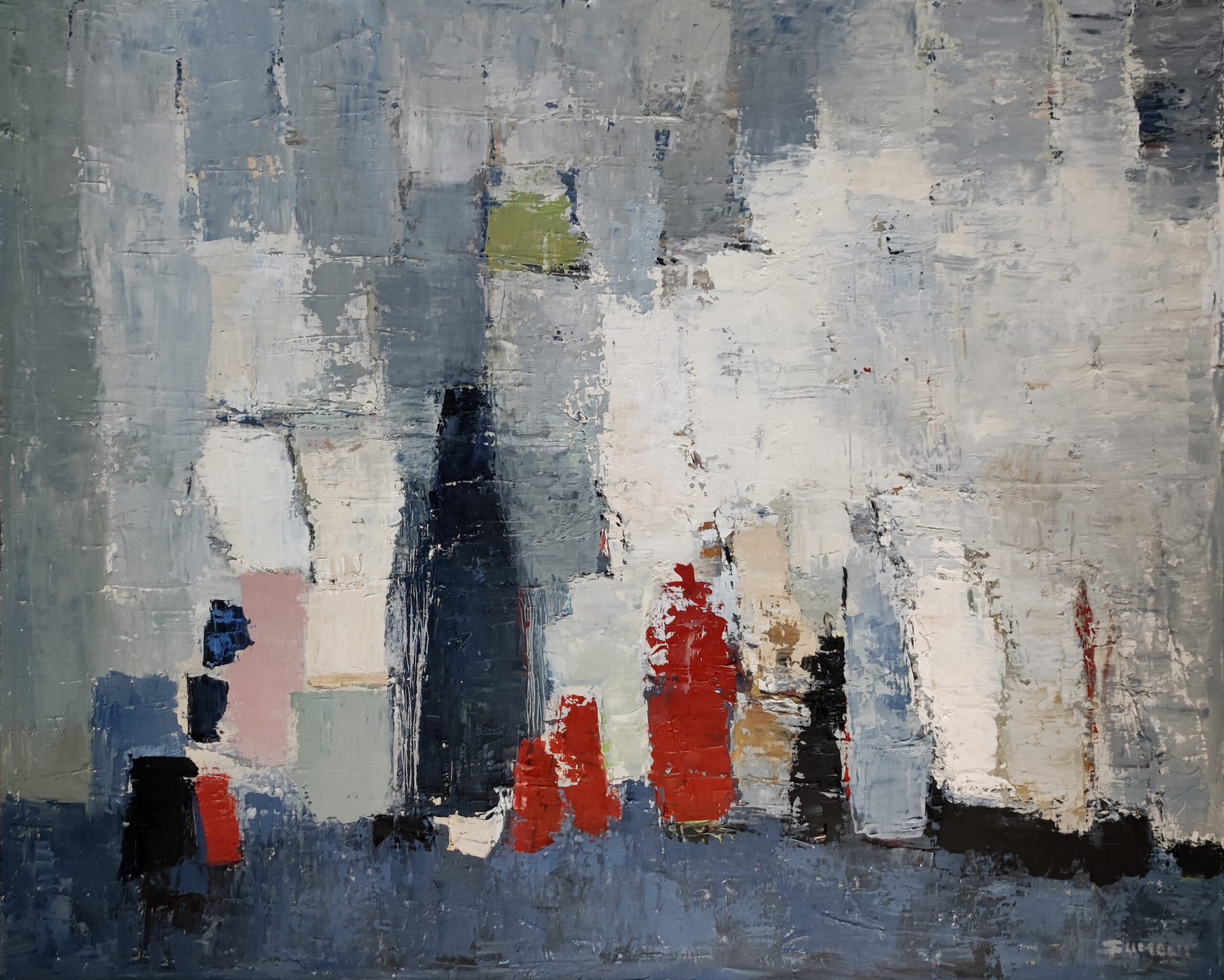 Still life with bottles treated abstractly with oil and knife. The palette, often in more subdued tones, suggests more than it imposes a resembling construction. The blue tones are counterbalanced by the red ocher which warms the canvas. The multiplication of layers brings a generous material, rich in underlying colors in warm shades to warm up these blues and grays. The artist always chooses to warm up the cold colors with red ochres in the lower layers. Choose your black or natural wood frame. This canvas was exhibited at the Quesnel Morinieres museum for 4 months in 2020.