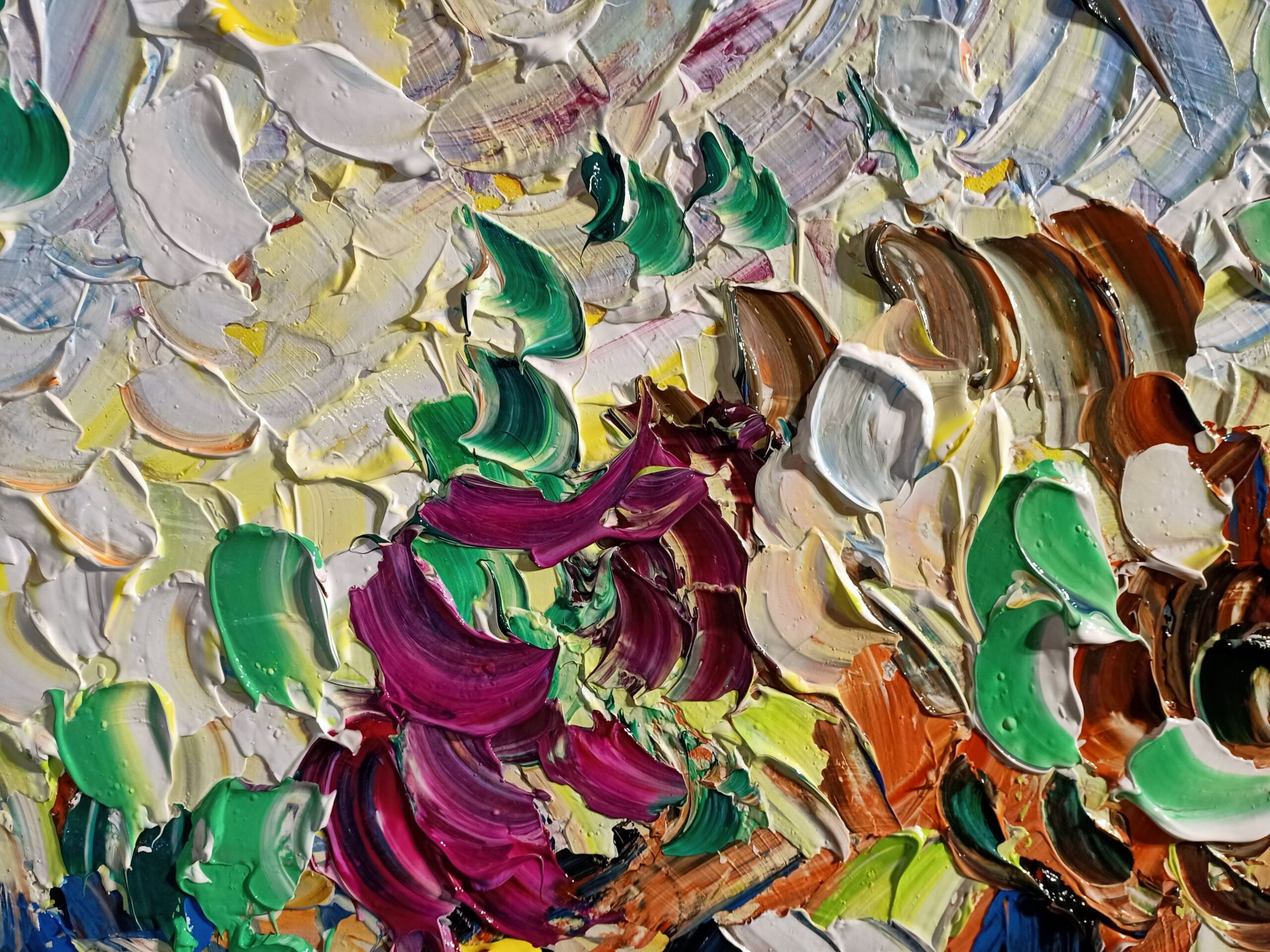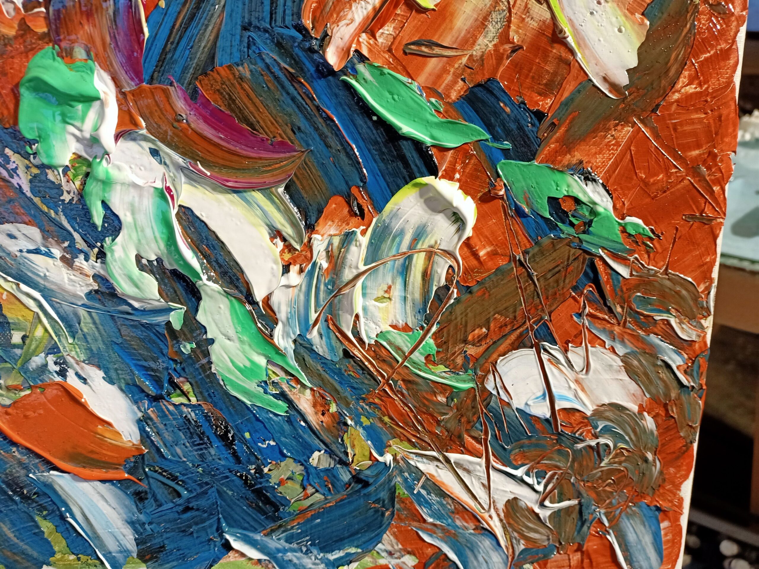 “Fiori nel Campo,” my latest 2023 creation, an 80x90cm acrylic on canvas, is a celebration of the raw beauty found in the untamed meadows. The textured brushwork and the harmonious chaos of colors capture the essence of a field brimming with life. Each stroke is imbued with an energy that mirrors the natural world’s vitality, creating a dynamic and immersive visual experience.