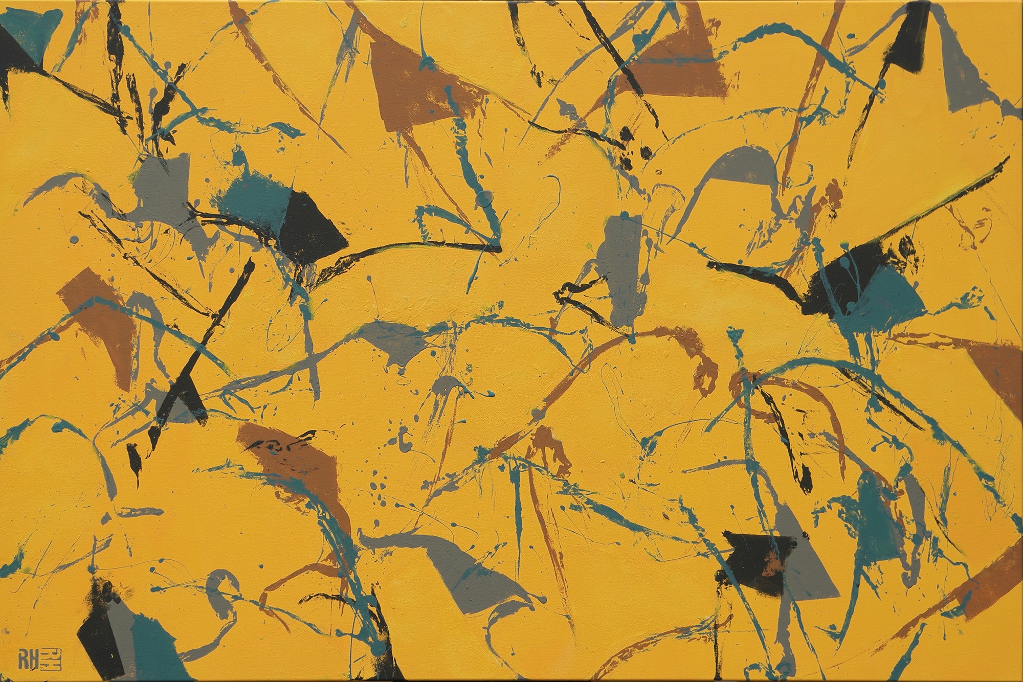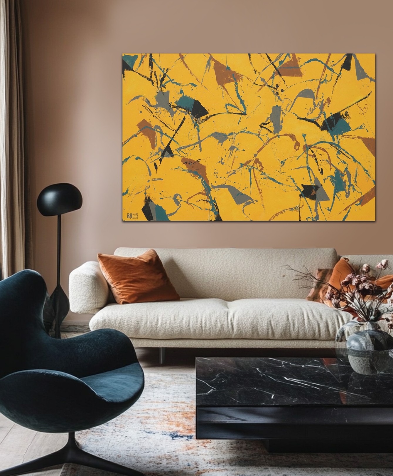 This artwork is a dynamic exploration of abstract expressionism. A vibrant yellow background sets the stage for a flurry of energetic blue and brown strokes, creating a sense of movement and spontaneity. The artist utilizes sharp angles and fluid lines to construct a visually engaging tapestry, inviting viewers to find order within chaos. The interplay of colors and shapes evokes a rhythmic dance, where each element seems to interact and respond to its surroundings. Notably, the layering of paint adds depth, encouraging a deeper contemplation of the piece’s complexity. The artwork’s vitality lies in its ability to simultaneously convey strength and fluidity, crafting an experience that is both visceral and intellectual. This painting stands out for its bold color palette and intricate composition, making it a captivating and thought-provoking addition to any collection.