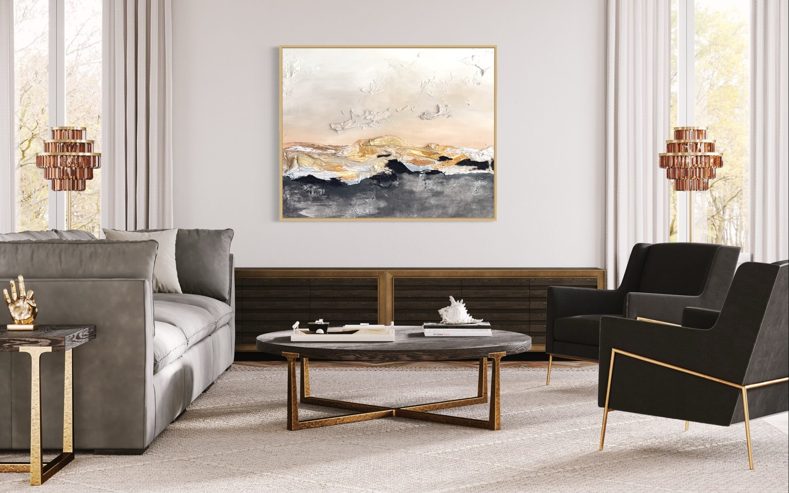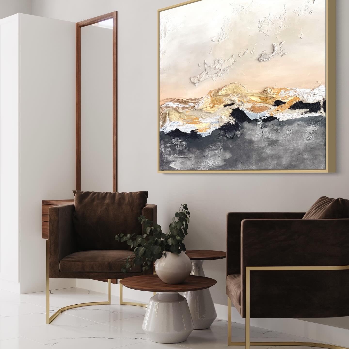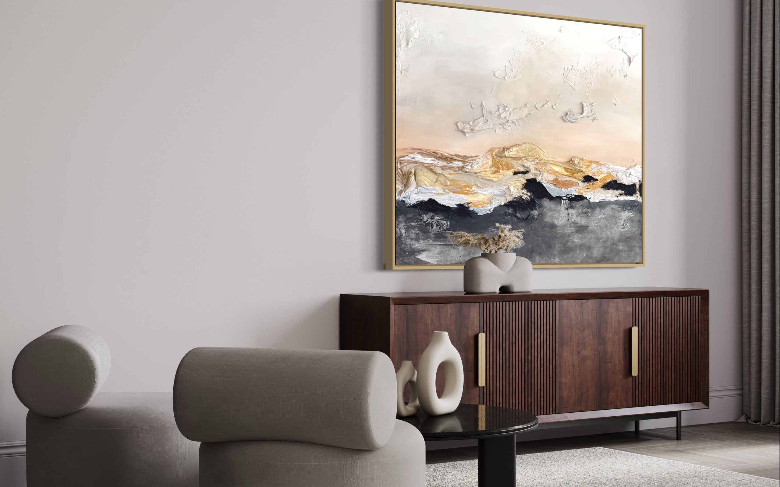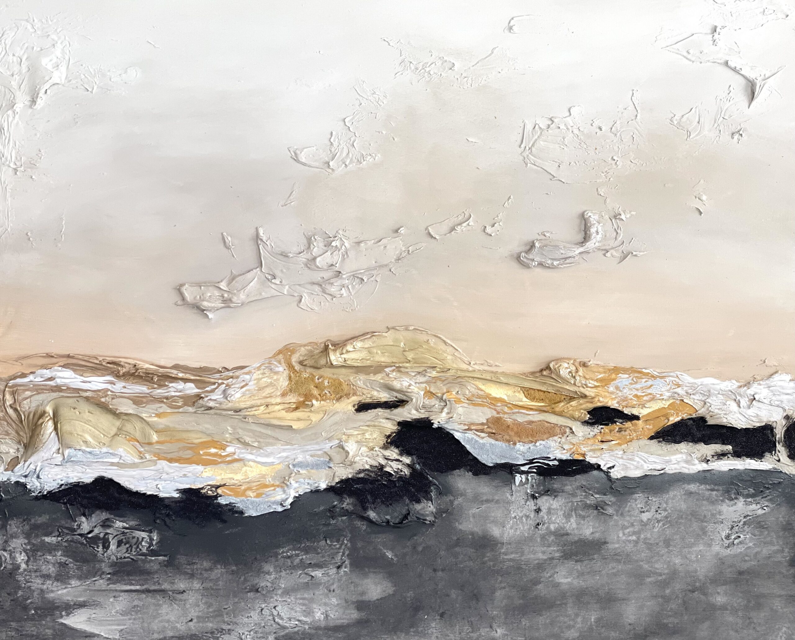 This artwork is a striking abstract landscape, expertly employing a textured mixed-media approach. Bold, layered strokes of white and gold sweep across the middle, suggesting rugged terrain or waves. These layers add a sense of depth and movement, creating a dynamic tension between the dark and light. The upper section is soft, with delicate shades of beige and cream, evoking a sky at dawn, while the textures mimic the subtle formations of clouds. The contrast between the rough, tactile surface and smooth areas enhances the visual intrigue. The artist’s use of impasto technique creates a vivid, three-dimensional effect, inviting viewers to explore the interplay of texture and color. This piece masterfully captures the awe of nature’s elements through abstract representation.
