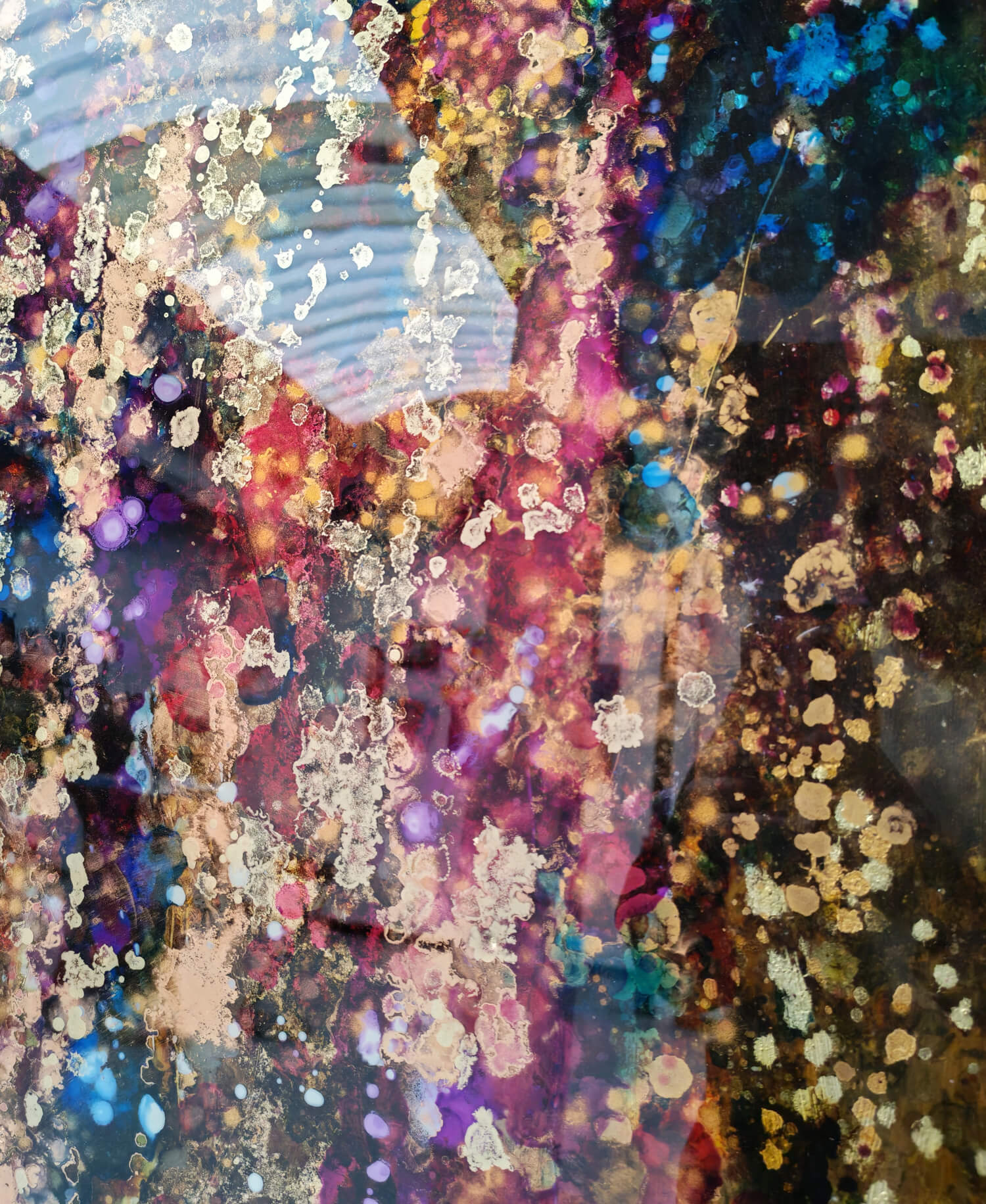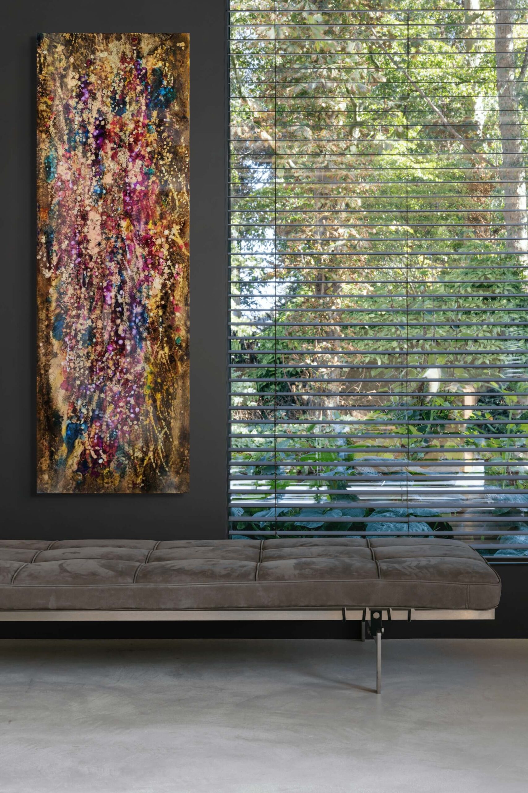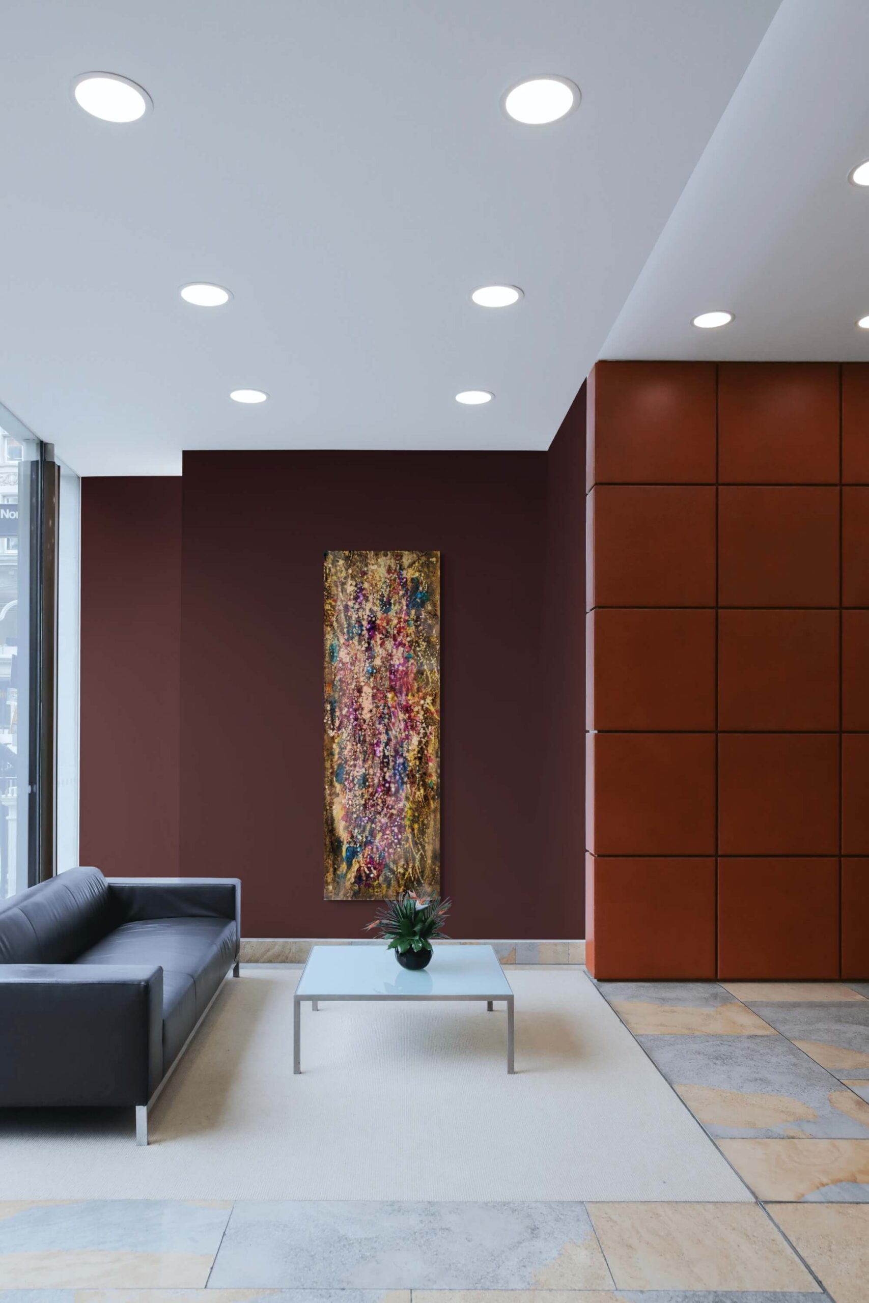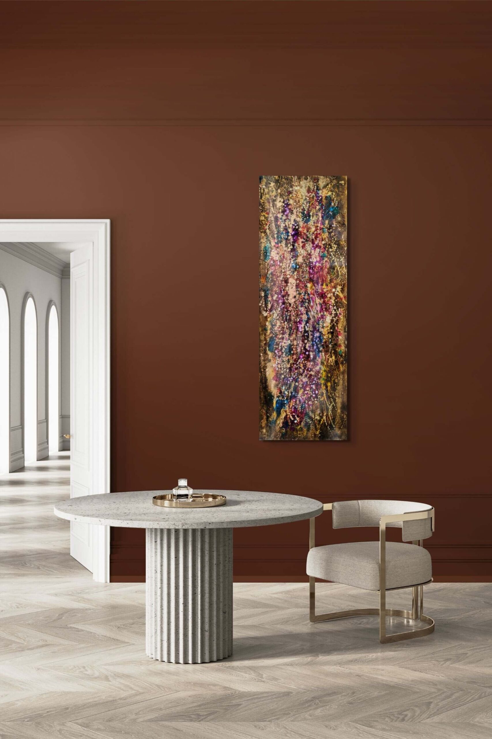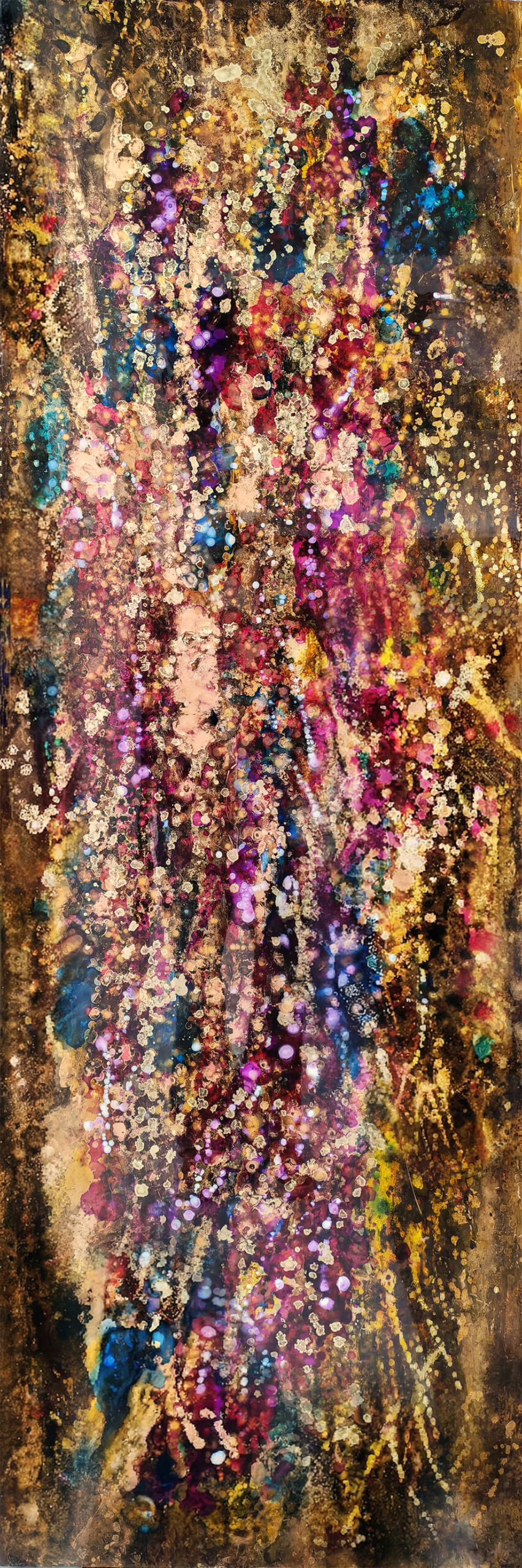 Dominated by glistening gold and deep purples, the piece exudes an aura of opulence and mystery. Small, shimmering dots and fluid lines create a rhythmic dance across the canvas, evoking the essence of a cosmic landscape or a luxuriant garden in twilight. The interplay of light and shadow adds depth, with iridescent spots catching the eye and guiding the viewer through a fascinating visual journey. This composition celebrates abstraction through its harmonious blend of colors and meticulous detailing, inviting reflection on themes of nature and the universe. Its vertical orientation enhances a sense of movement, making this piece a captivating masterpiece that commands attention with its inventive and enchanting visual symphony.