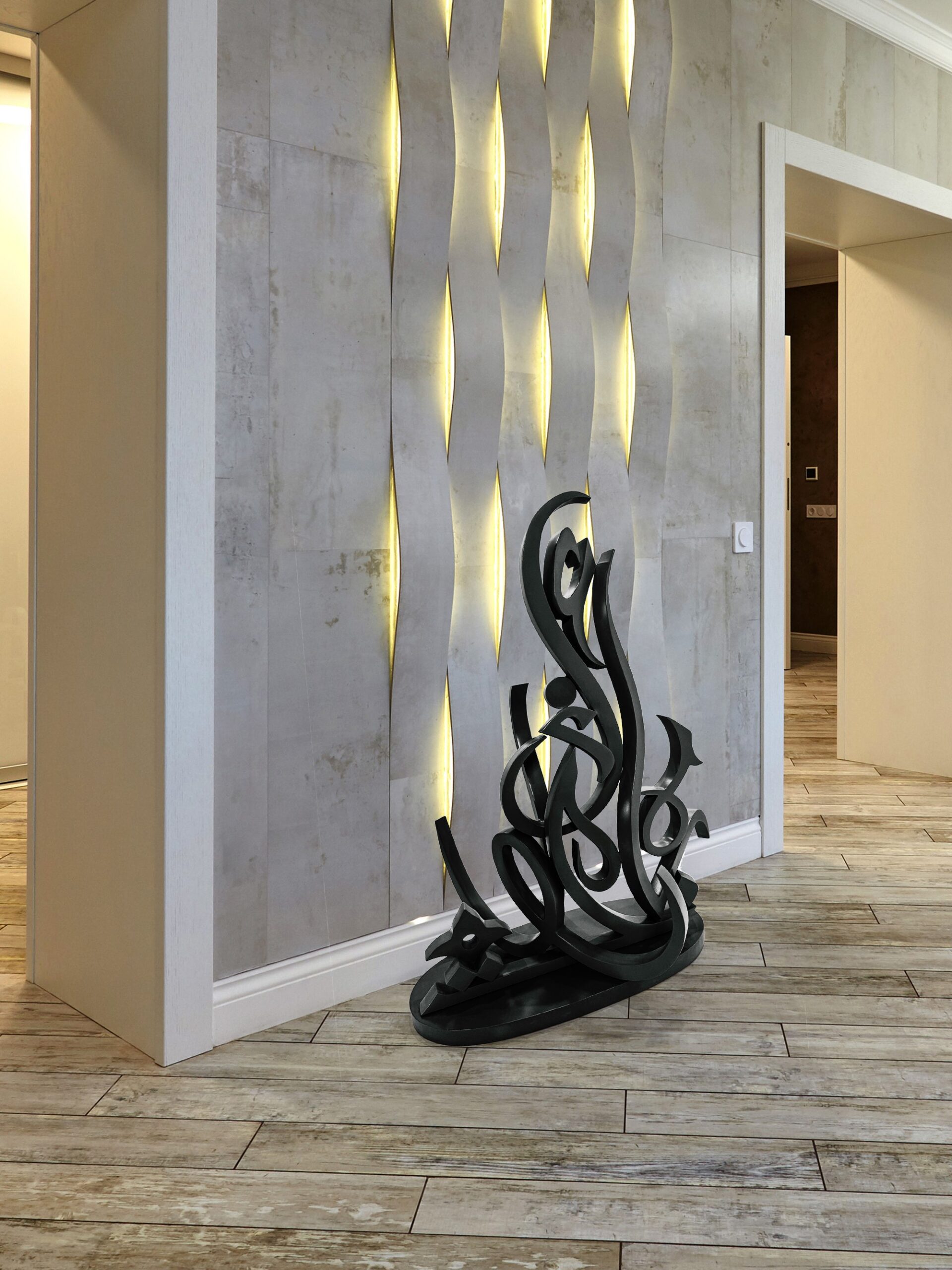 With a fusion of contemporary design and traditional calligraphic essence, this sculpture embodies curves and lines inspired by Arabic letters celebrating the harmonious blend of cultural heritage and modern artistry.