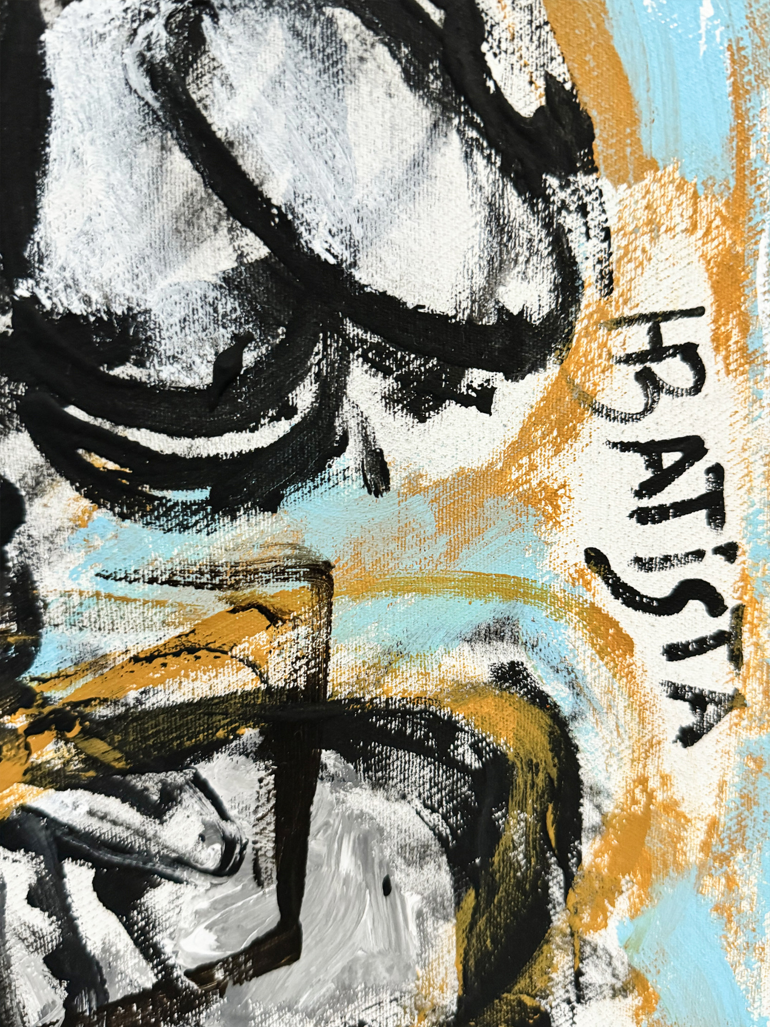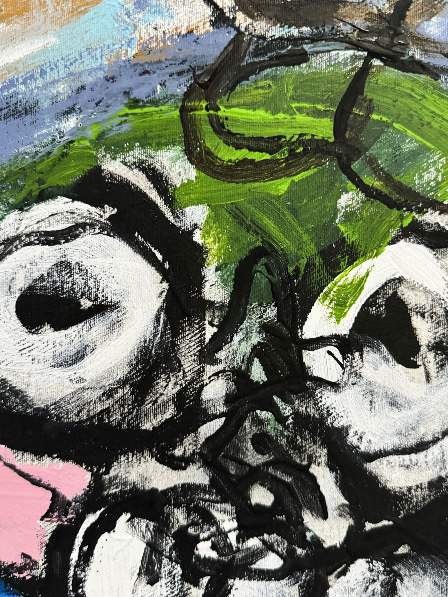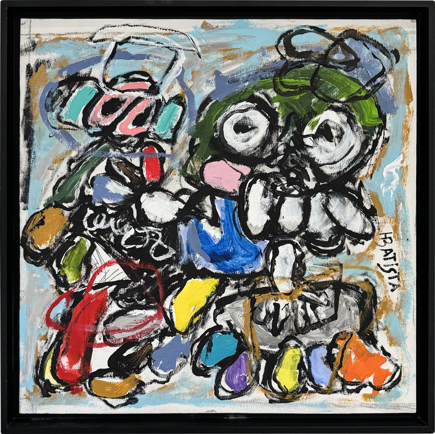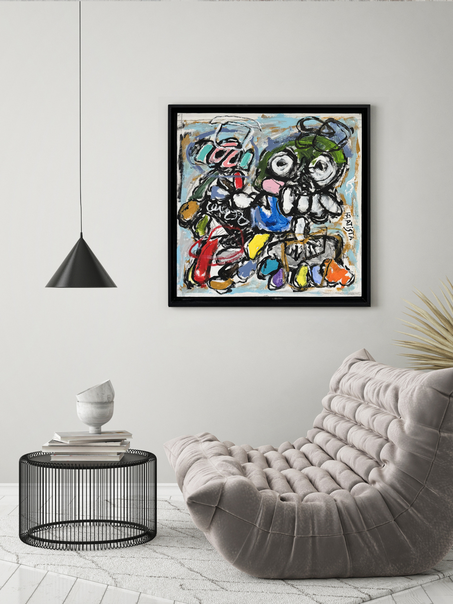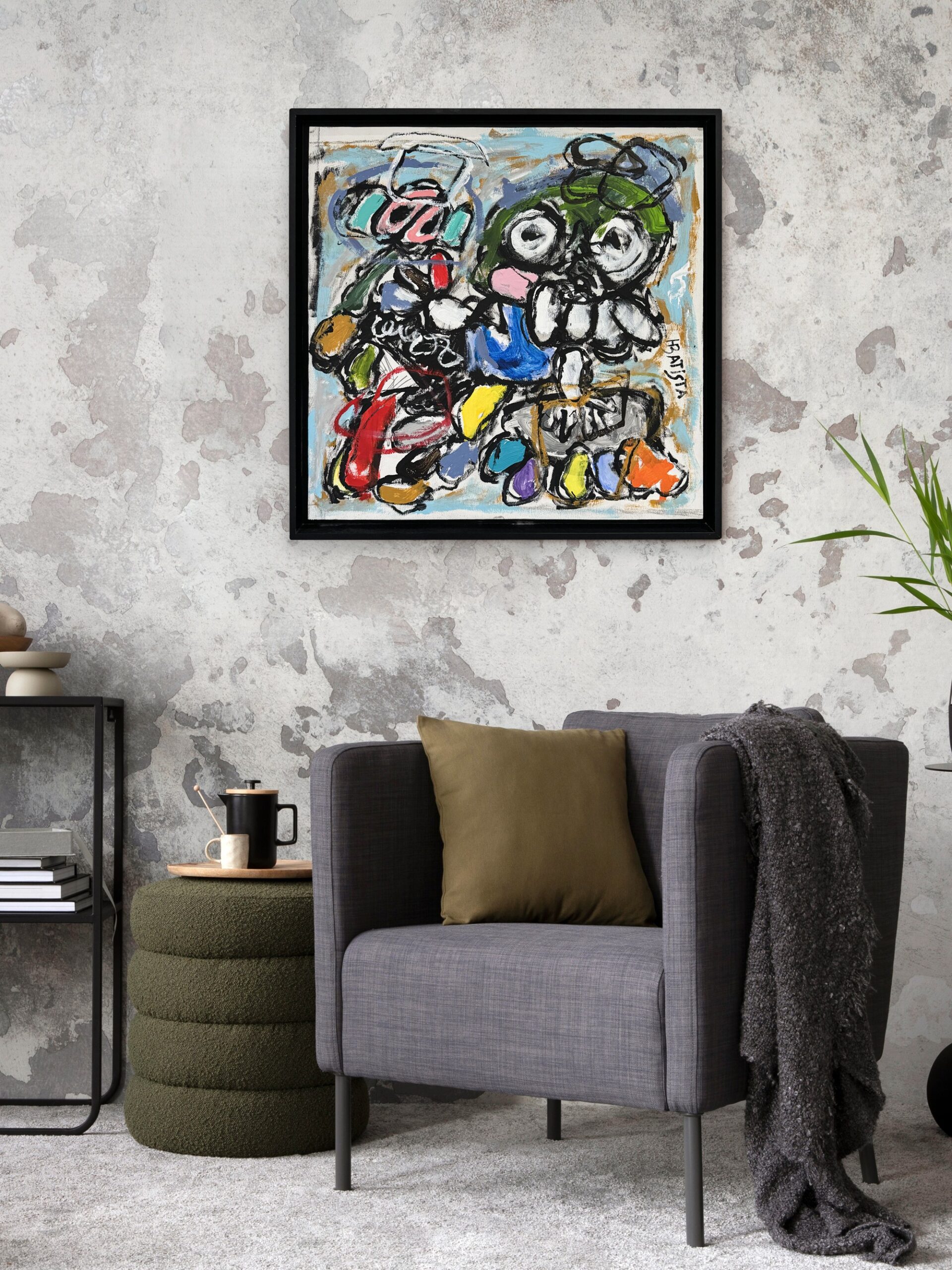 This artwork is a vibrant and arresting piece that commands attention through its bold use of color and abstract forms. The composition is a chaotic yet harmonious blend of vibrant hues, predominantly featuring shades of blue, green, red, yellow, and black. These colors are applied with an energetic and almost frenetic brushstroke technique, evoking a sense of movement and raw emotion. At the forefront, the viewer is confronted with two abstract figures. The figure on the right appears to have exaggerated, almost skeletal features, with large, hollow eyes and a wide, grinning mouth, suggesting a skull-like visage. The use of black outlines against the vivid colors enhances its striking, almost haunting presence. The figure on the left is less defined but equally compelling, adorned in a mélange of colors and forms that intermingle to create a sense of depth and complexity. The background is a whirlwind of blues and whites, creating a dynamic contrast that makes the figures pop out even more. This use of negative space and unrefined lines adds to the overall sense of spontaneity and chaos, making the viewer feel as though they are peering into the unfiltered psyche of the artist. One of the unique aspects of this piece is its ability to elicit a variety of interpretations and emotions. The ambiguity of the forms and the intensity of the colors work together to create a powerful visual experience that is open to personal interpretation. The bold, expressive brushwork and the mixture of abstract forms embody the spirit of modern expressionism, making this piece a significant and thought-provoking addition to any collection. In summary, this artwork stands out due to its vivid coloration, dynamic composition, and the raw energy of its abstract forms. It is a compelling representation of modern expressionism, teeming with emotion and open to a myriad of interpretations, making it a truly captivating piece.