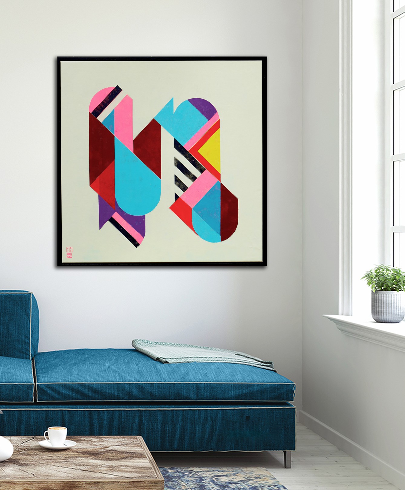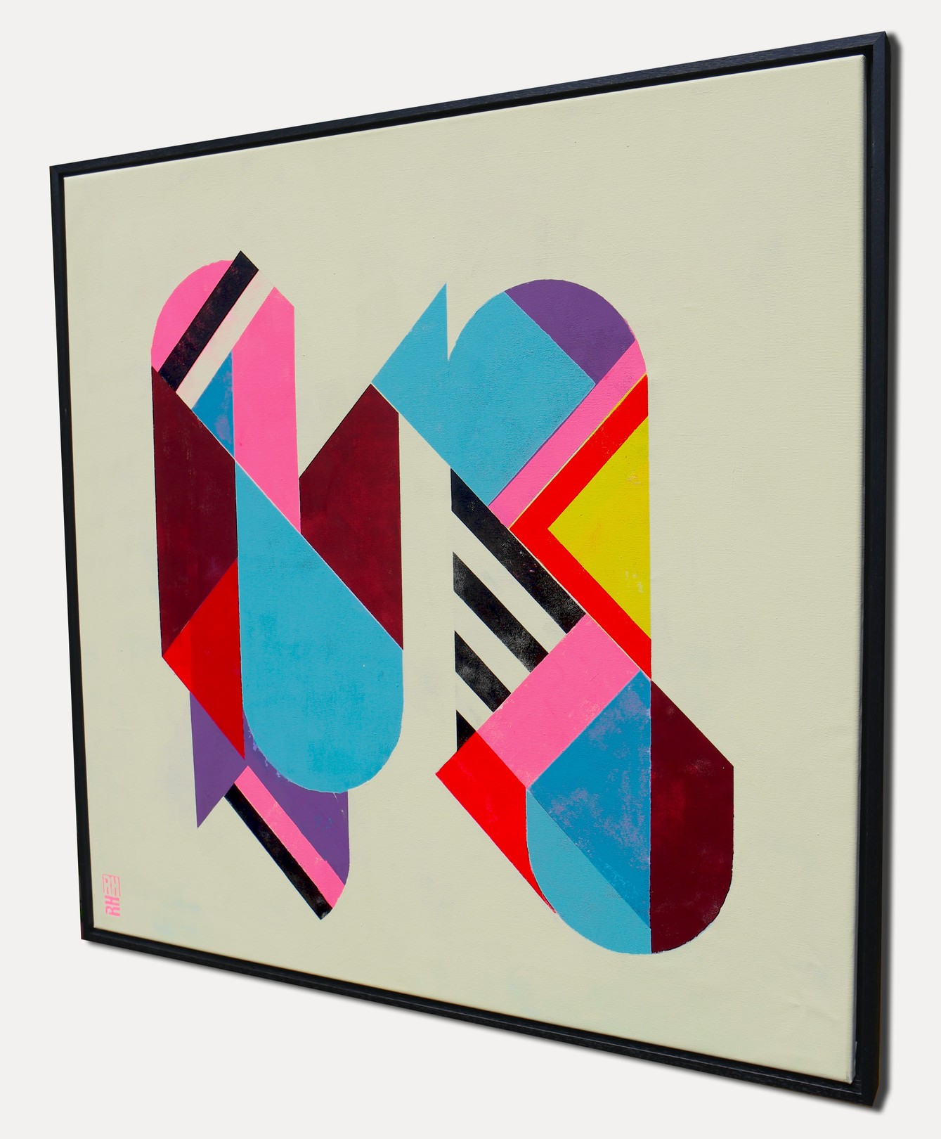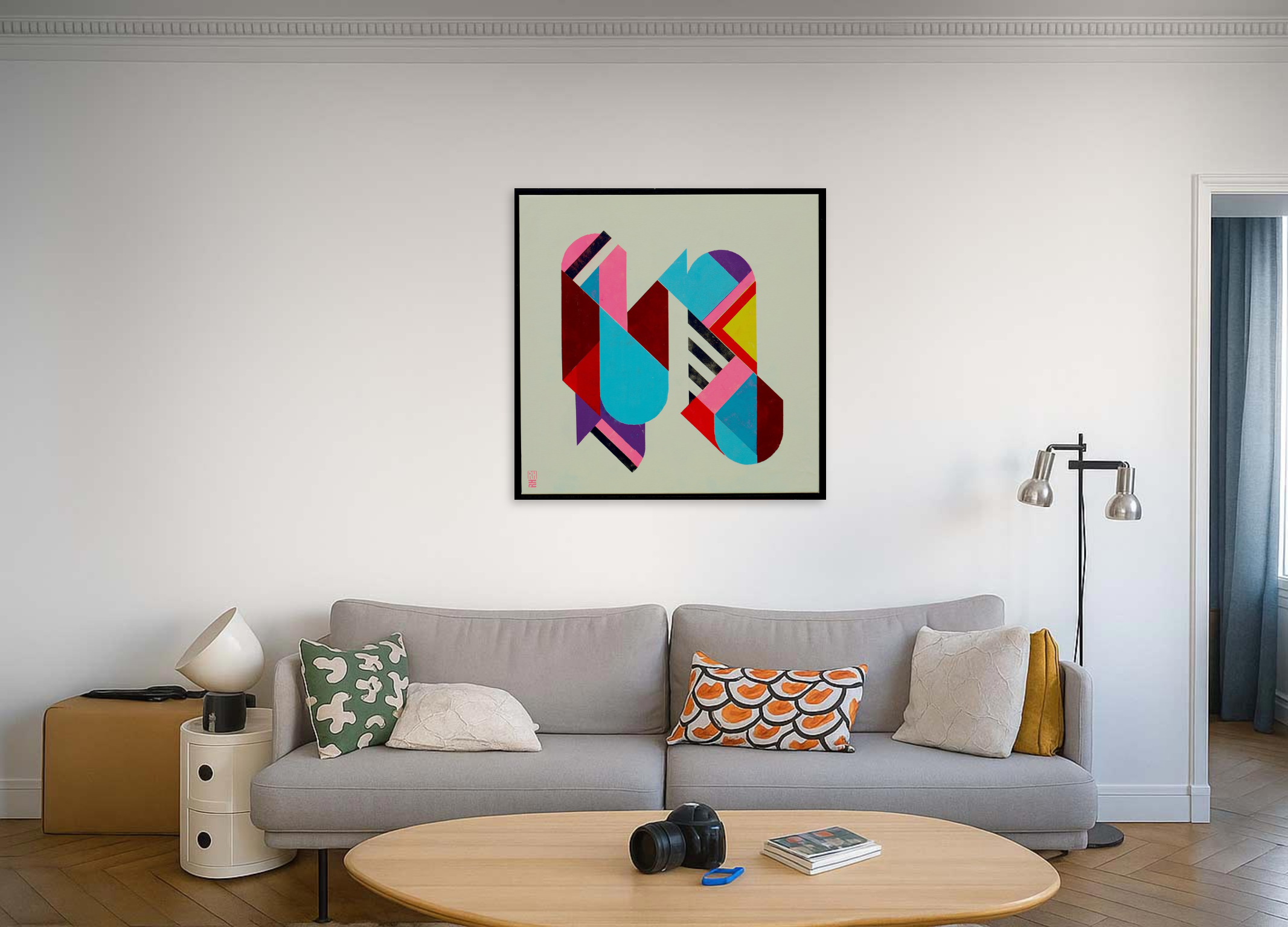 This artwork captivates with its striking geometric abstraction, featuring an arrangement of bold shapes and vivid colors. Dominating the composition are interlocking letters crafted from triangles, rectangles, and curves, each segment sharply delineated by high-contrast lines. The palette is a vibrant fusion of turquoise, magenta, and crimson, counterbalanced by sections of sunny yellows and deep blacks. The intricate interplay of shapes generates a sense of movement, creating a visual rhythm that engages the viewer. Notably, the use of color blocking and clean, precise lines underscores a modernist influence. This piece stands out due to its bold color choices and dynamic geometric forms, inviting exploration of both its structural complexity and vibrant energy. The artist’s signature in the corner adds a personal touch to this masterfully executed abstract work.