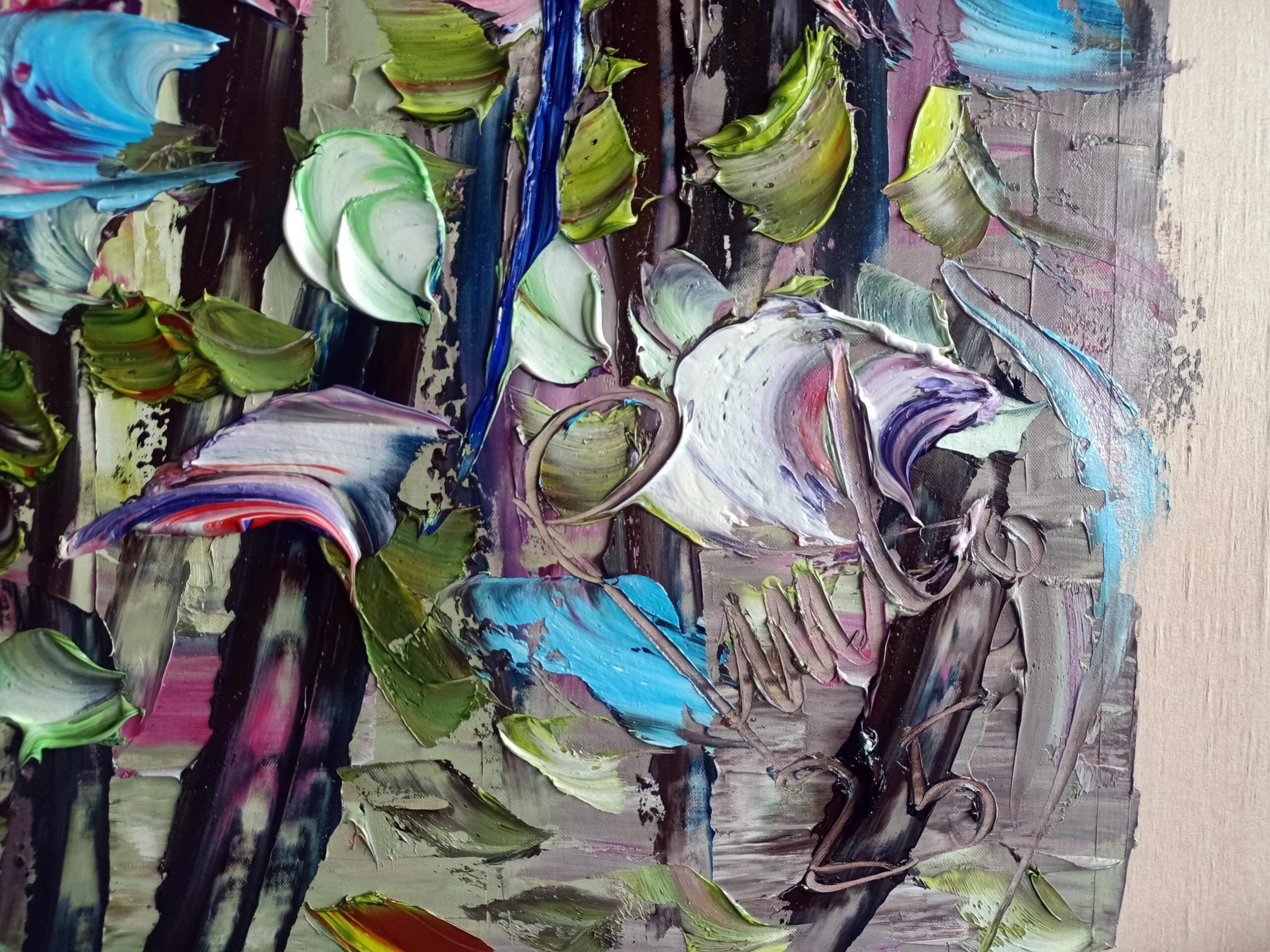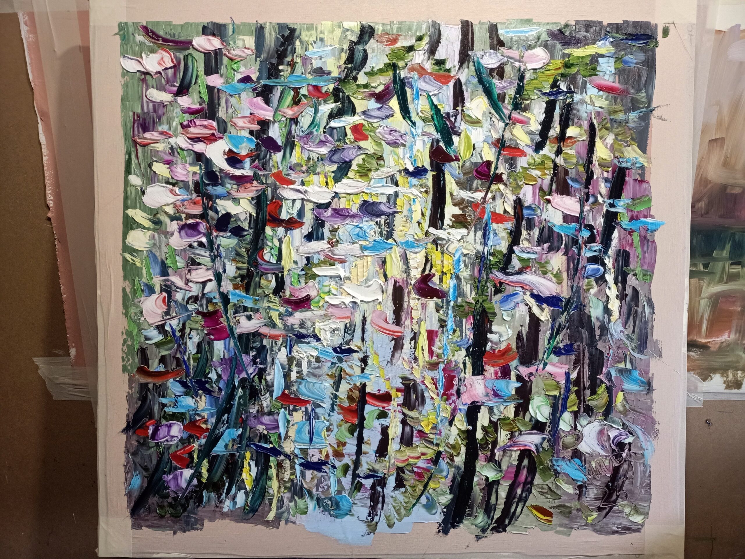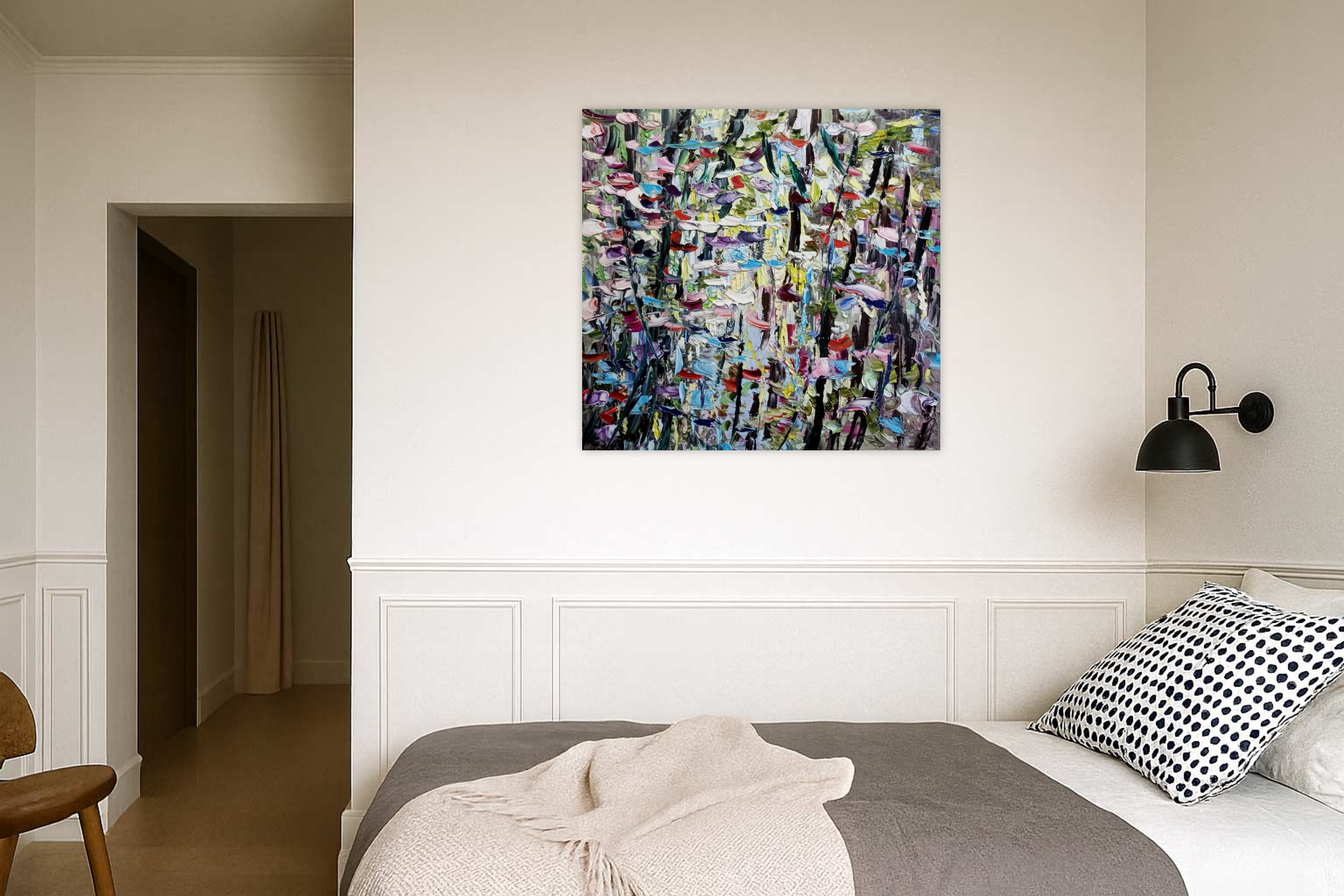 In *Breath of Time*, **Antonino Puliafico** translates the quiet rhythm of a woodland clearing into a vivid cascade of colour. Thick palette-knife strokes create a vertical tapestry of slender stems and fluttering petals, their pastel pinks, lilacs, and sky blues set against deep emeralds and charcoal trunks.