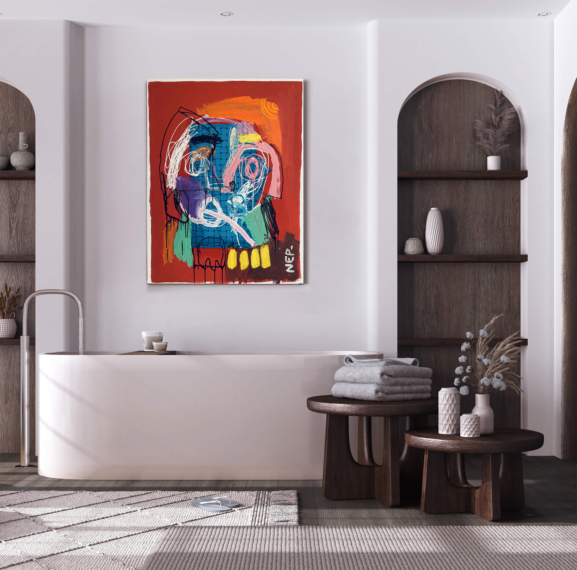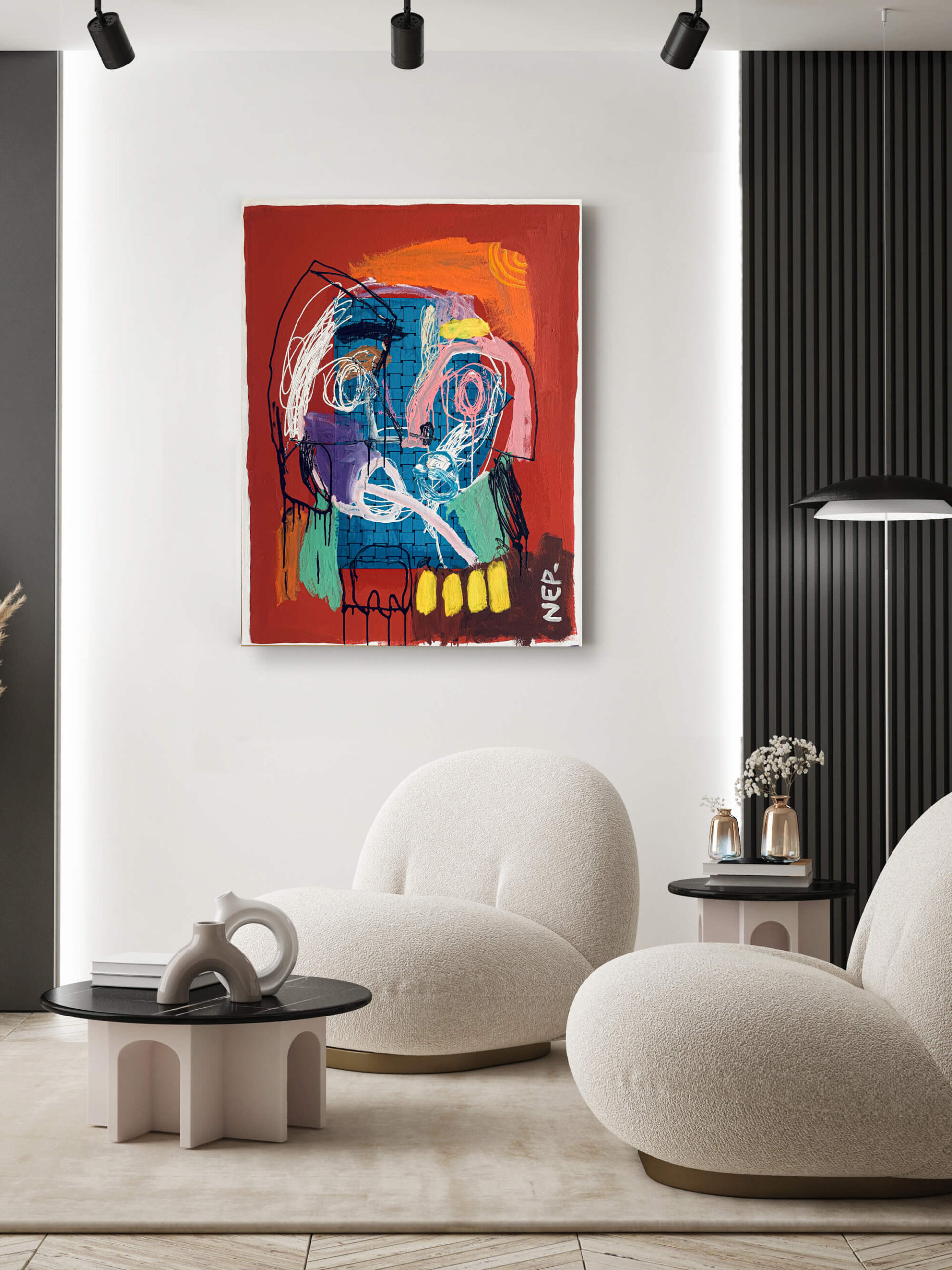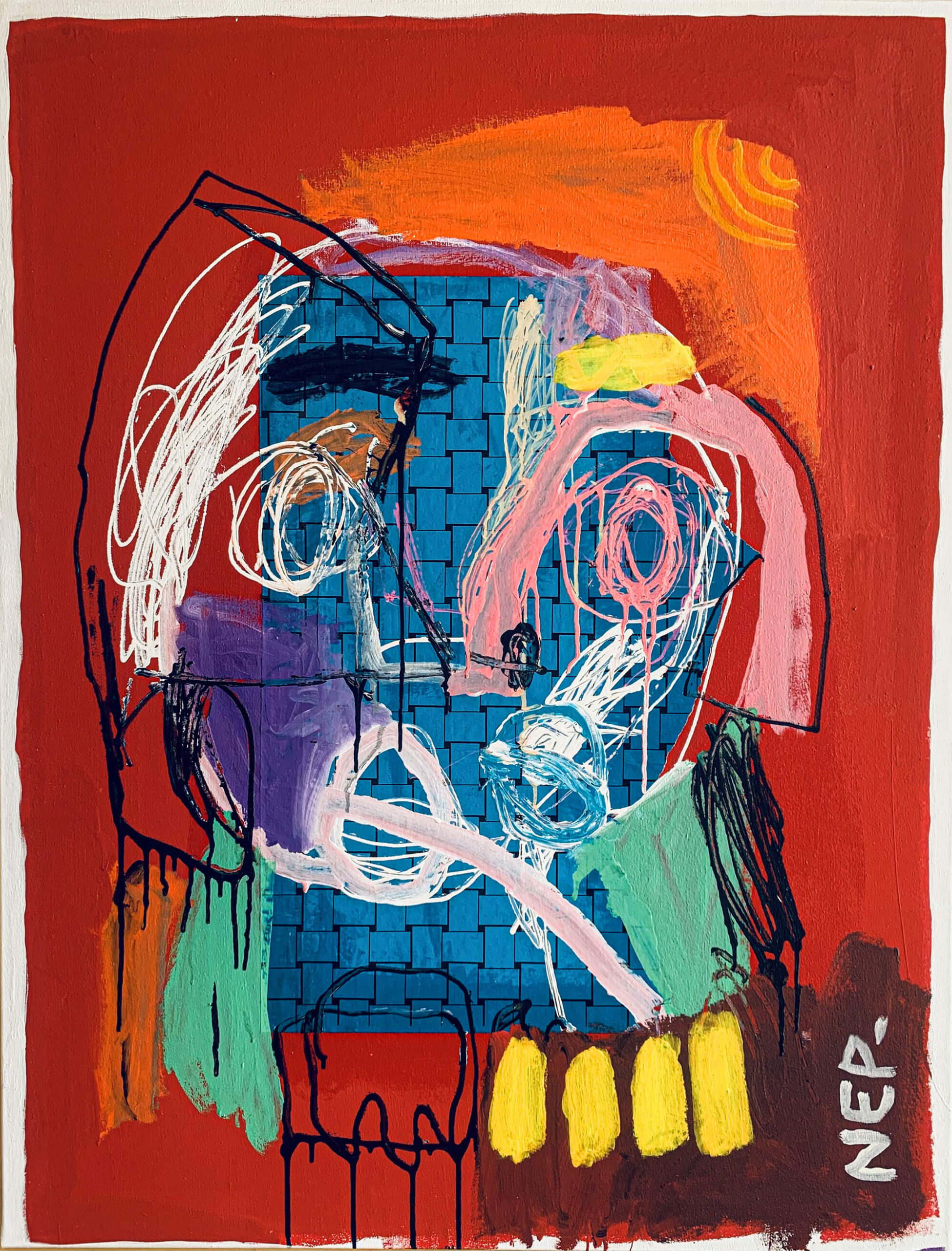 This striking artwork presents a vivid abstract composition, dominated by an eclectic fusion of bold colors and dynamic lines. At its core, a prominent blue face emerges against a rich red background, punctuated by expressive white, pink, and orange strokes that create a sense of depth and complexity. The artist employs a grid pattern within the visage, adding an intriguing structural element that contrasts with the fluidity of nearby brushwork. The interplay of geometric shapes and freeform scribbles evokes a sense of chaos and emotion, while the strategic use of black outlines provides definition and focus. A splash of yellow at the bottom injects a vibrant contrast, drawing the viewer’s eye across the piece. The artist’s signature in the corner affirms the personal touch and originality of the creation. This artwork is a masterful blend of color, form, and emotion, reflecting a contemporary exploration of identity and expression.