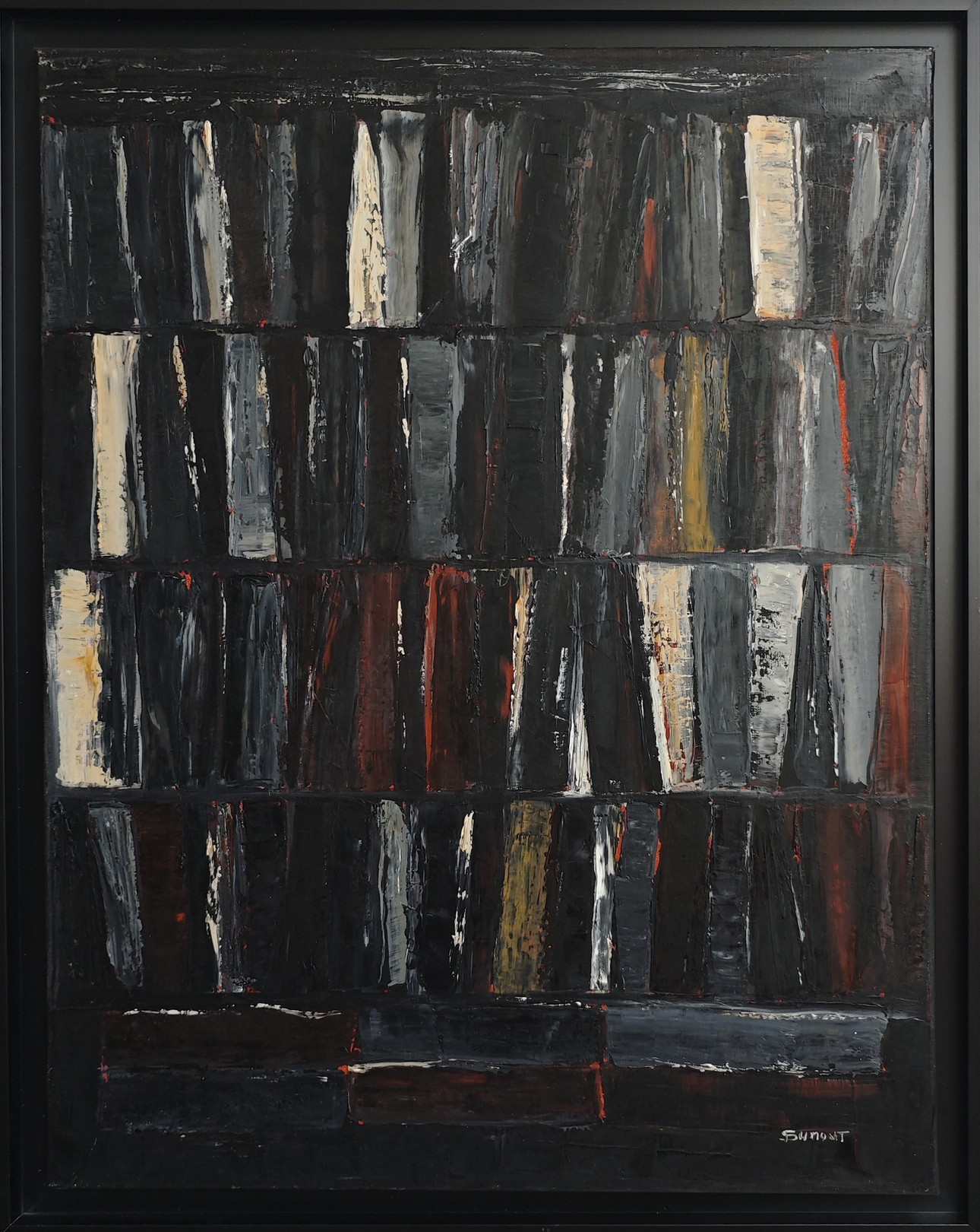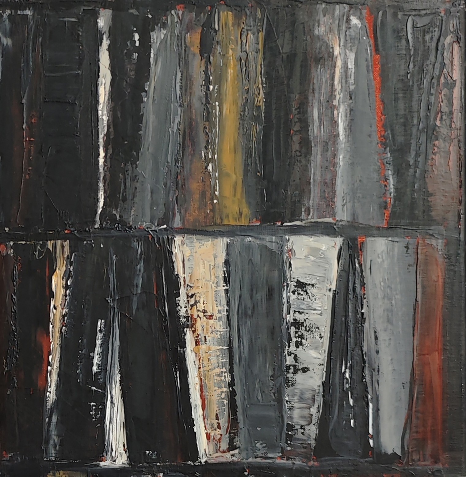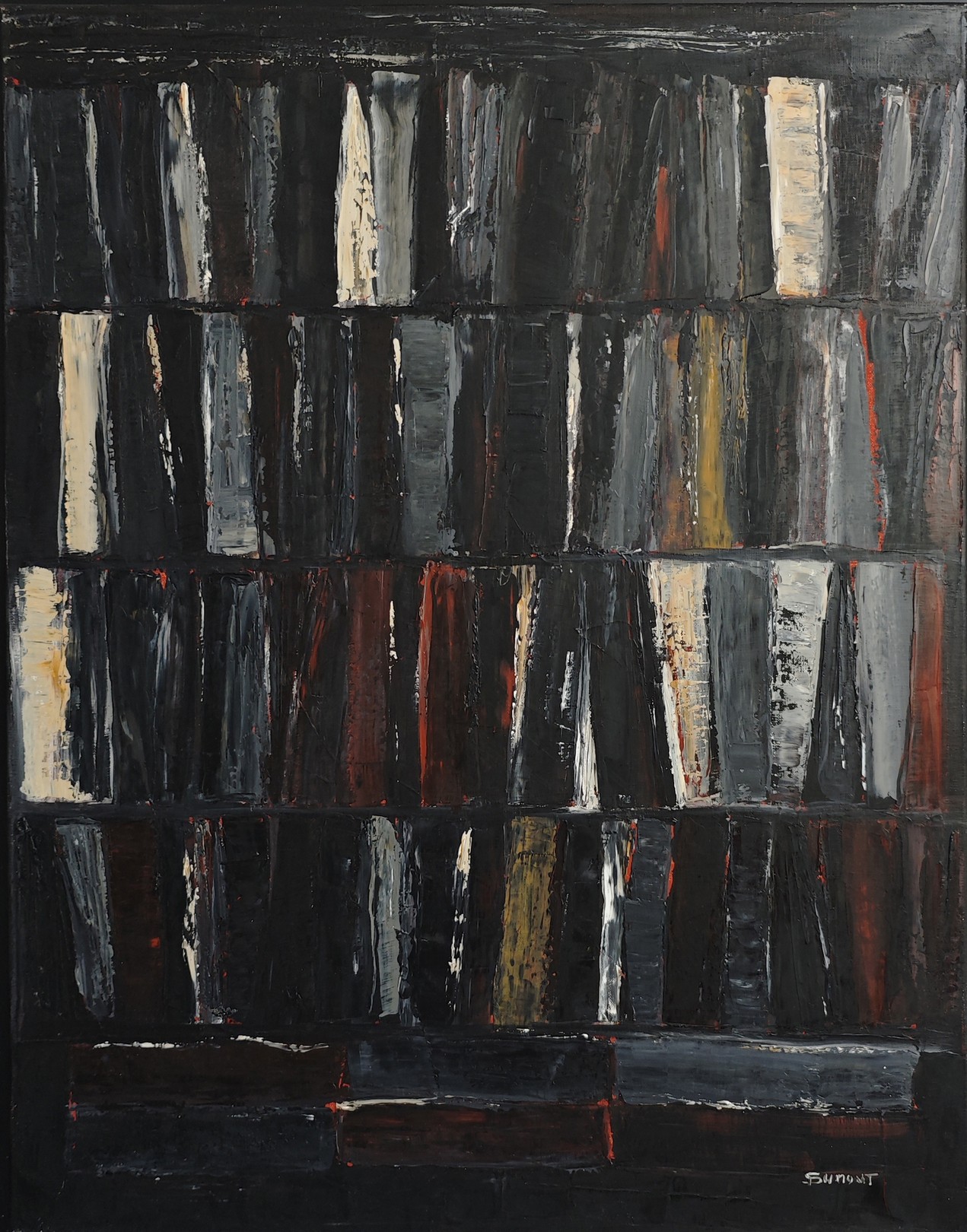 Abstraction of black books with a multitude of layers all in oil. Libraries are a key subject for the artist who plays with lights and dark tones. All the light is brought by these contrasts with the slightly ocher white and the red ochres which come to mingle with the black. A strong painting that will be highlighted on a light wall.