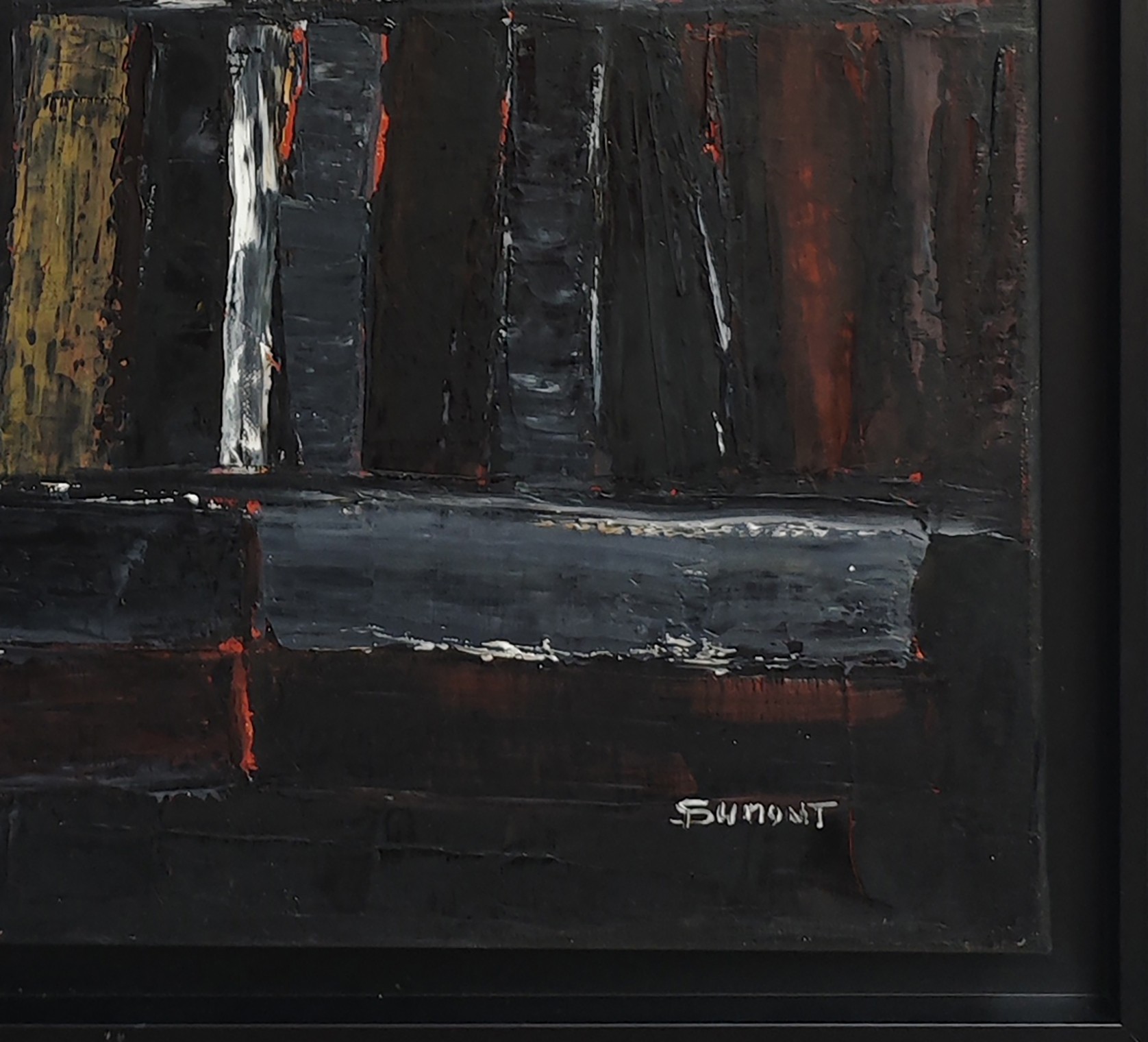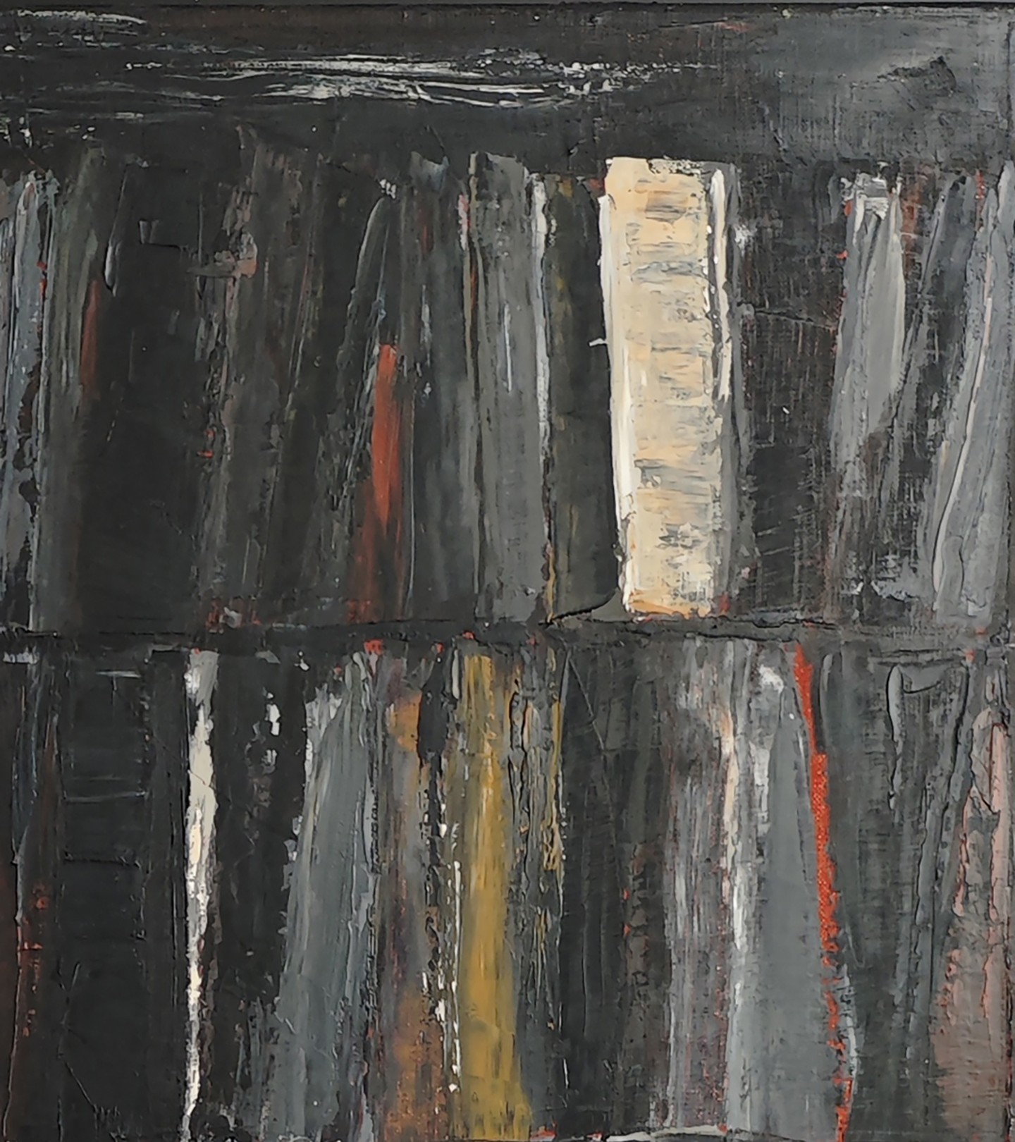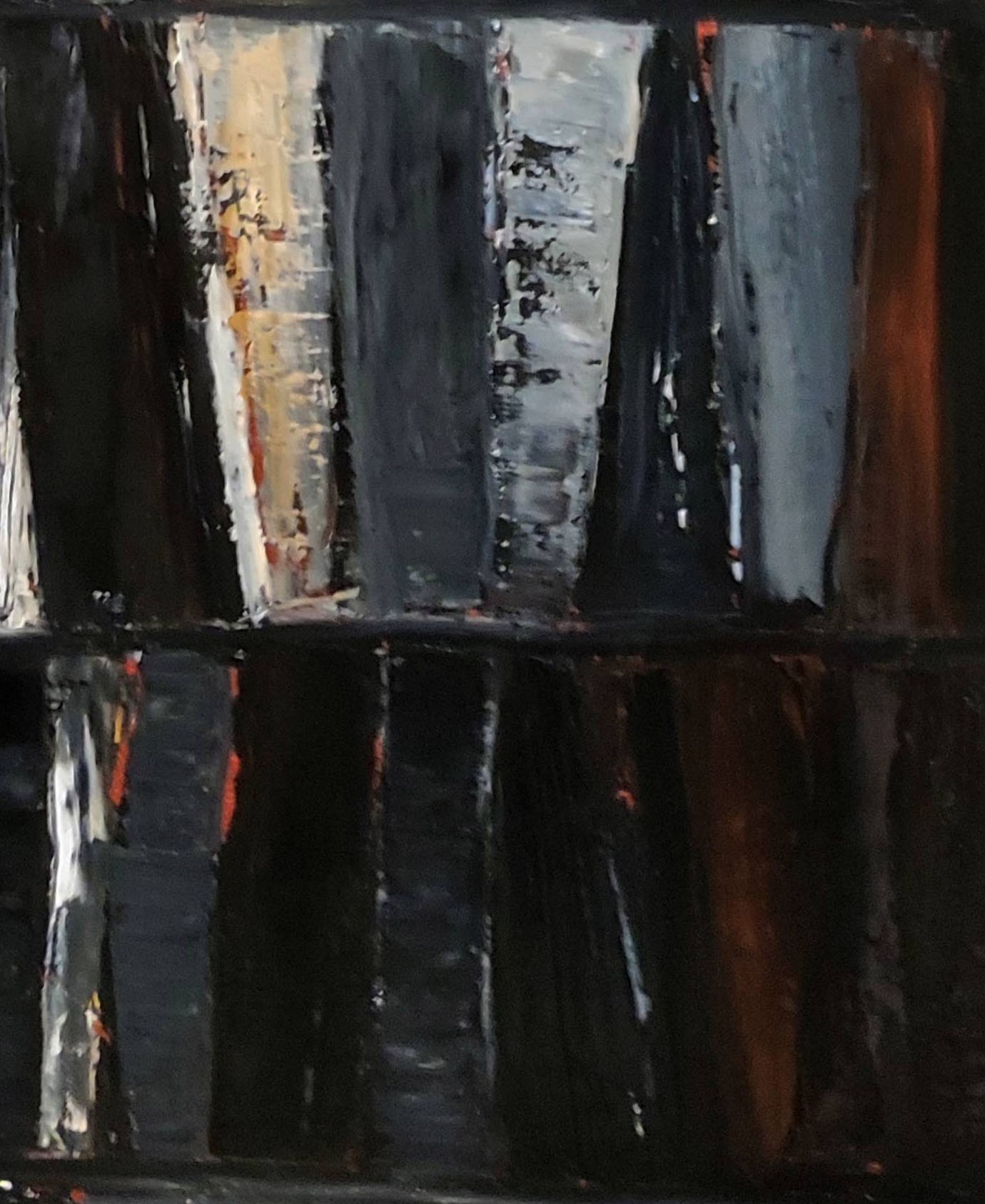 Abstraction of black books with a multitude of layers all in oil. Libraries are a key subject for the artist who plays with lights and dark tones. All the light is brought by these contrasts with the slightly ocher white and the red ochres which come to mingle with the black. A strong painting that will be highlighted on a light wall.