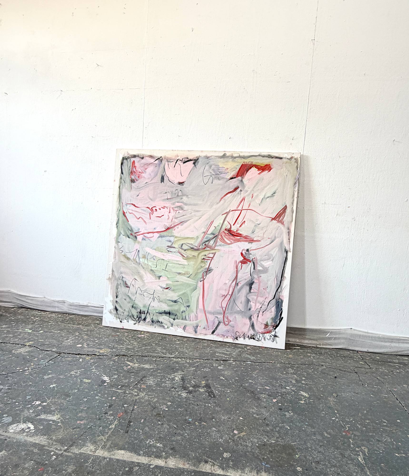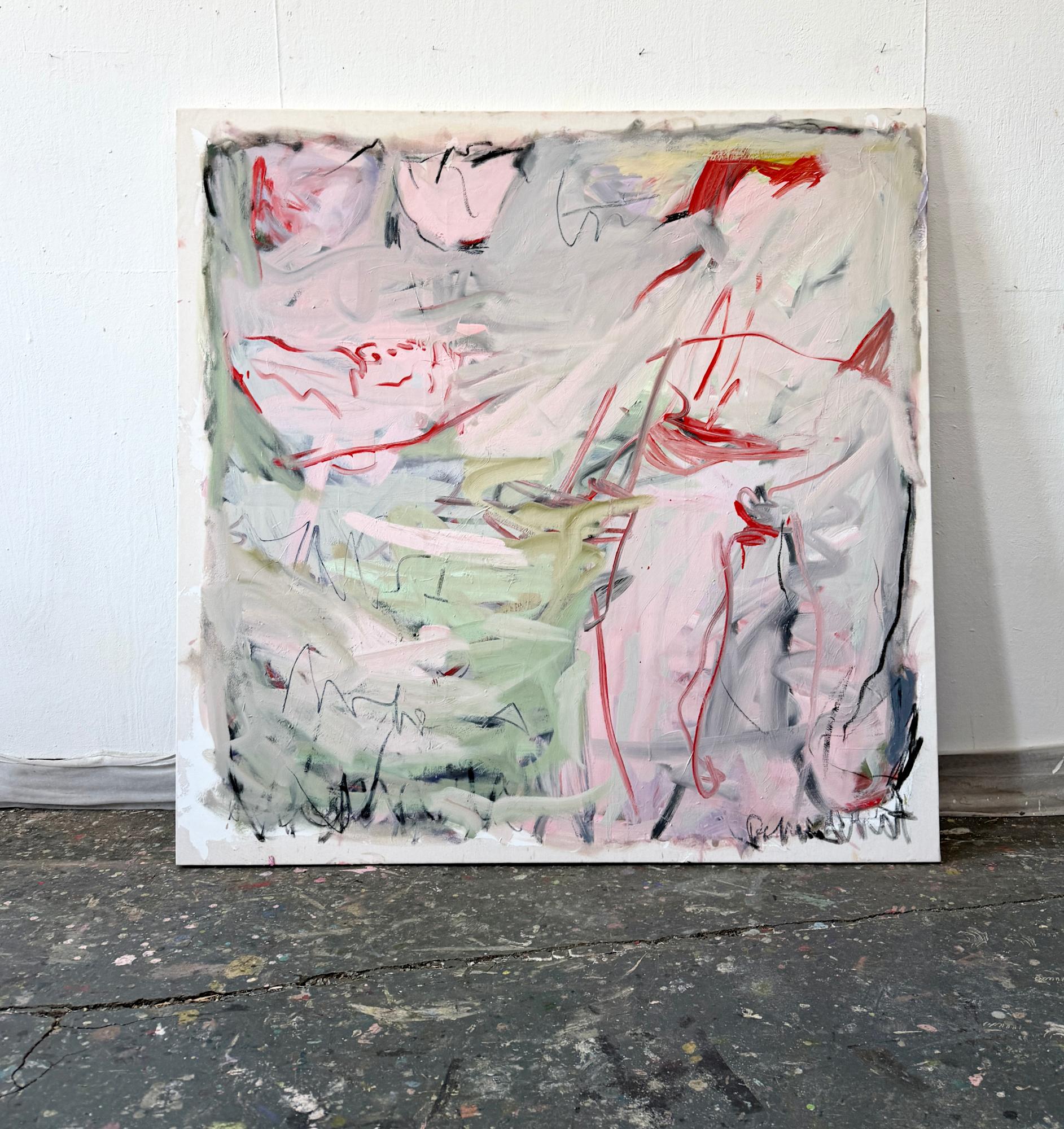 This abstract artwork (Just Like A Woman V by Petra Schott) is a mesmerizing dance of pastel hues and dynamic brushstrokes. Dominated by soft pinks and subtle greens, the painting evokes a sense of organic movement and fluidity. The application of thick, swirling gestures creates a textured surface, inviting viewers to explore its depths. Bold red accents offer contrast, drawing the eye across the canvas and suggesting hidden forms or figures. This captivating interplay between color and form challenges perception, inviting interpretation. The energetic lines convey a raw, emotional intensity, hinting at the artist’s spontaneous process. This piece stands out for its blend of gentle tones and vibrant energy, encapsulating the essence of abstract expressionism.