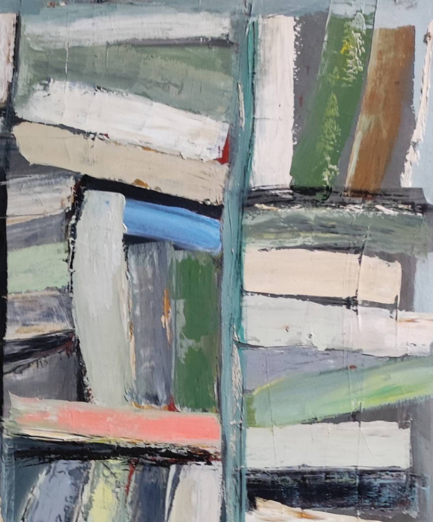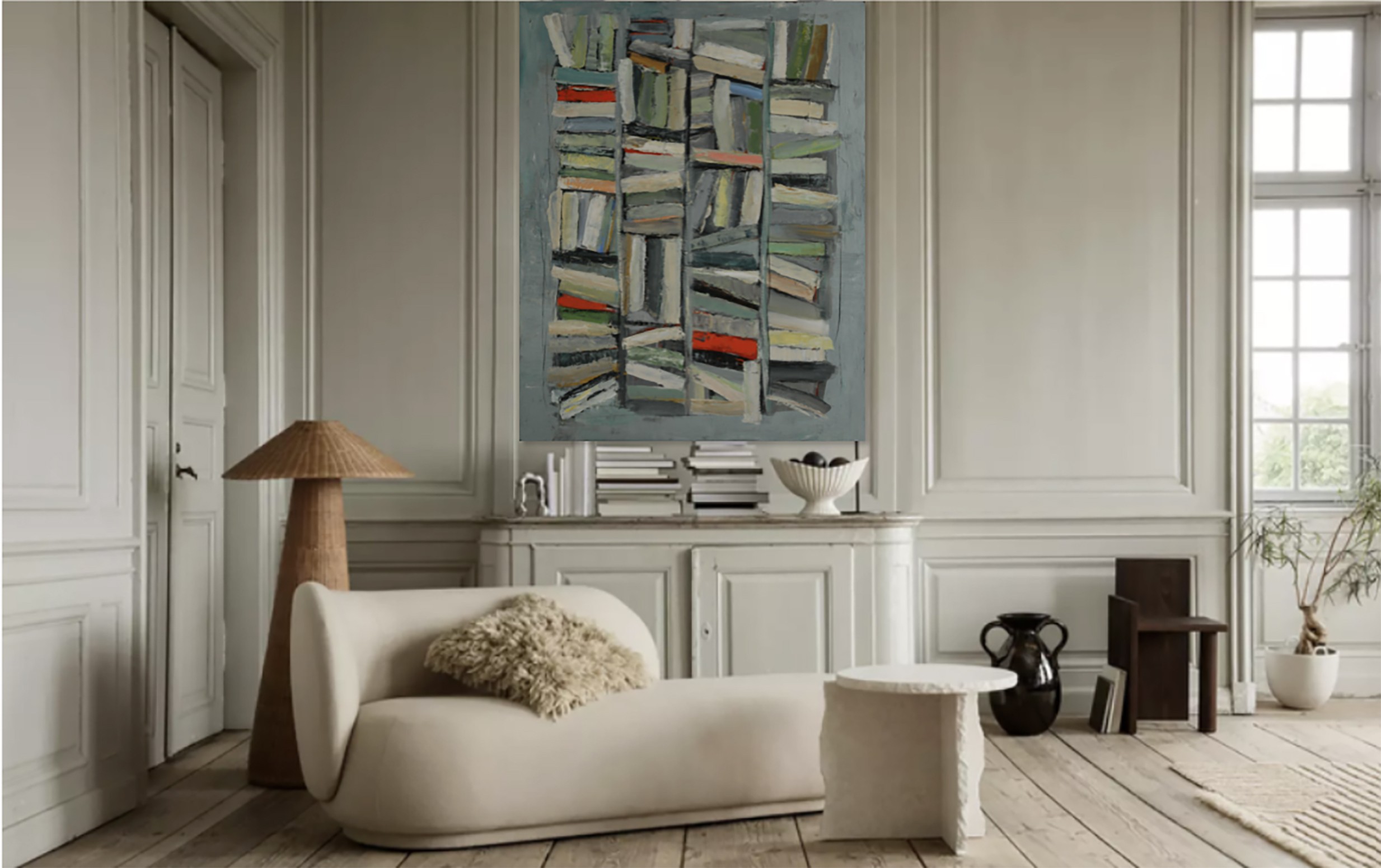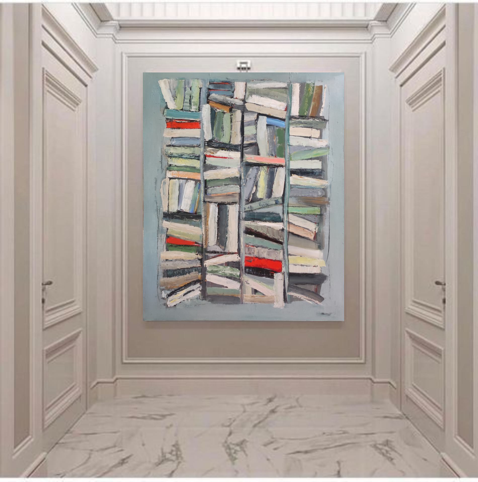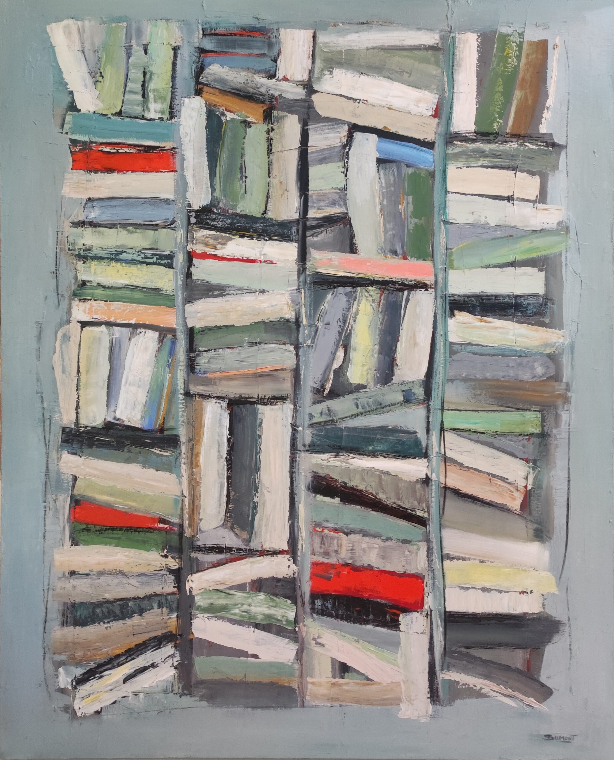 picture of a library with colorful books. Close to geometric abstraction, books remain very present. As always the canvas is worked with a multitude of layers. Libraries series. The work is deliberately unframed. The edges of the painting are painted which allows you not to put a frame.