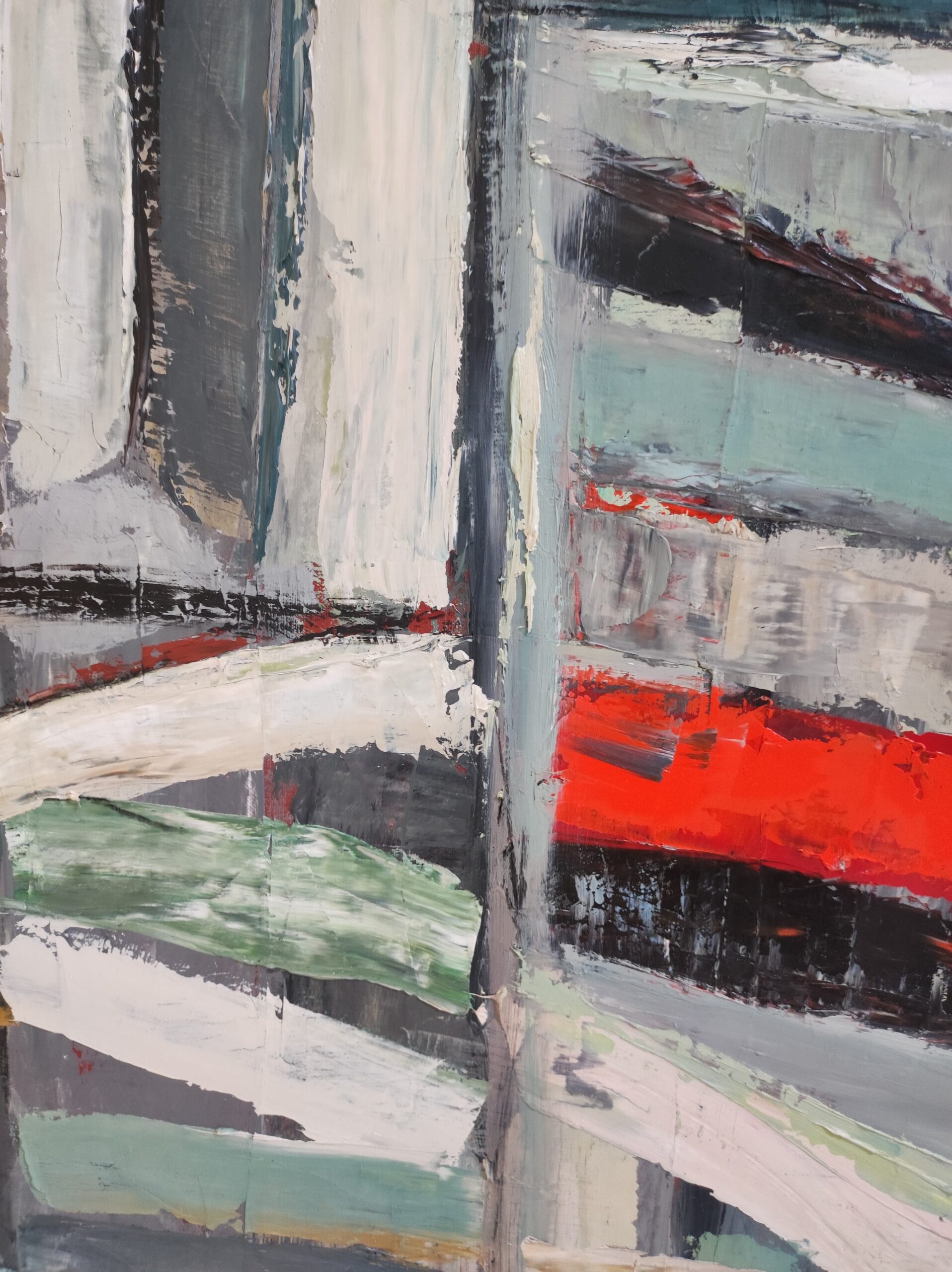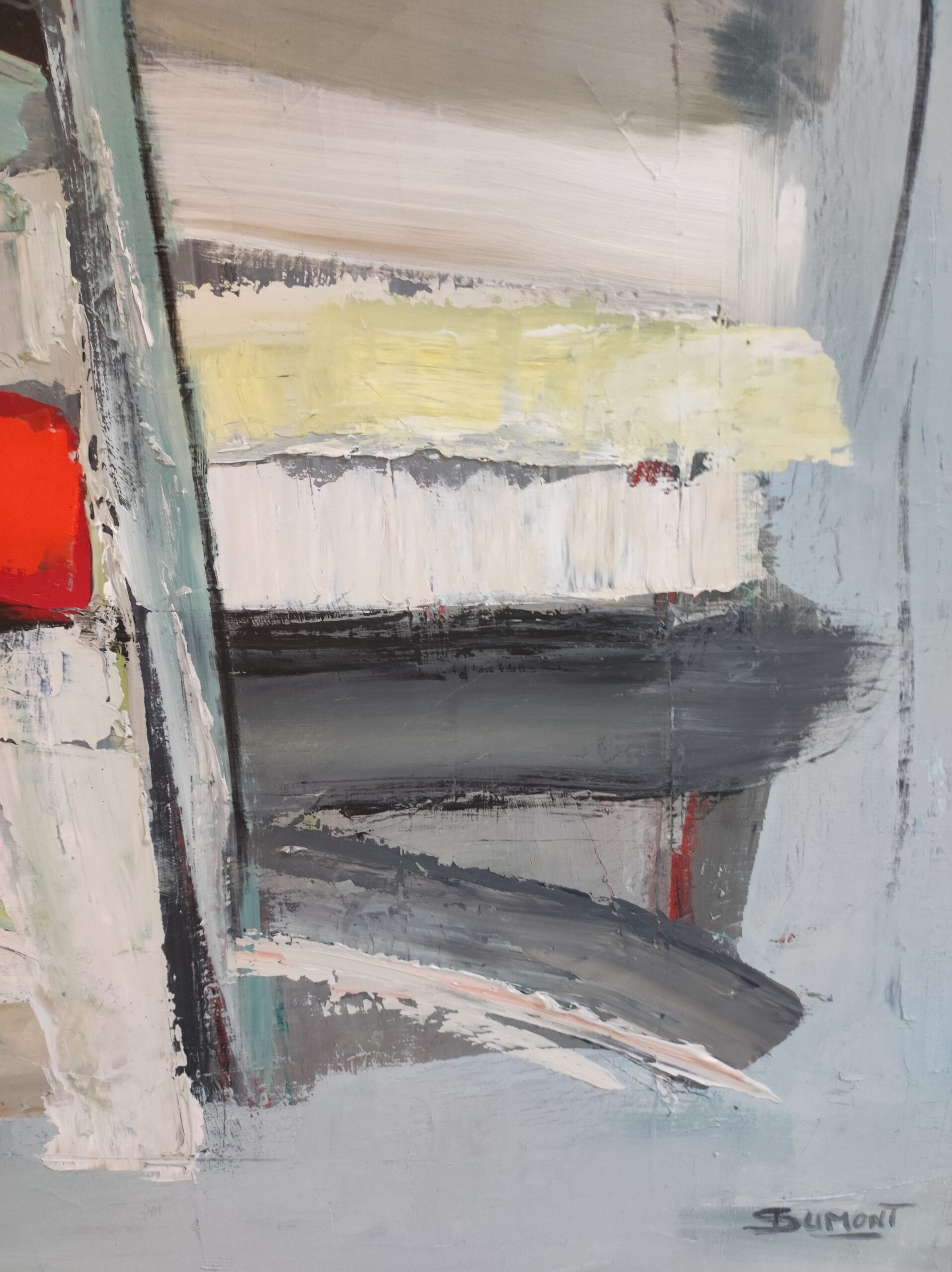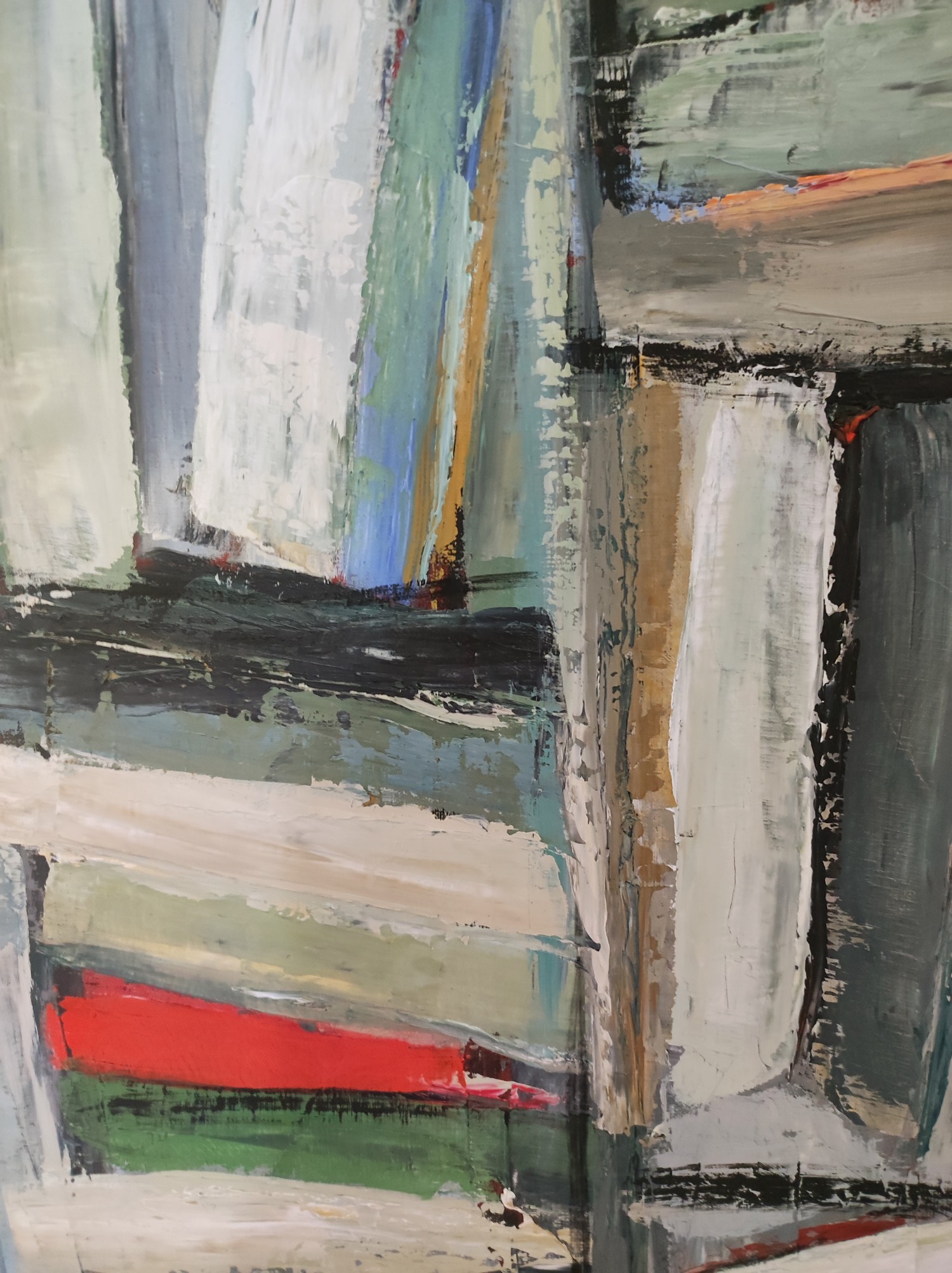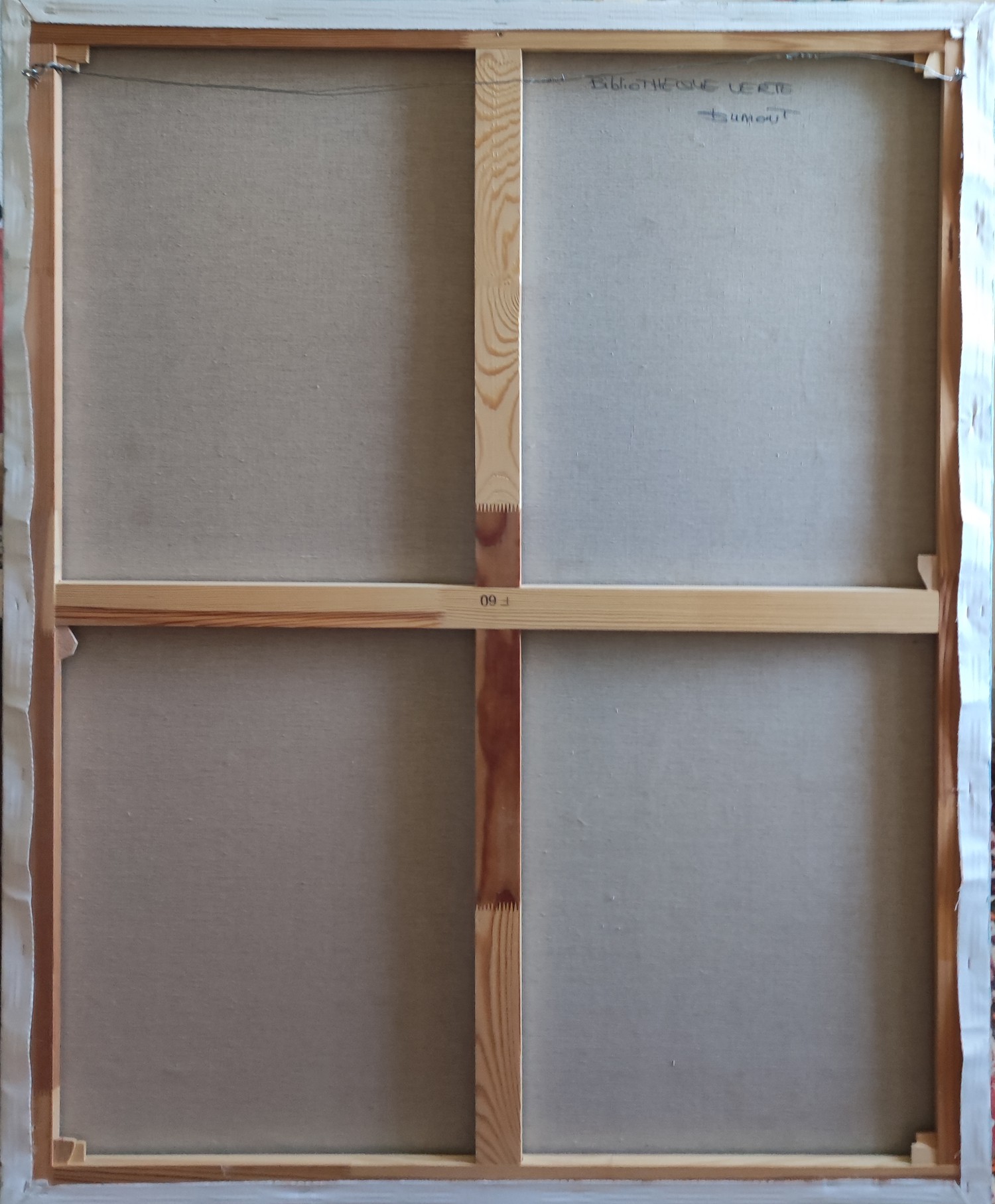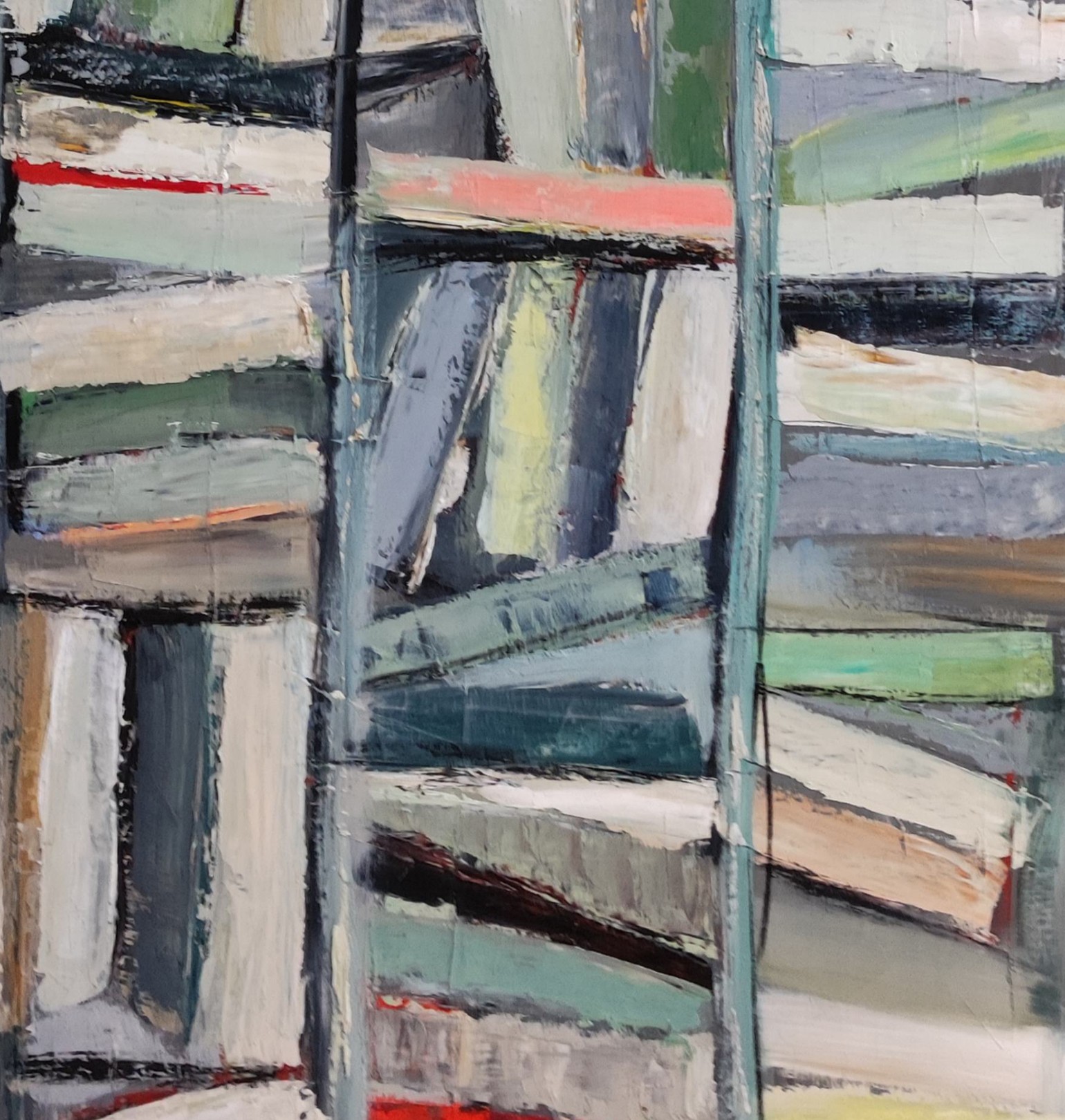 picture of a library with colorful books. Close to geometric abstraction, books remain very present. As always the canvas is worked with a multitude of layers. Libraries series. The work is deliberately unframed. The edges of the painting are painted which allows you not to put a frame.