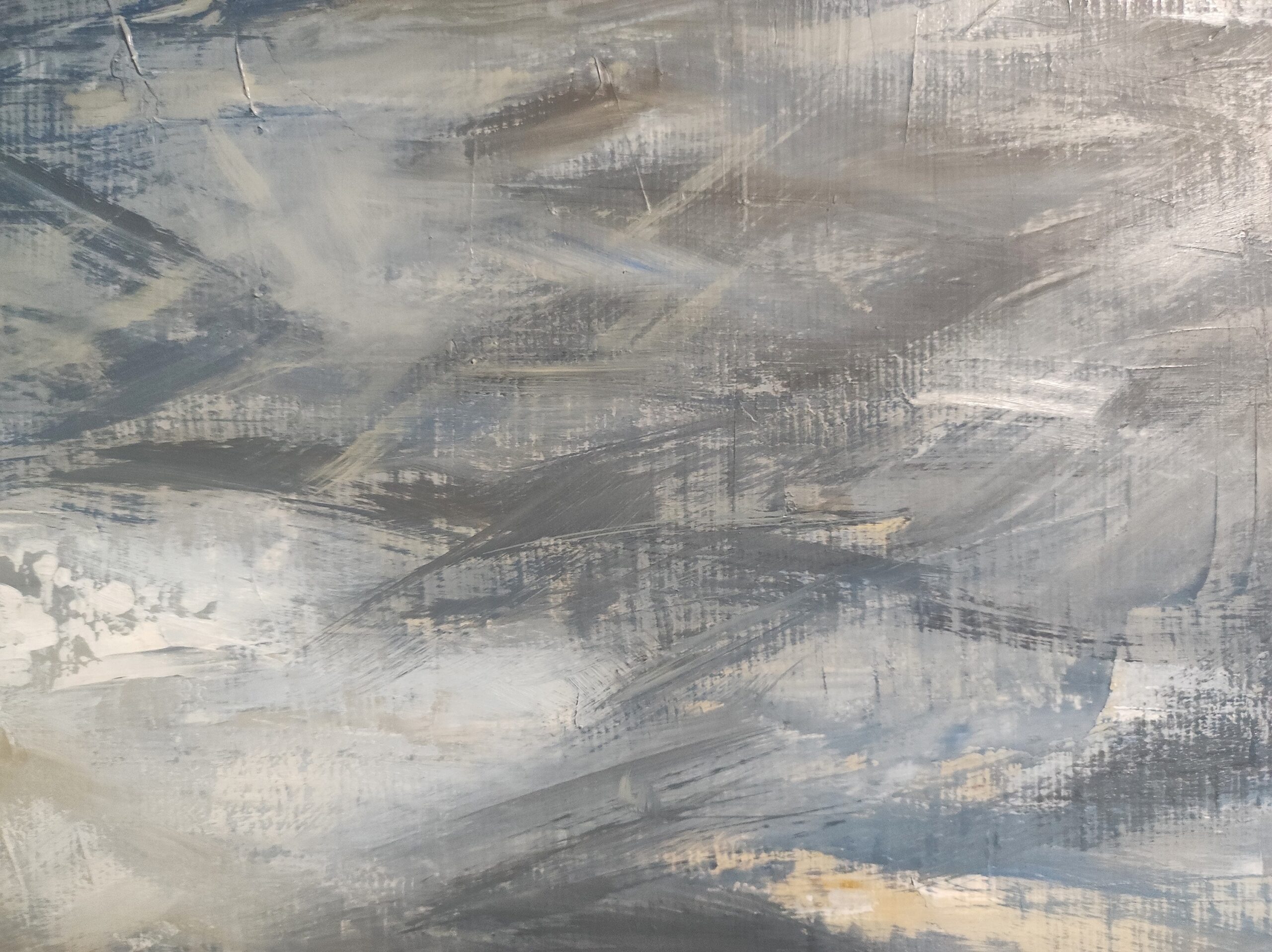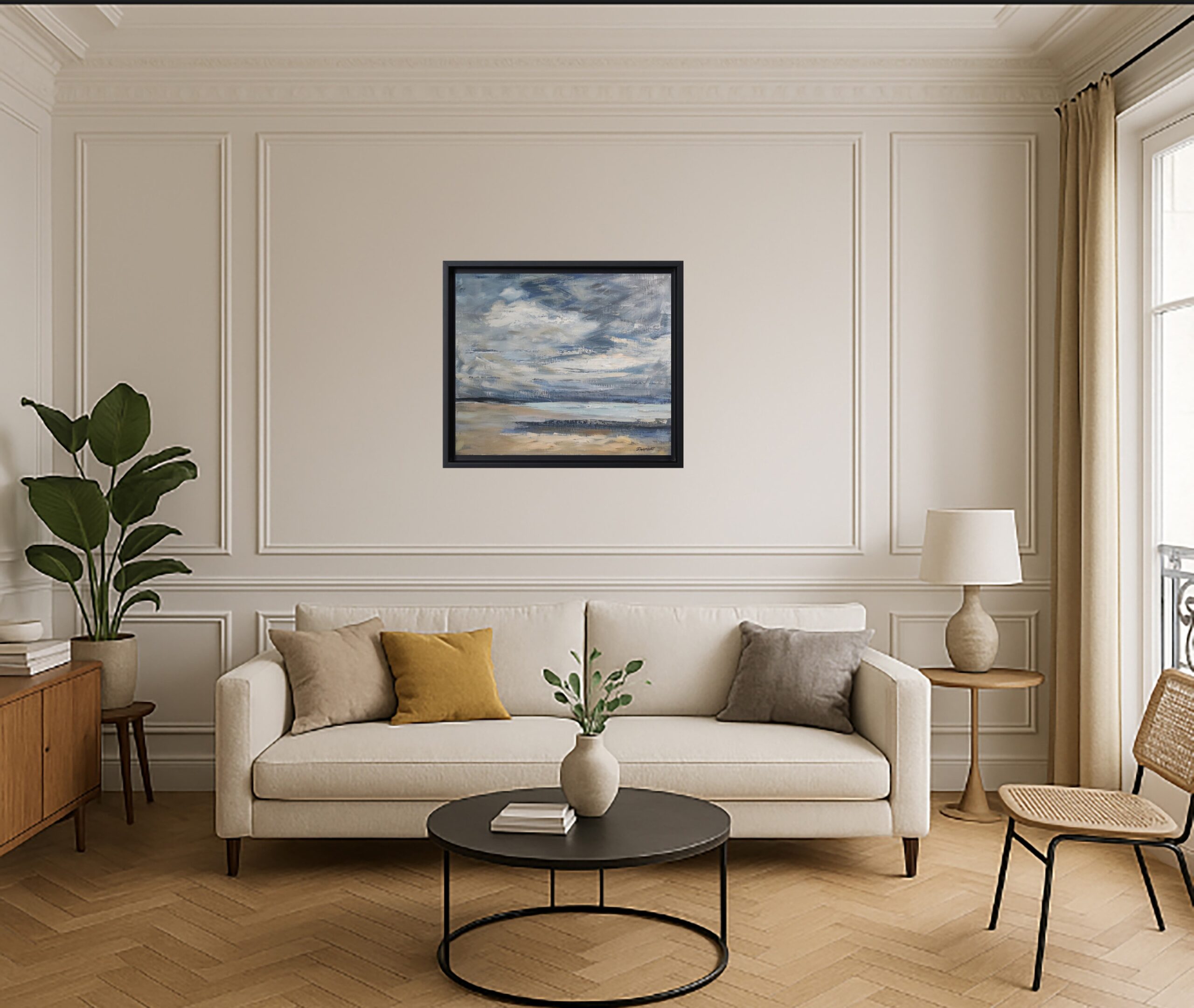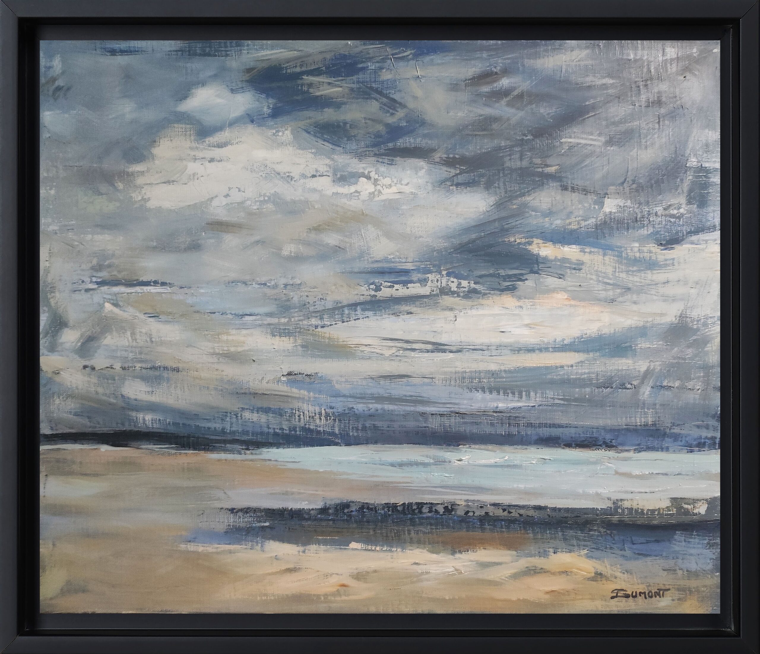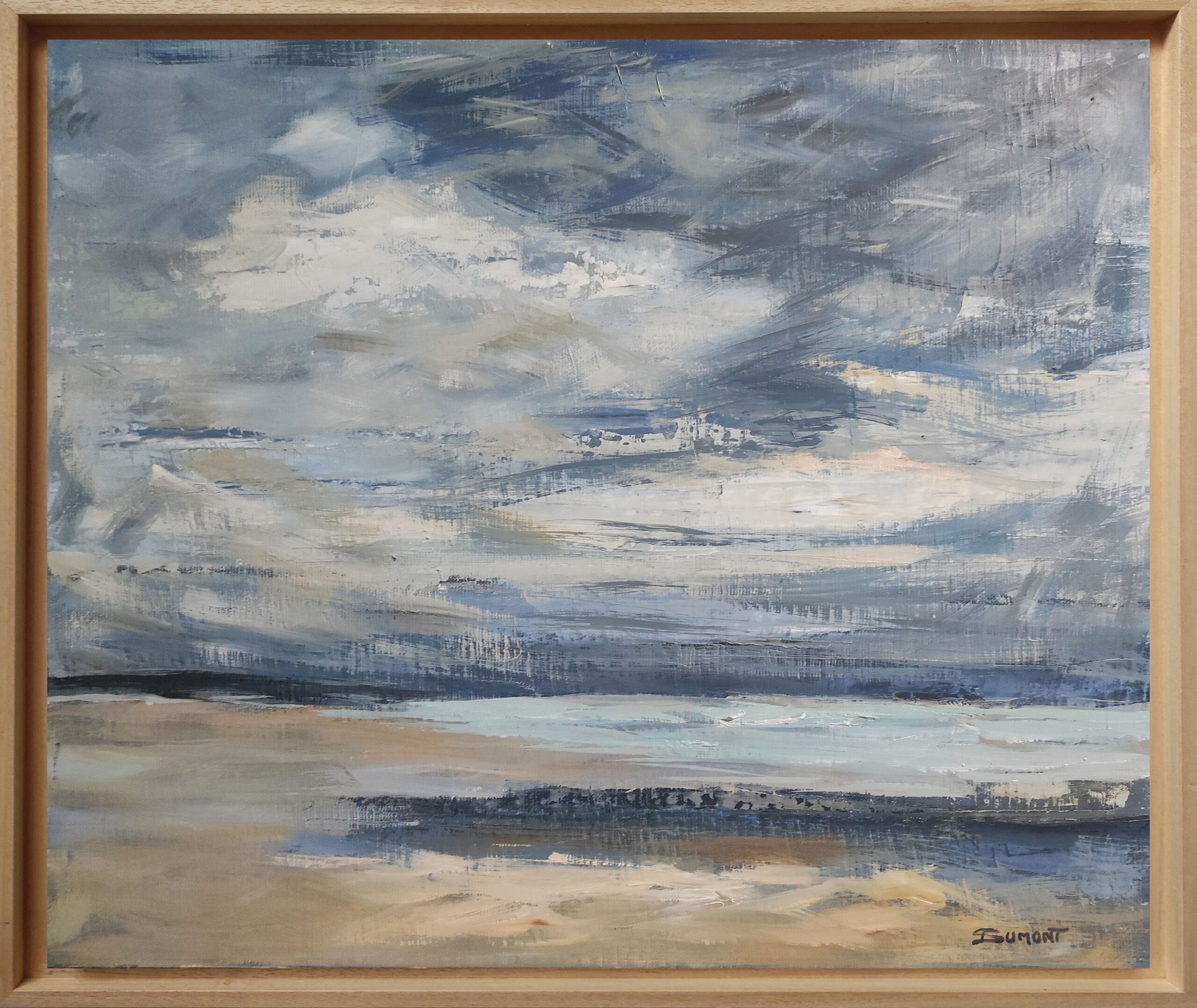Landscape, marine, between sky and sea, painting of a beach in Normandy with a cloudy sky treated with oil and knife. Sky and sea end up merging. Capturing the present moment, the light of the moment so fleeting and changing, such is the challenge of the artist. The multiple layers of matter patiently elaborate the transparencies from which the lights spring. the artist strives to translate the movement of clouds, the variations of light and air. Figurative painting approaching impressionism. This painting is framed with an American black wooden box. Signed lower right.