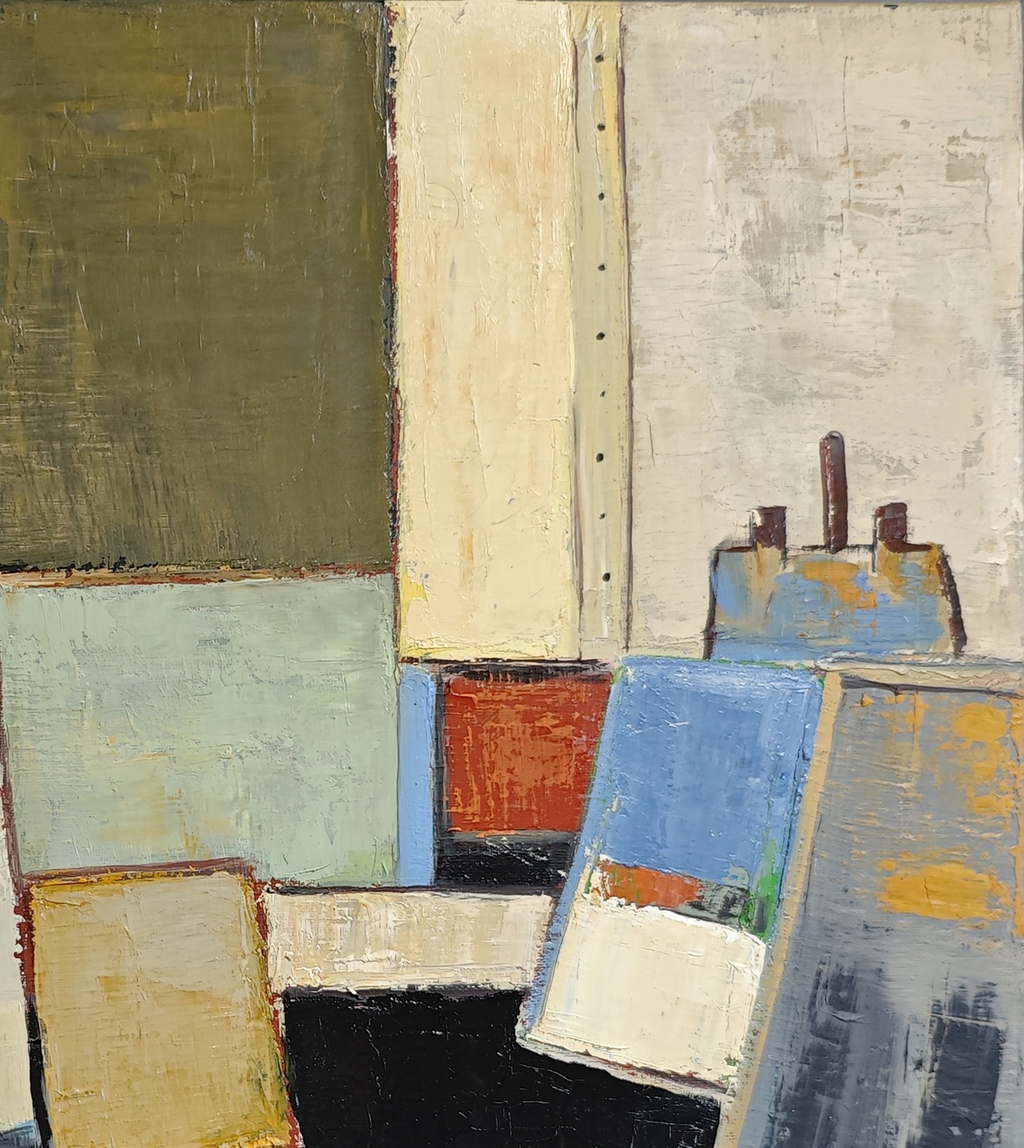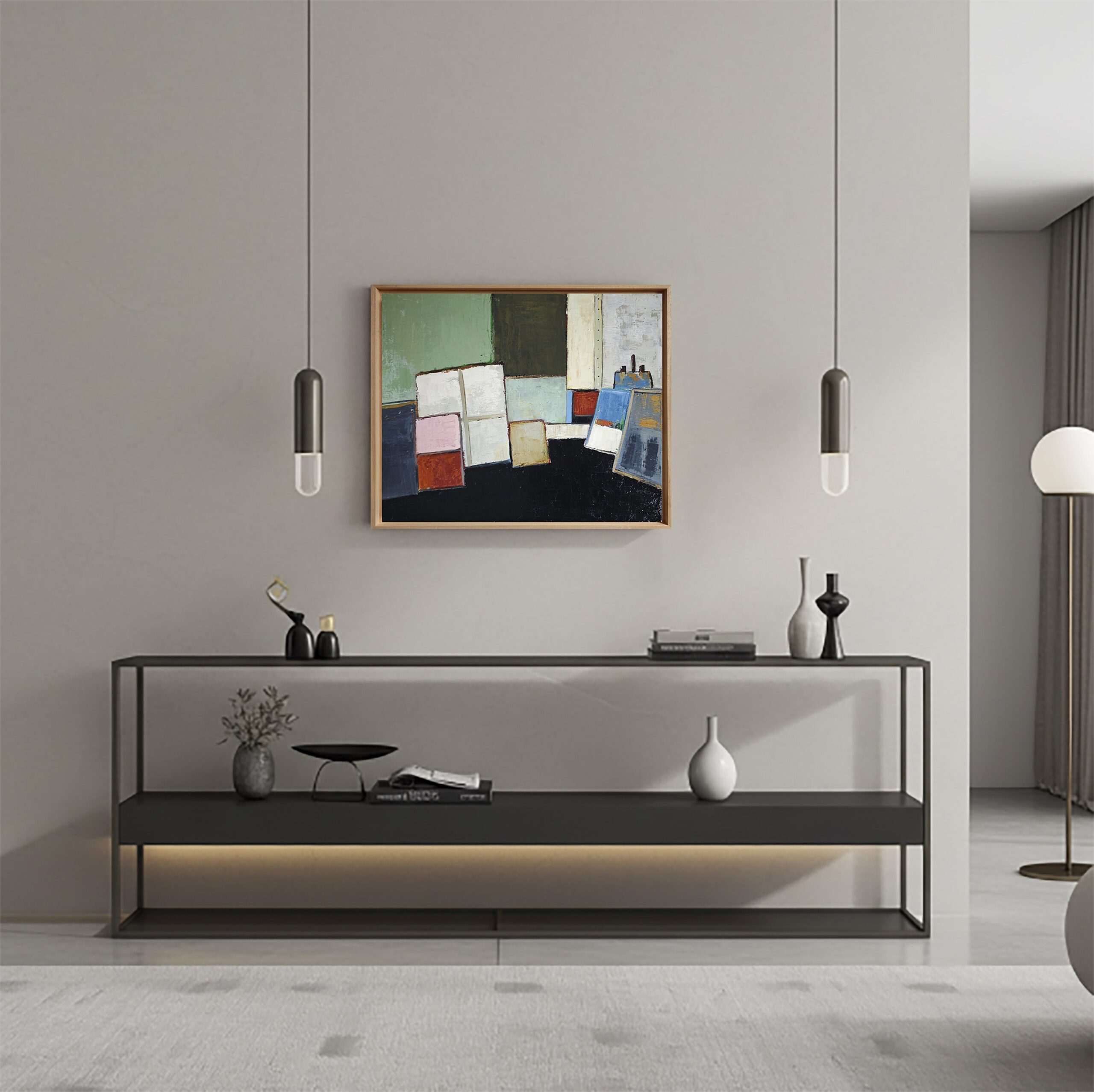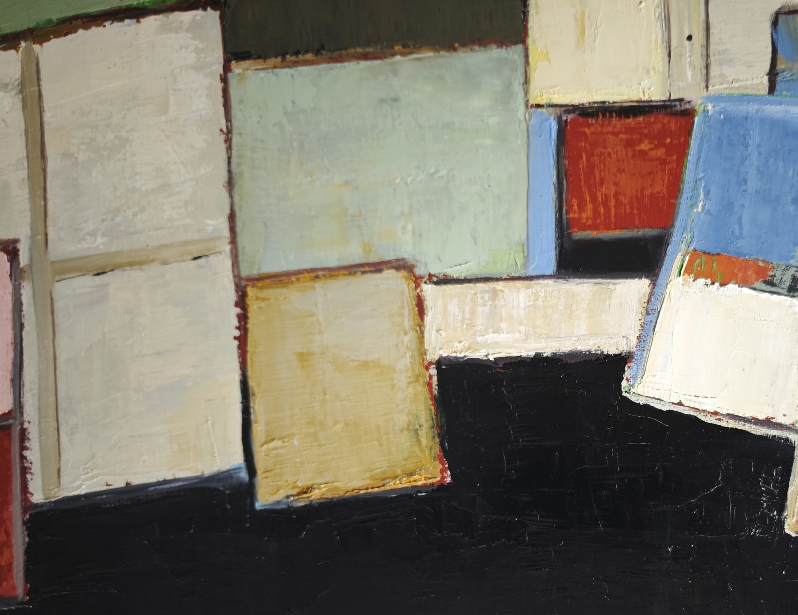 In the suspended studio, Sophie Dumont reinterprets the studio space as a place of dialogue between forms, materials, and colors. Geometric planes—leaning canvases, superimposed surfaces, flat, silent planes—seem to float in an architectural composition where the deep black of the lower part responds to the mineral tones of the upper part. Verdigris, anthracite, textured beiges, pastel pink, and softened ochre compose a subtle palette that creates a hushed atmosphere, imbued with calm light.