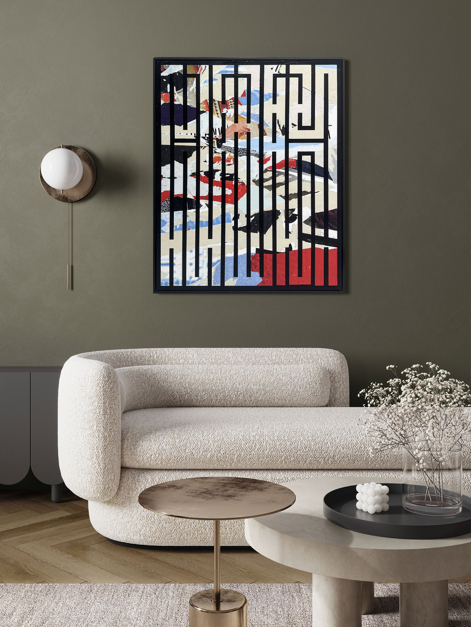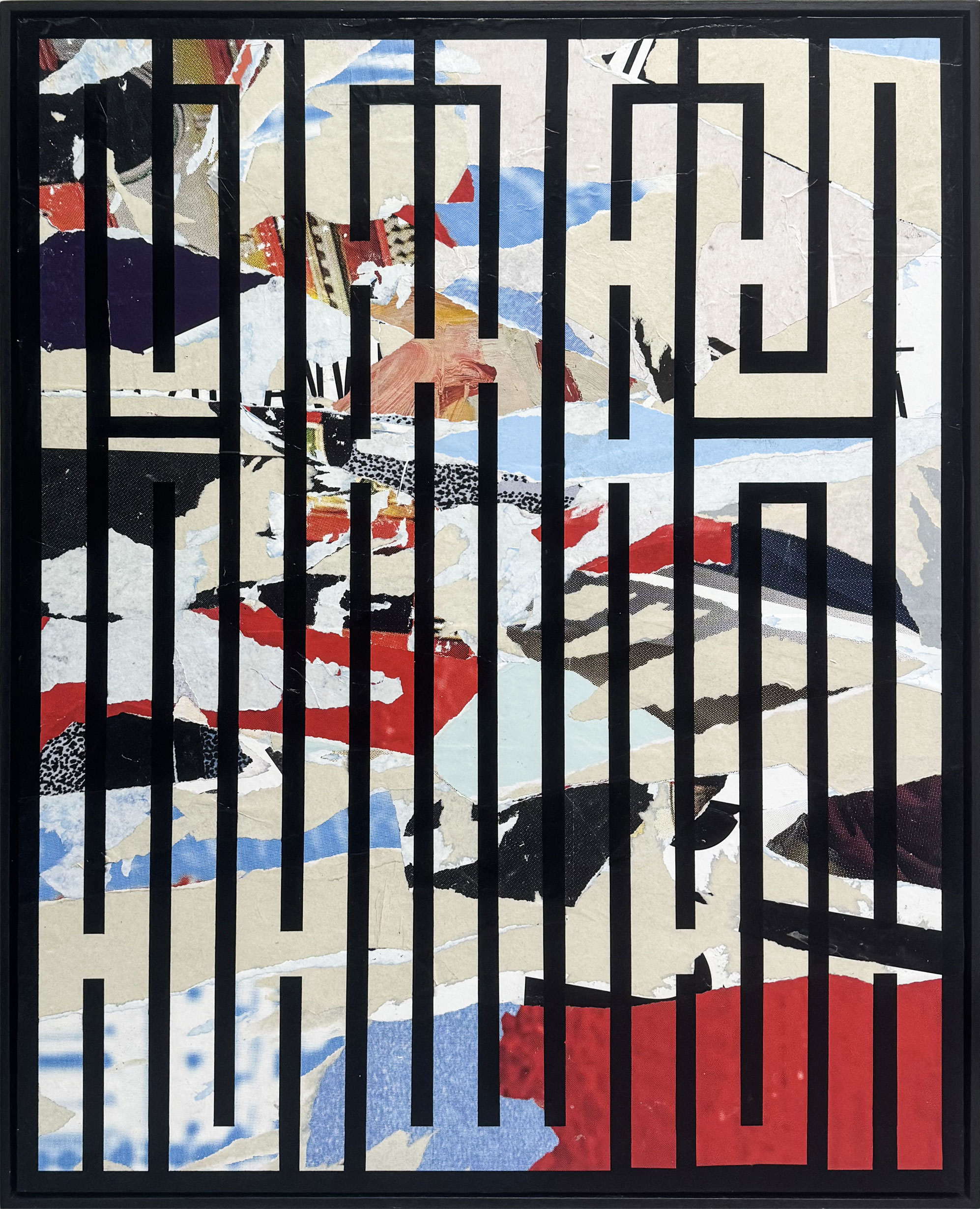 “Triumph” by L’Atlas is a compelling artwork that merges the aesthetics of abstract expressionism with elements of street art. This piece features a complex layering of fragmented, collage-like materials beneath a structured grid of black lines, forming a striking visual contrast that suggests both confinement and liberation. The artwork’s geometric precision and sharp lines are typical of L’Atlas’s style, which often incorporates typography and urban motifs into more traditional art forms.