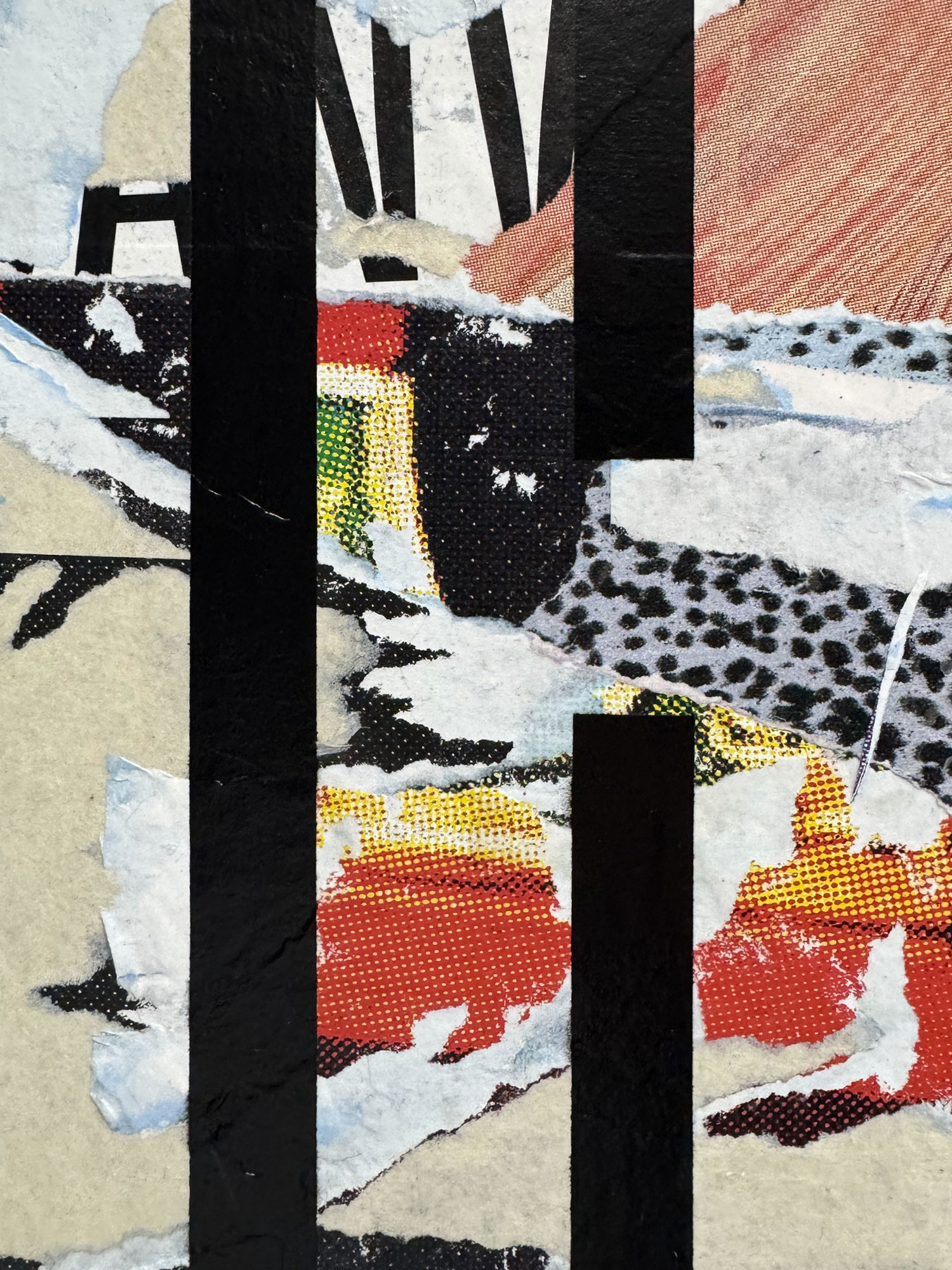The background collage uses a vibrant palette with bursts of red and blue emerging through the monochrome tones, adding depth and emotional intensity to the composition. The overlay of structured black bars could symbolize barriers or frameworks, suggesting a thematic exploration of overcoming obstacles or perhaps celebrating victories—hence the title “Triumph.” This piece powerfully reflects on the dynamic between chaos and order, personal struggle, and the beauty of achieving resolution.