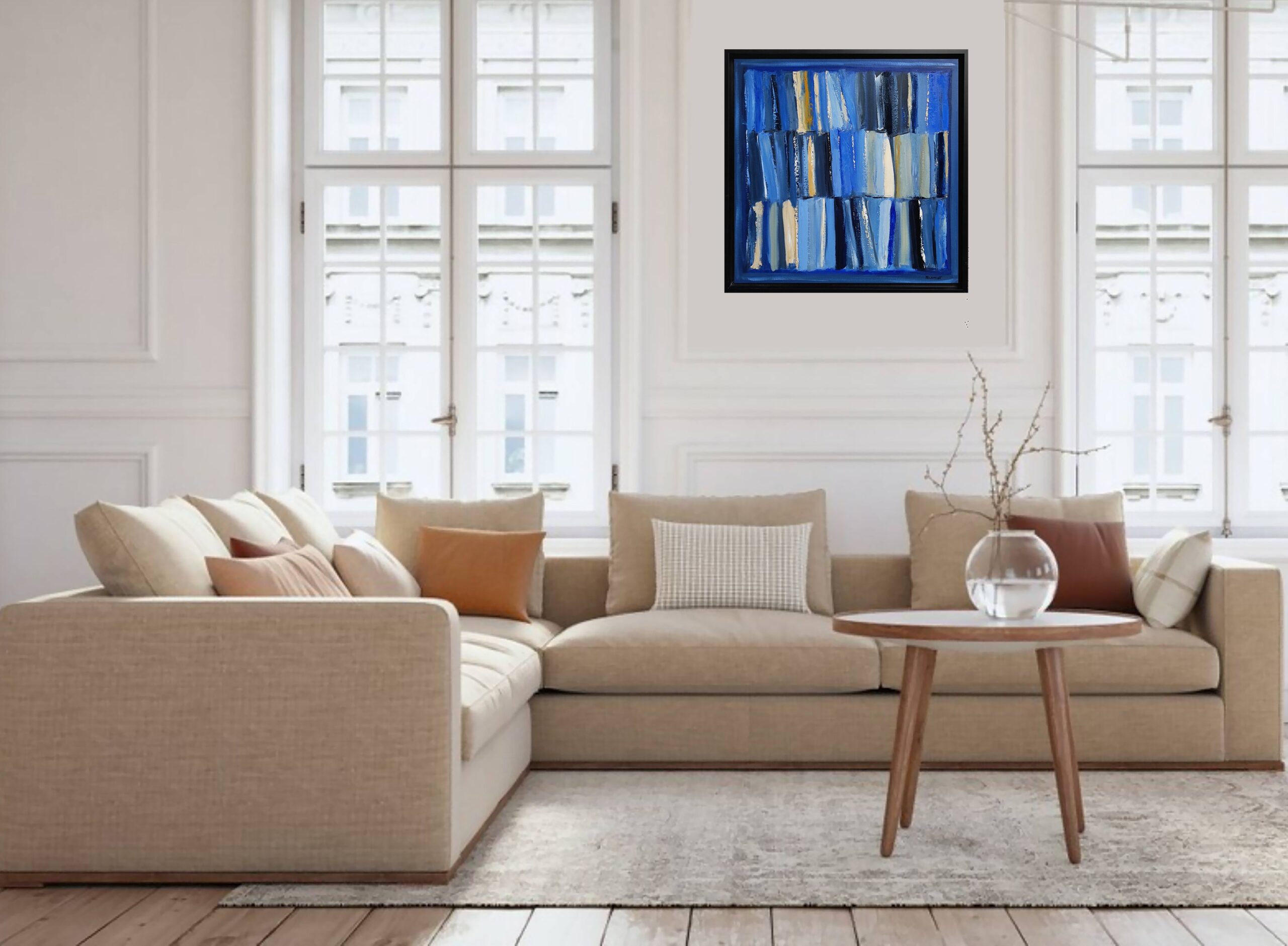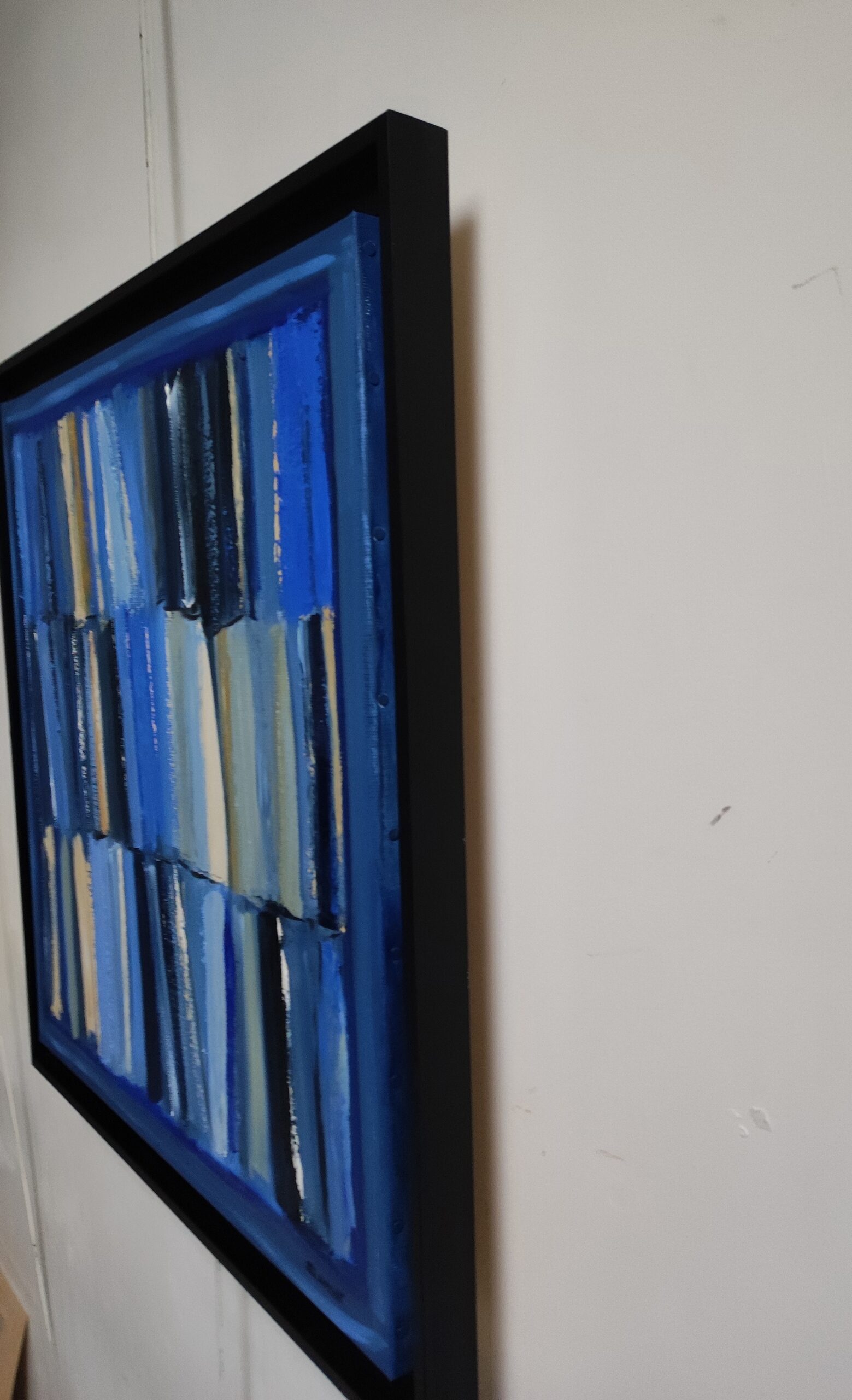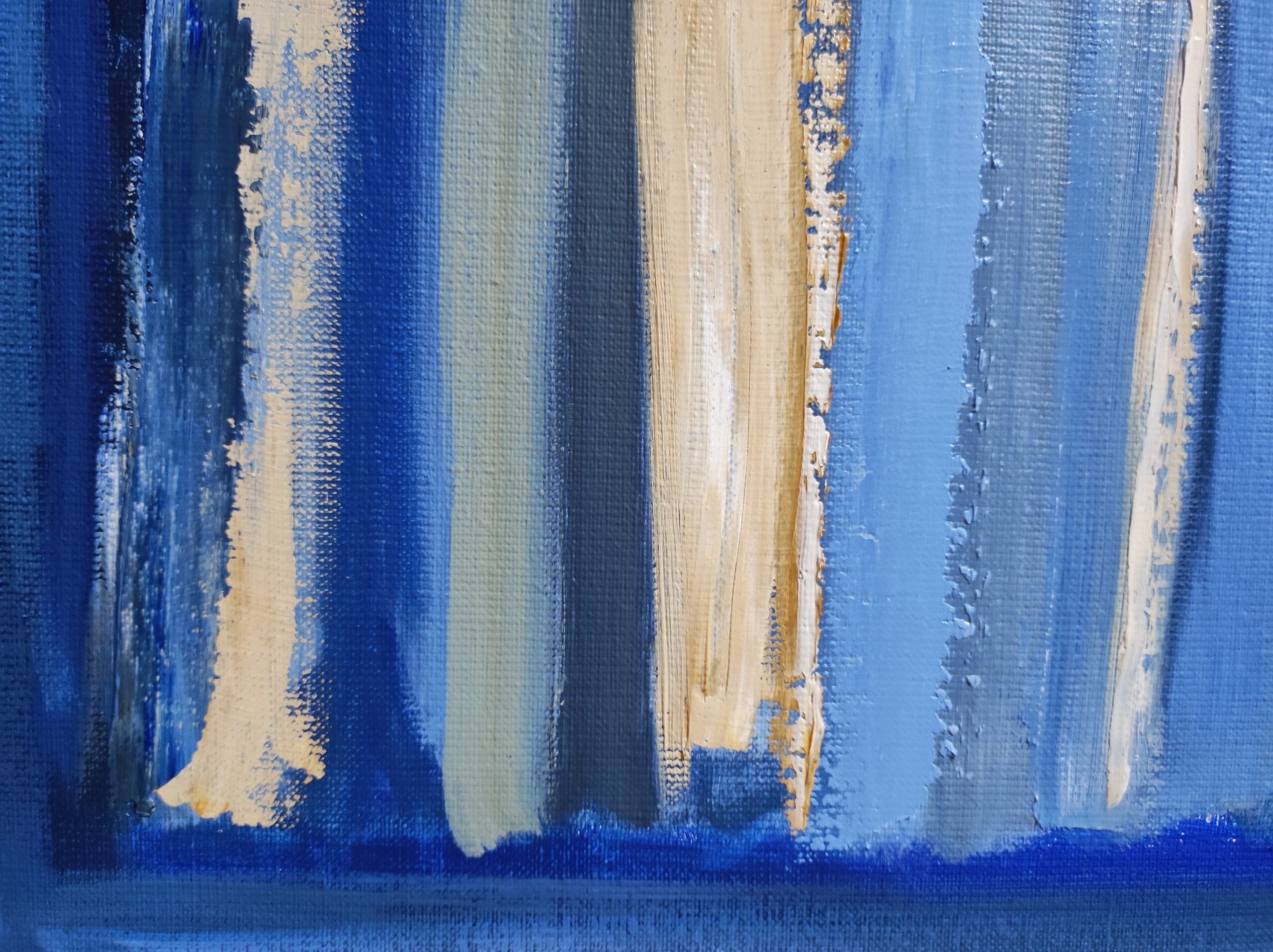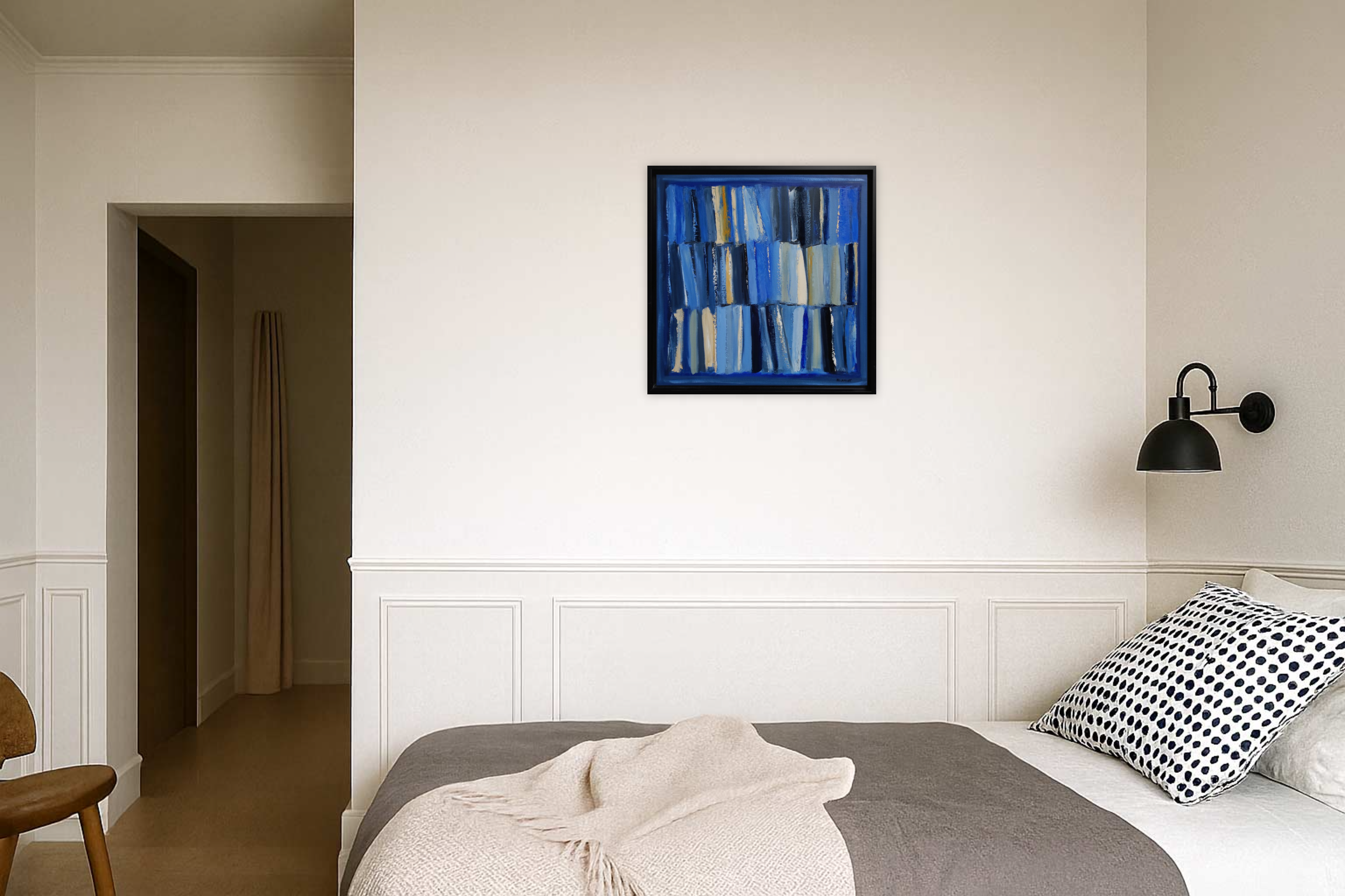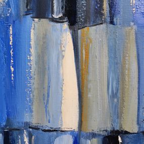 Bordering on pure abstraction, the canvas is dominated by a palette of ultramarine blues, creating a captivating atmosphere of calm and serenity. All the light that illuminates the scene is provided by subtle touches of ocher.